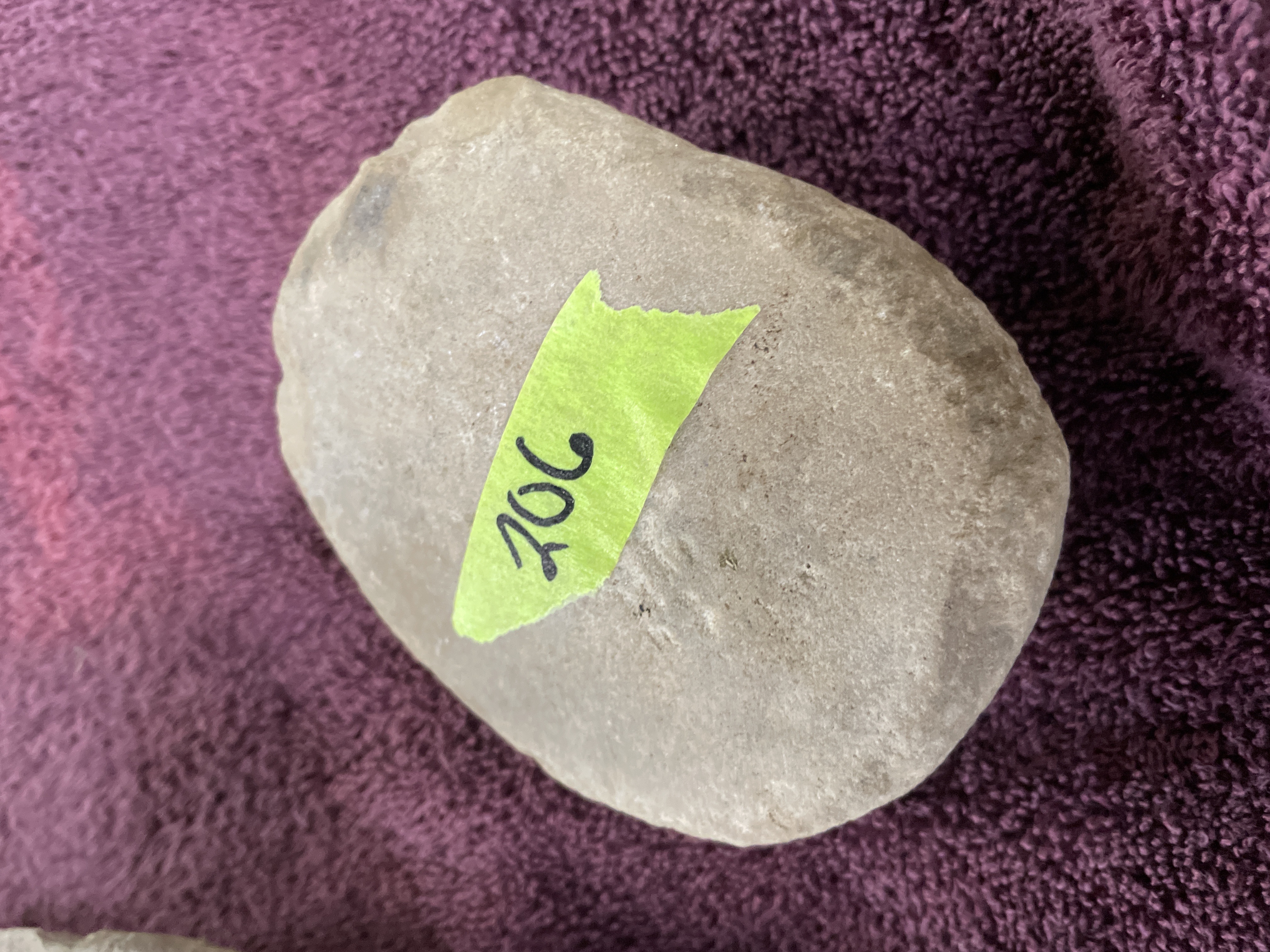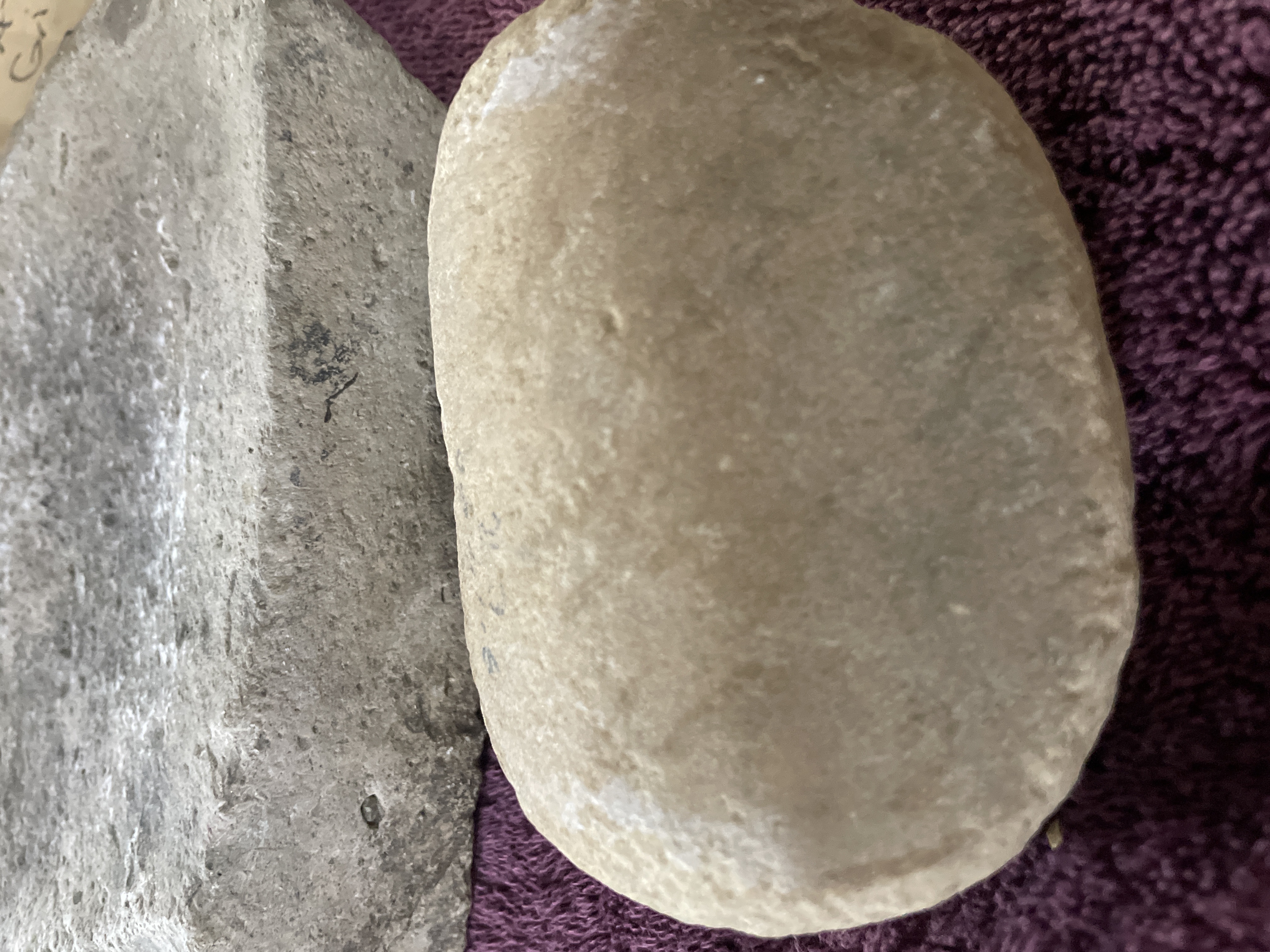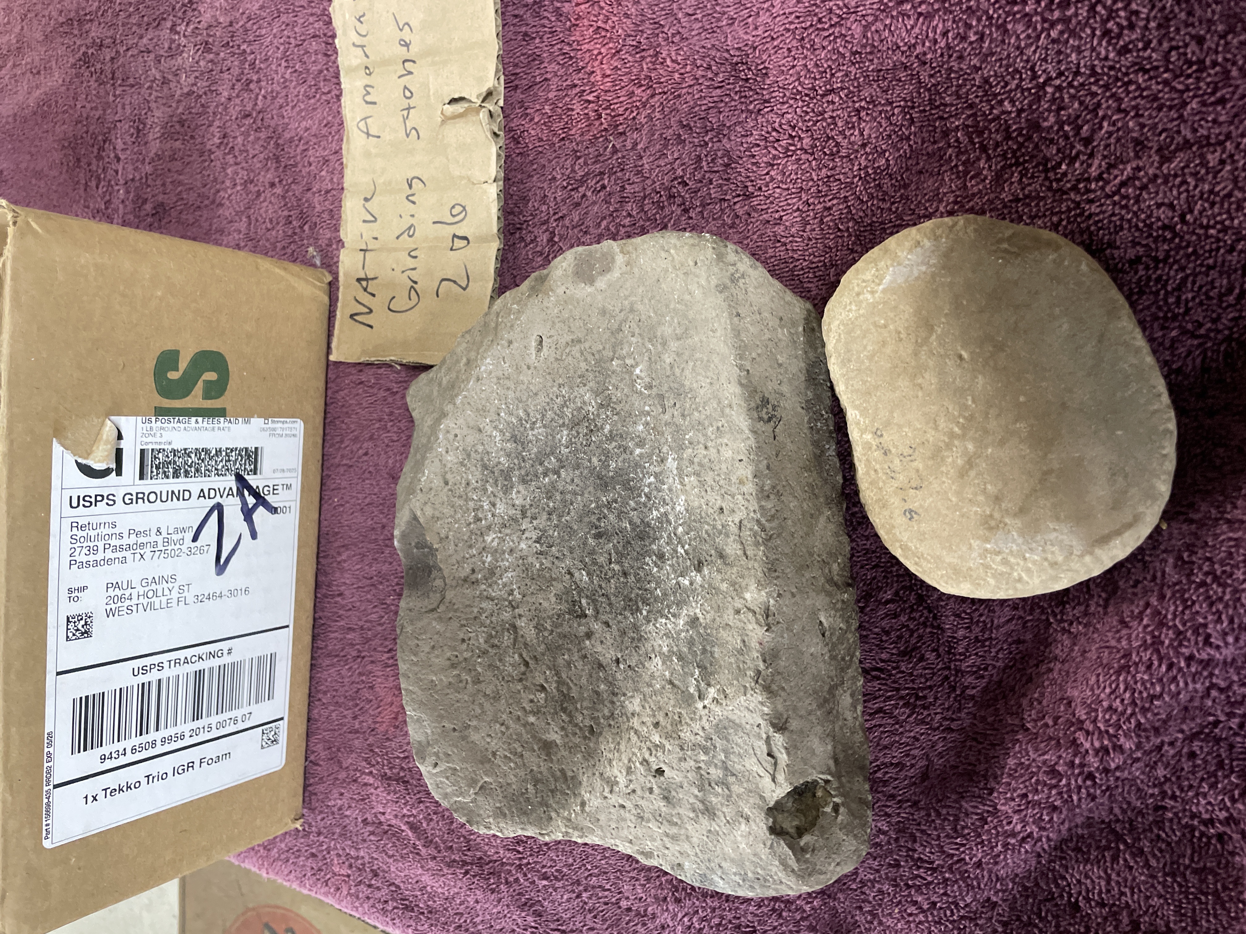 A pair of grinding implements identified in the market as Prehistoric Paleo-American metate and mano. The lot consists of two distinct natural stone artifacts: a large, irregularly shaped gray grinding slab (metate) and a smaller, oval, smooth tan hand stone (mano). The metate is composed of a rough, pitted gray stone, potentially sandstone or quartzite, exhibiting significant dark staining and patination across its working surface consistent with long-term use. The mano is composed of a different, smoother tan stone and bears a small neon green sticker marked “206” in black ink. A handwritten note visible in the background provides context, reading “NATIVE Americn Grinding stones 206,” suggesting a Native American origin for the artifacts. Both stones show substantial wear consistent with their function as grinding implements.