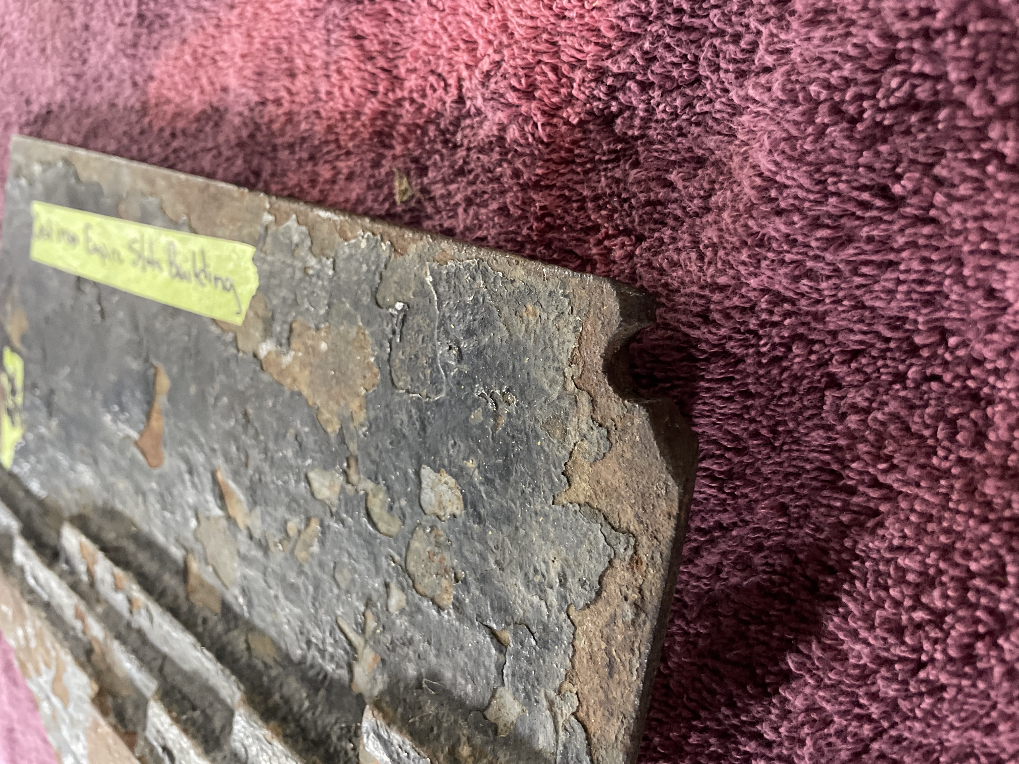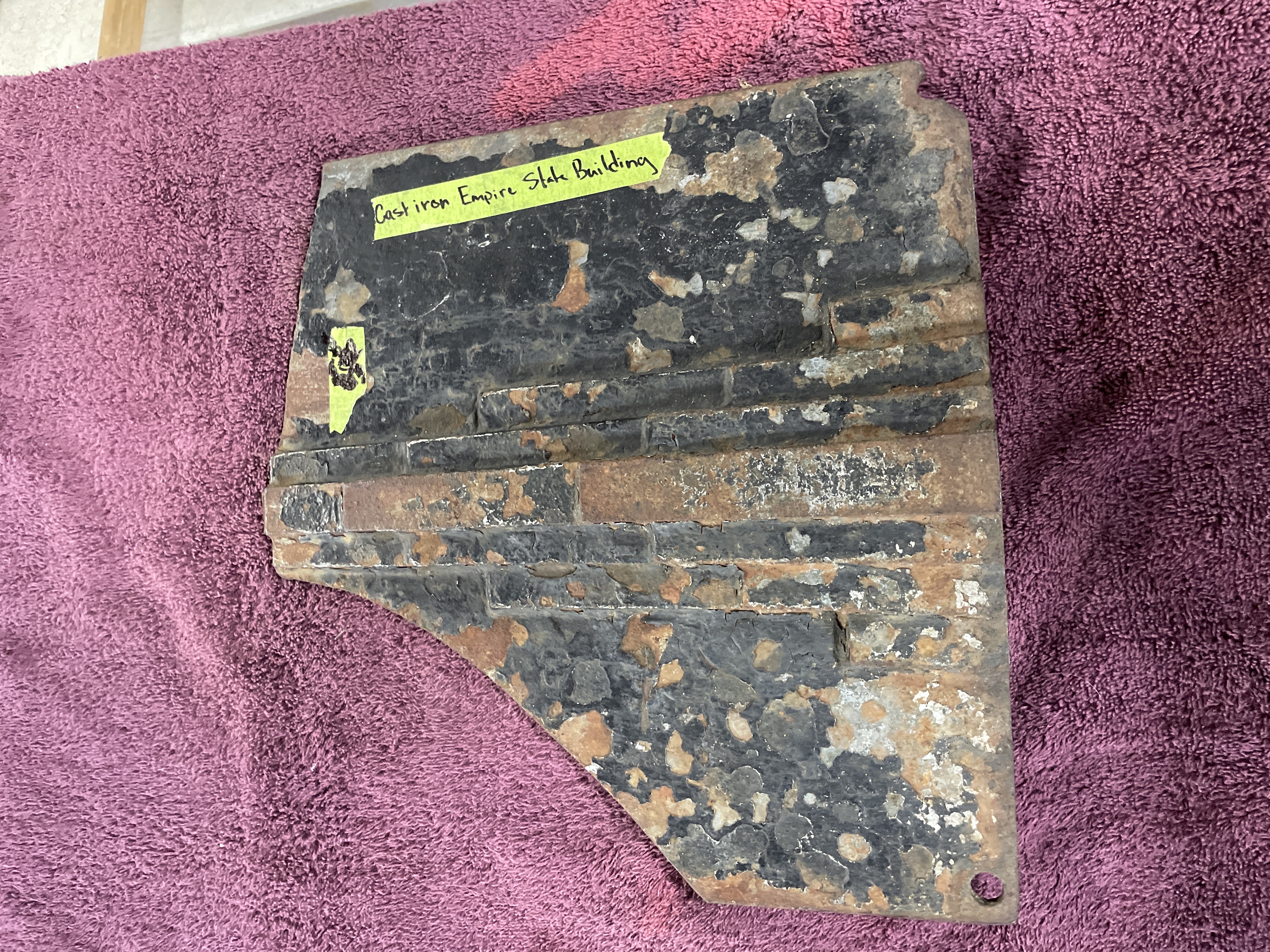 A single, heavy, irregularly shaped cast iron plate identified by a handwritten label as a component from an “Empire Stove.” The item is constructed of thick cast iron and features raised structural ribs on one side, which retains extensive remnants of a flaking black finish. The opposing side displays a smoother, recessed pattern including two squared mounting bosses. The plate includes at least one mounting hole located in a corner, consistent with its function as a structural antique stove part.