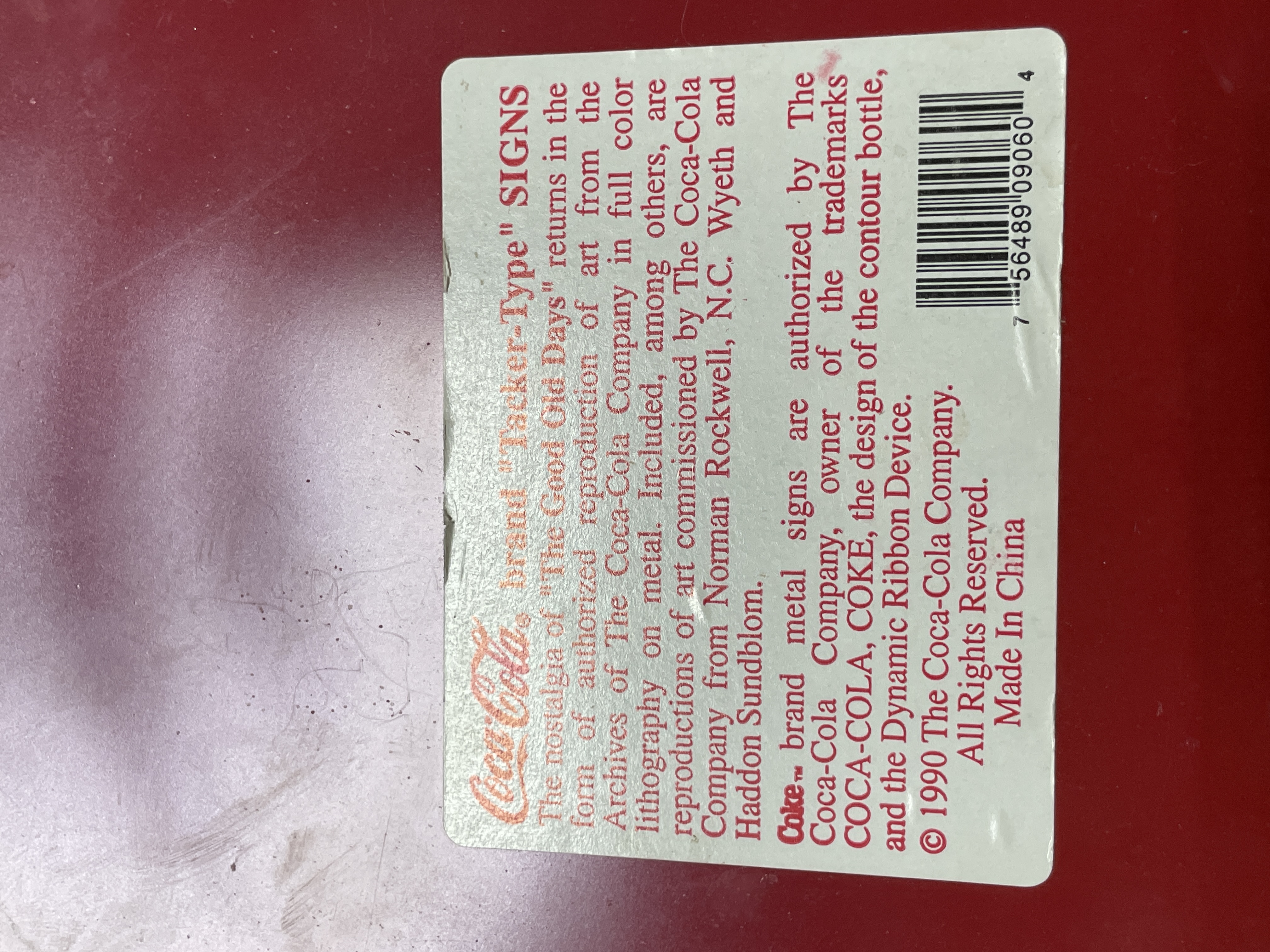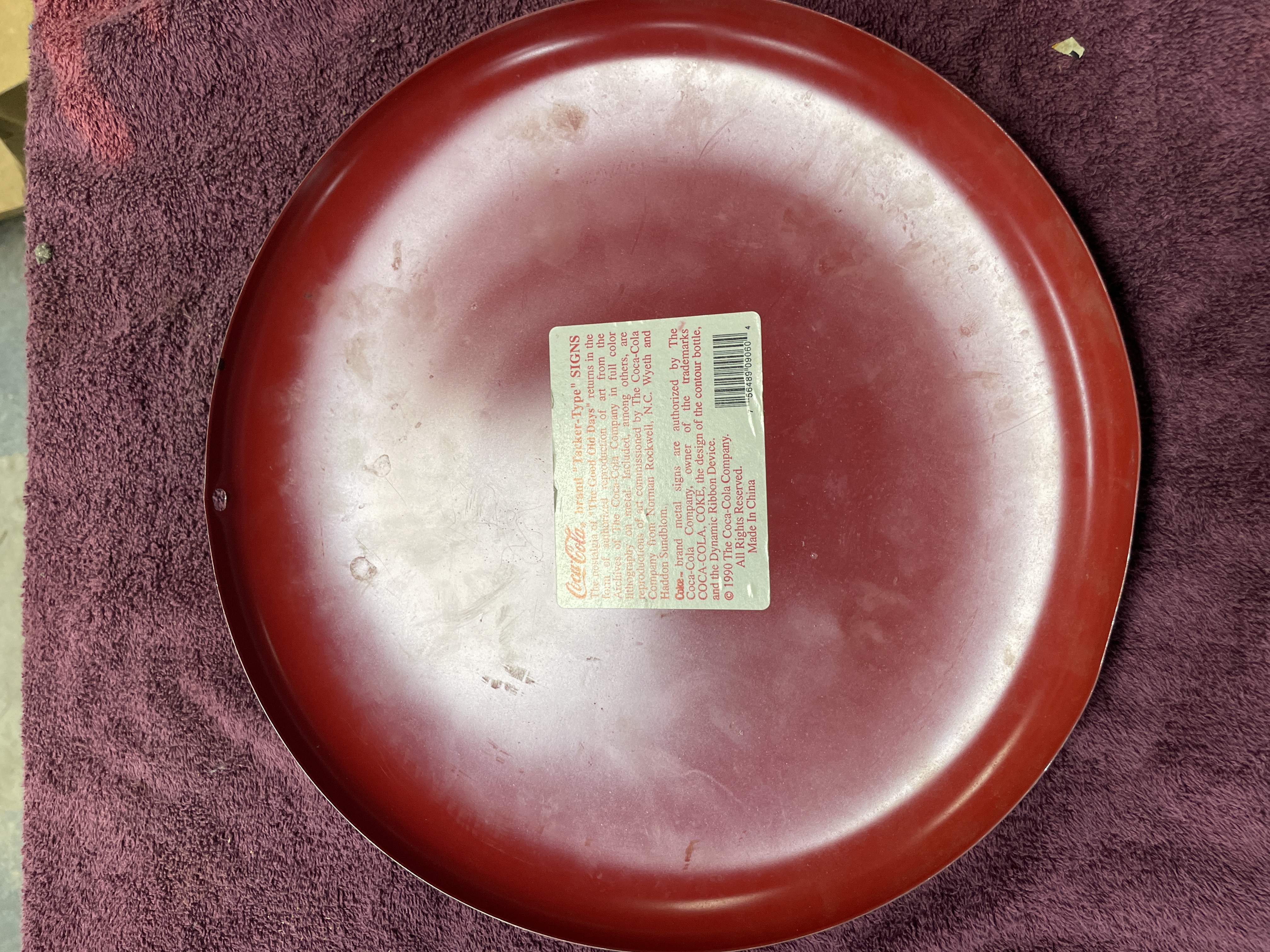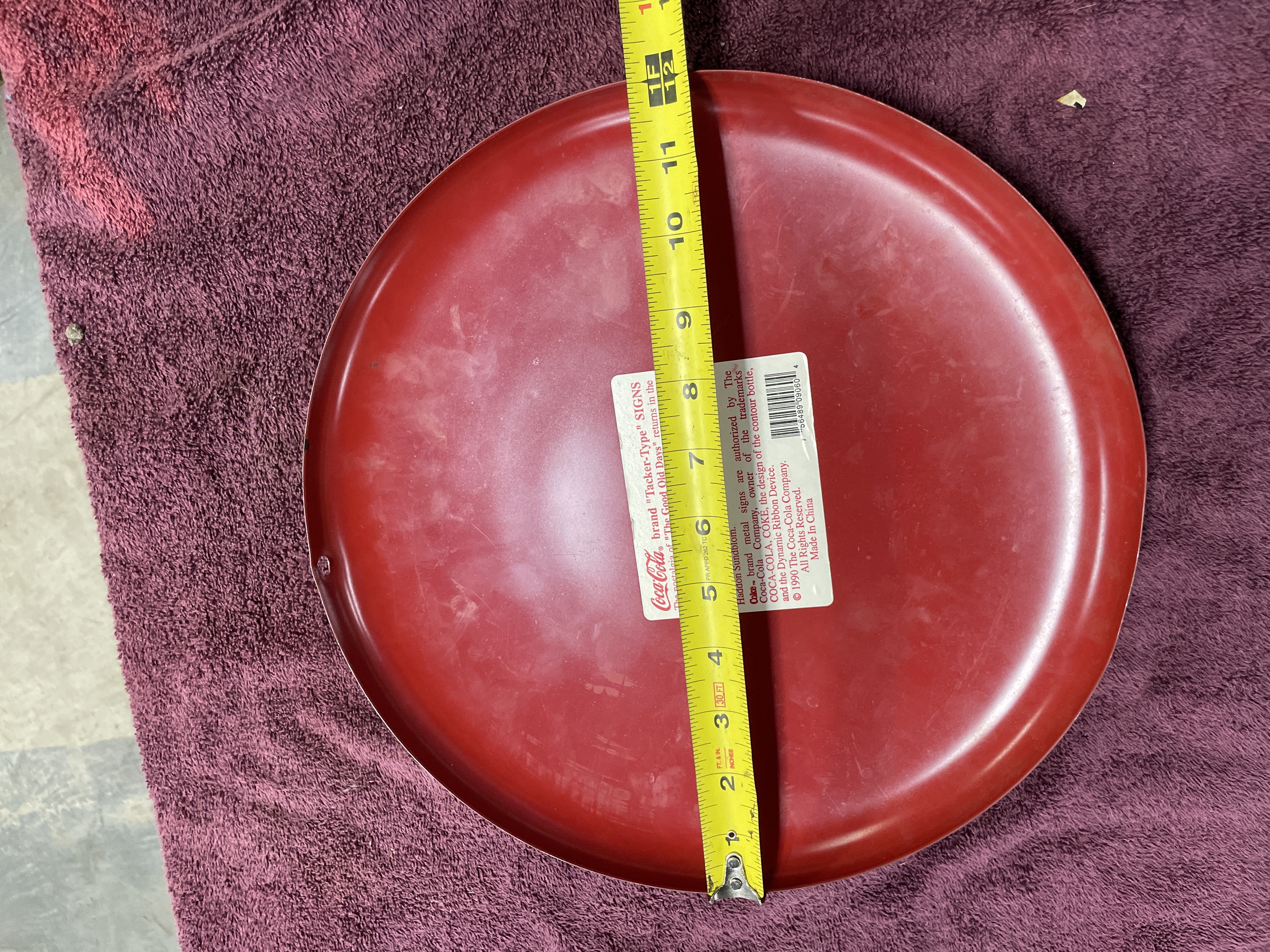 A single authorized reproduction Coca-Cola brand "Tacker-Type" advertising sign. The circular, convex sign is constructed of lithographed metal featuring a bright red ground. The central design includes the Coca-Cola script logo in white overlaid with a depiction of the iconic contour bottle in black, white, and green. The item is an authorized reproduction of vintage advertising art. Inscriptions visible on the sign include "© 1990 The Coca-Cola Company, " "All Rights Reserved, " and "Made In China." The reverse side retains the original printed label describing the sign as an authorized reproduction of art from the Coca-Cola Archives.