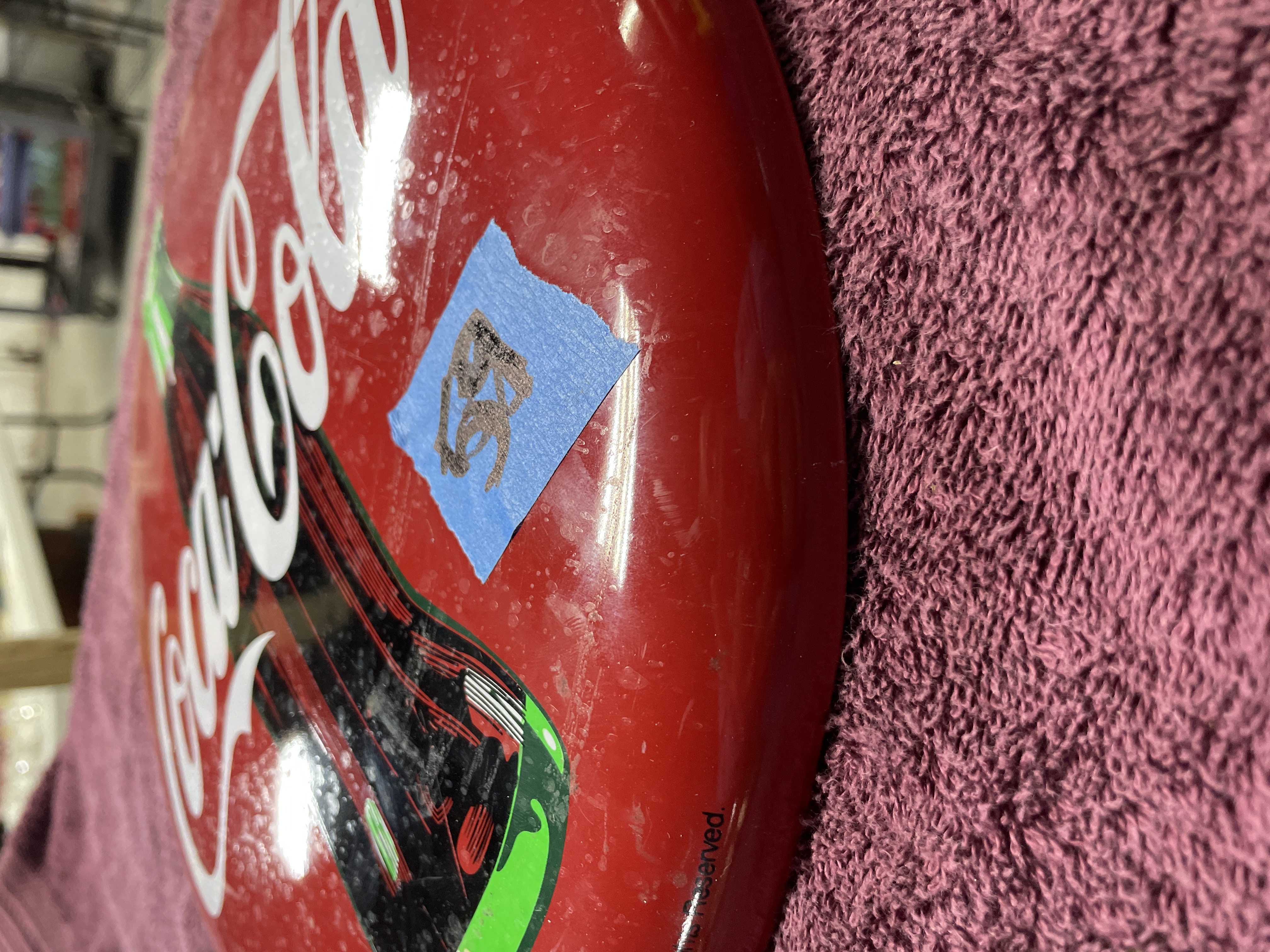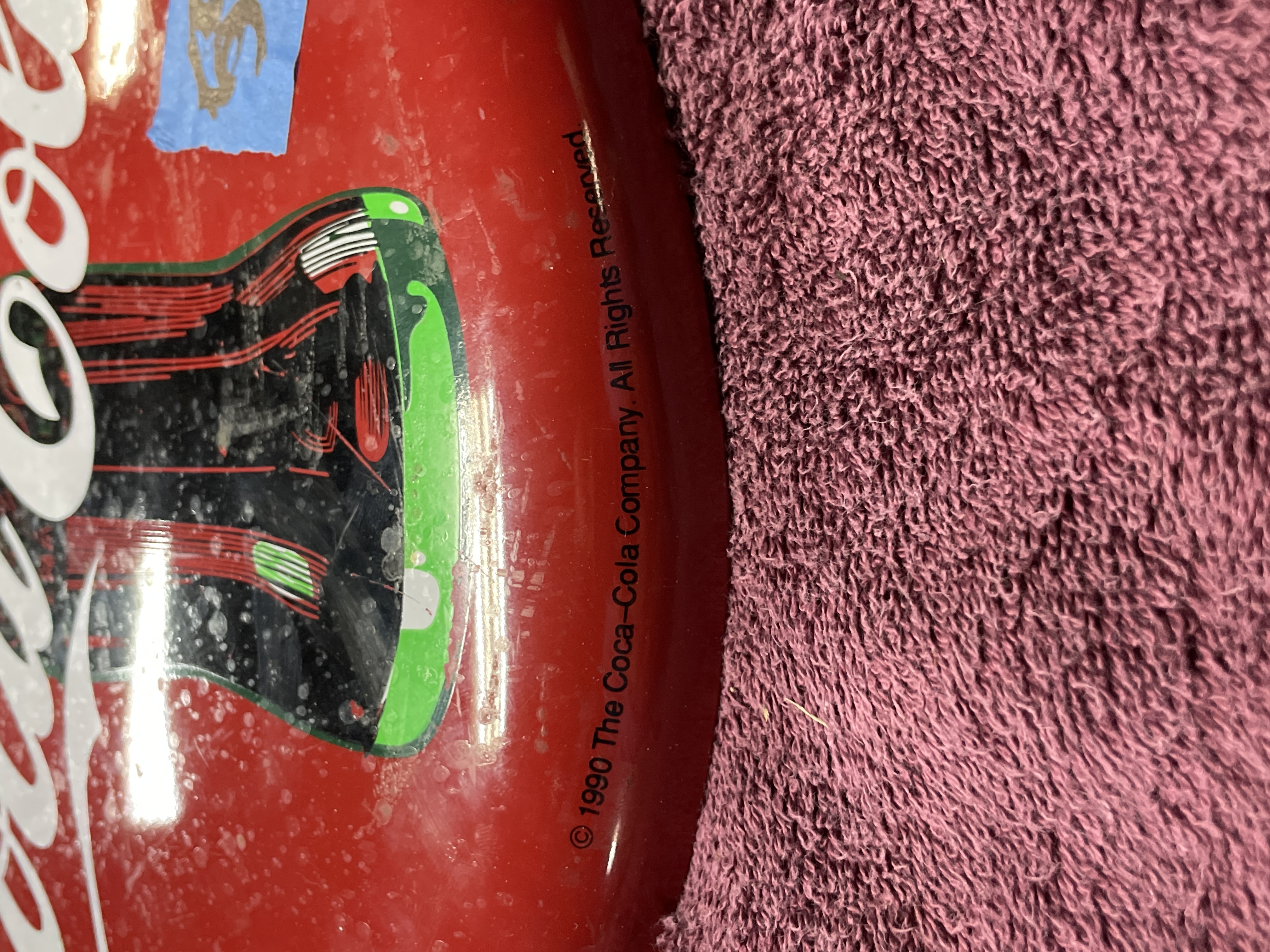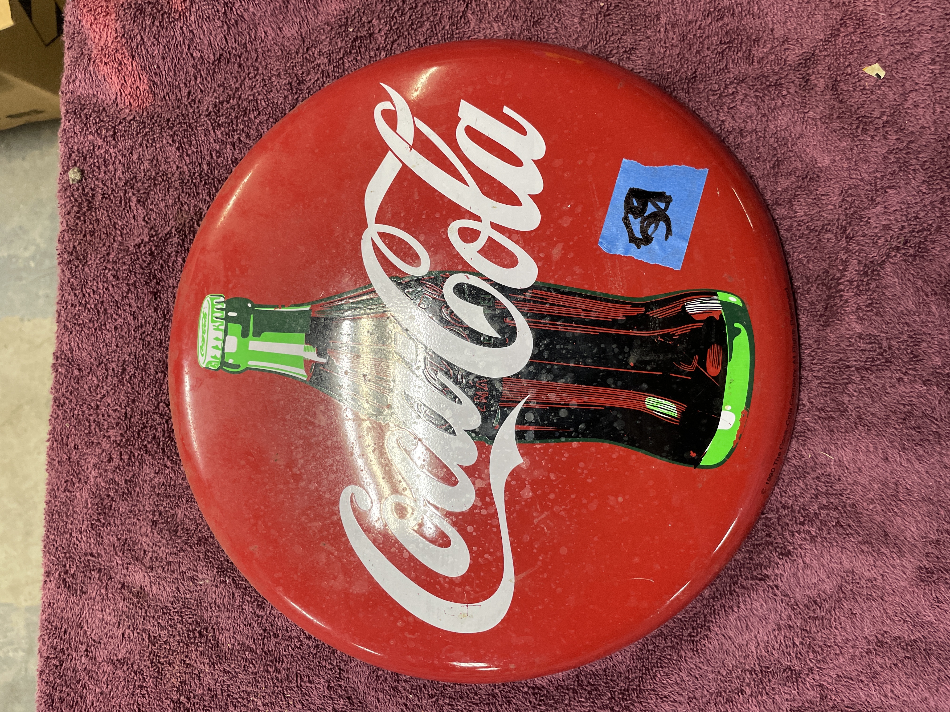 A single authorized reproduction Coca-Cola brand "Tacker-Type" advertising sign. The circular, convex sign is constructed of lithographed metal featuring a bright red ground. The central design includes the Coca-Cola script logo in white overlaid with a depiction of the iconic contour bottle in black, white, and green. The item is an authorized reproduction of vintage advertising art. Inscriptions visible on the sign include "© 1990 The Coca-Cola Company, " "All Rights Reserved, " and "Made In China." The reverse side retains the original printed label describing the sign as an authorized reproduction of art from the Coca-Cola Archives.