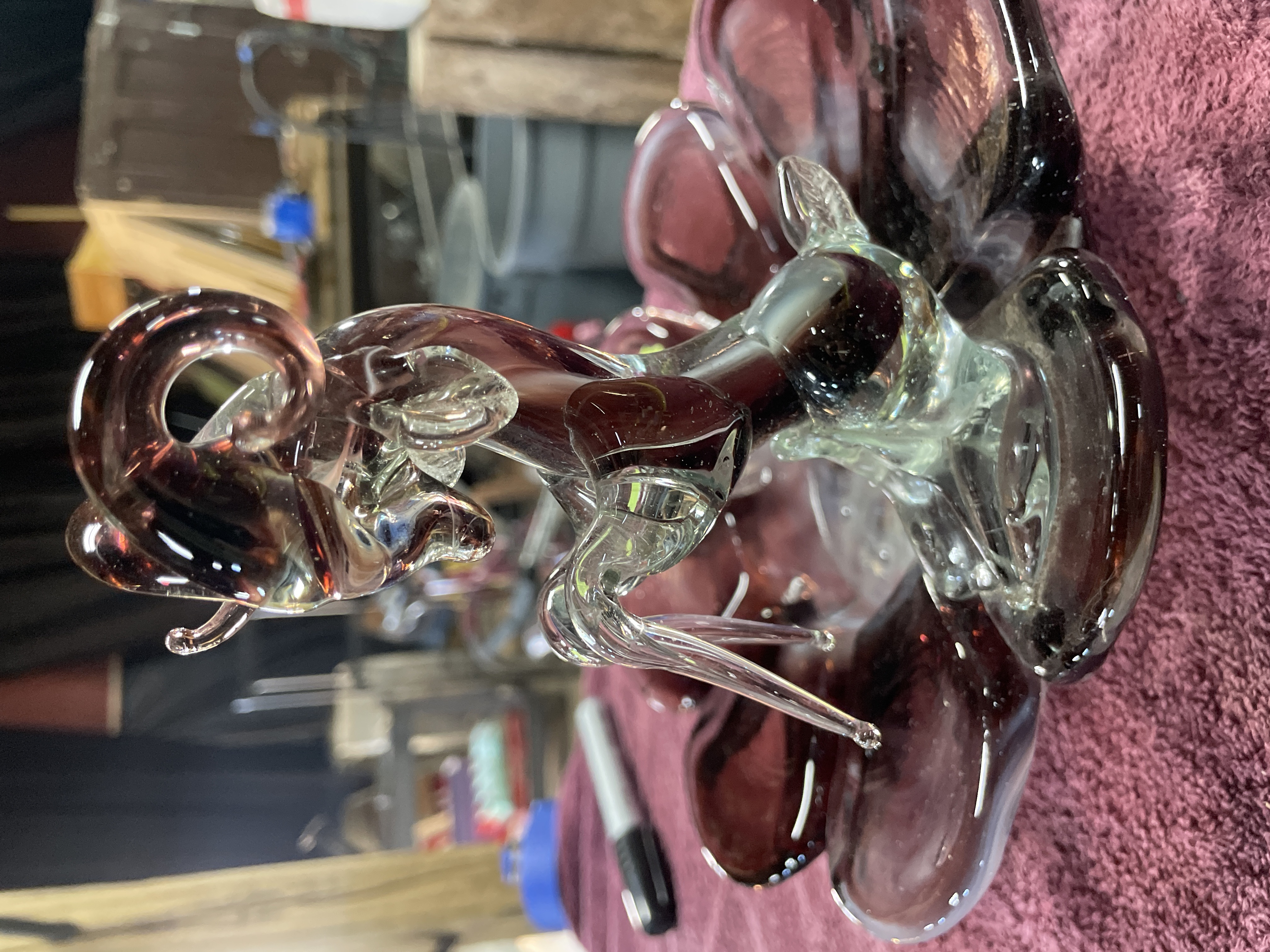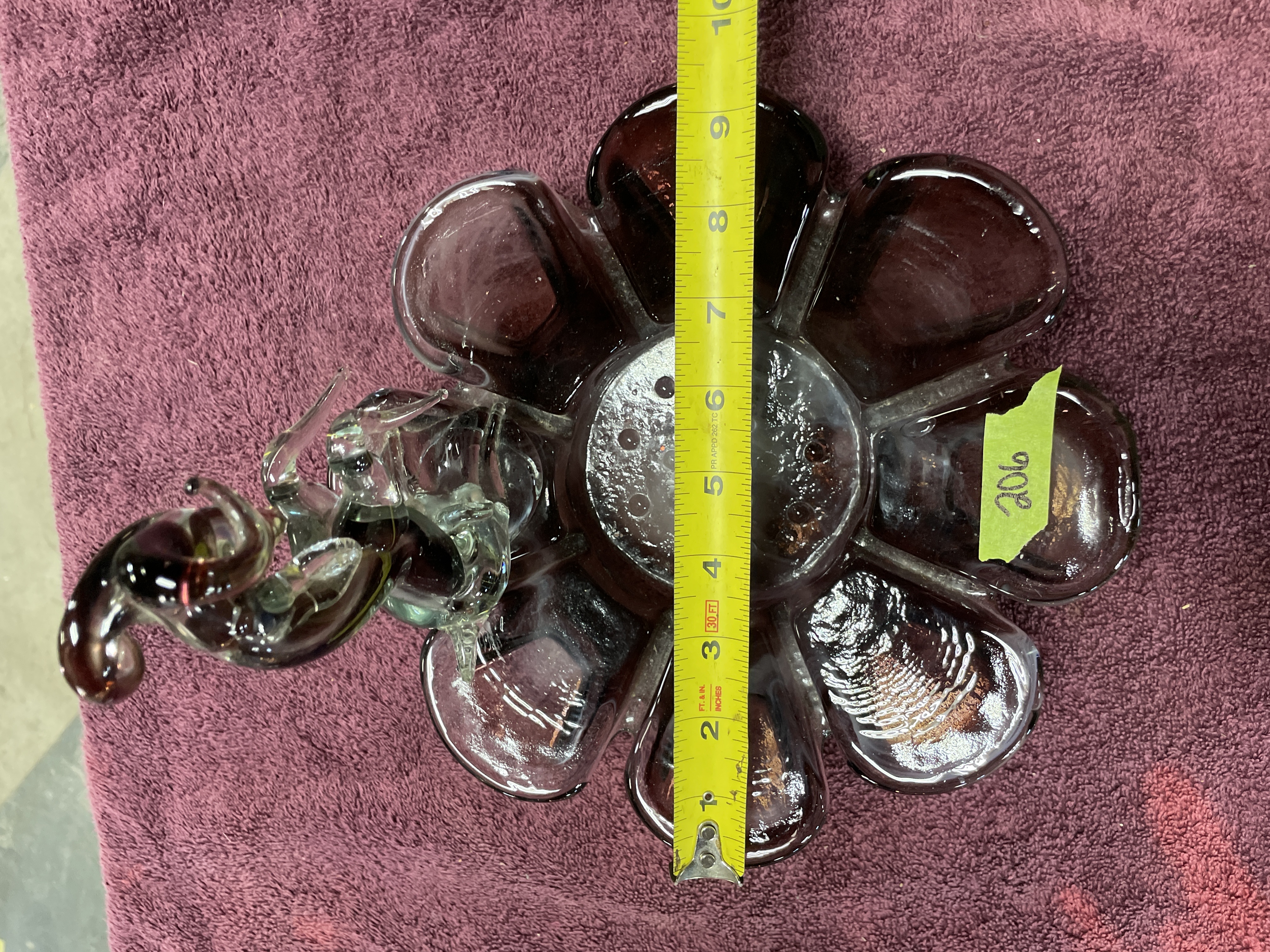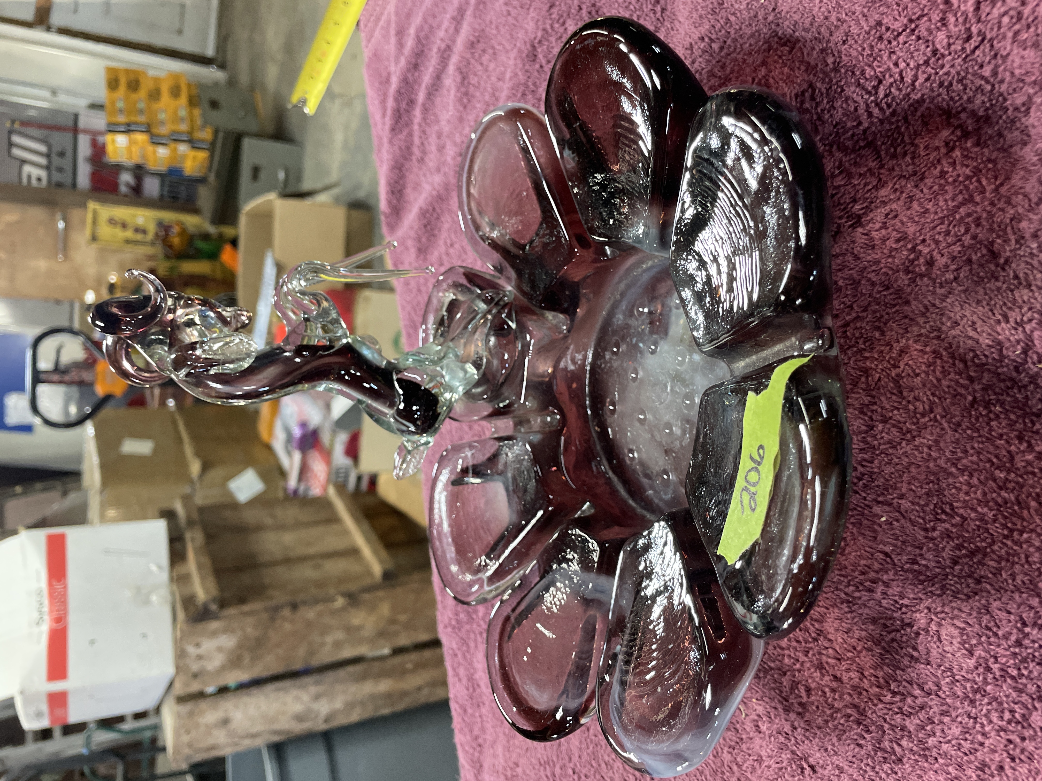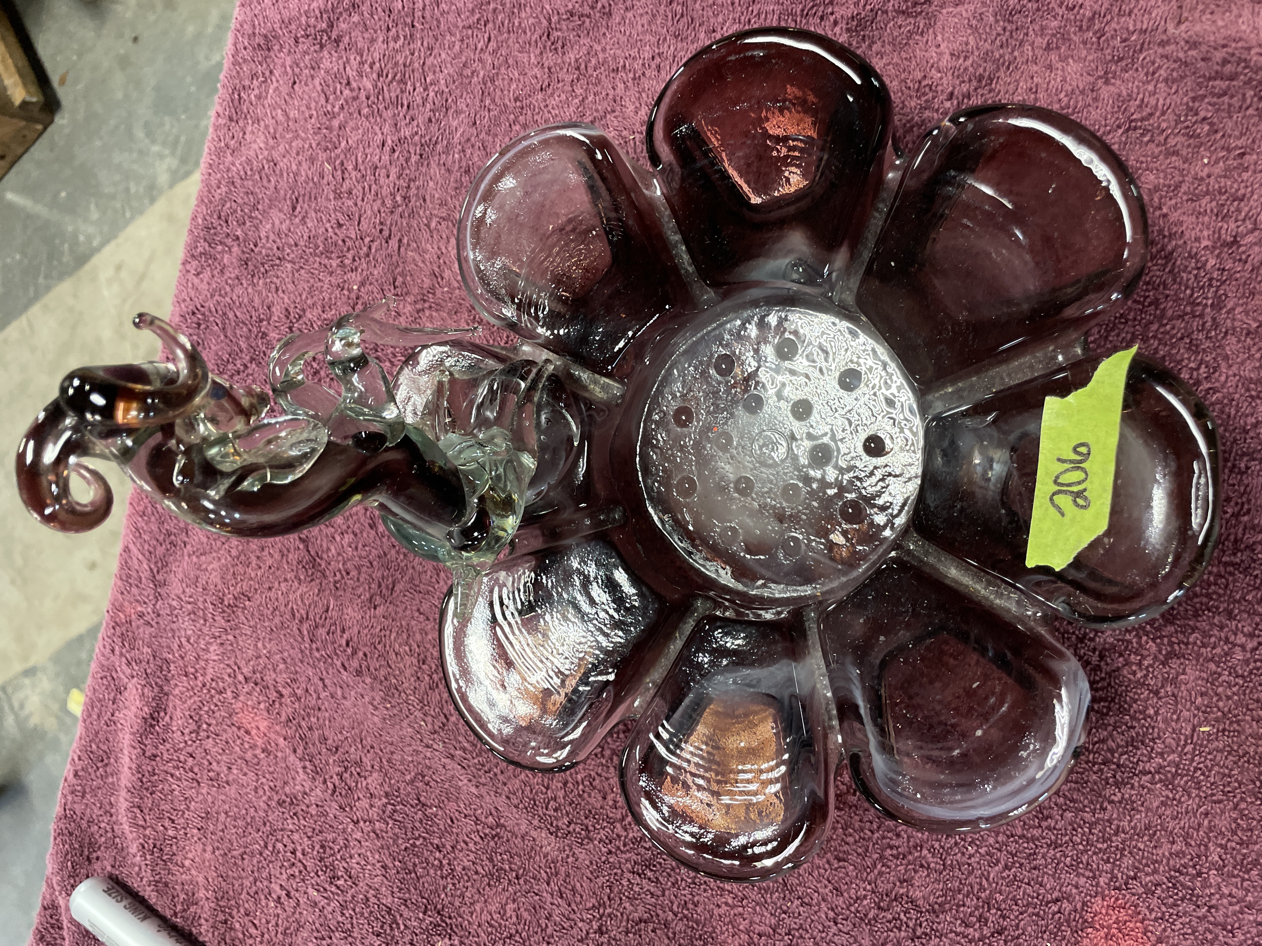 A decorative art glass centerpiece constructed from blown and sculpted glass. The base is formed as a shallow, ruffled bowl with an eight-lobed flower shape, executed in semi-translucent deep amethyst or purple glass. The interior of the bowl features swirled white glass decoration. The central depression contains a controlled bubble pattern. Affixed to the center of the base is a lamp-worked glass sculpture depicting a rearing ram or bighorn sheep. The figurine utilizes clear glass elements contrasted with purple glass defining the body and horns. A handwritten number 206 is marked on a piece of green masking tape applied to one of the base lobes.