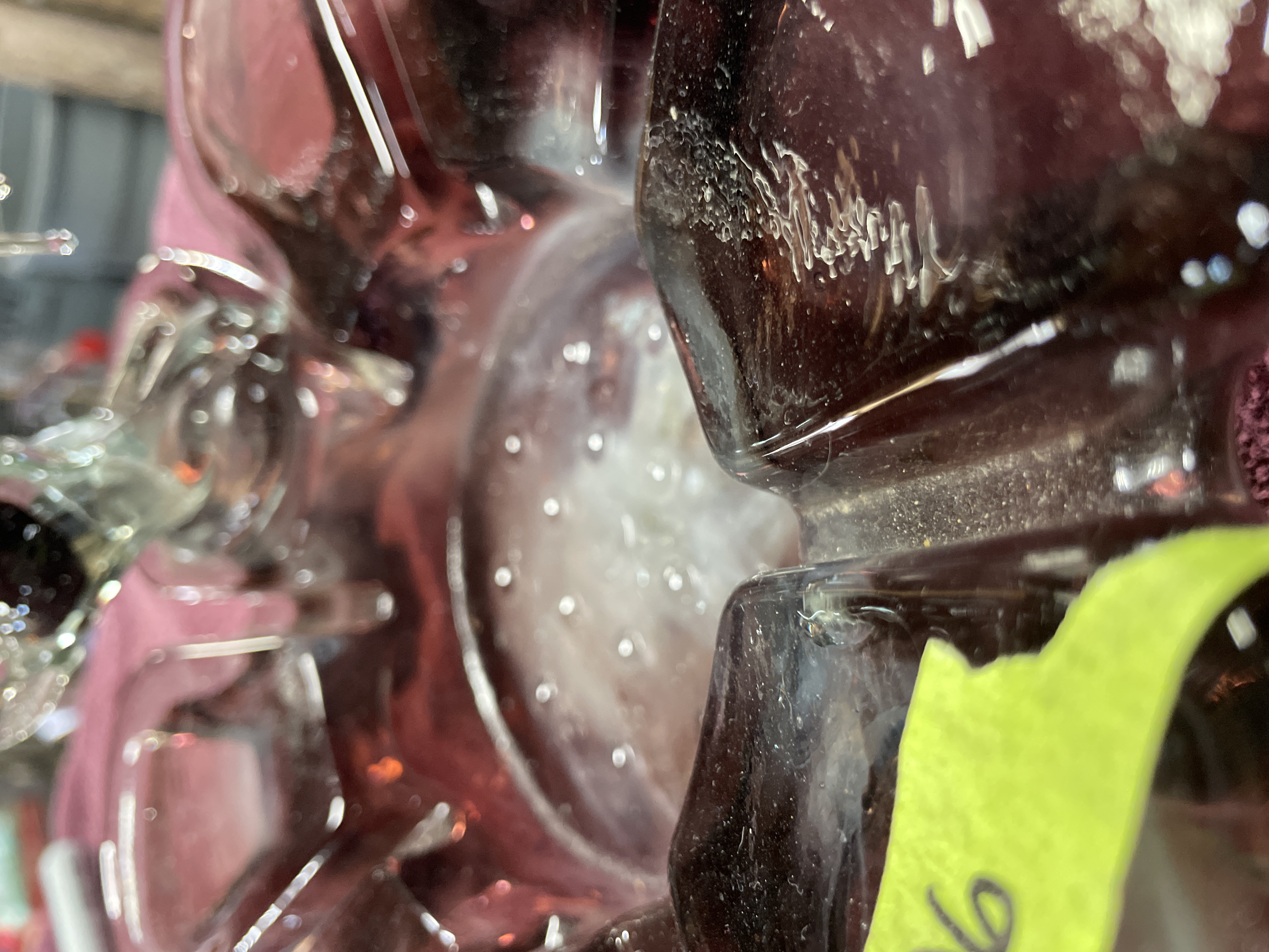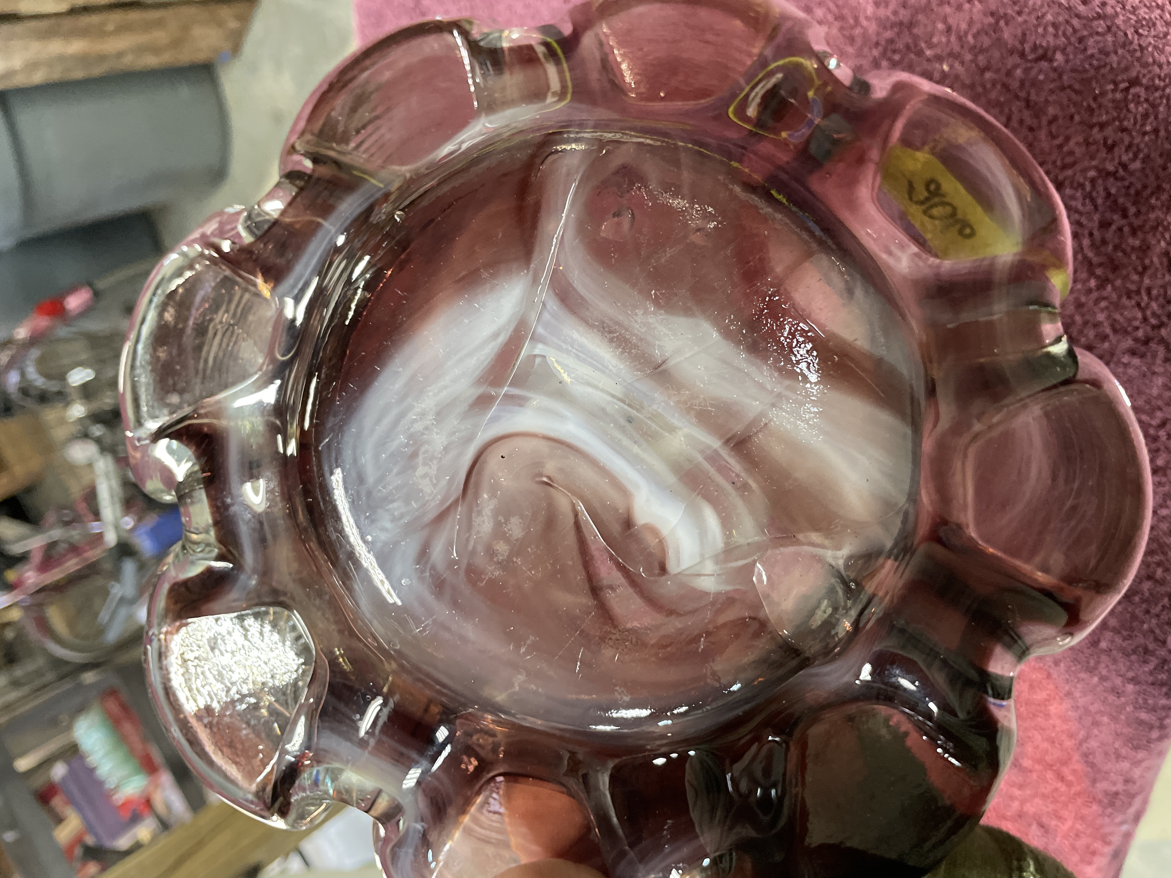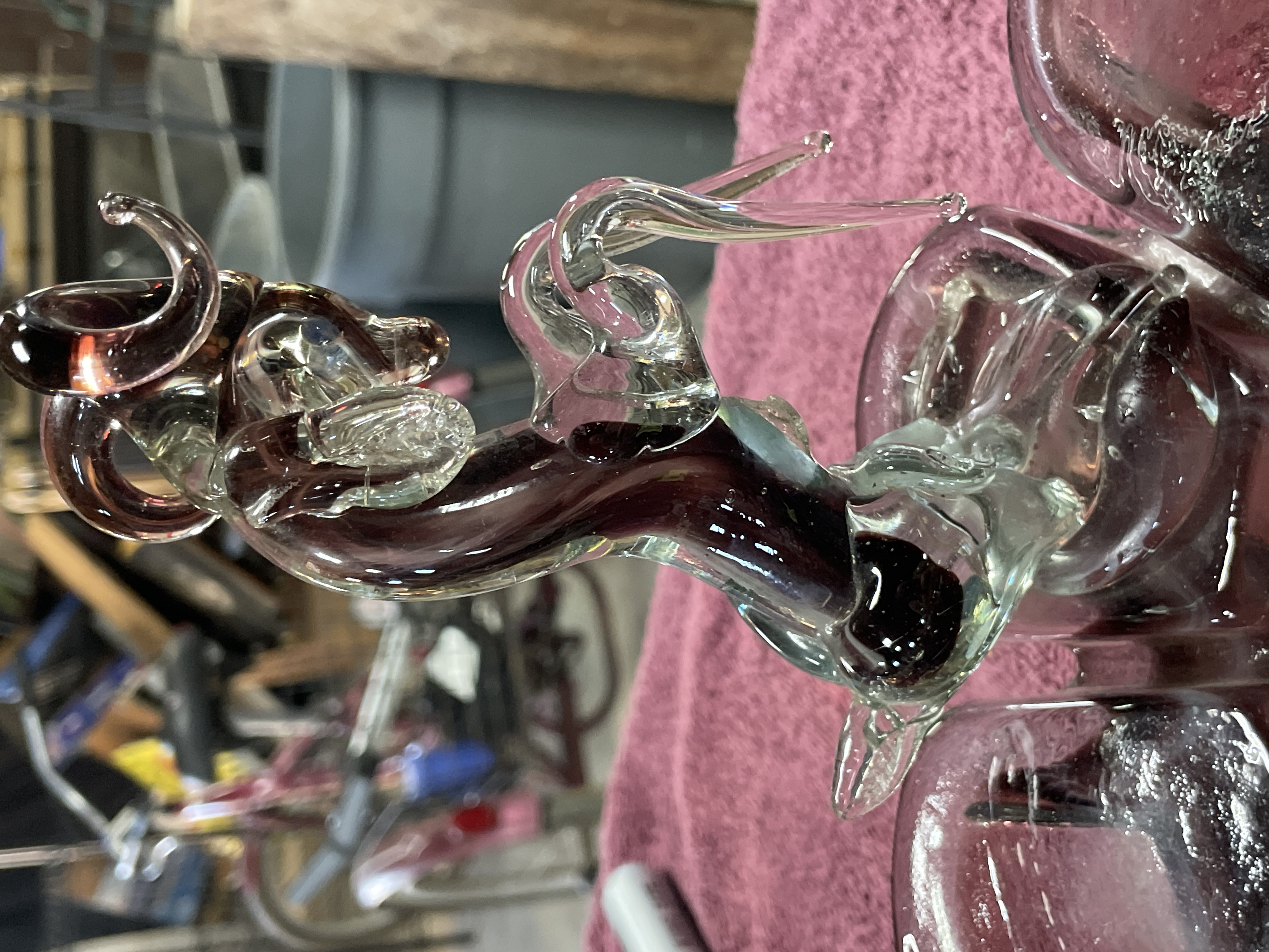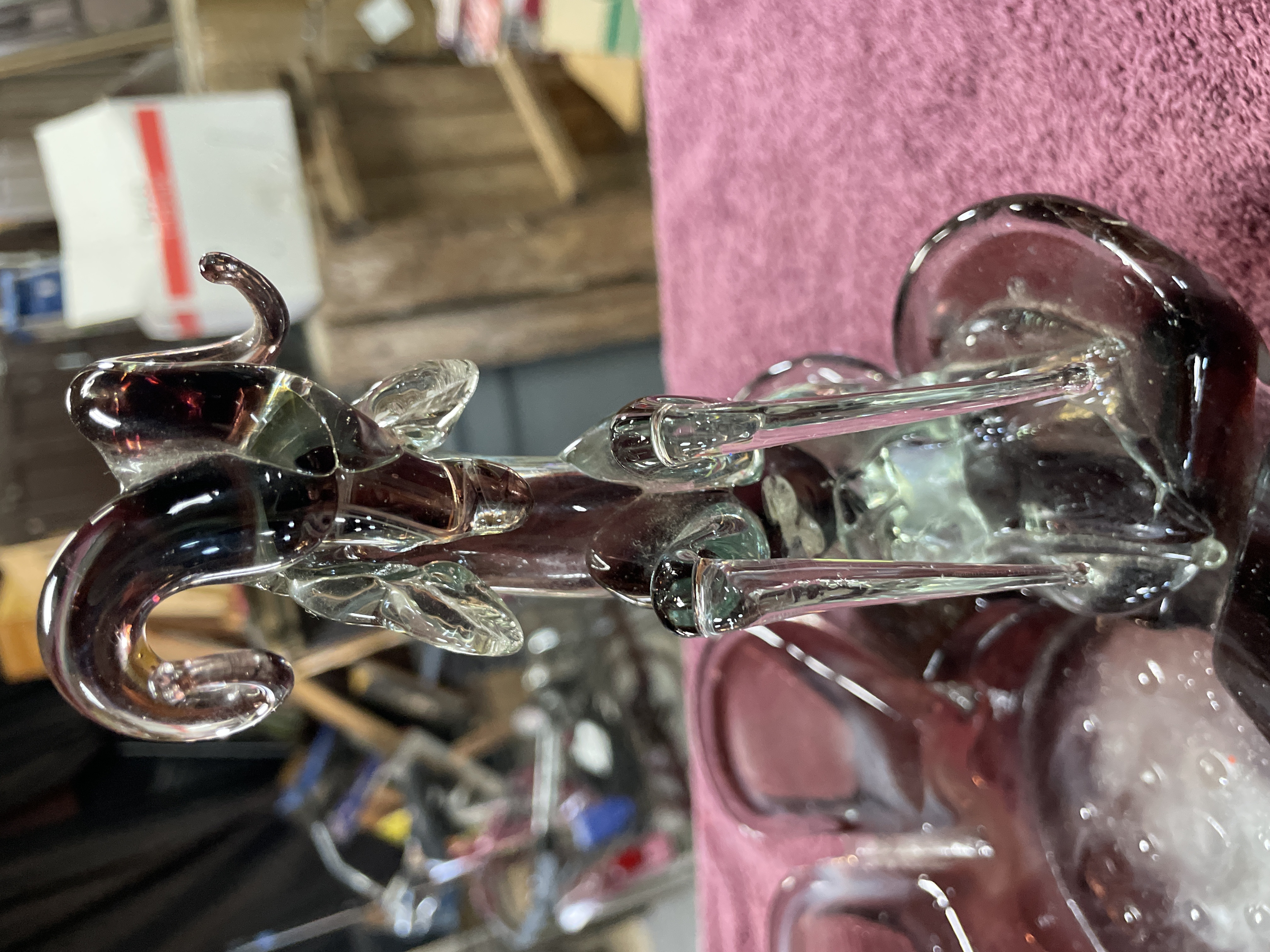 A decorative art glass centerpiece constructed from blown and sculpted glass. The base is formed as a shallow, ruffled bowl with an eight-lobed flower shape, executed in semi-translucent deep amethyst or purple glass. The interior of the bowl features swirled white glass decoration. The central depression contains a controlled bubble pattern. Affixed to the center of the base is a lamp-worked glass sculpture depicting a rearing ram or bighorn sheep. The figurine utilizes clear glass elements contrasted with purple glass defining the body and horns. A handwritten number 206 is marked on a piece of green masking tape applied to one of the base lobes.