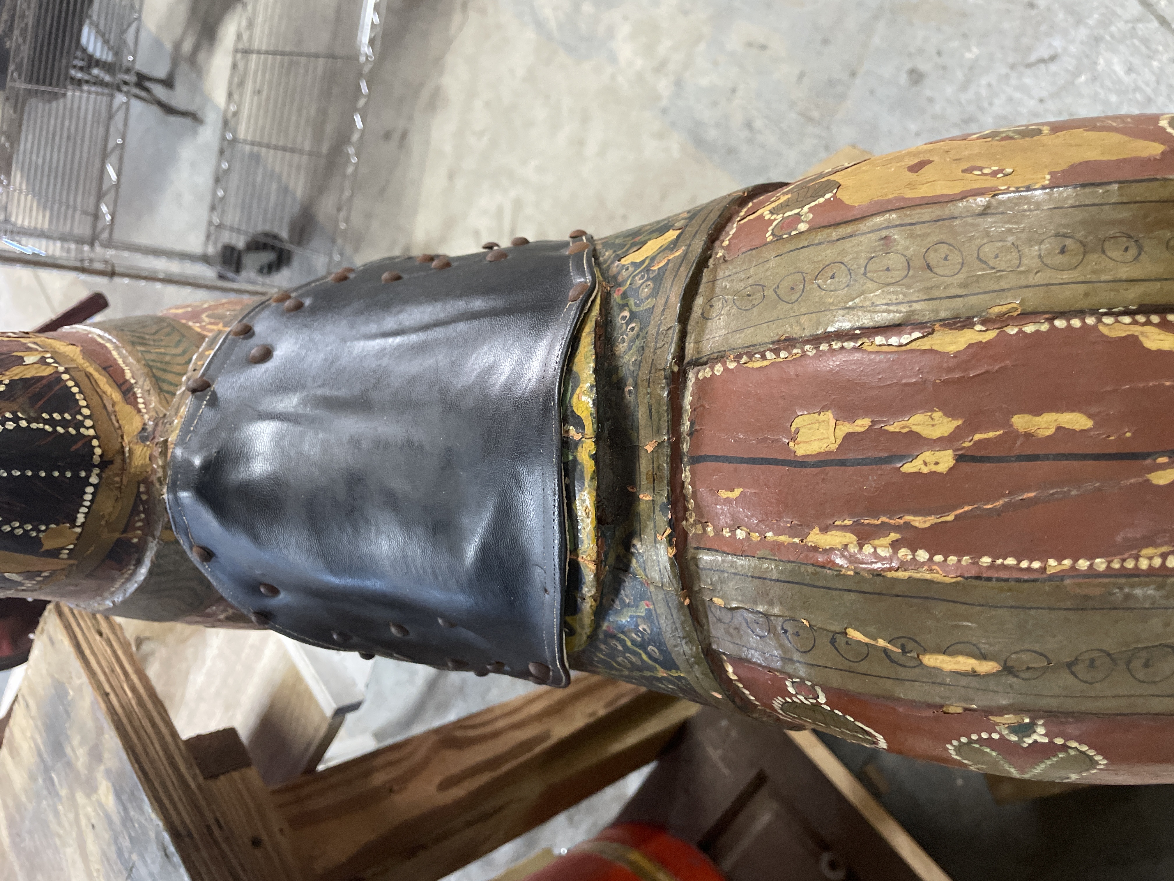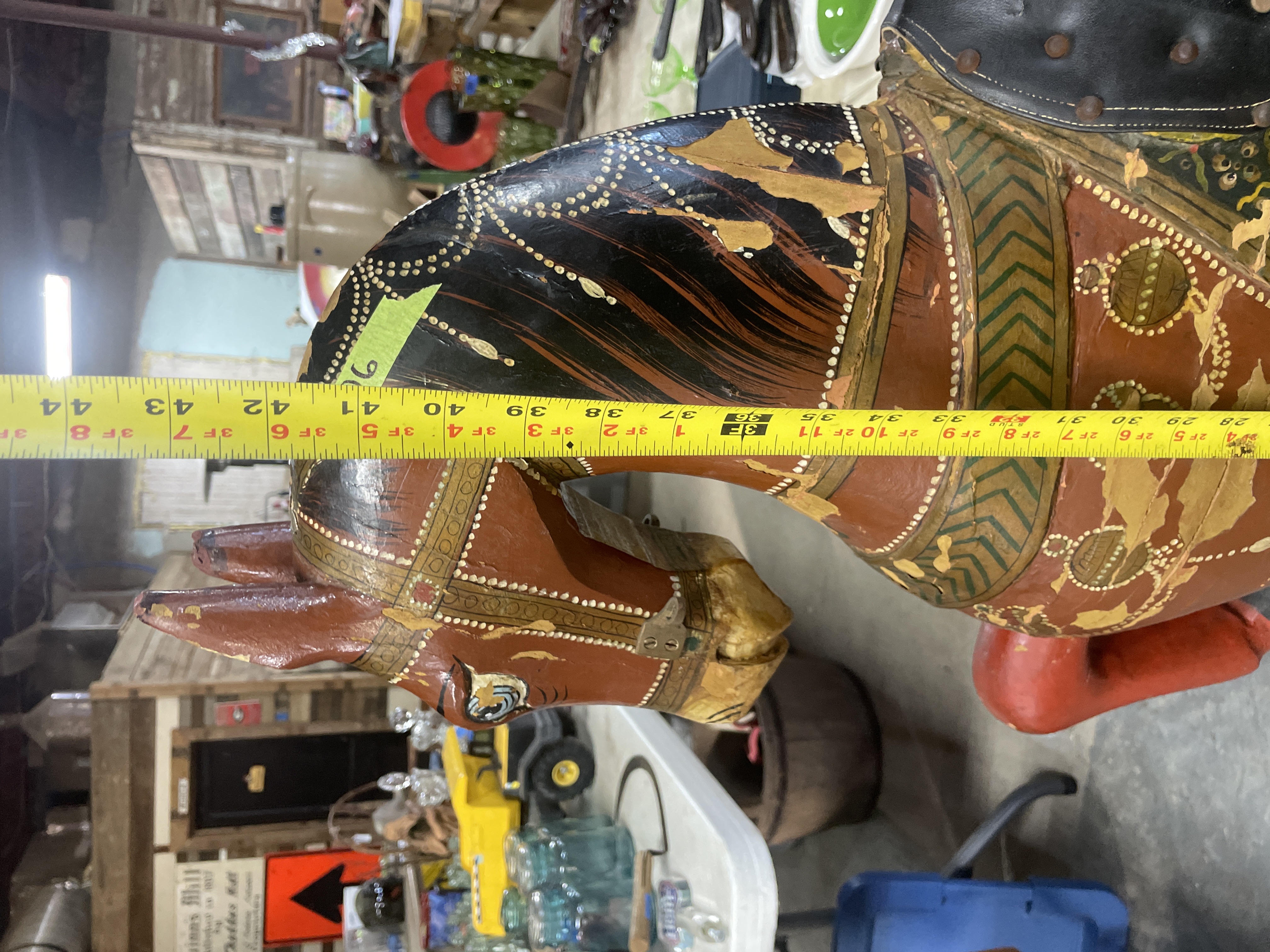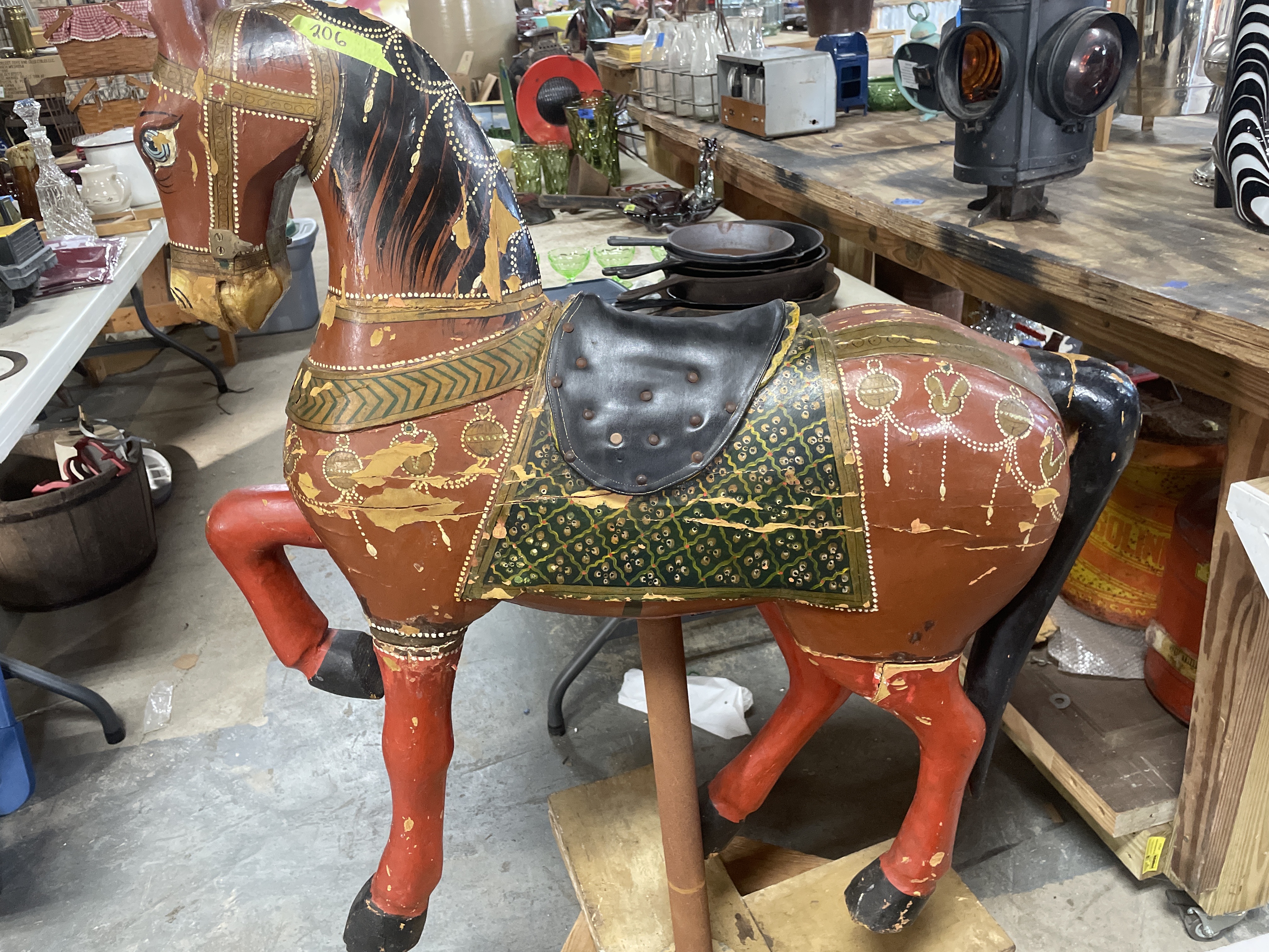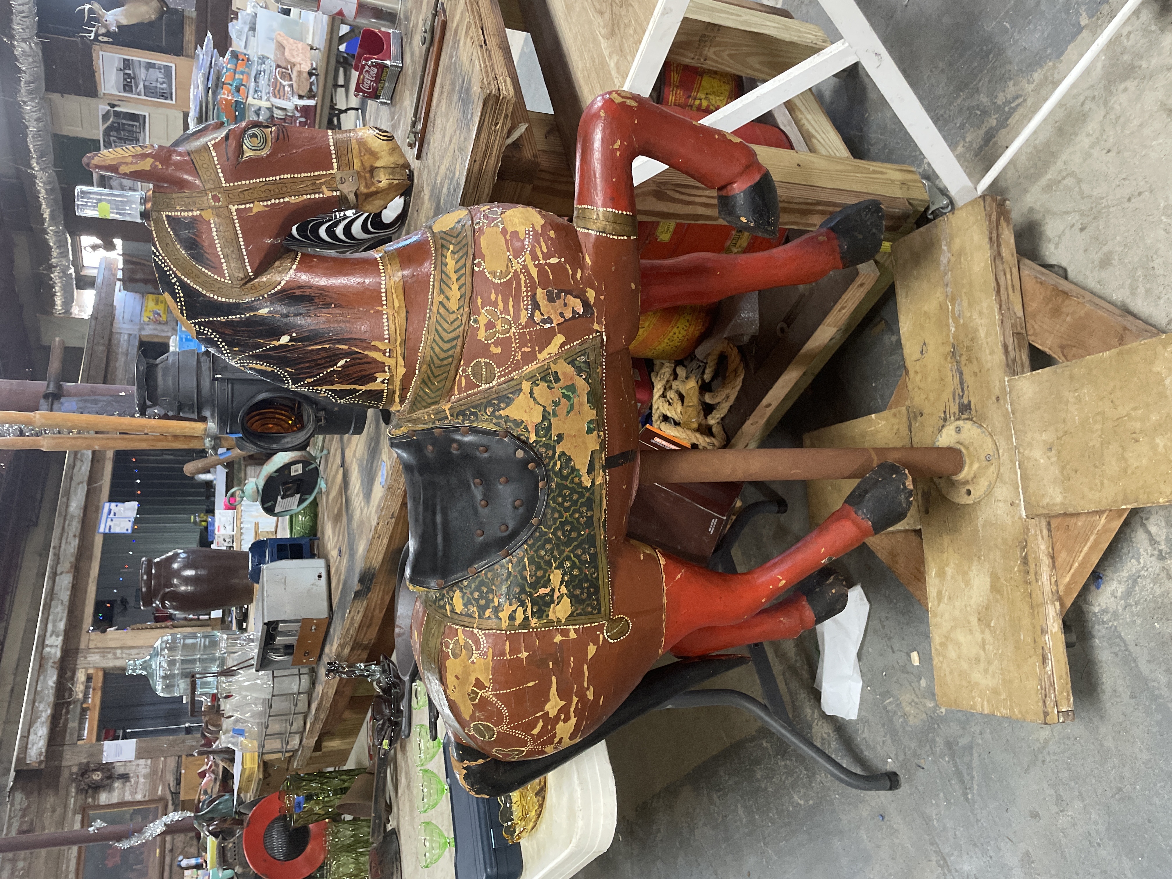 The primary item is a large, hand-carved and painted wooden horse figure, consistent with Rajasthani or Indian decorative folk art traditions. The figure is constructed of carved wood, decorated primarily in reddish-brown, black, and gold tones with green geometric motifs and white dotting. The horse is mounted on a rudimentary wooden cross-base via a rusted metal pipe post and features a modern, black vinyl saddle secured with rusty metal tacks.
