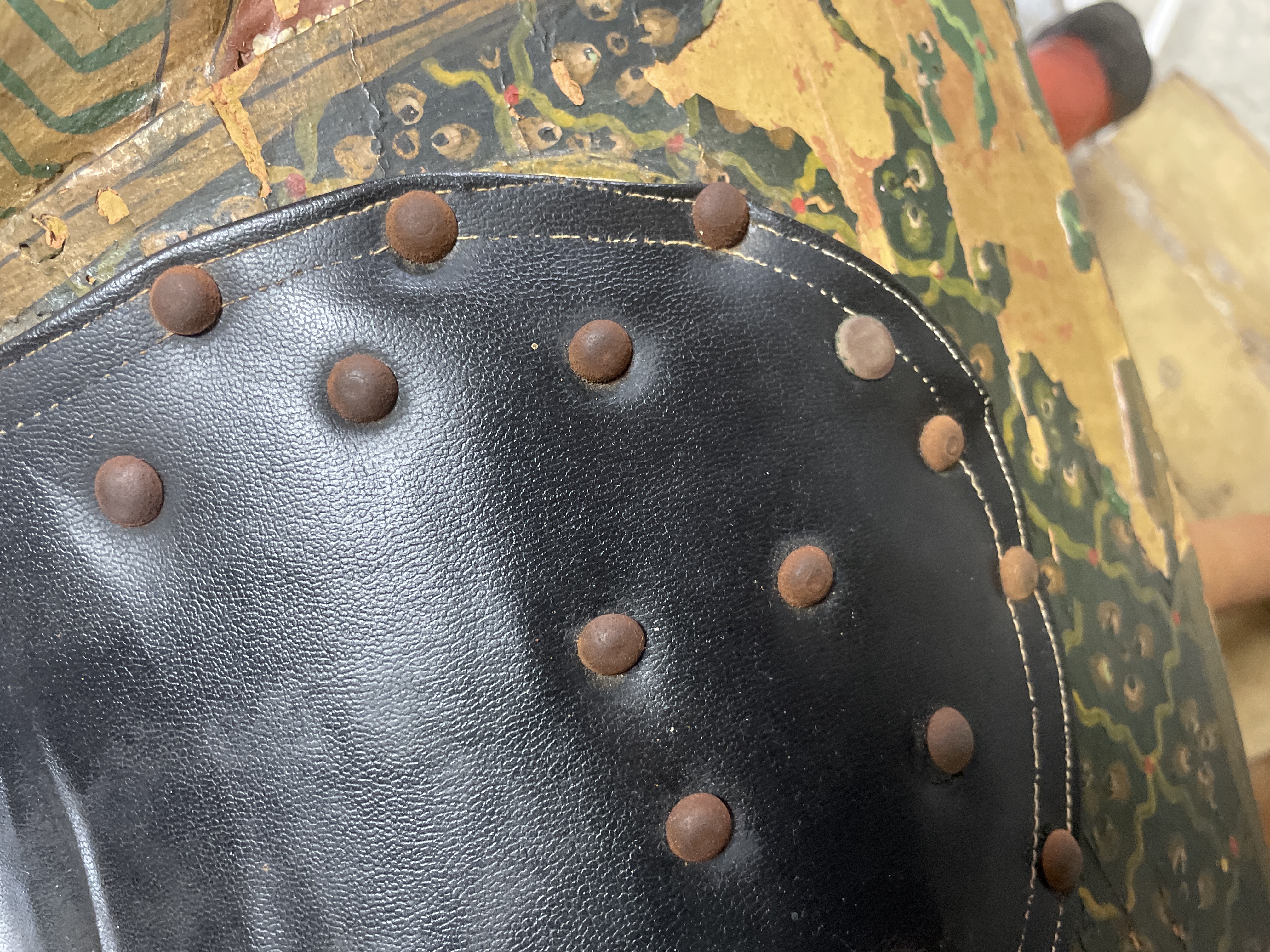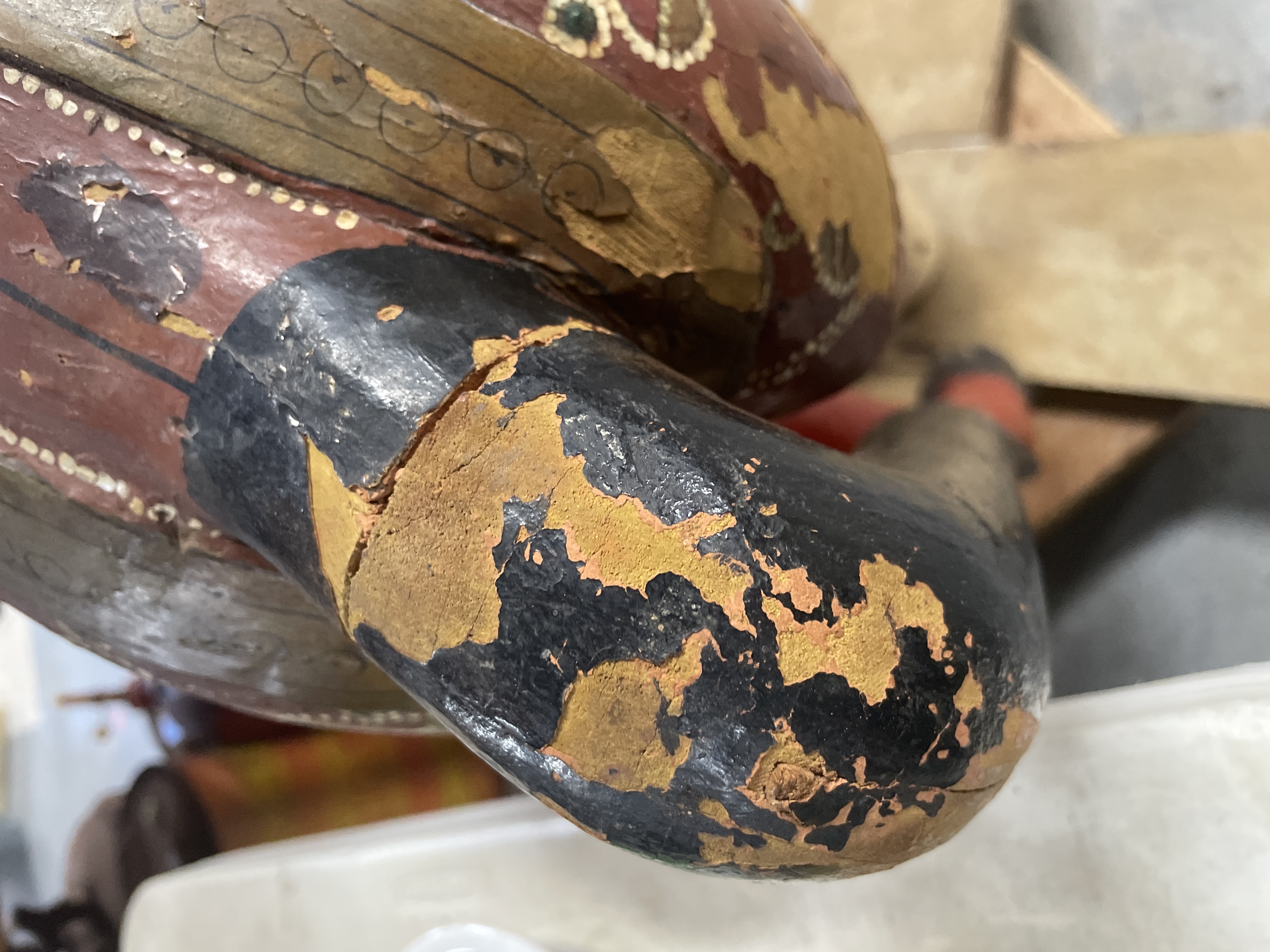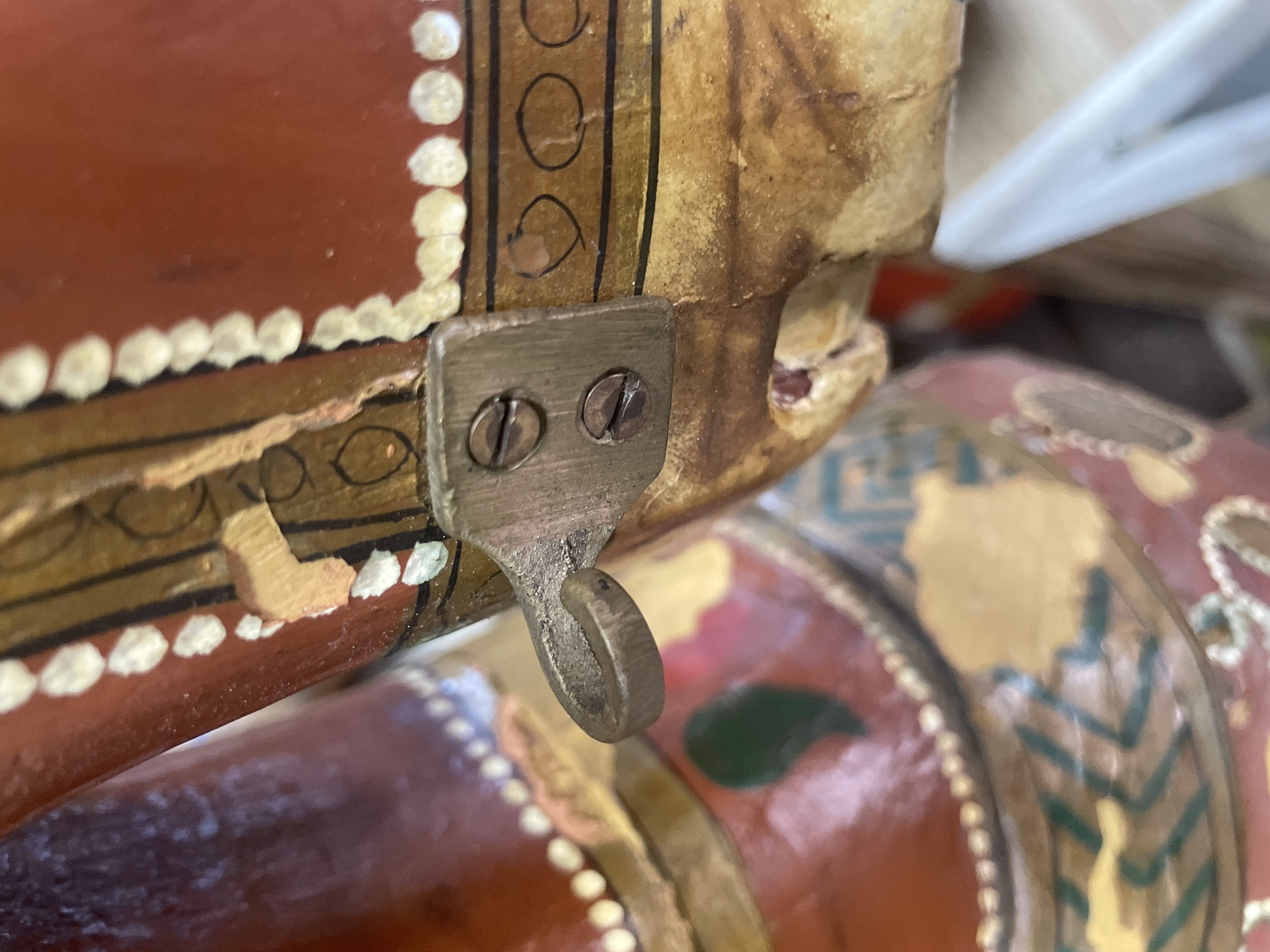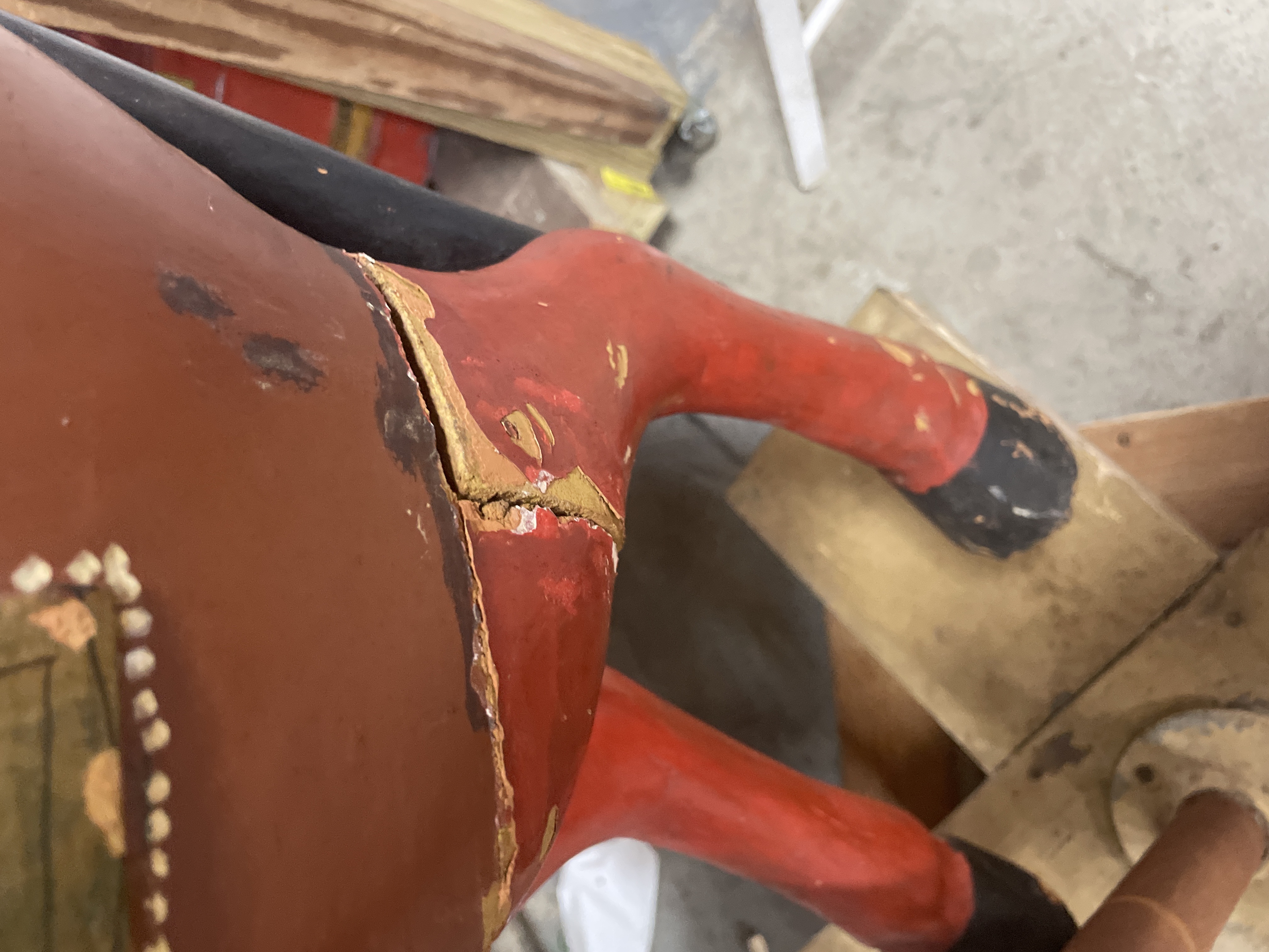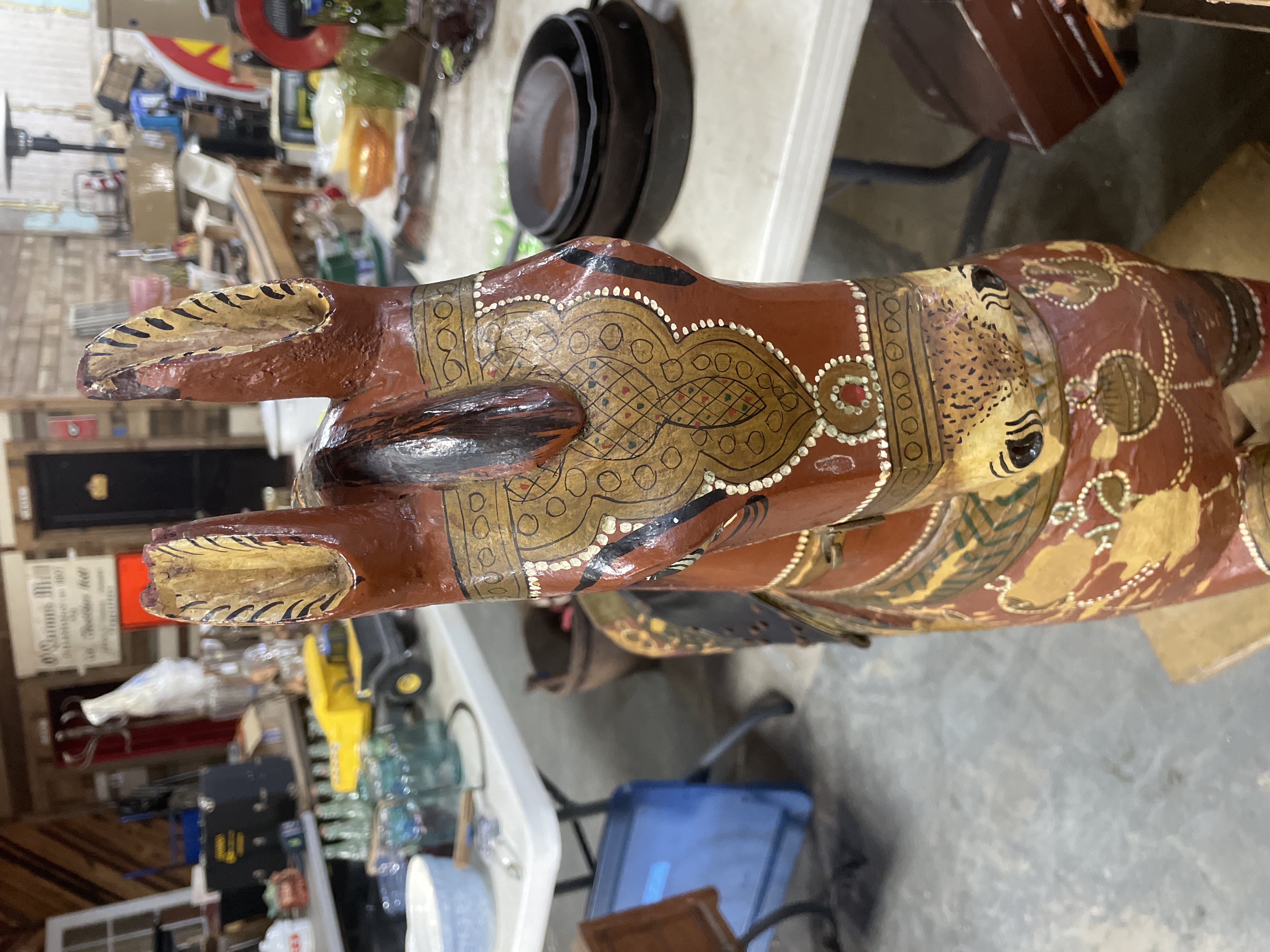The primary item is a large, hand-carved and painted wooden horse figure, consistent with Rajasthani or Indian decorative folk art traditions. The figure is constructed of carved wood, decorated primarily in reddish-brown, black, and gold tones with green geometric motifs and white dotting. The horse is mounted on a rudimentary wooden cross-base via a rusted metal pipe post and features a modern, black vinyl saddle secured with rusty metal tacks.
