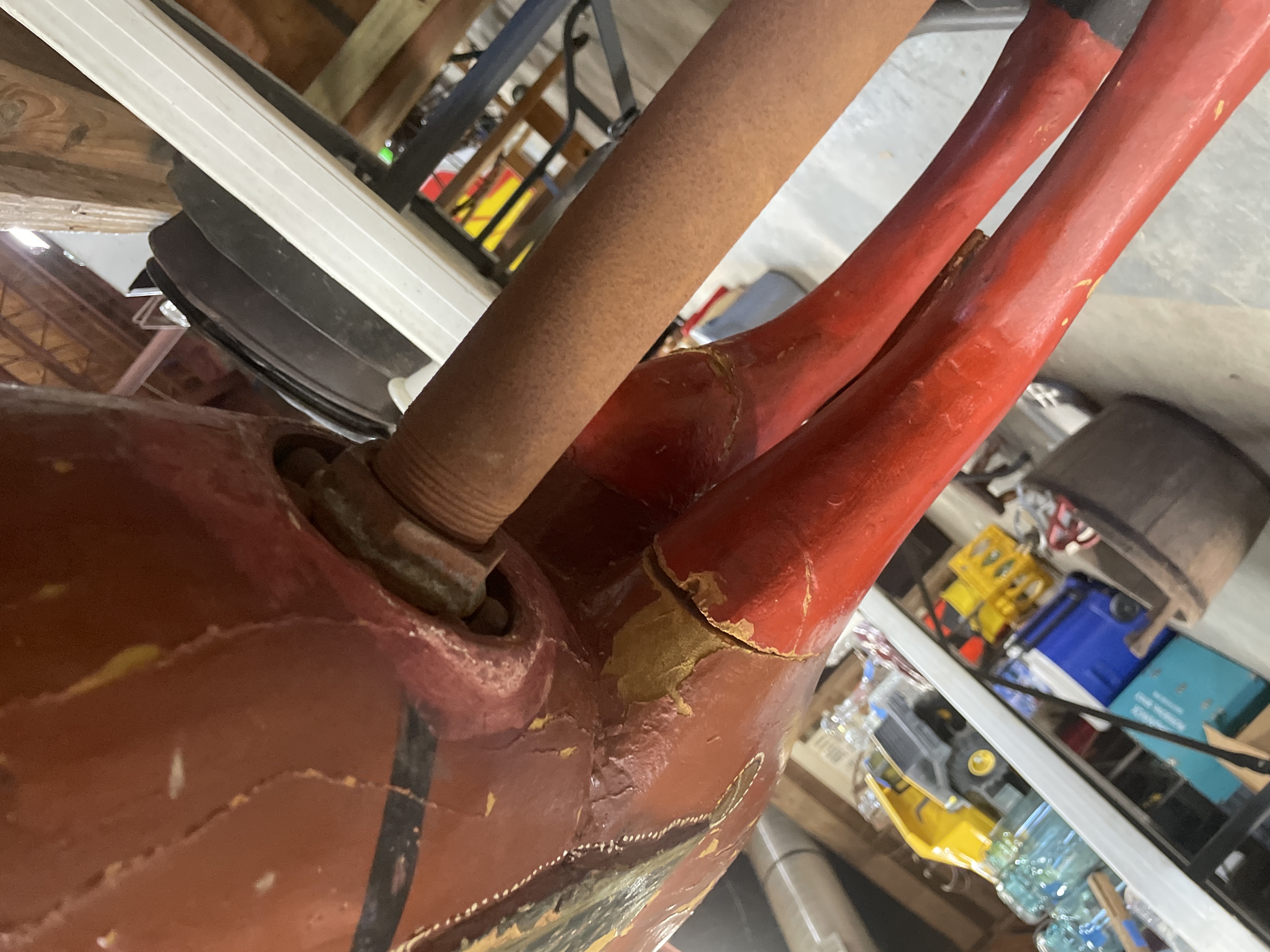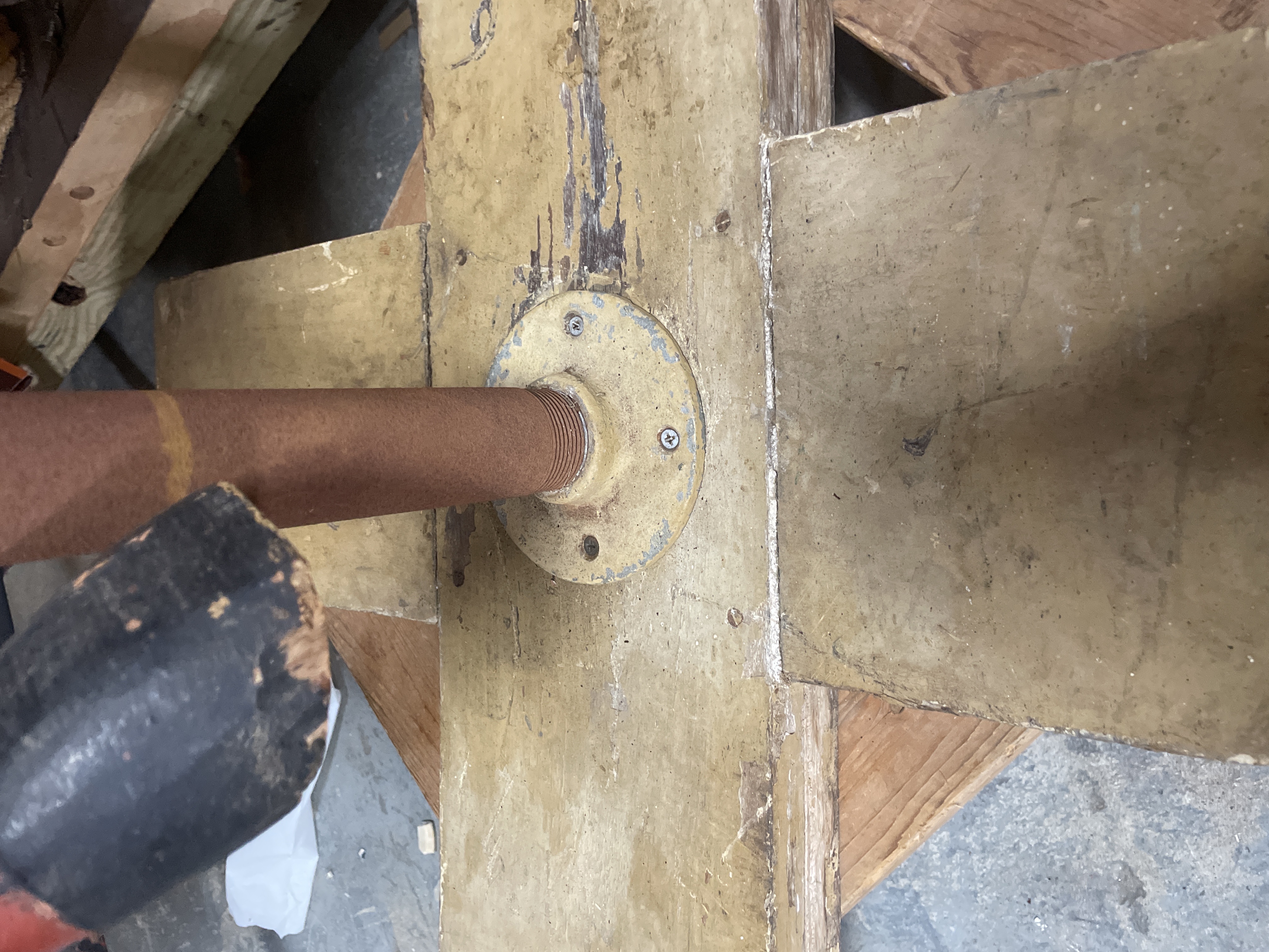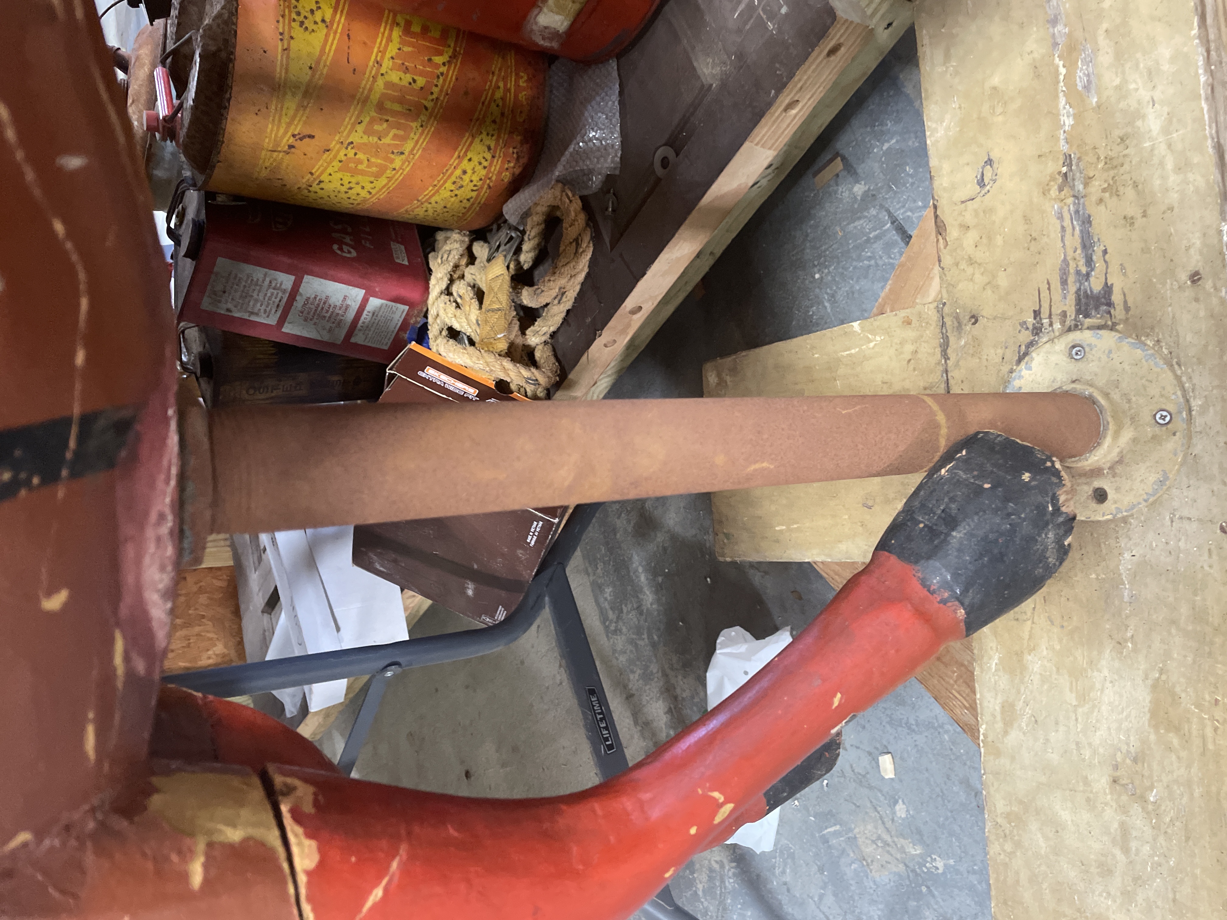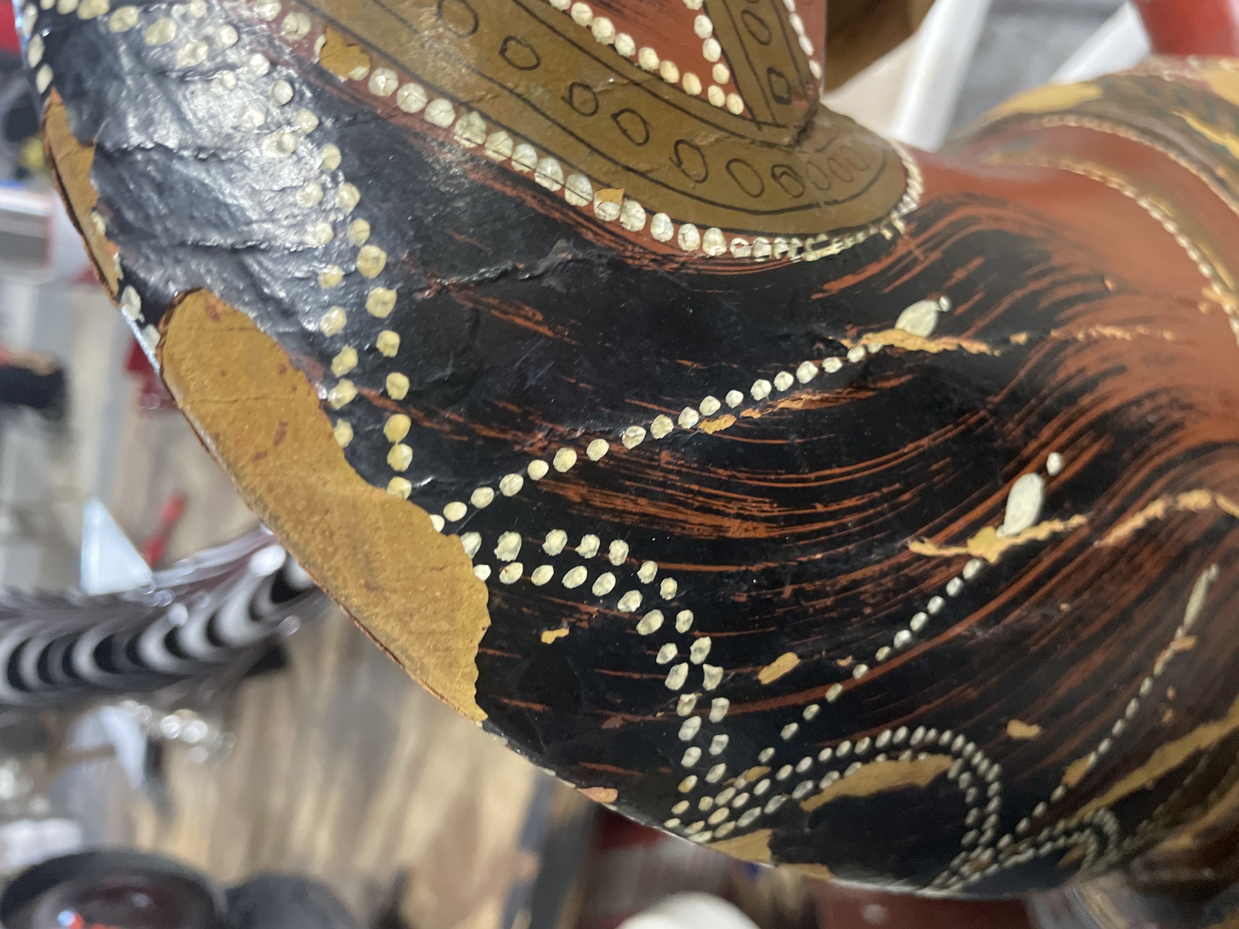 The primary item is a large, hand-carved and painted wooden horse figure, consistent with Rajasthani or Indian decorative folk art traditions. The figure is constructed of carved wood, decorated primarily in reddish-brown, black, and gold tones with green geometric motifs and white dotting. The horse is mounted on a rudimentary wooden cross-base via a rusted metal pipe post and features a modern, black vinyl saddle secured with rusty metal tacks.
