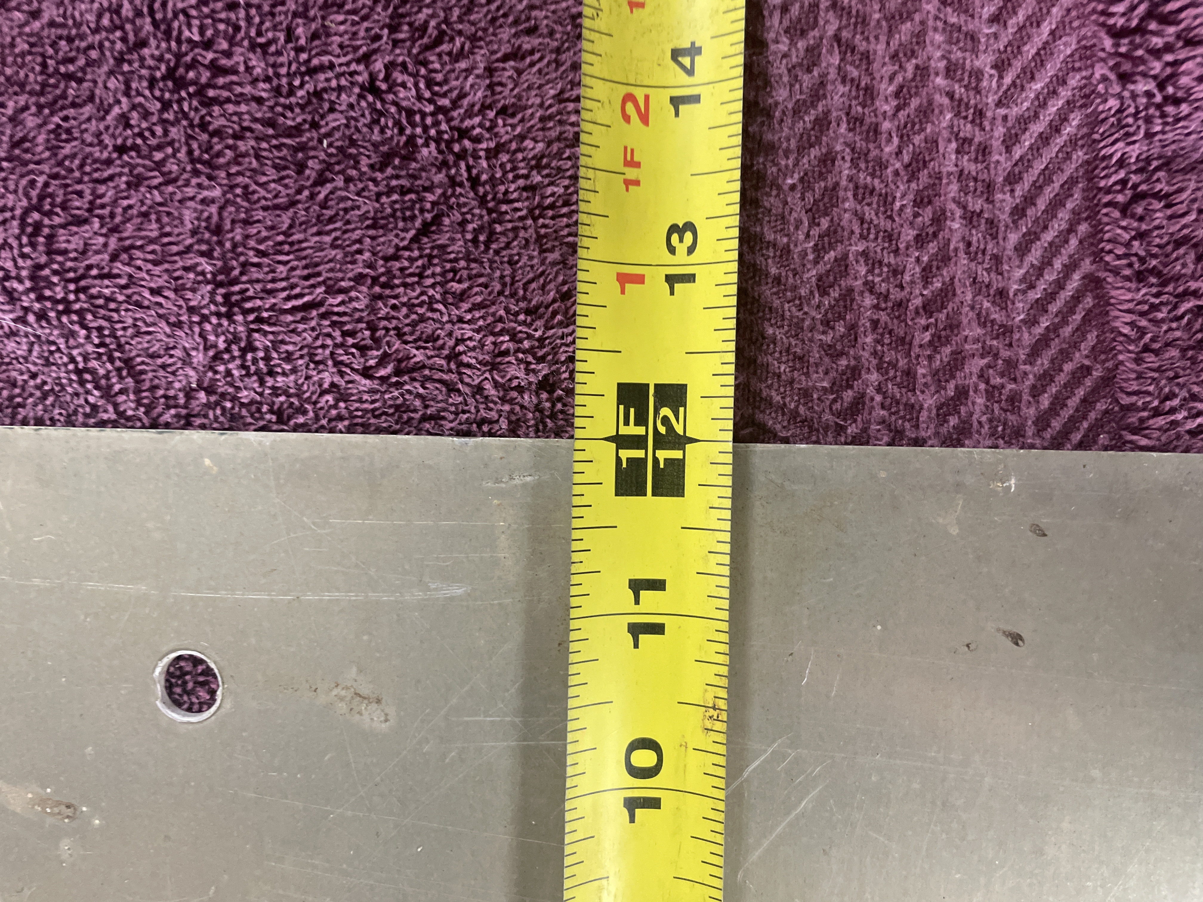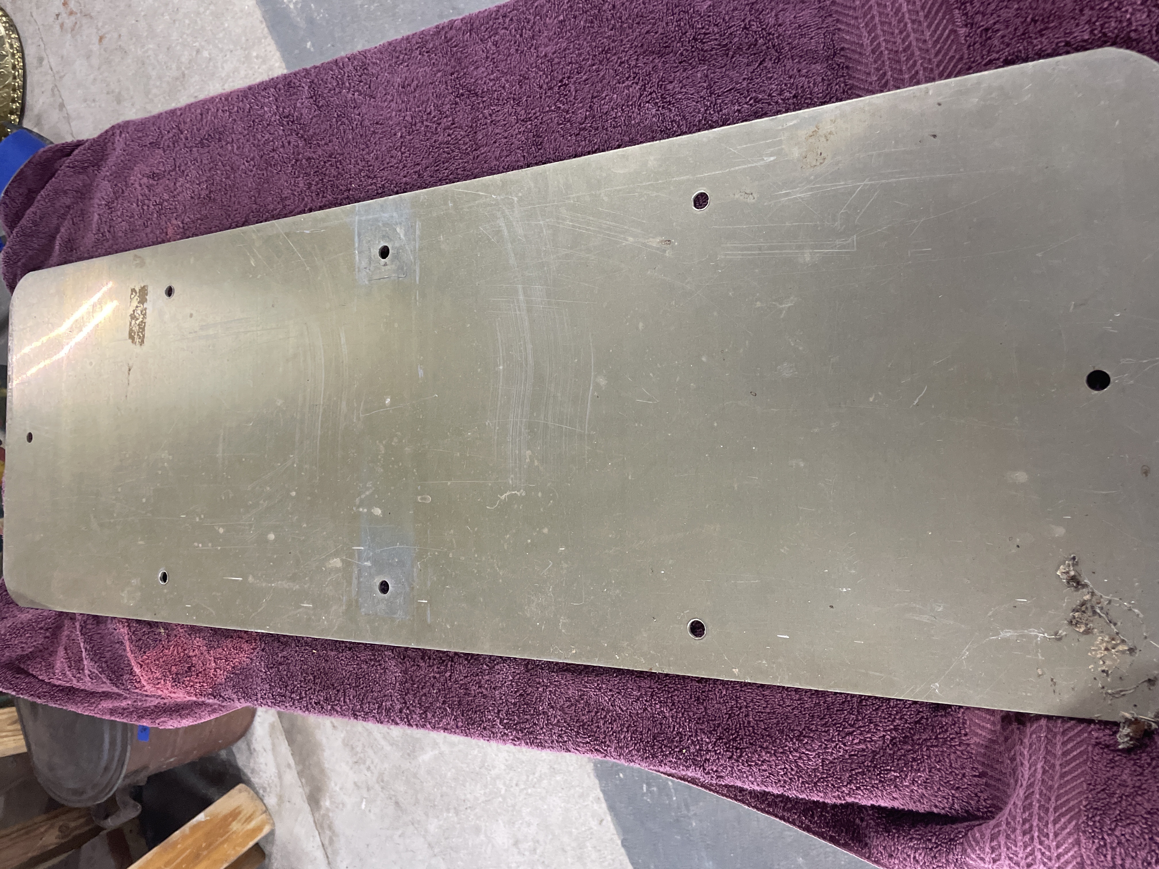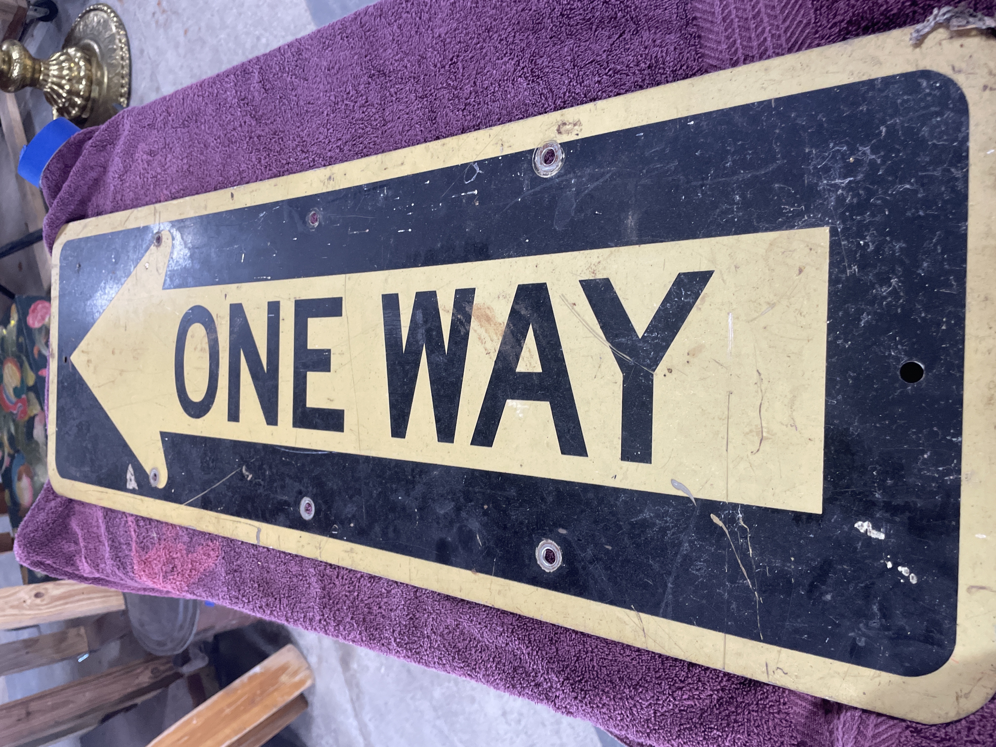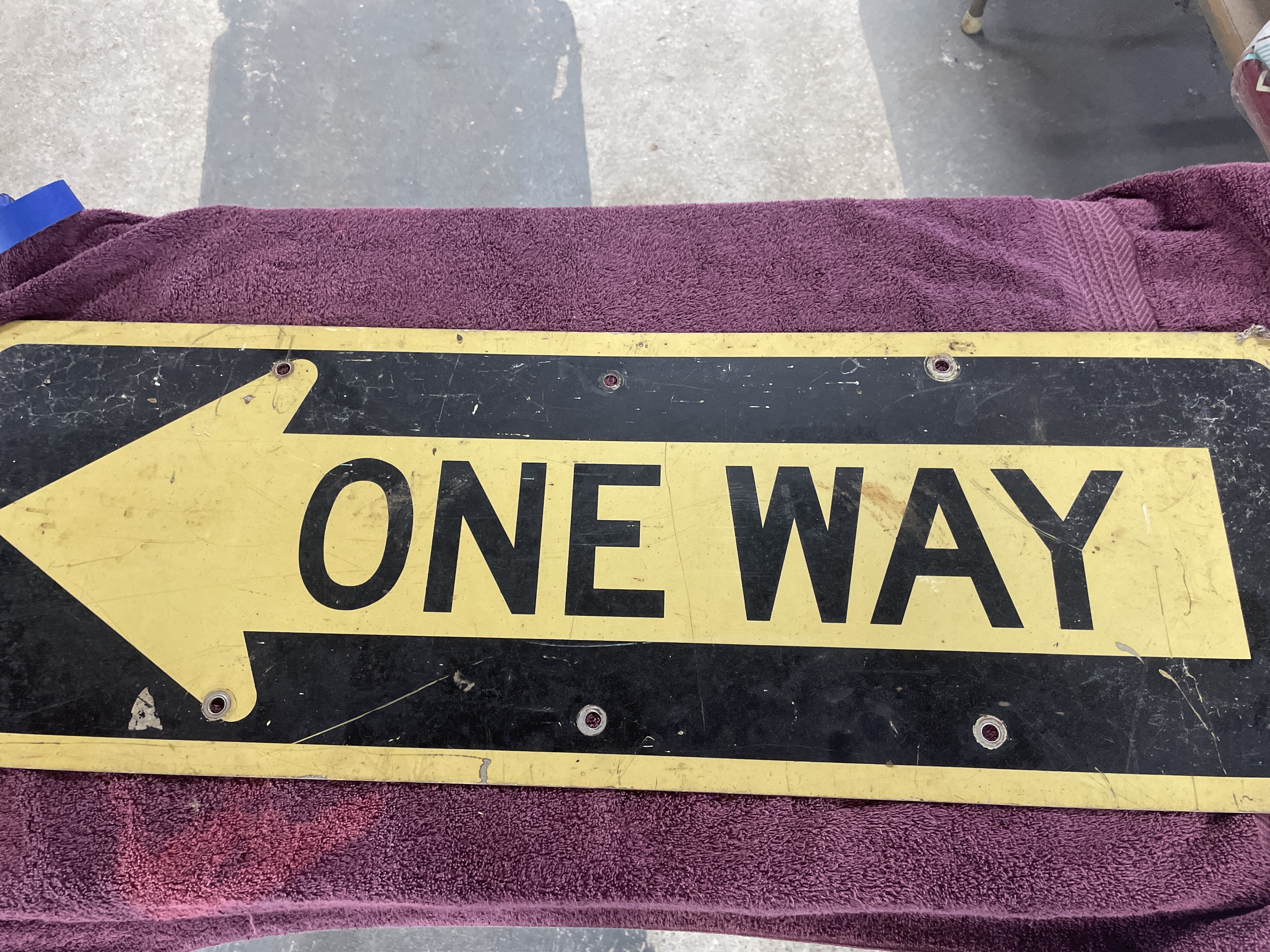 A single vintage regulatory traffic sign constructed of enameled metal. The sign features a black field overlaid with a yellow-gold directional arrow pointing left, containing the capitalized text "ONE WAY" rendered in black block letters. The sign is rectangular with rounded corners and is equipped with multiple pre-drilled mounting holes along the perimeter. The reverse side is bare metal, showing evidence of previous mounting hardware attachment.