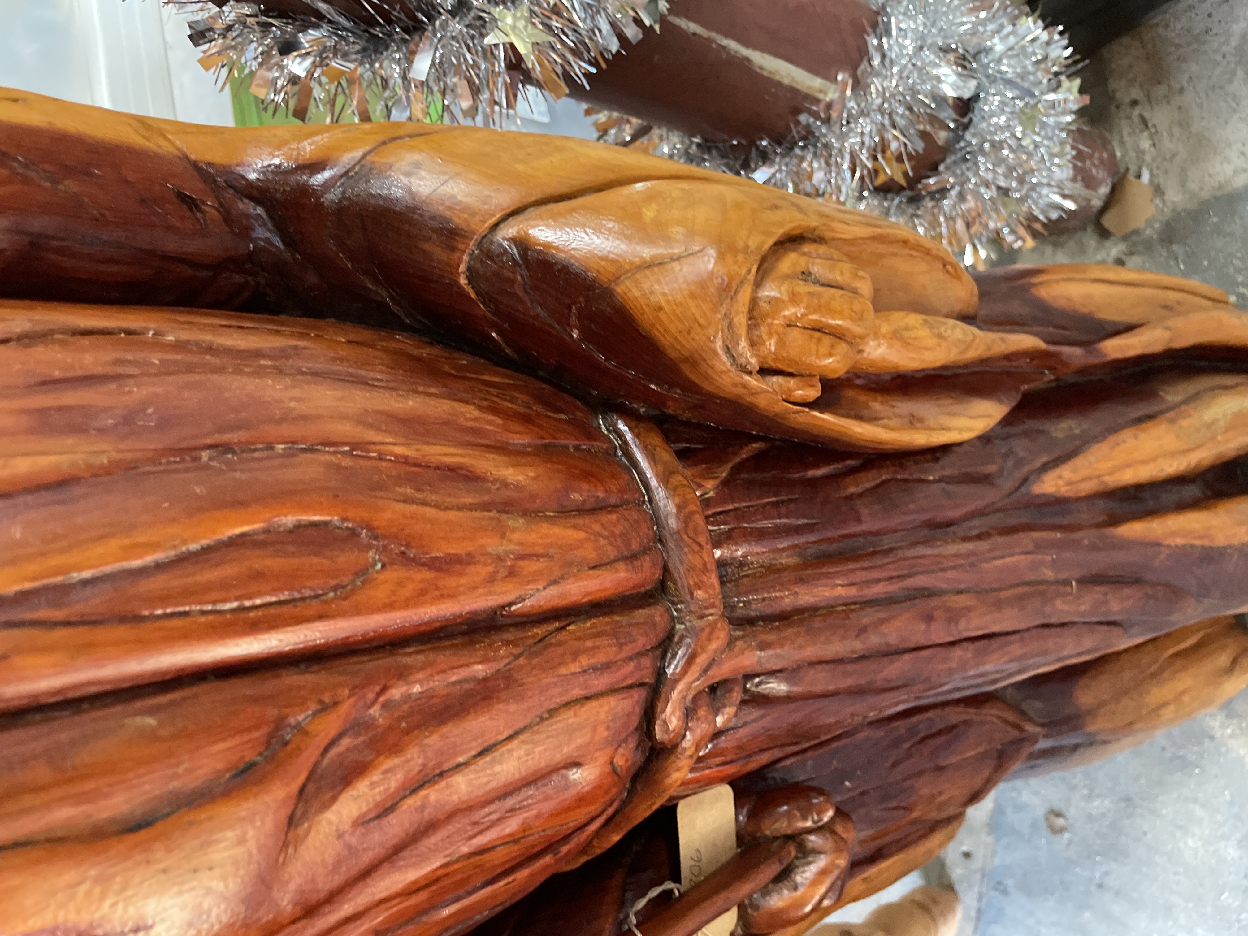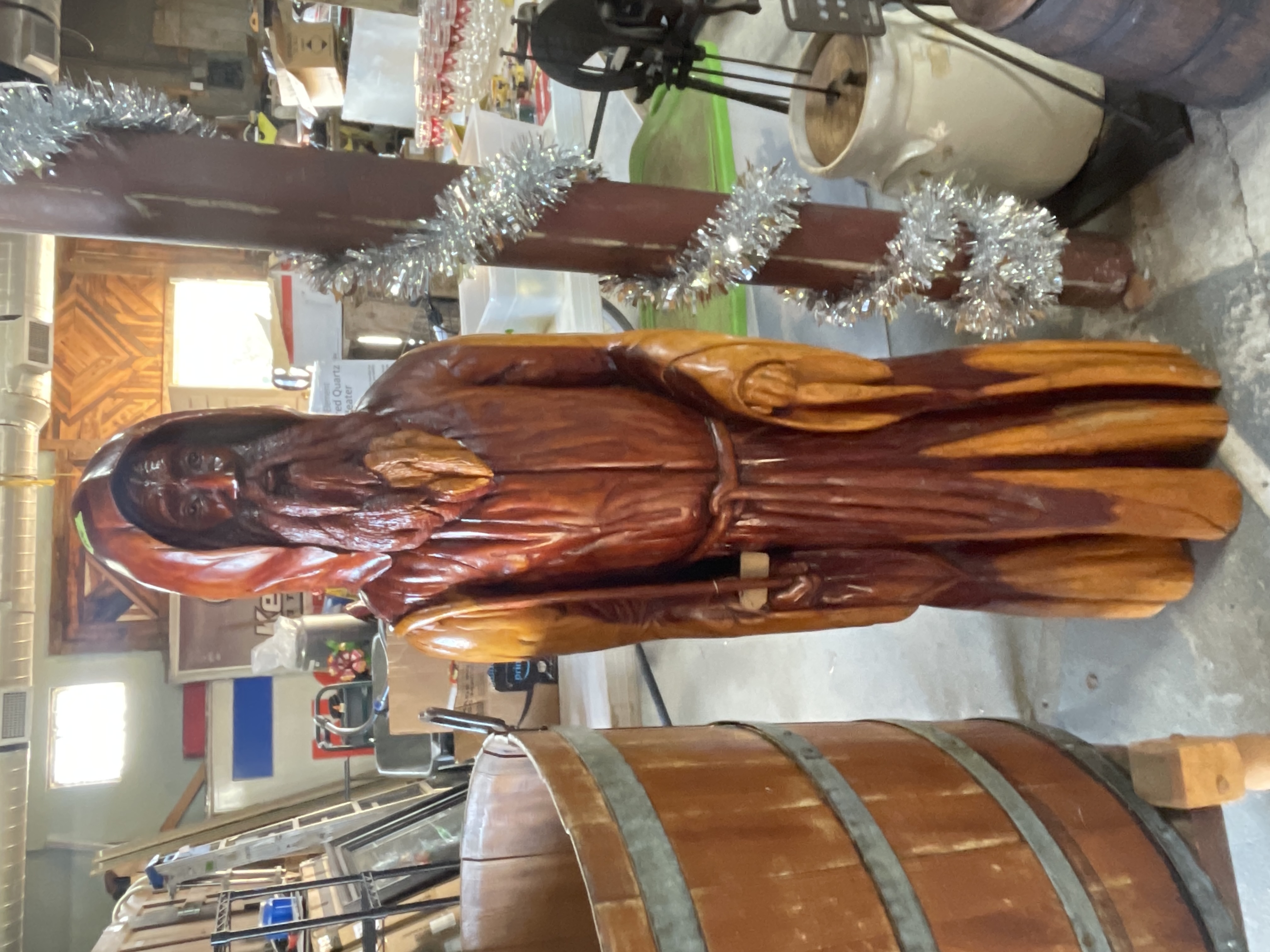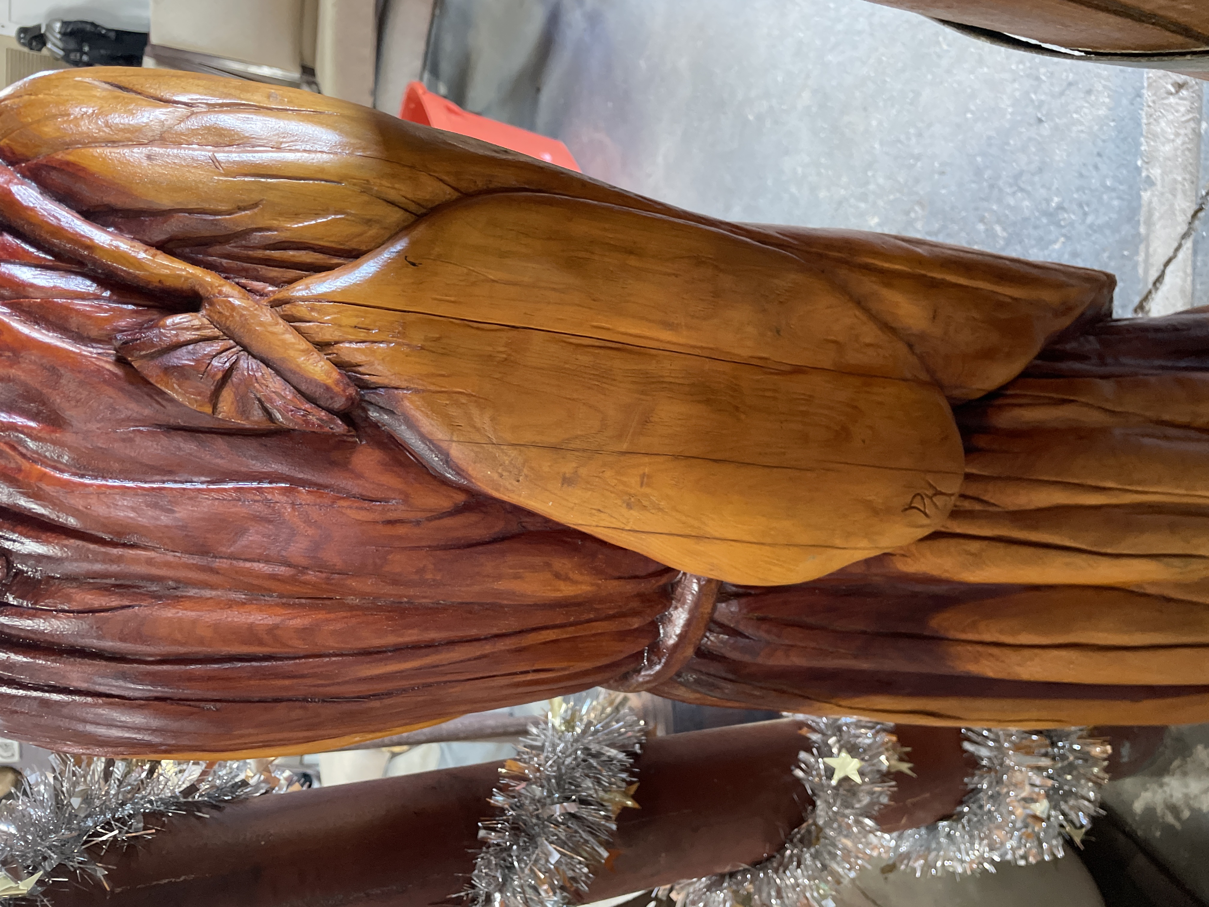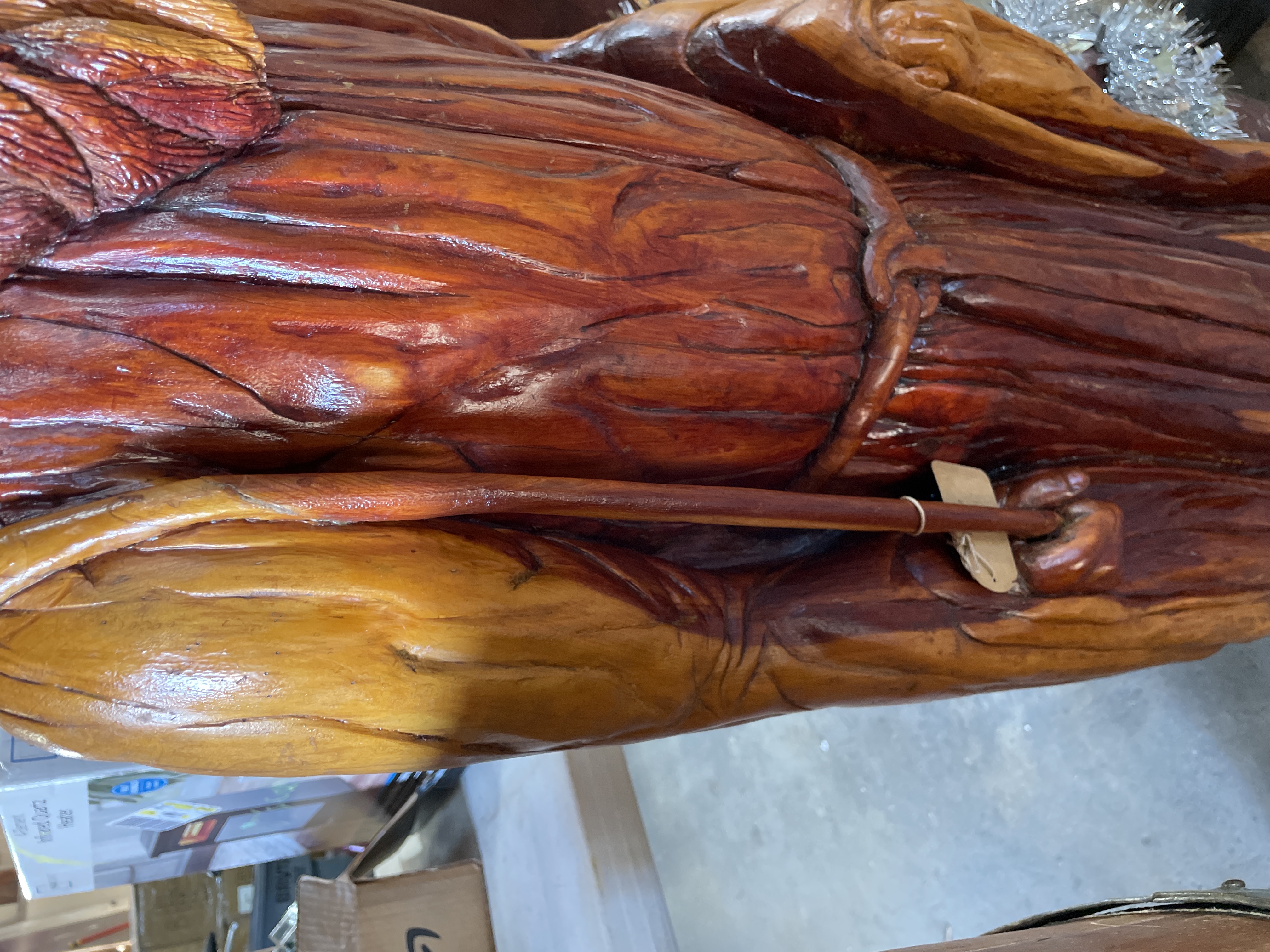 A single large contemporary carved wooden statue depicting a bearded, hooded figure, consistent with a monk, hermit, or similar religious type. The sculpture is executed in a rustic or folk art style, featuring deeply textured carving used to render the long robes, beard, and drapery folds. The piece is finished with a high-gloss varnish that emphasizes the contrasting dark reddish-brown and lighter golden-brown tones of the wood grain. The figure holds a staff or shepherd’s crook in its left hand. A substantial sack or pouch is carved hanging on its right side, which bears the incised initials "RK." An auxiliary inventory tag reading "206" is visible near the top of the head.