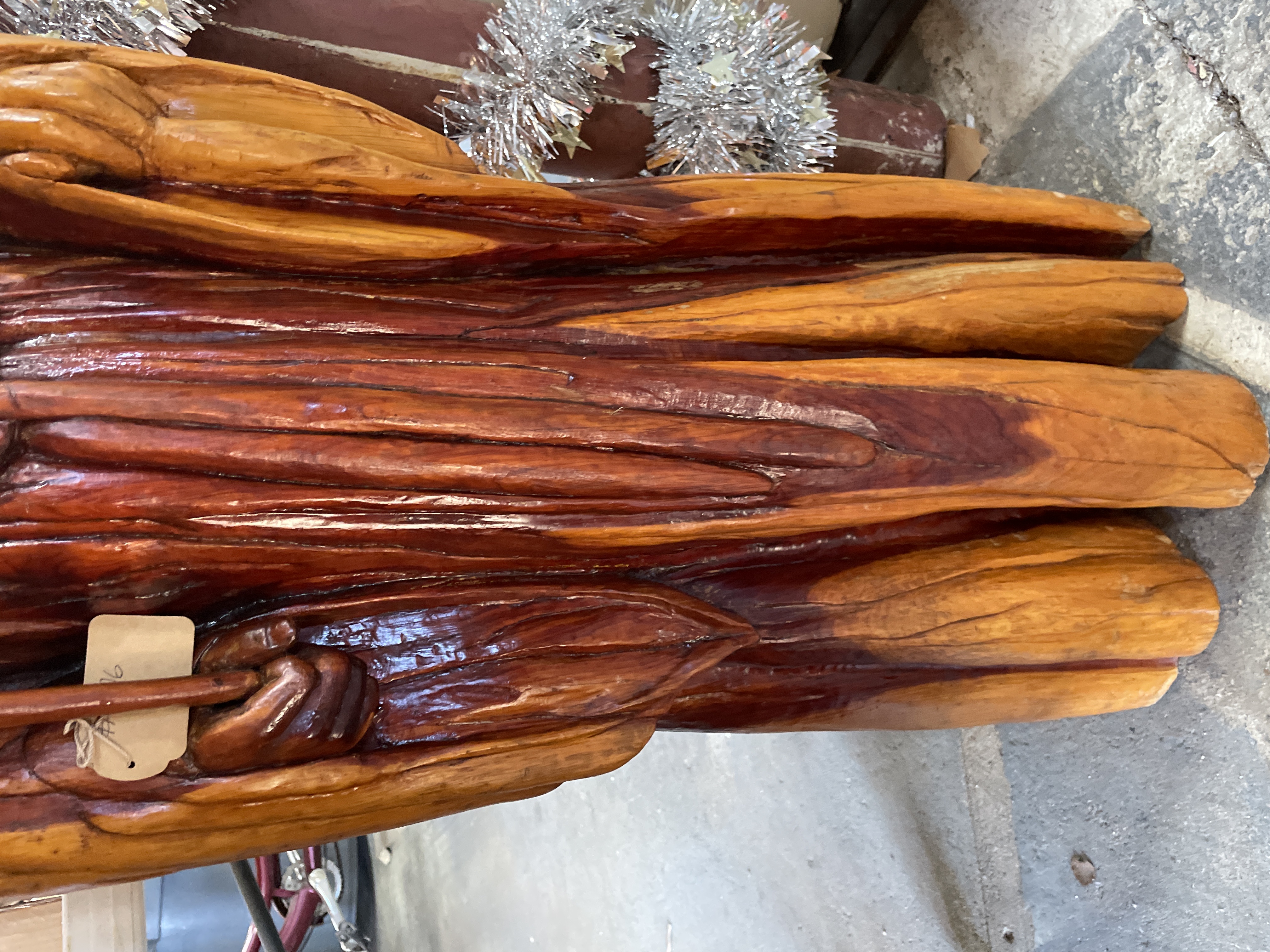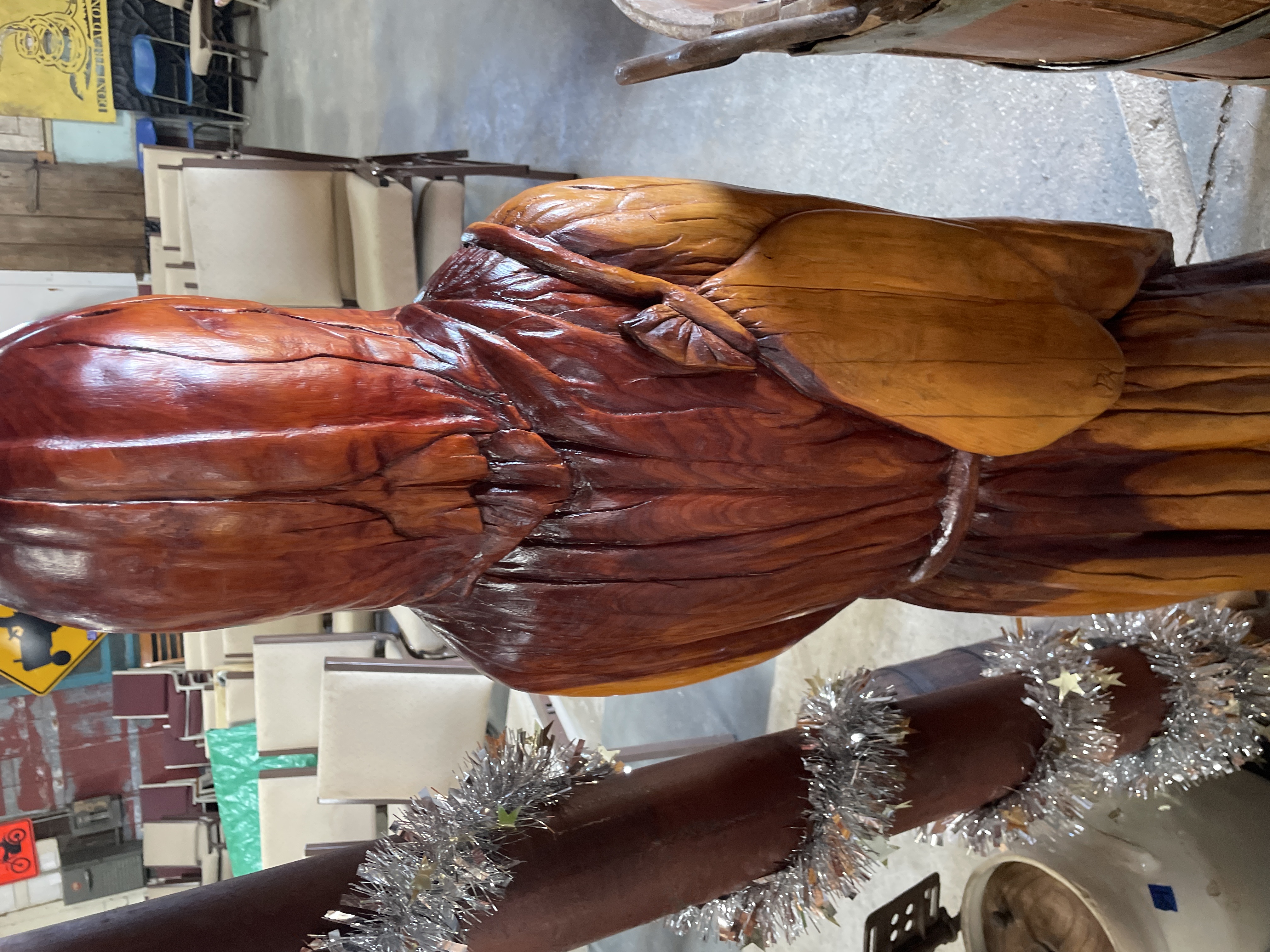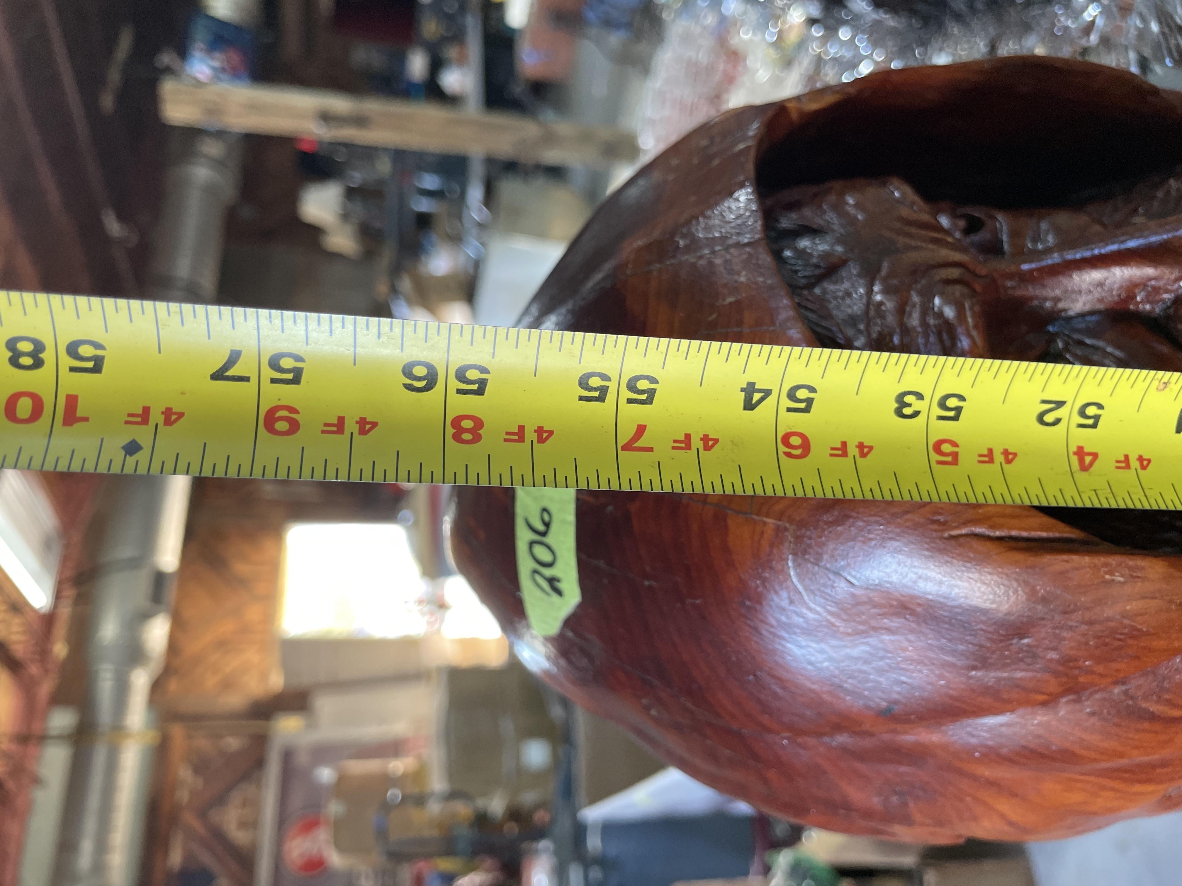A single large contemporary carved wooden statue depicting a bearded, hooded figure, consistent with a monk, hermit, or similar religious type. The sculpture is executed in a rustic or folk art style, featuring deeply textured carving used to render the long robes, beard, and drapery folds. The piece is finished with a high-gloss varnish that emphasizes the contrasting dark reddish-brown and lighter golden-brown tones of the wood grain. The figure holds a staff or shepherd’s crook in its left hand. A substantial sack or pouch is carved hanging on its right side, which bears the incised initials "RK." An auxiliary inventory tag reading "206" is visible near the top of the head.