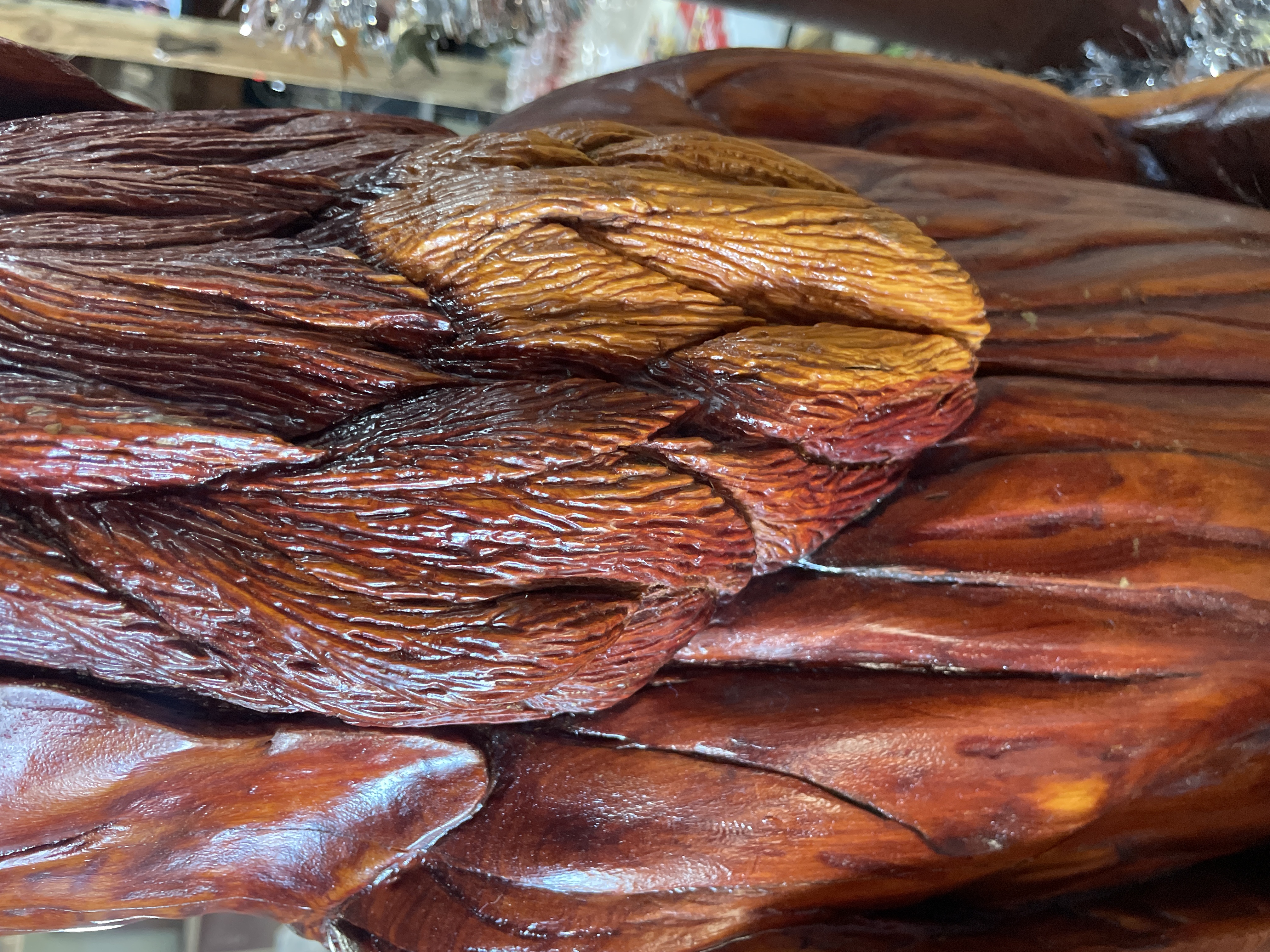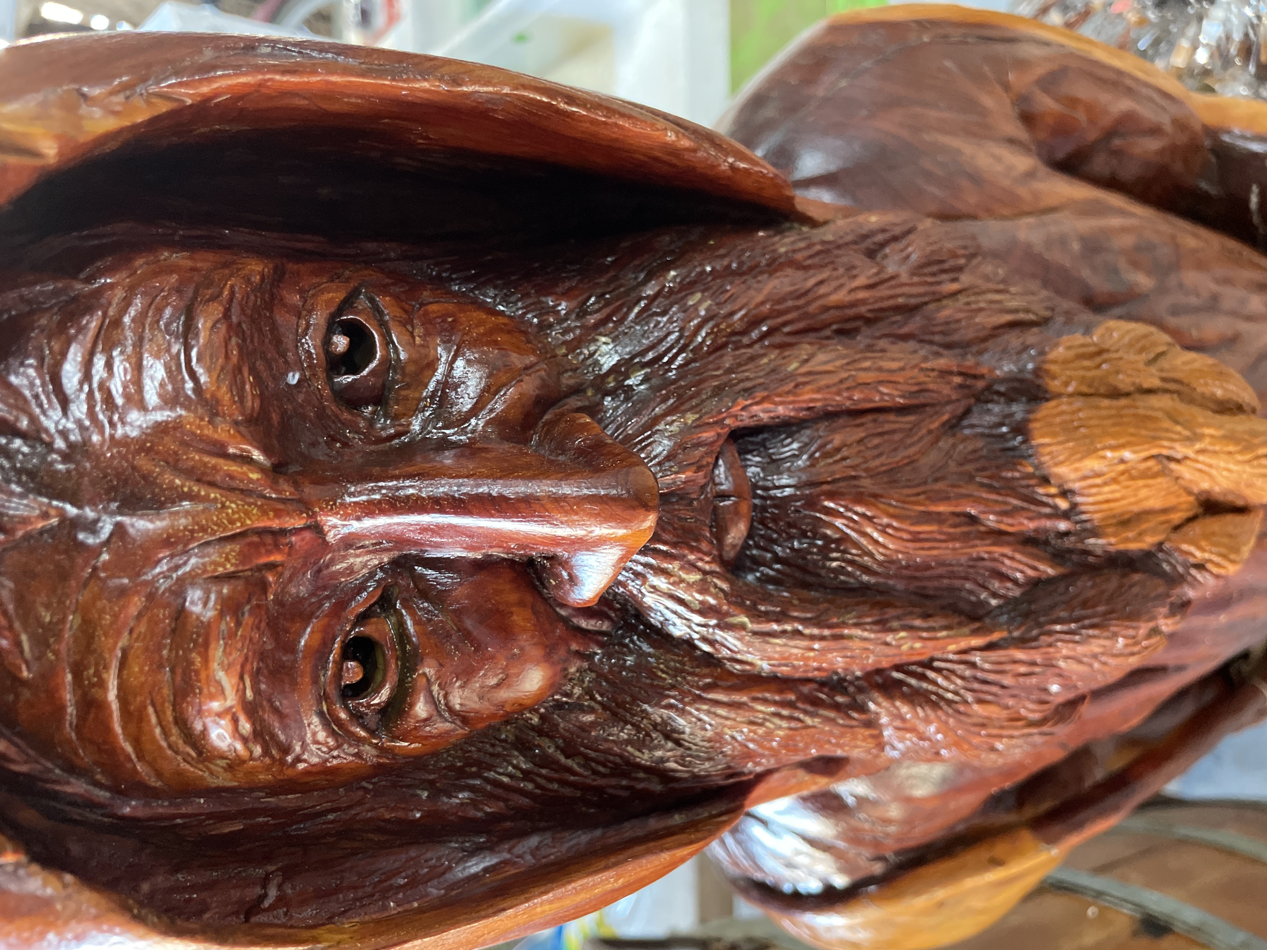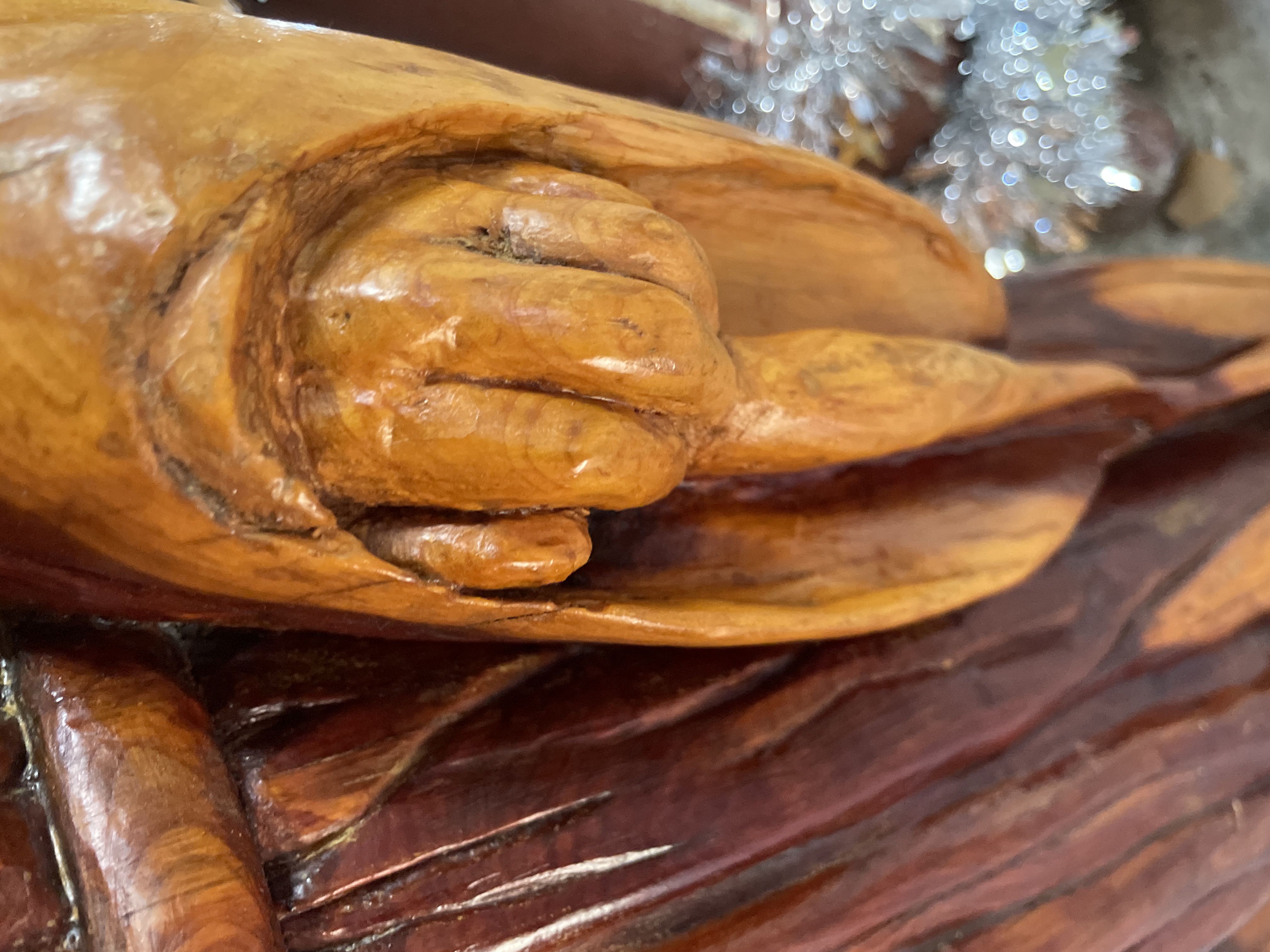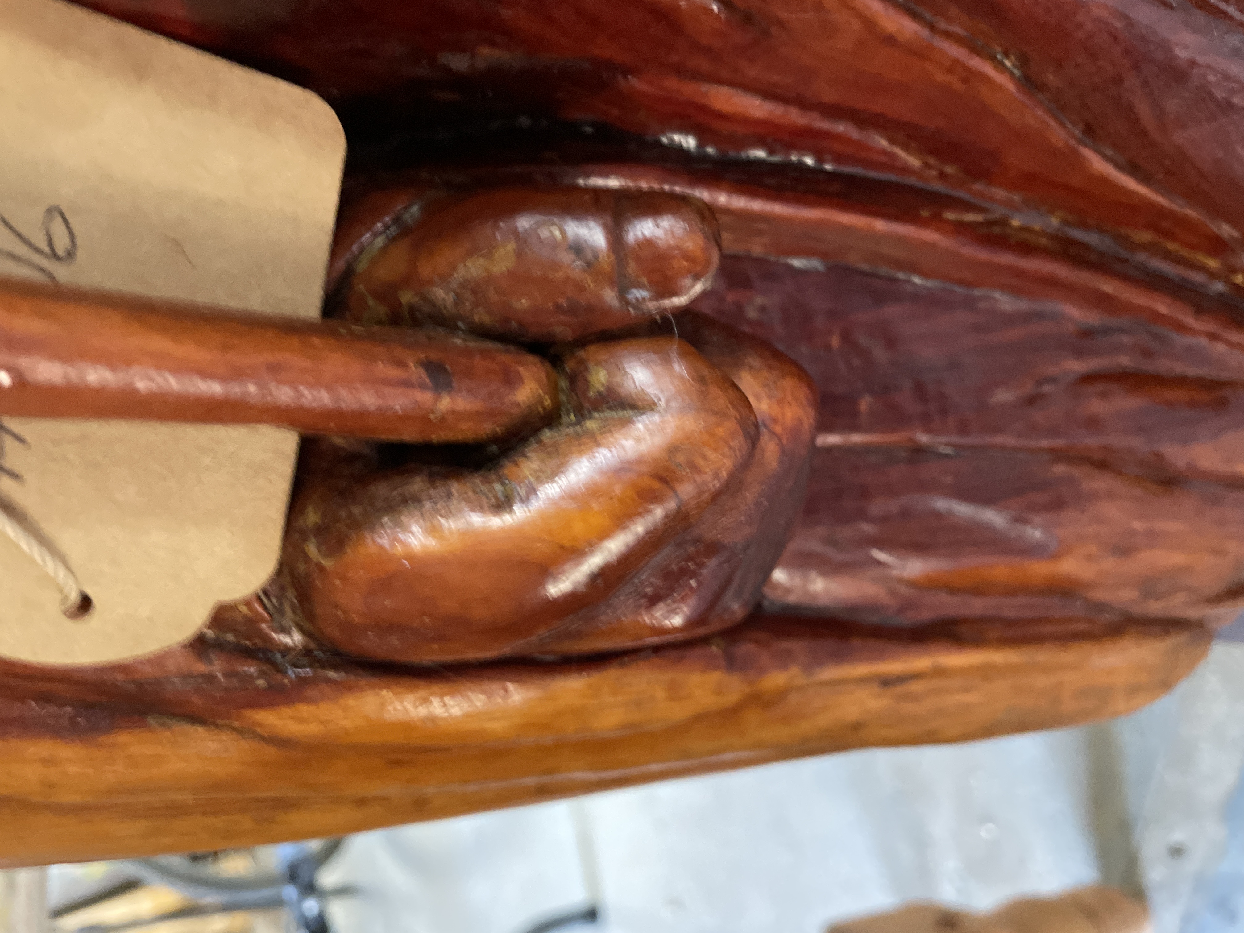 A single large contemporary carved wooden statue depicting a bearded, hooded figure, consistent with a monk, hermit, or similar religious type. The sculpture is executed in a rustic or folk art style, featuring deeply textured carving used to render the long robes, beard, and drapery folds. The piece is finished with a high-gloss varnish that emphasizes the contrasting dark reddish-brown and lighter golden-brown tones of the wood grain. The figure holds a staff or shepherd’s crook in its left hand. A substantial sack or pouch is carved hanging on its right side, which bears the incised initials "RK." An auxiliary inventory tag reading "206" is visible near the top of the head.