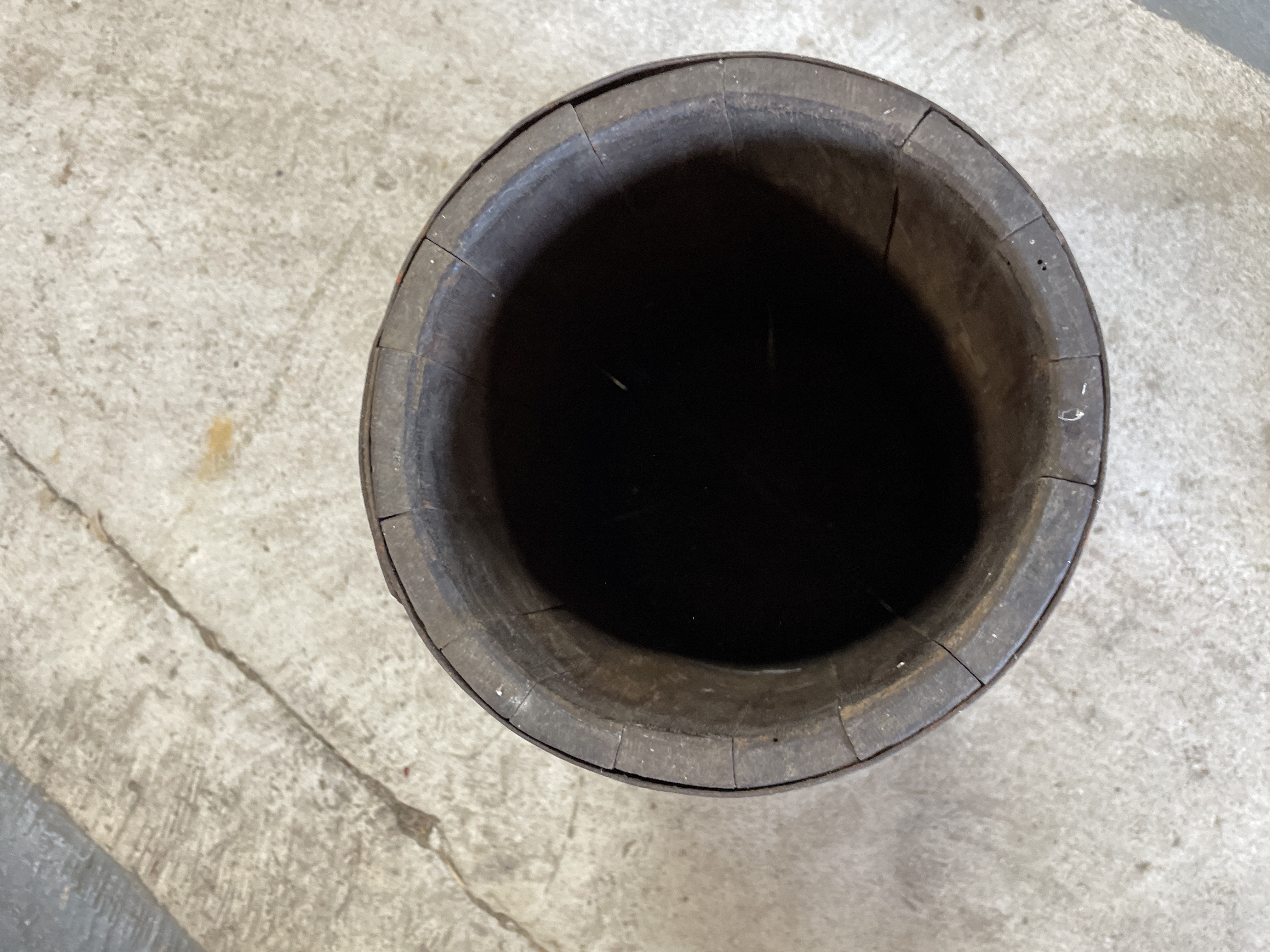 An antique primitive dash butter churn assembly constructed of darkened, stained wood. The main body consists of a stave-built cylindrical barrel reinforced by two dark metal hoops. The churn includes its original components: a circular wooden lid and a matching dasher mechanism. The dasher features a long wooden rod terminating in a thick, circular wooden paddle or plunger, which is pierced by four drilled agitation holes designed to facilitate the churning process. The assembly displays characteristics consistent with early, functional farm implements. No manufacturer or period markings are visible.
