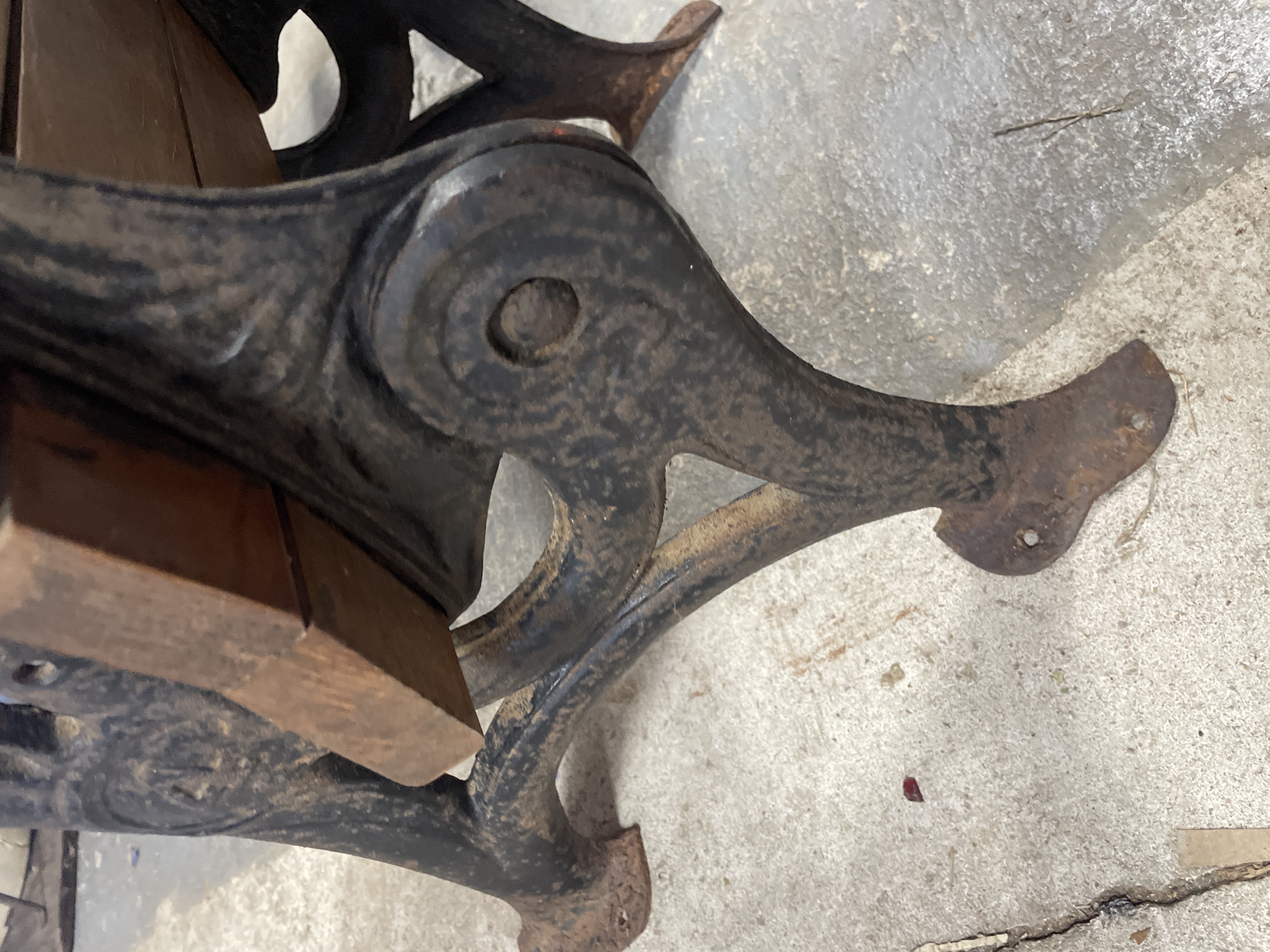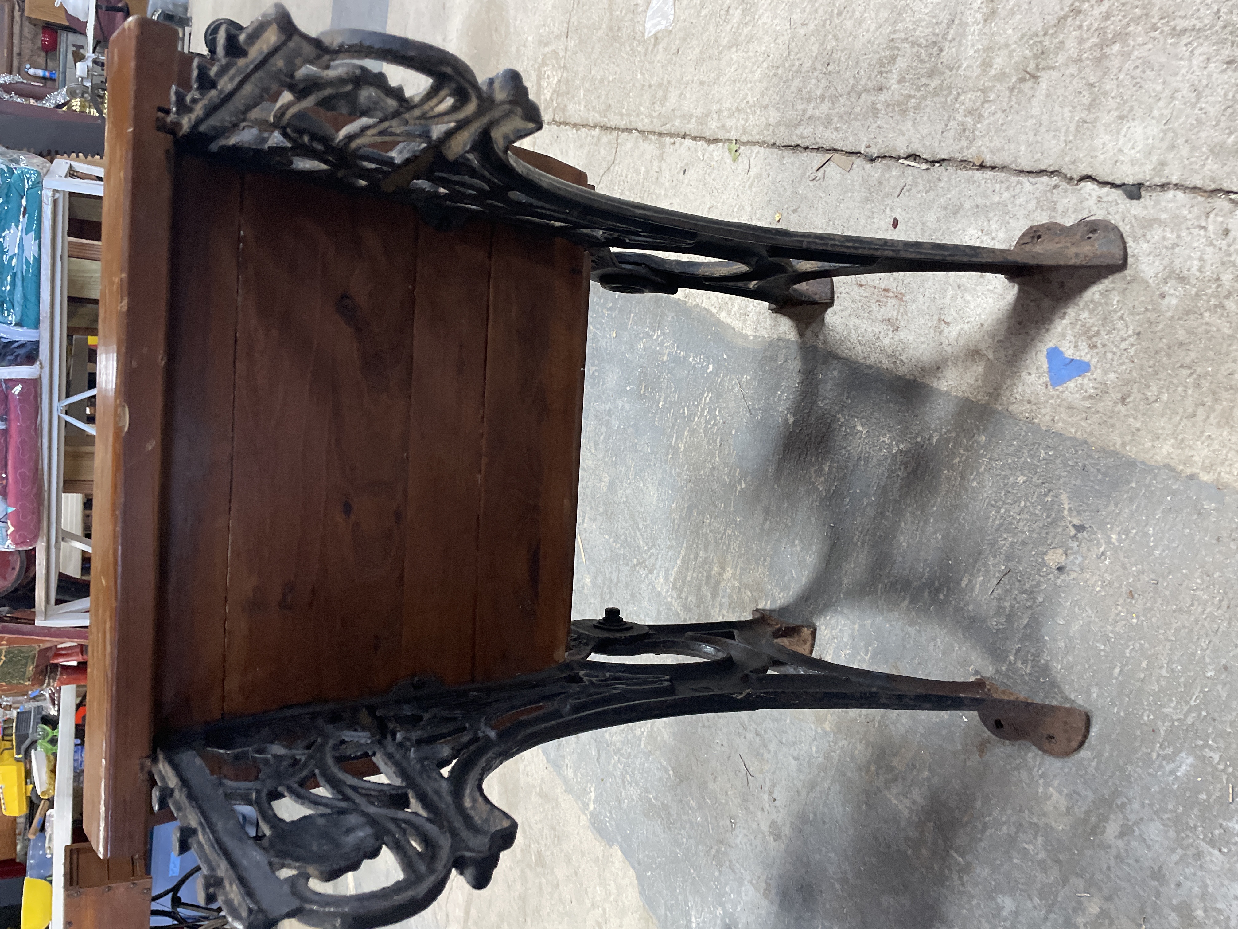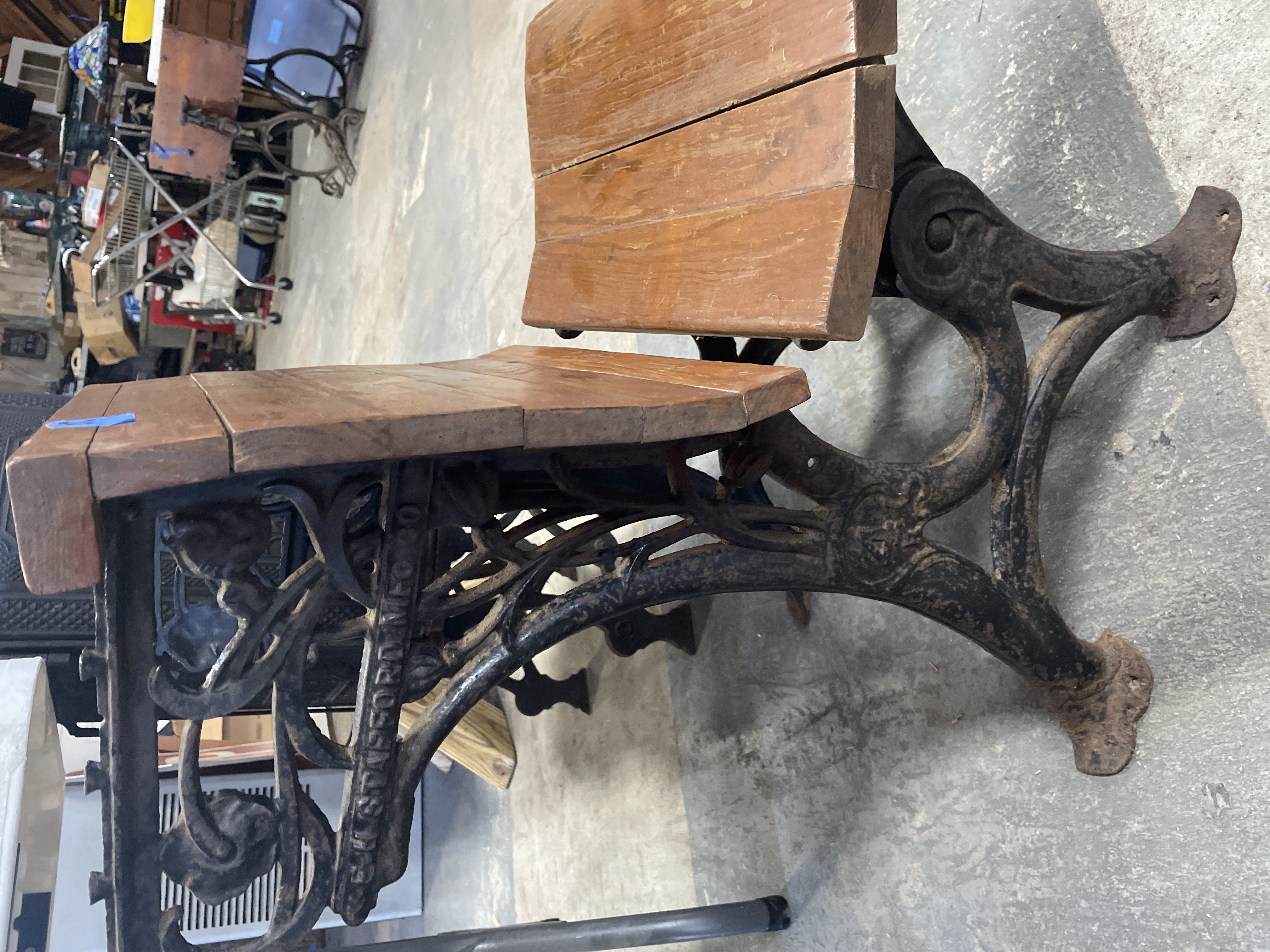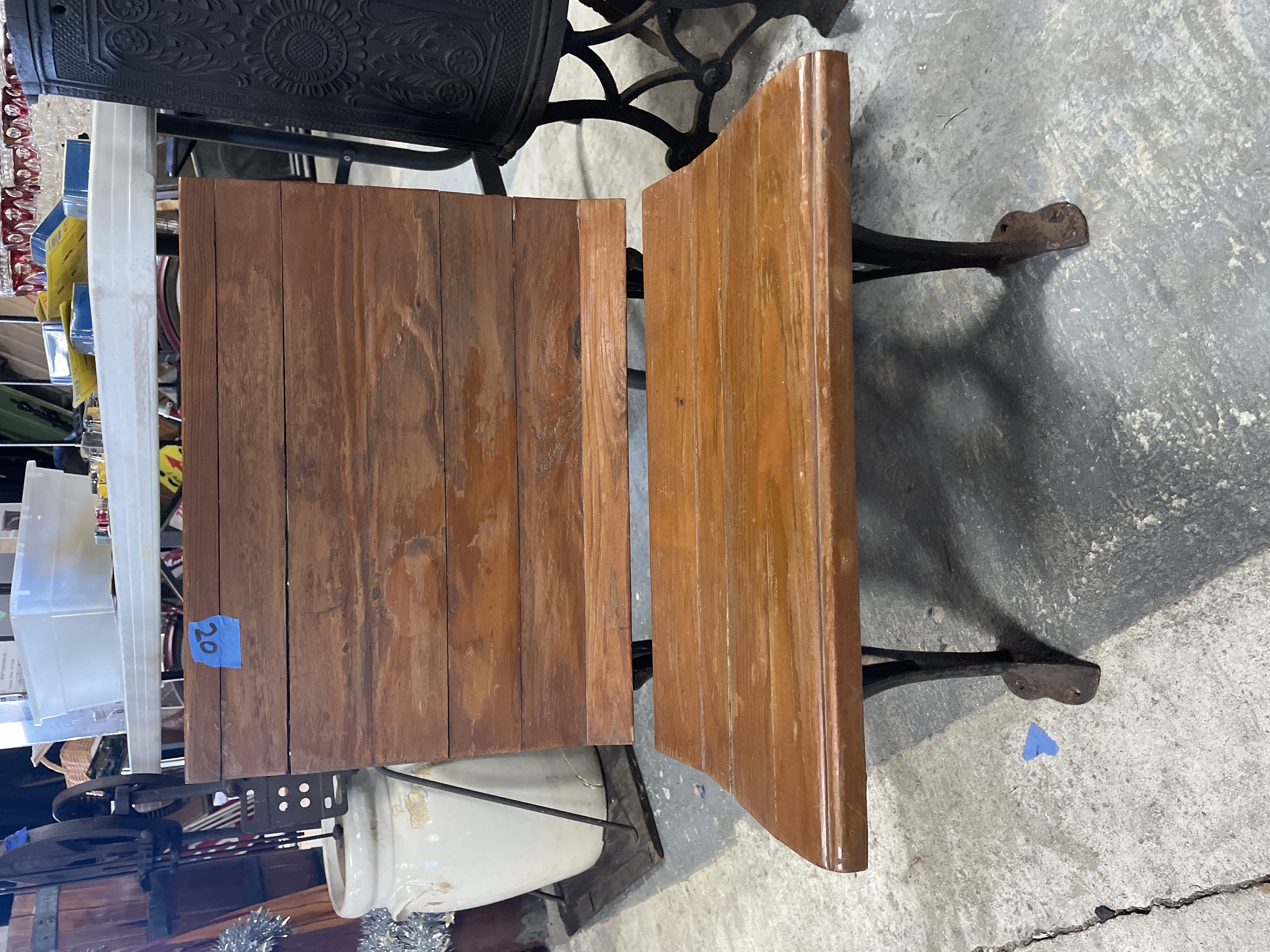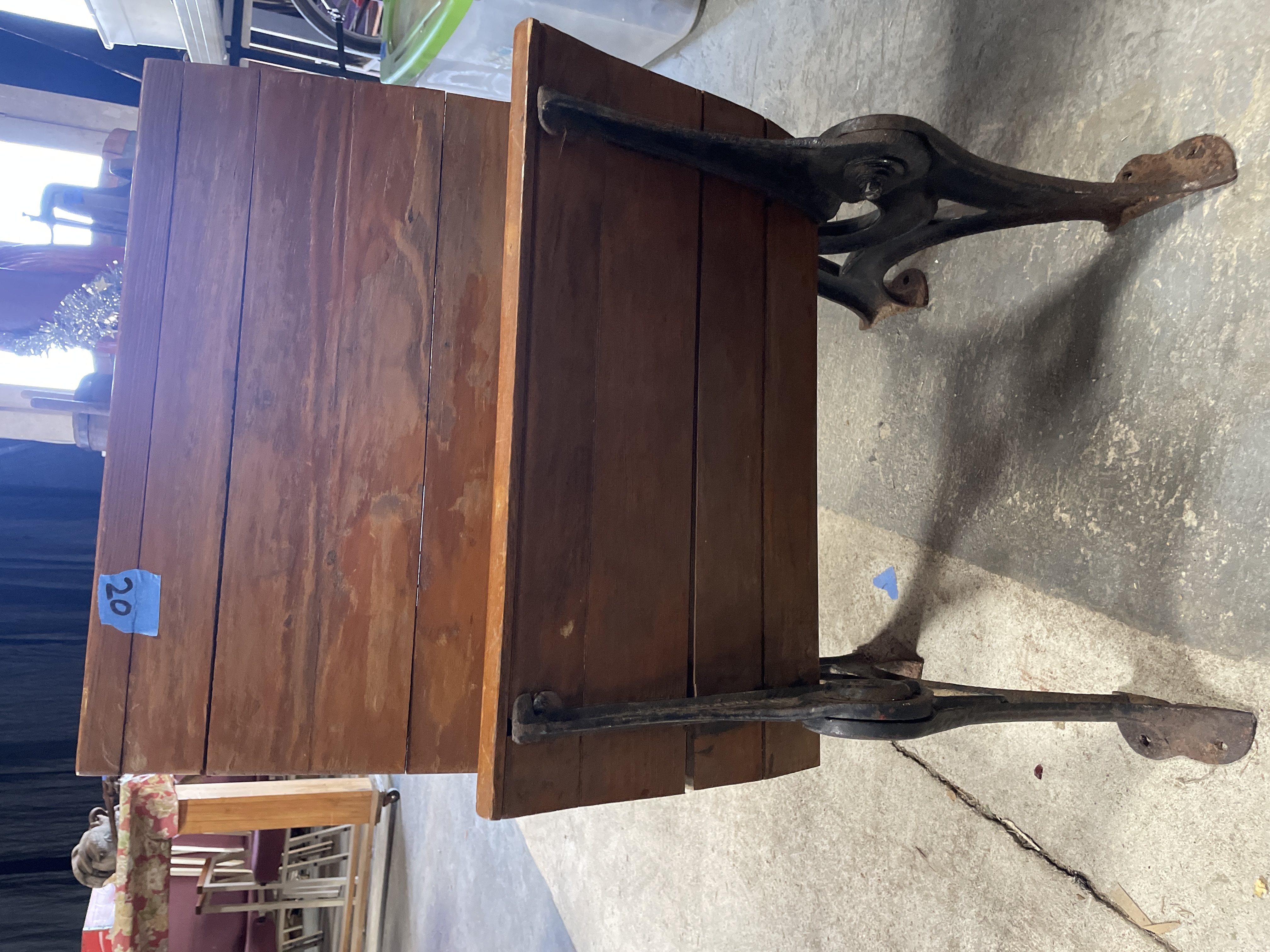 An antique single school desk and bench unit manufactured by Esterbrook Mfg Co. The unit features wooden seat, backrest, and desktop surfaces constructed of planks finished in a medium reddish-brown varnish. These surfaces are supported by ornate cast iron standards. The hinged desktop is currently in the raised position. Raised lettering identifying the maker, "[E]STERBROOK MFG CO., " is visible on one cast iron standard. A blue adhesive tag marked "20" is affixed to the wooden backrest.