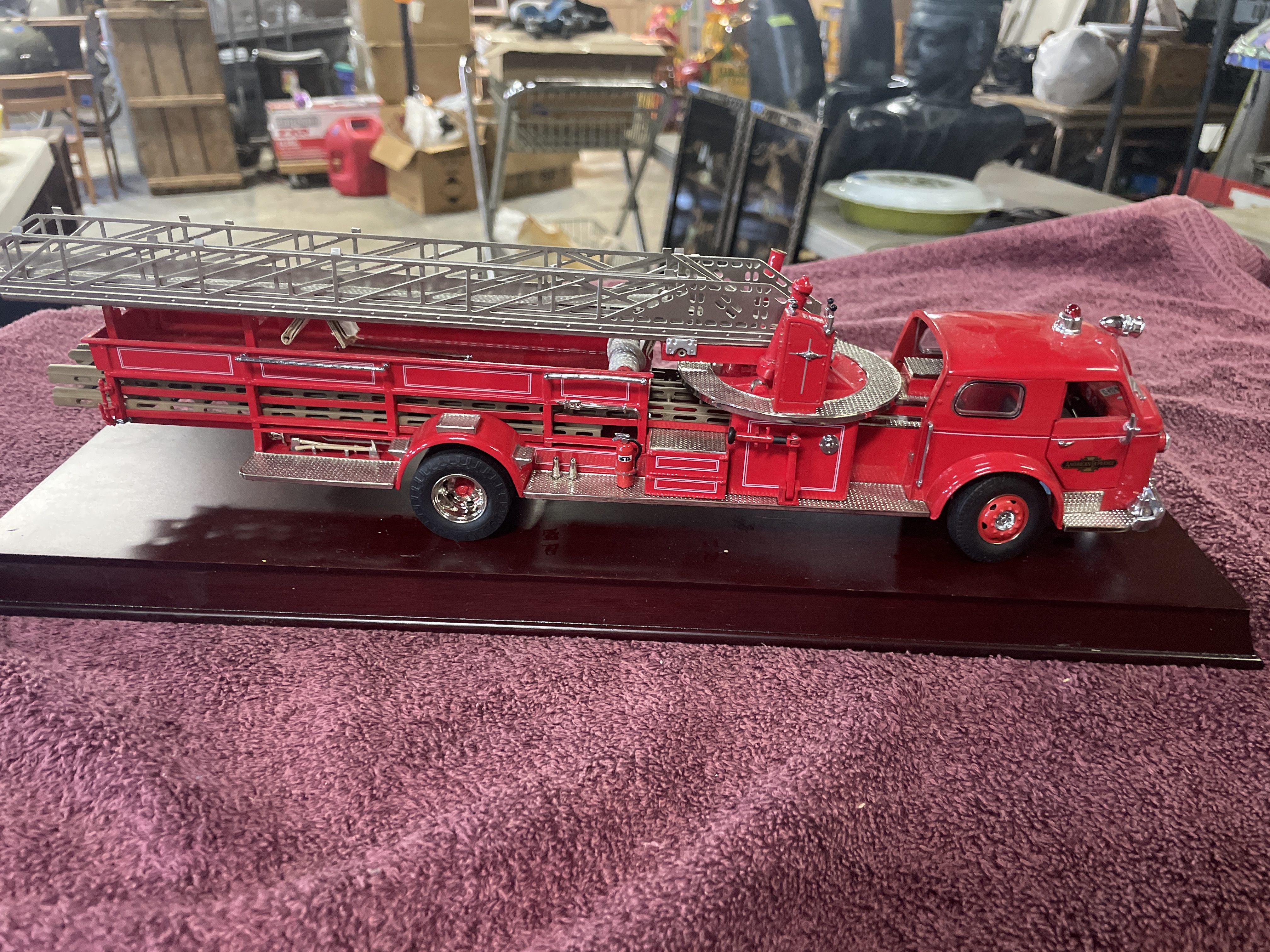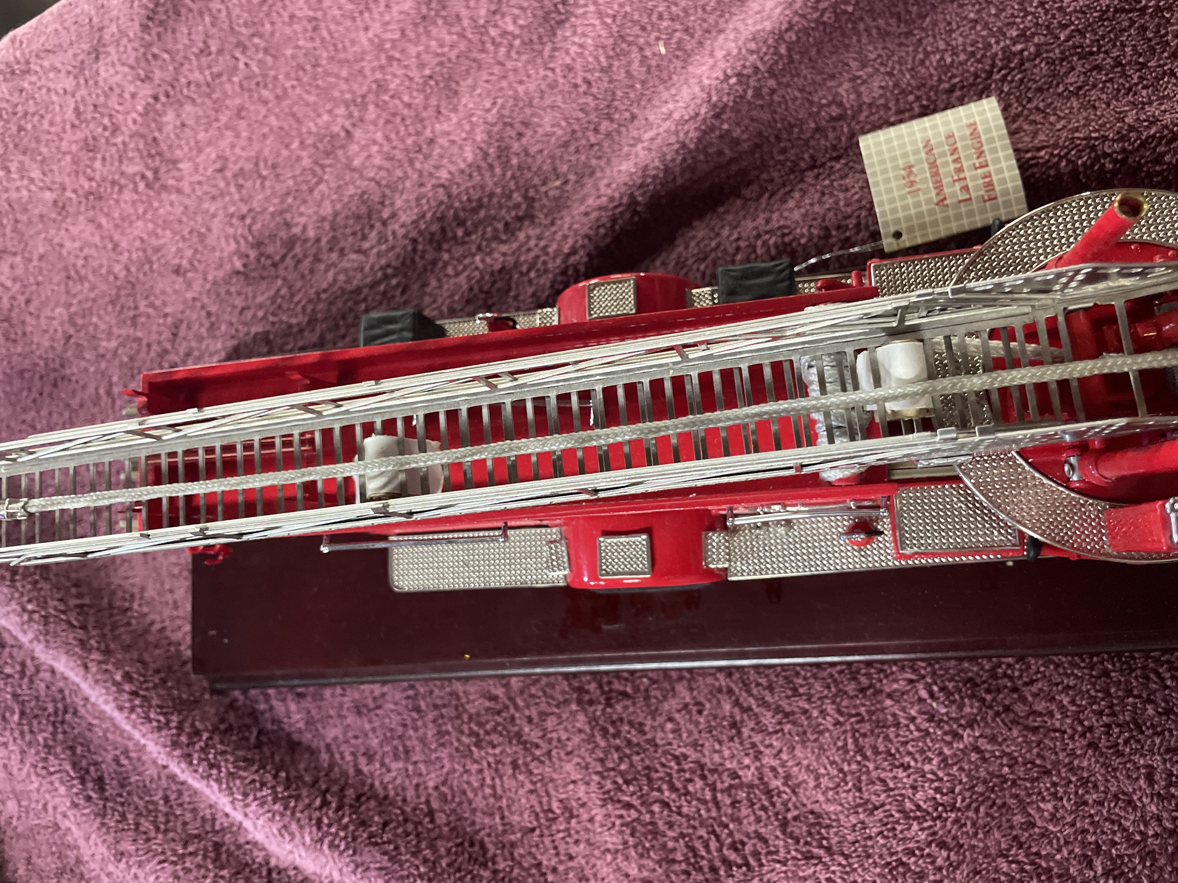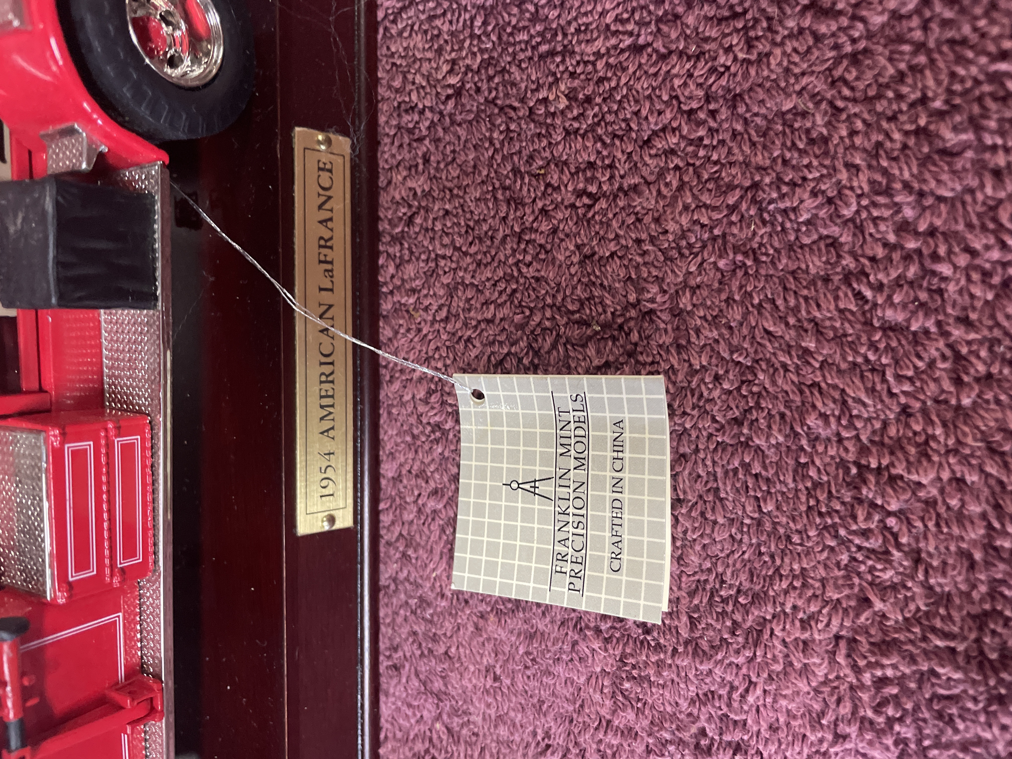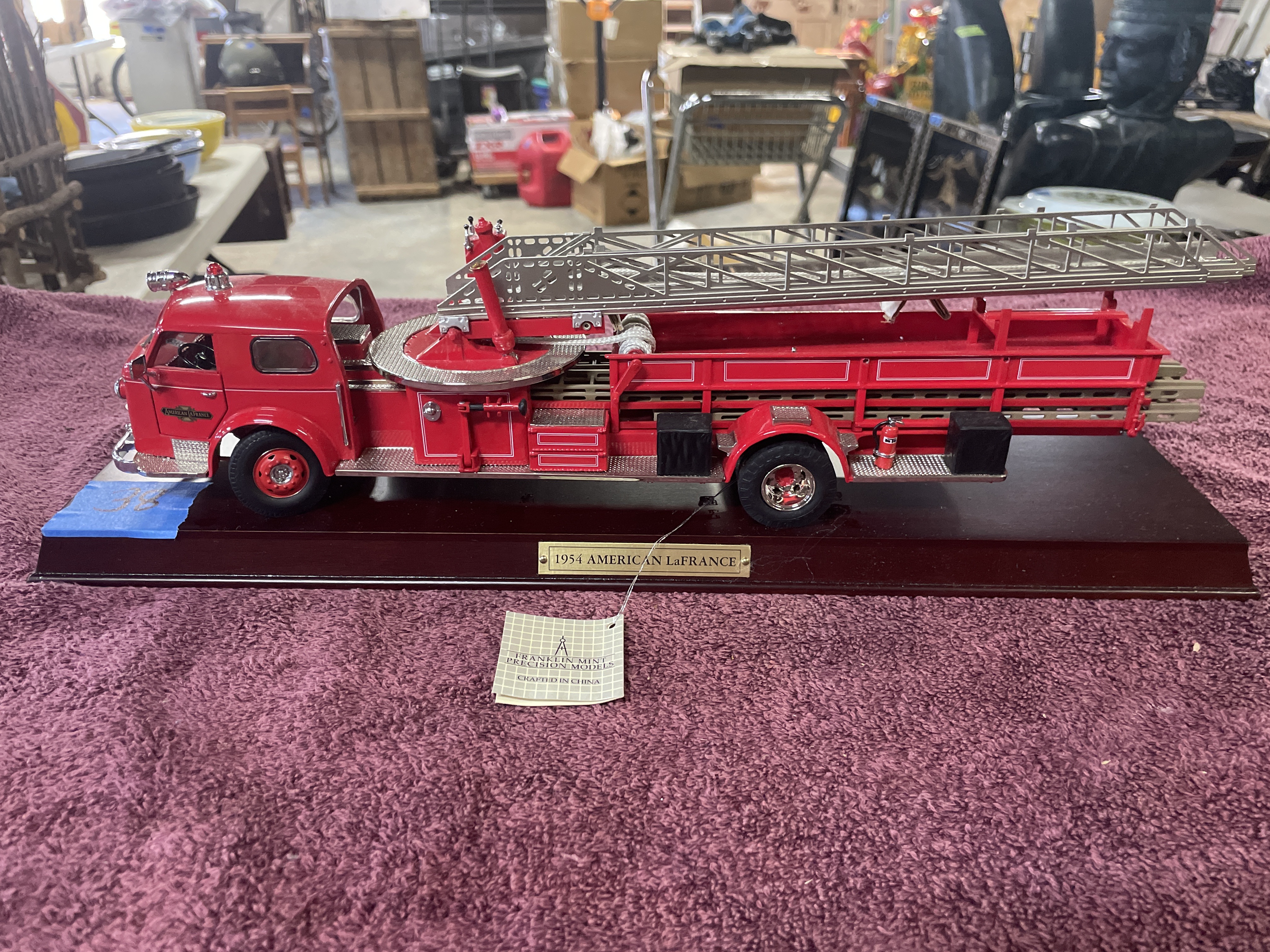 A single die-cast scale model of the 1954 American LaFrance Series 700 aerial ladder fire truck, produced by Franklin Mint Precision Models. The model is rendered primarily in bright red with extensive silver-toned metal and chrome detailing, including simulated diamond plating on the running boards and a detailed, extendable ladder assembly. The piece is securely mounted on a rectangular stained wooden display base. Visible markings include “AMERICAN LaFRANCE” in stylized text on the cab doors and “KEEP BACK 500 FEET” on the rear body panel. A gold-toned plaque affixed to the base identifies the piece as “1954 AMERICAN LaFRANCE.” An accompanying hang tag confirms the manufacturer as Franklin Mint Precision Models and notes the item was “CRAFTED IN CHINA.”