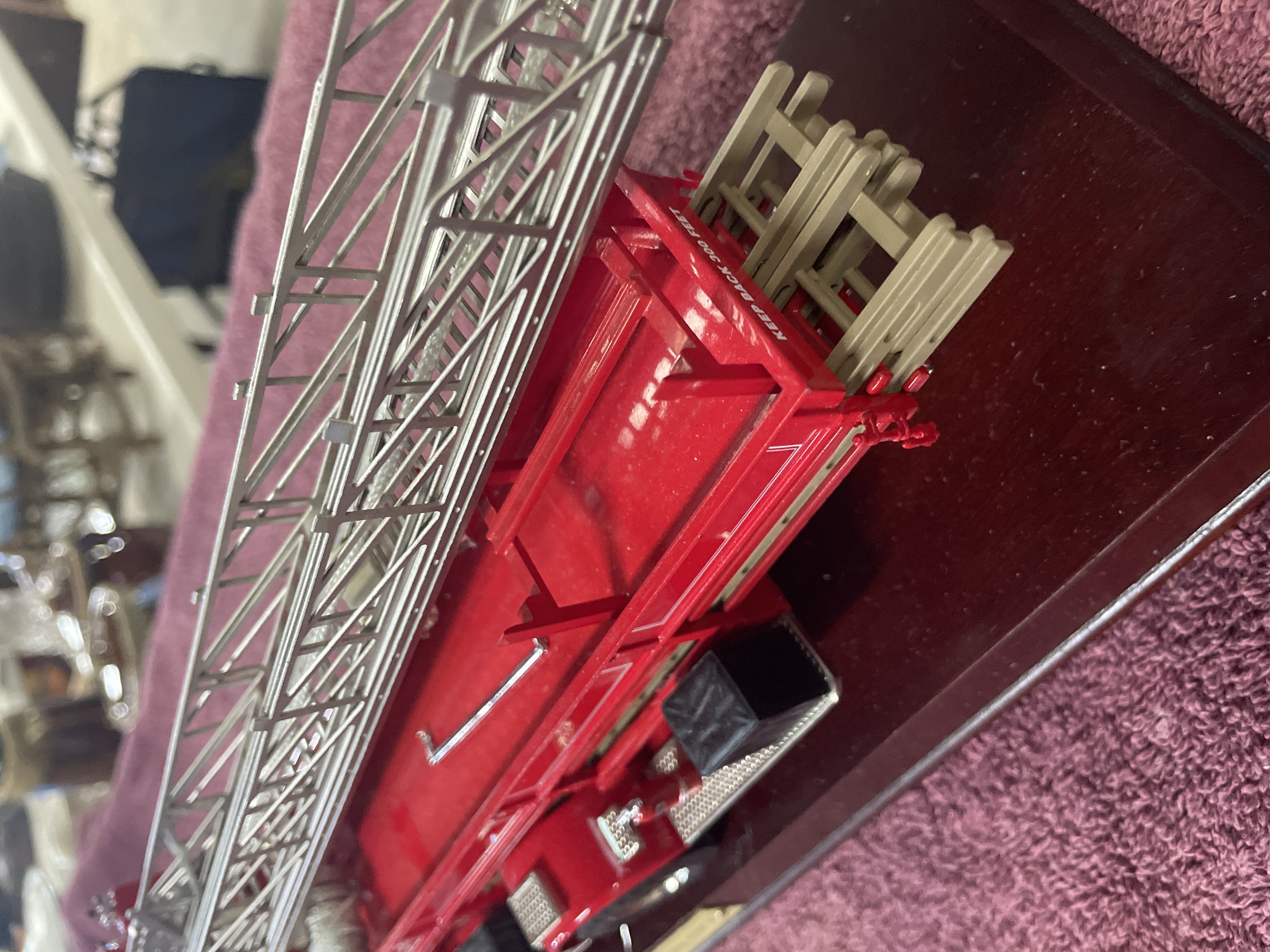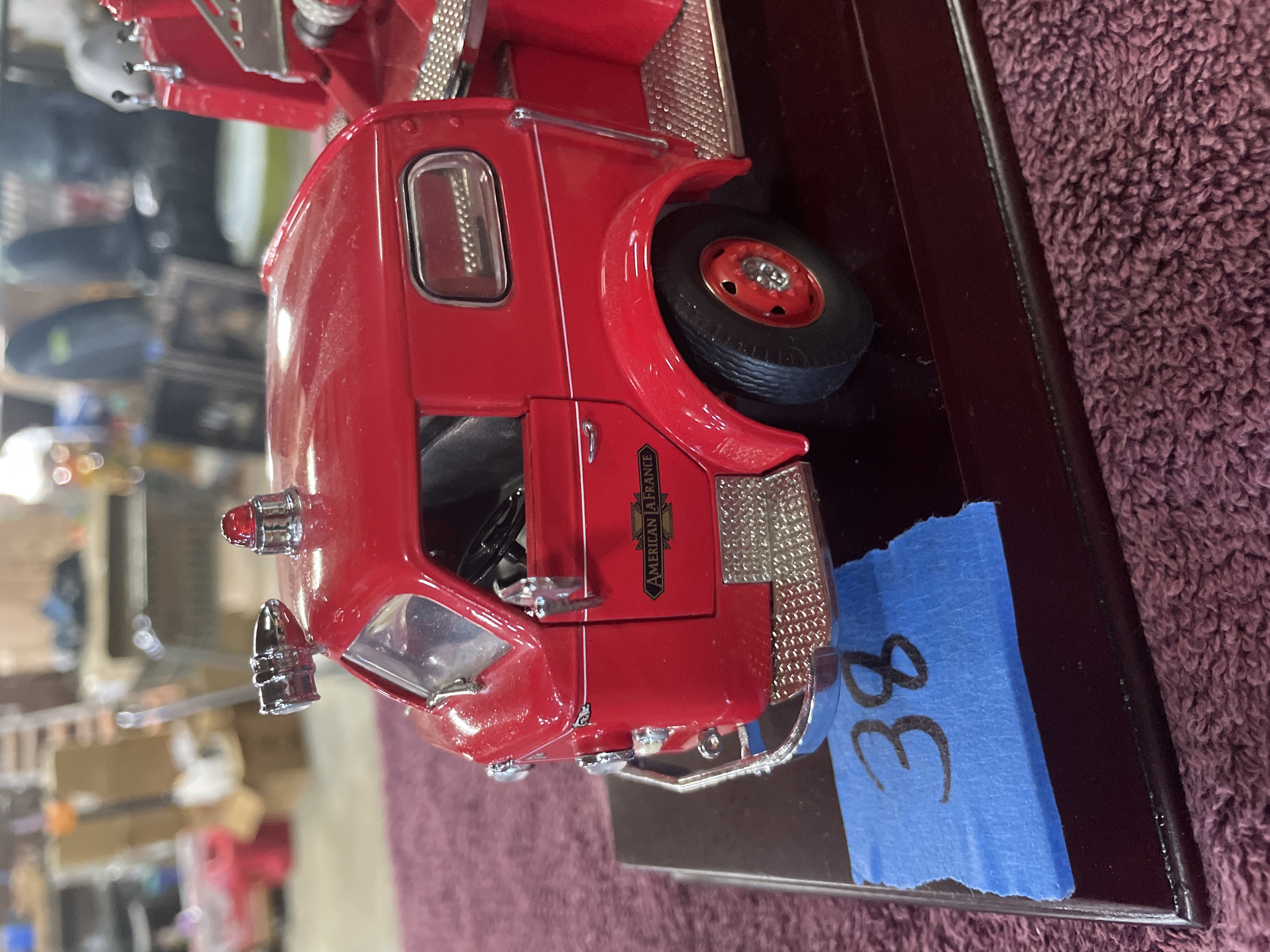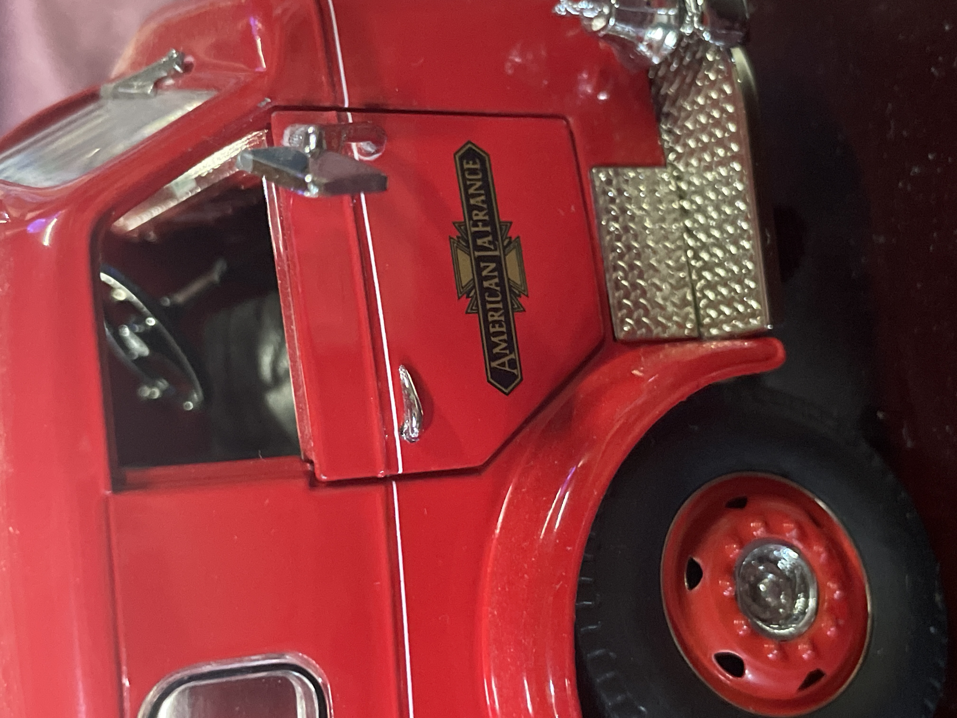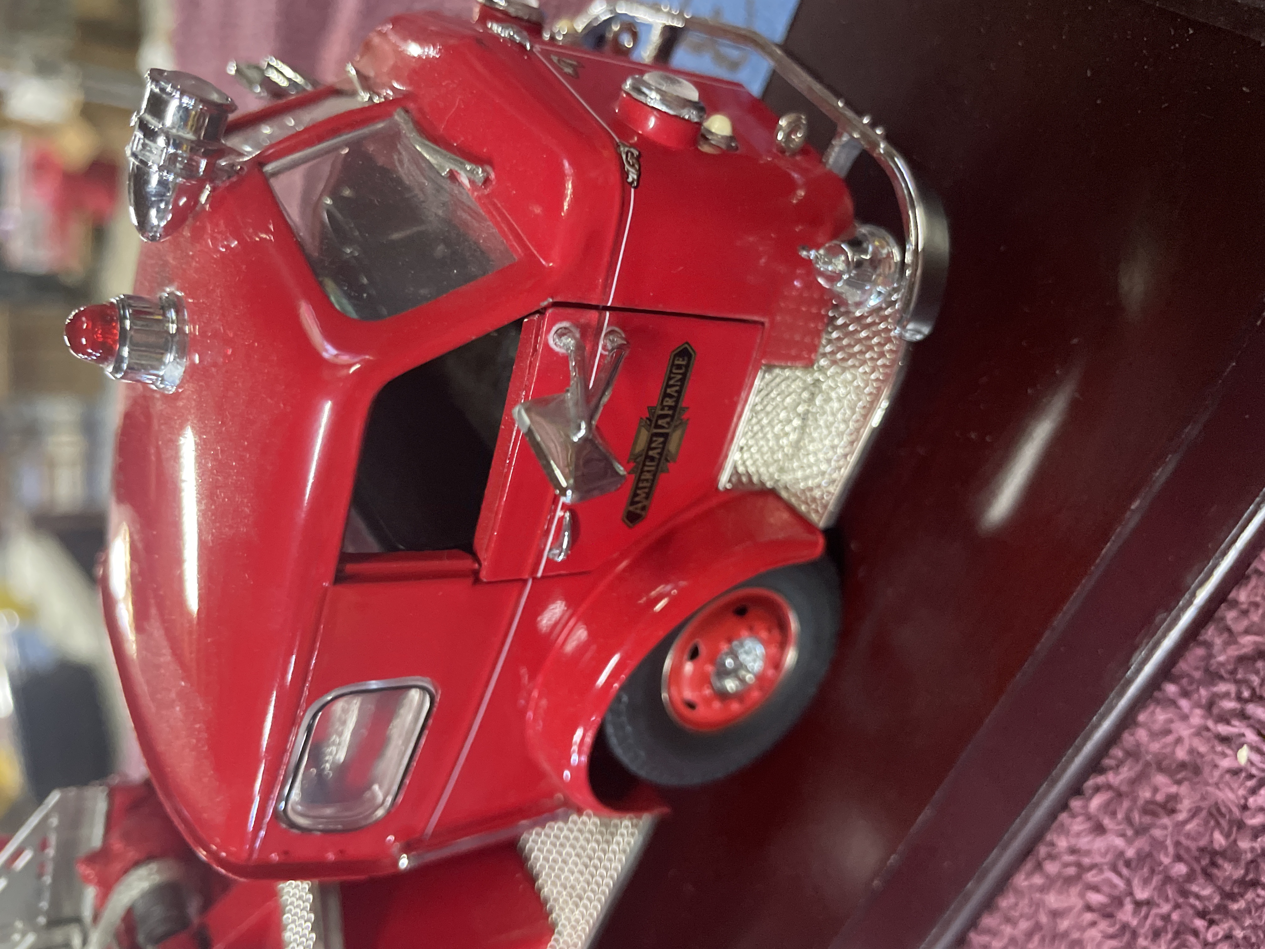 A single die-cast scale model of the 1954 American LaFrance Series 700 aerial ladder fire truck, produced by Franklin Mint Precision Models. The model is rendered primarily in bright red with extensive silver-toned metal and chrome detailing, including simulated diamond plating on the running boards and a detailed, extendable ladder assembly. The piece is securely mounted on a rectangular stained wooden display base. Visible markings include “AMERICAN LaFRANCE” in stylized text on the cab doors and “KEEP BACK 500 FEET” on the rear body panel. A gold-toned plaque affixed to the base identifies the piece as “1954 AMERICAN LaFRANCE.” An accompanying hang tag confirms the manufacturer as Franklin Mint Precision Models and notes the item was “CRAFTED IN CHINA.”