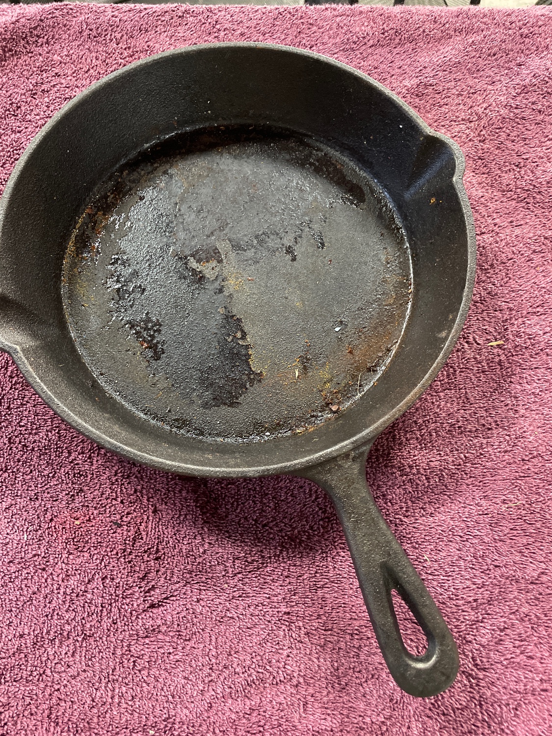 A single vintage cast iron frying pan or skillet. The piece features a dark, heavily seasoned patina and is constructed with dual pour spouts and a handle terminating in a hanging hole. The underside of the cooking surface displays a large raised stylized arc or "2" logo. The handle is marked with the raised text "OHIO, " the size numeral "7," and the letter "B." This marking suggests manufacture by a regional Ohio foundry, consistent with early 20th-century cast iron production.