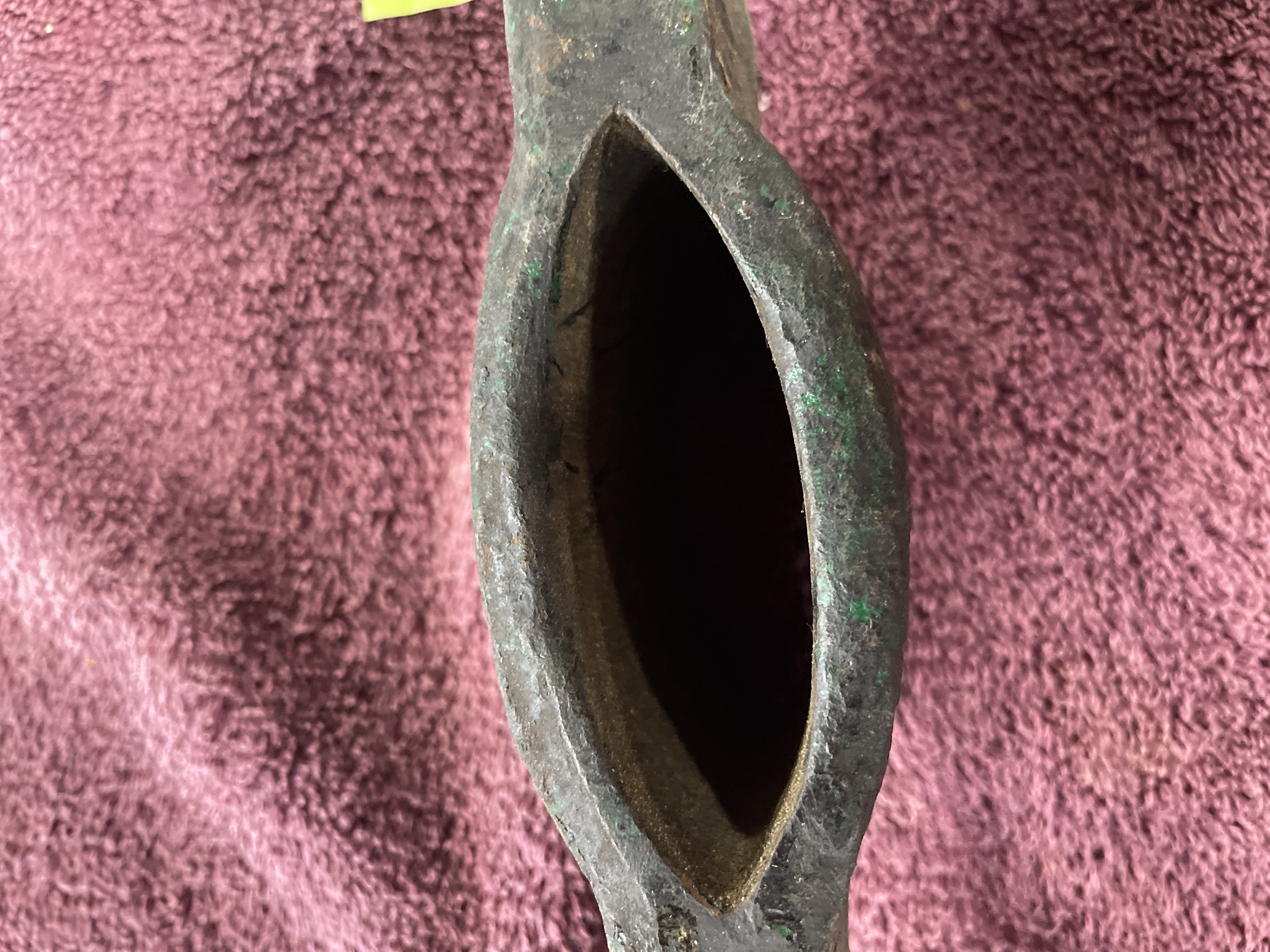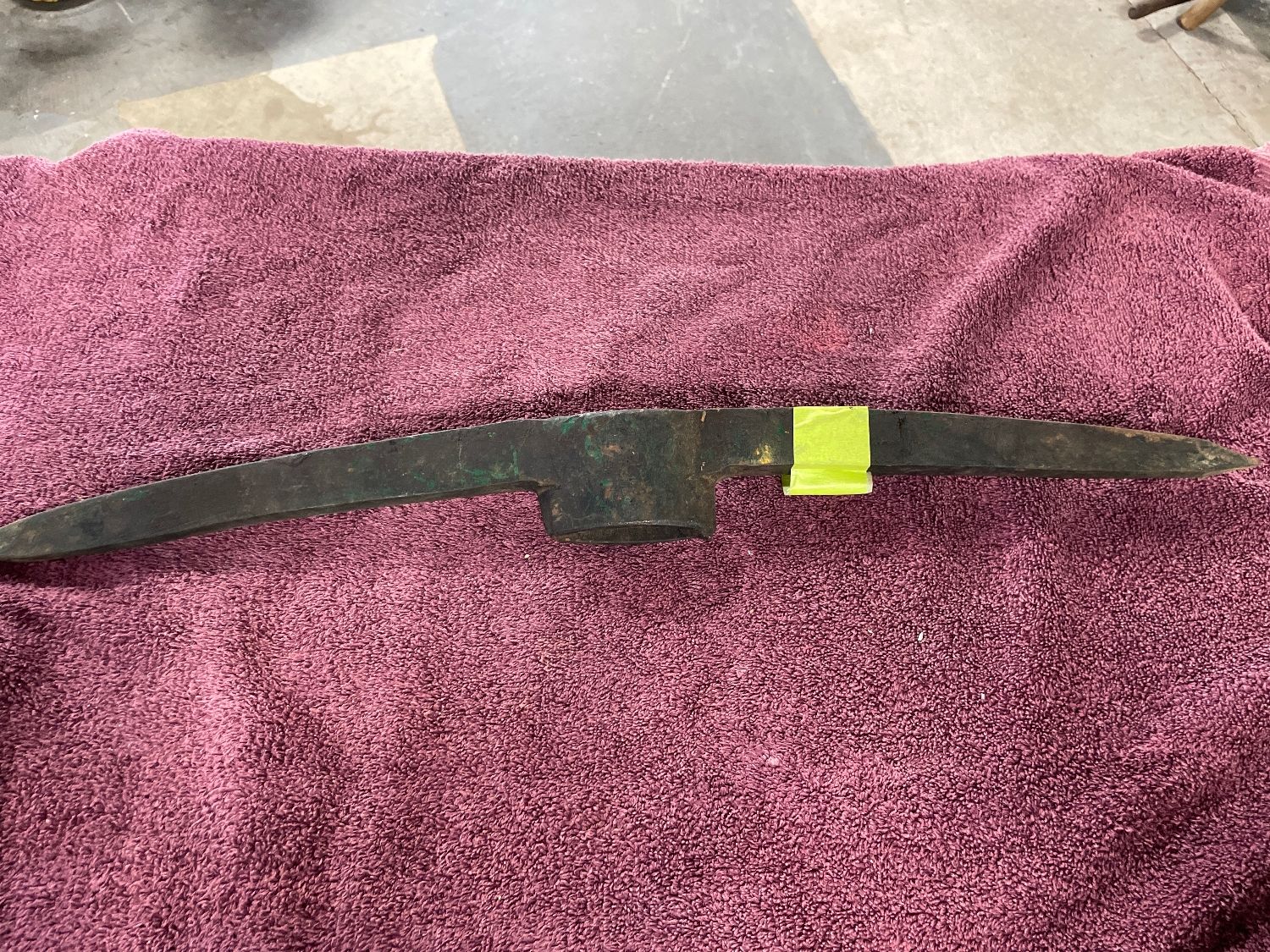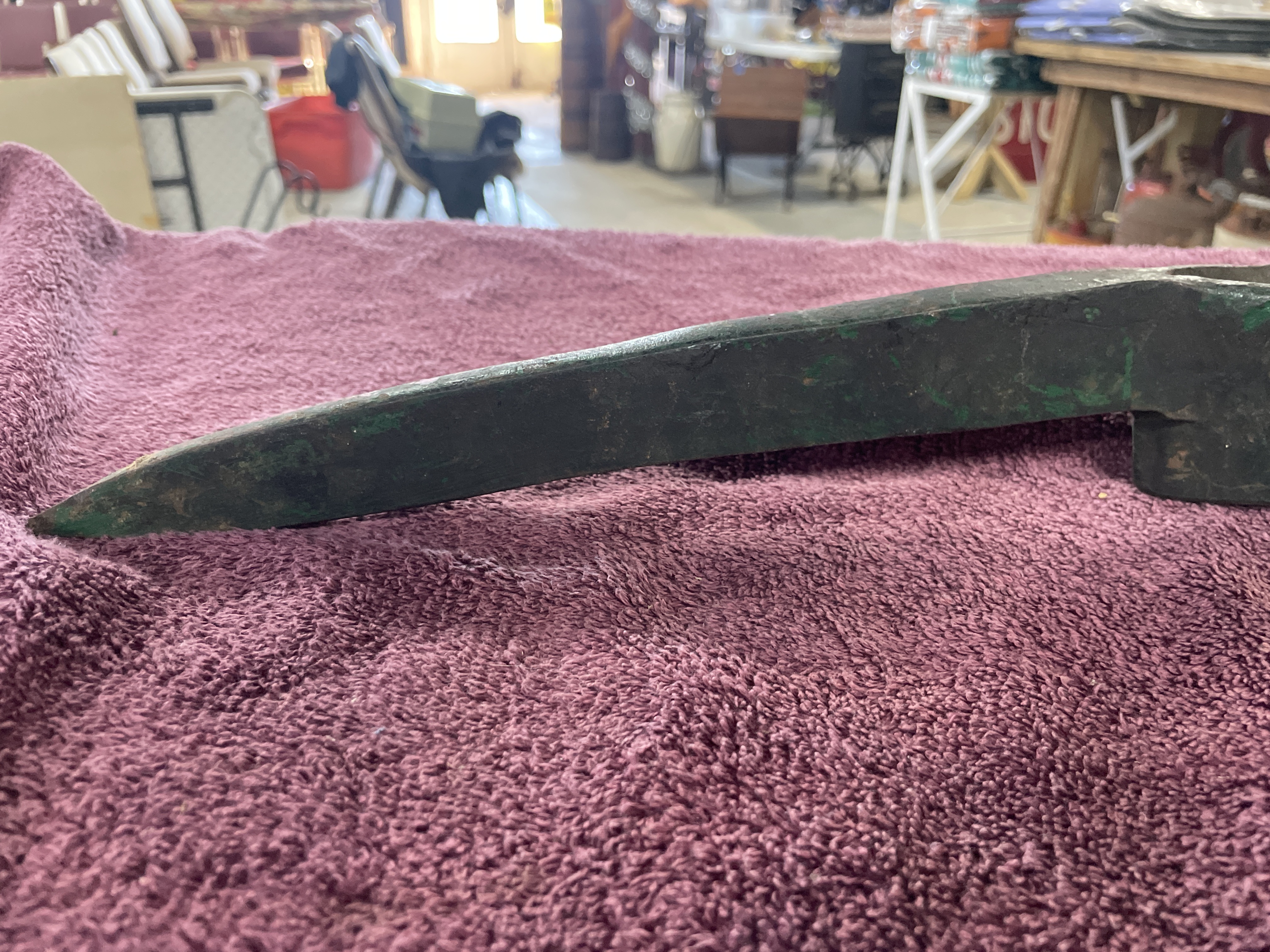 A single vintage railroad pick axe head, attributed to the style manufactured by Warwood Tool Company or similar historical industrial suppliers. The head is forged from iron or steel, featuring a symmetrical double-pointed design with sharp ends intended for heavy professional use. The center features a large, pronounced oval eye designed for fitting a wooden handle, which is not present. The surface lacks visible manufacturer markings or stamps.
