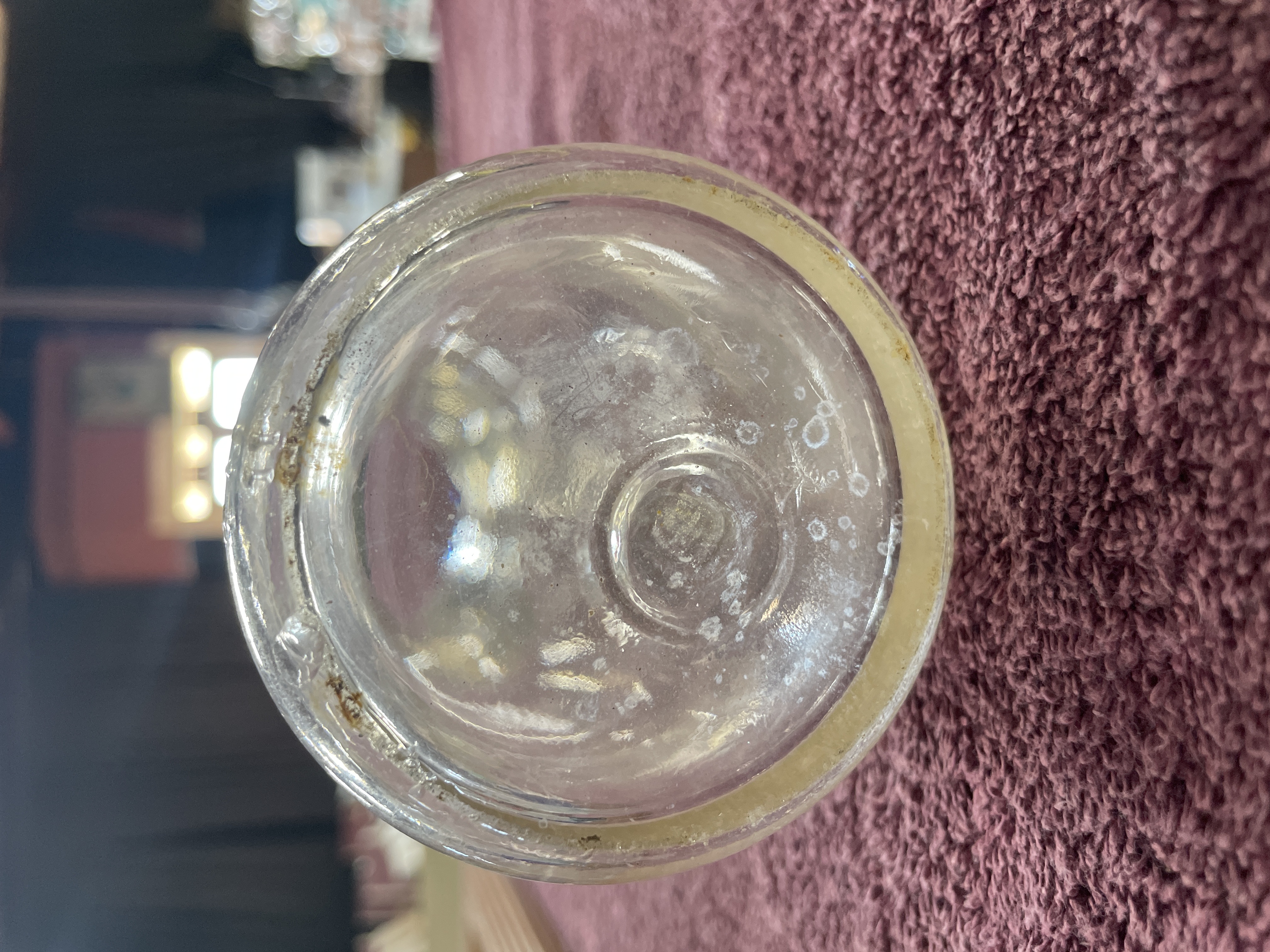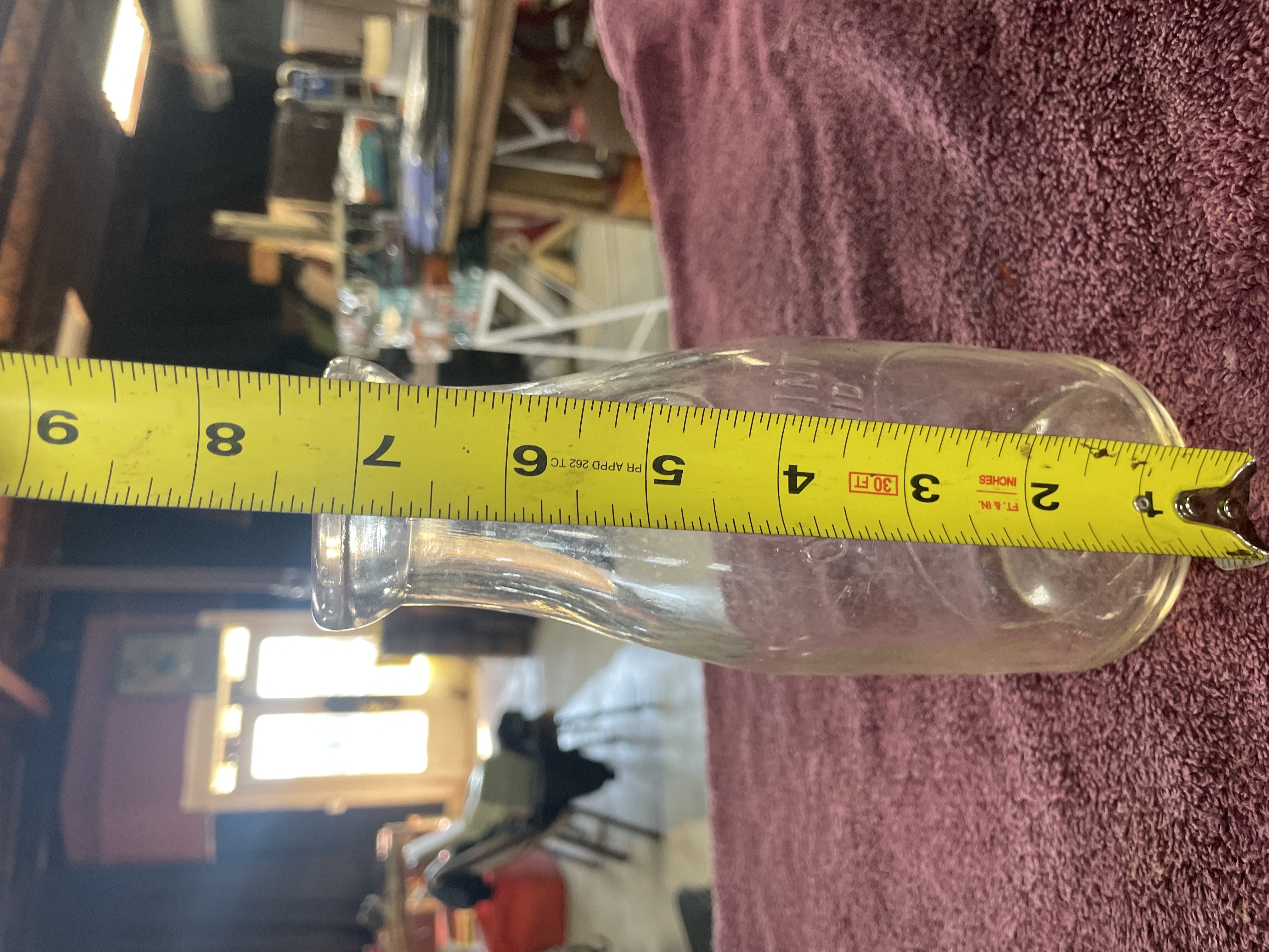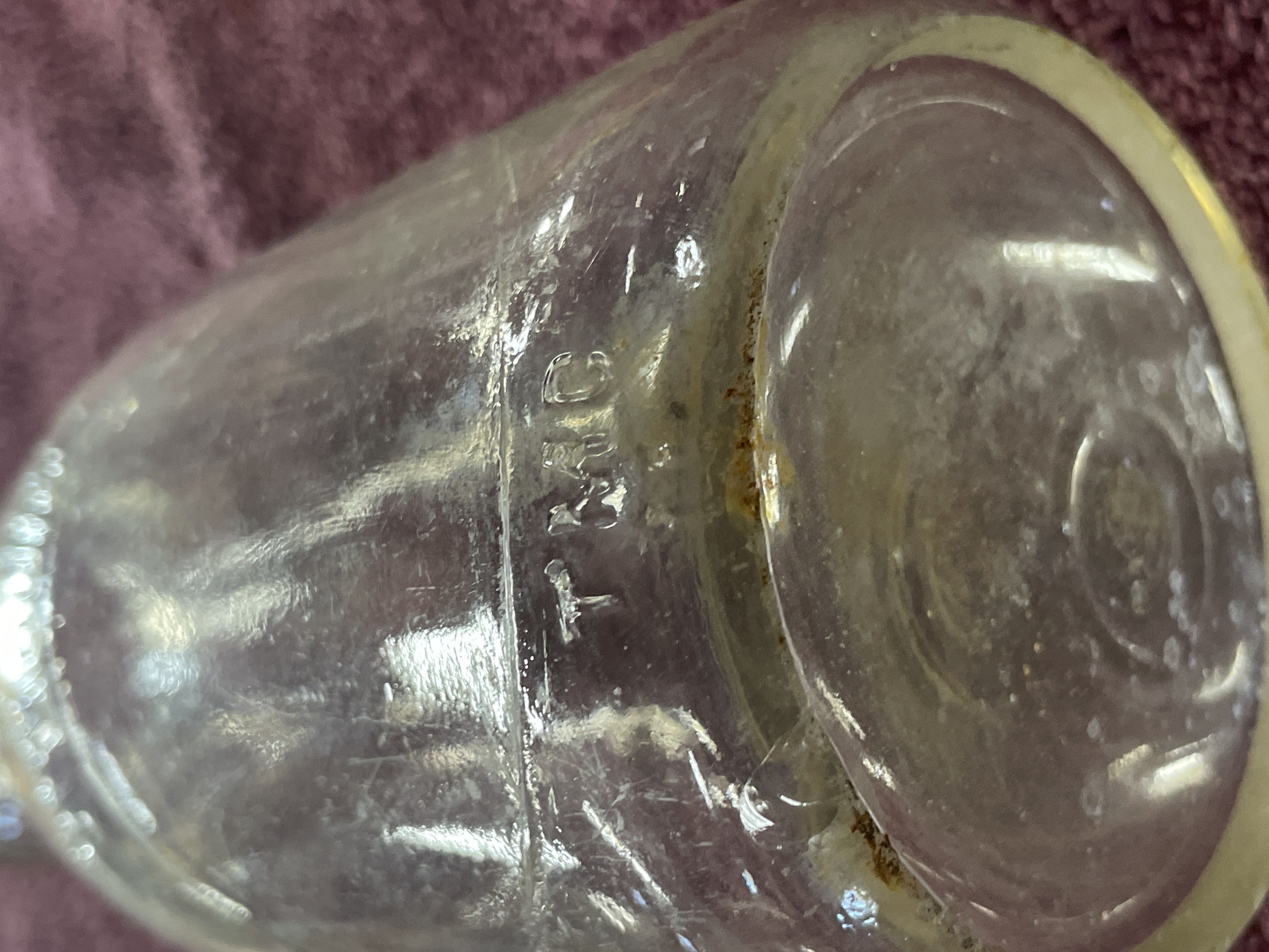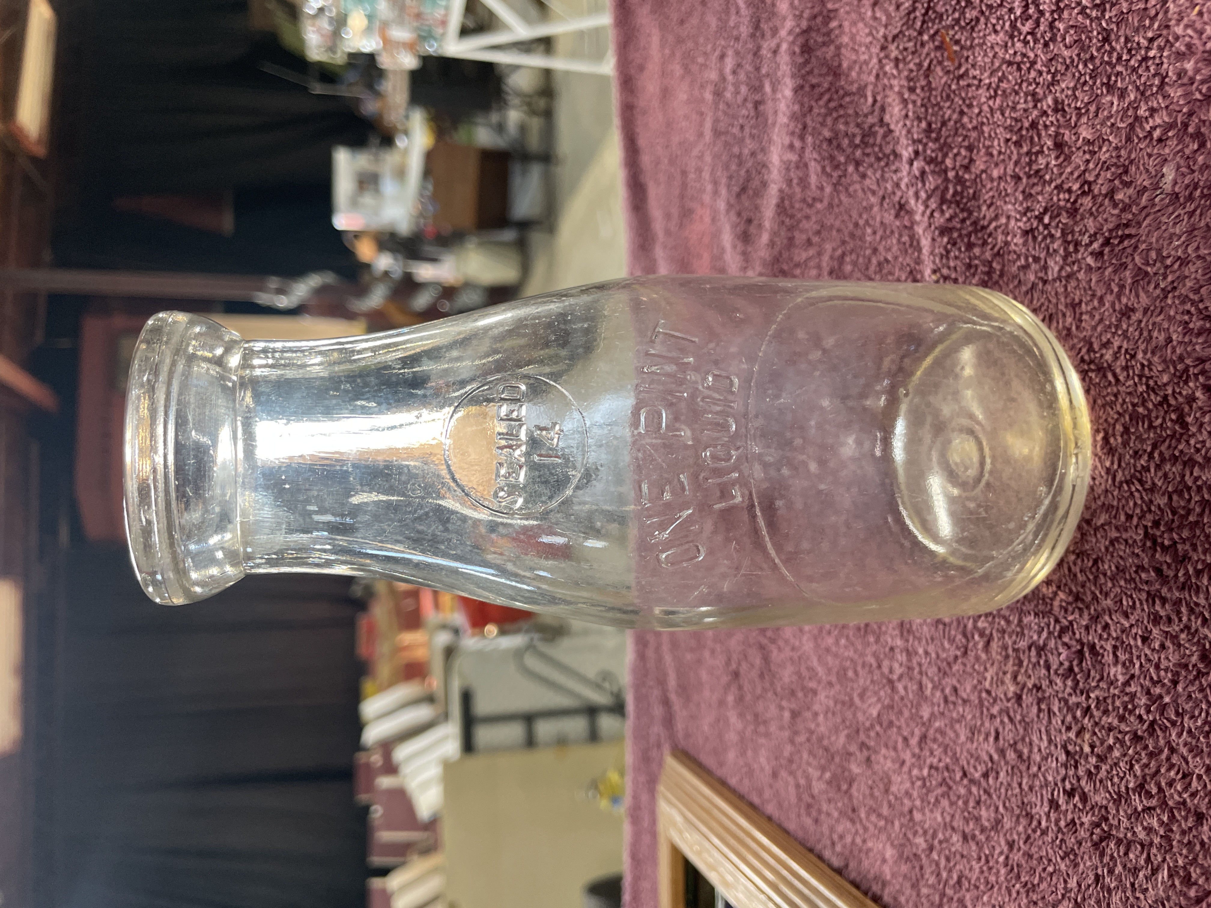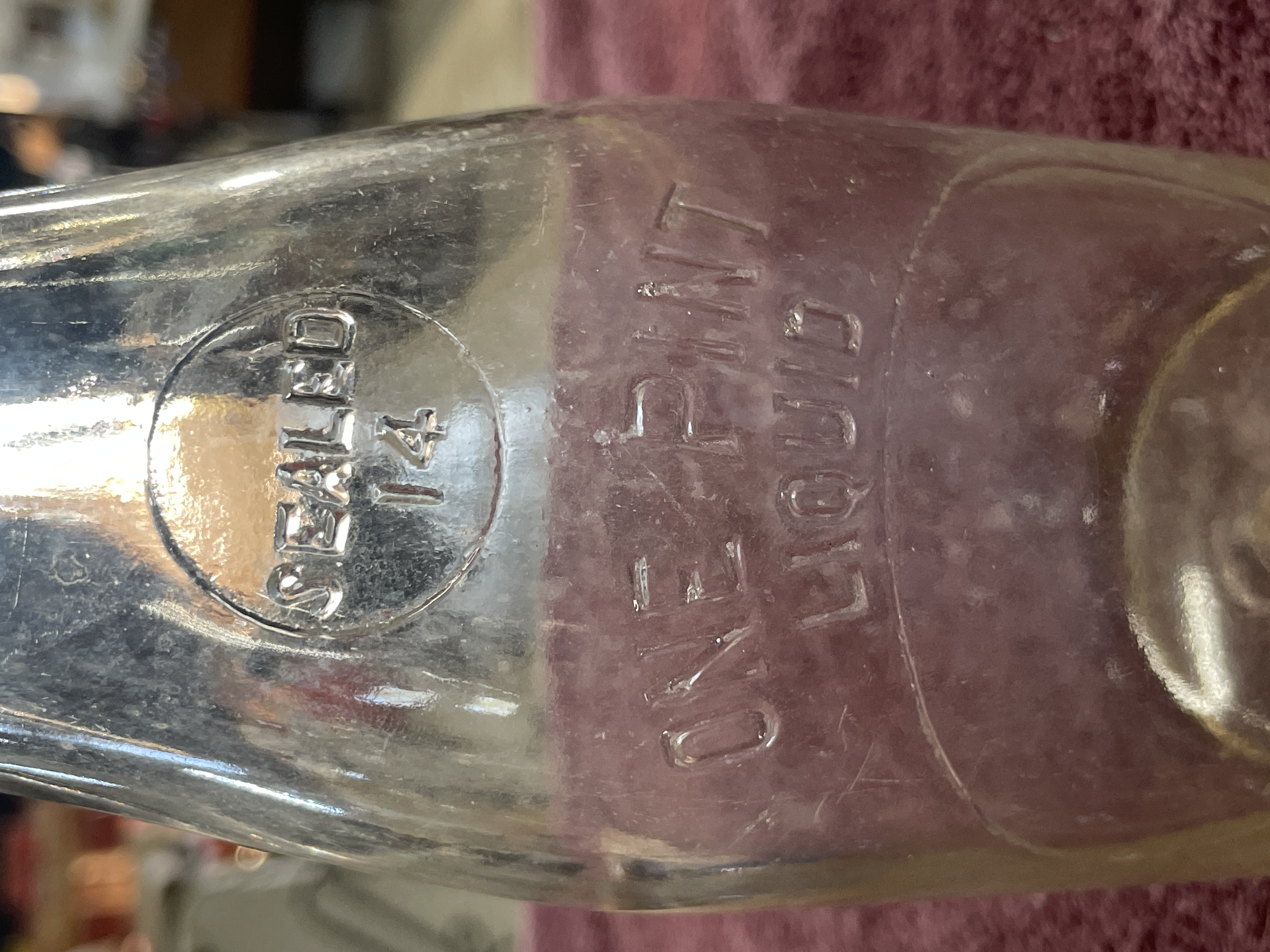 A single vintage clear glass milk bottle of standard dairy design. The vessel features heavy embossing across the body indicating the capacity as ONE PINT LIQUID. Near the neck, an official measurement seal is prominently marked with SEALED 14 within a circular cartouche. Additional manufacturer marks, T M C, are visible embossed near the base or heel. The bottle features a wide lip designed for a cap closure.
