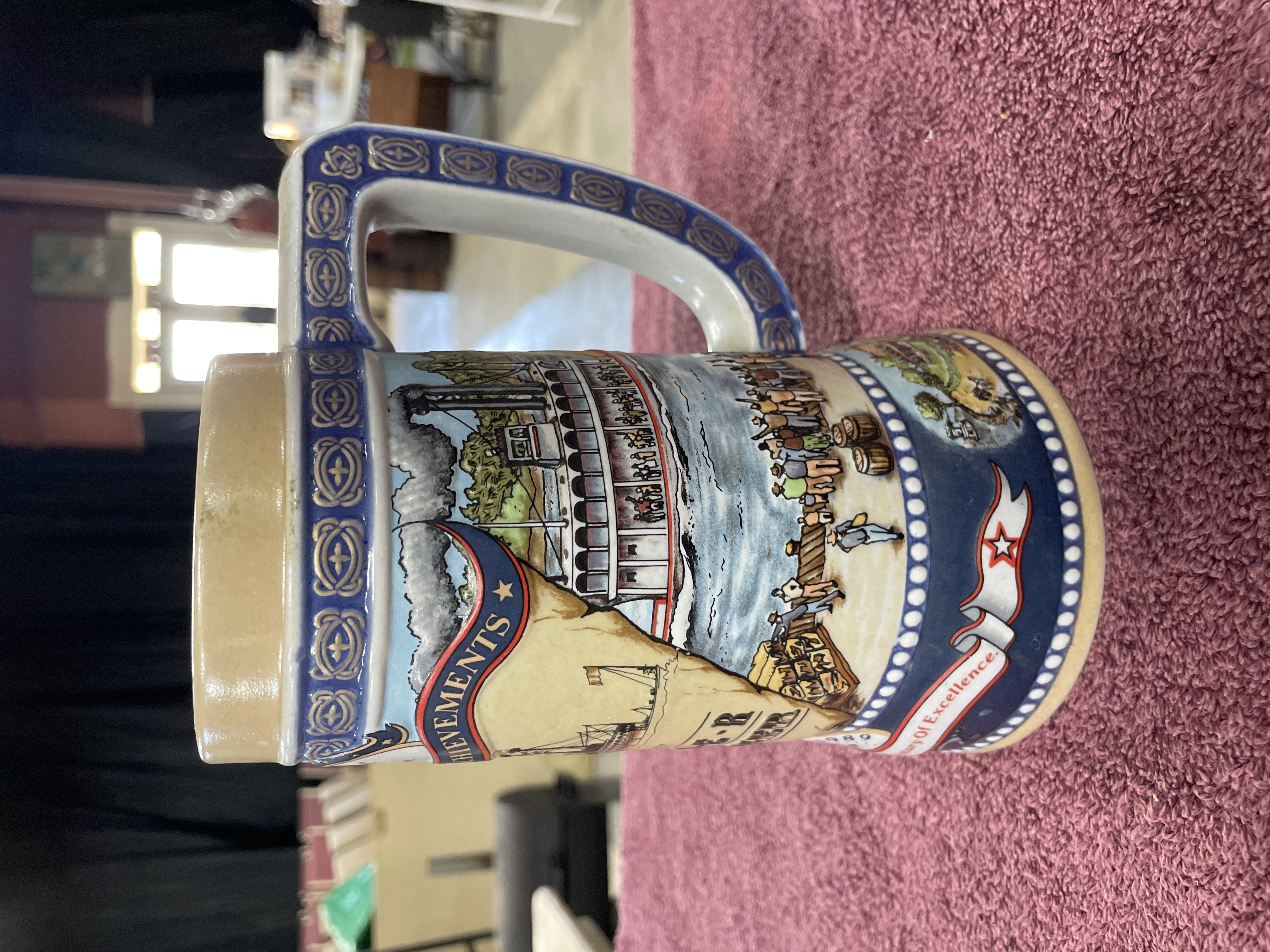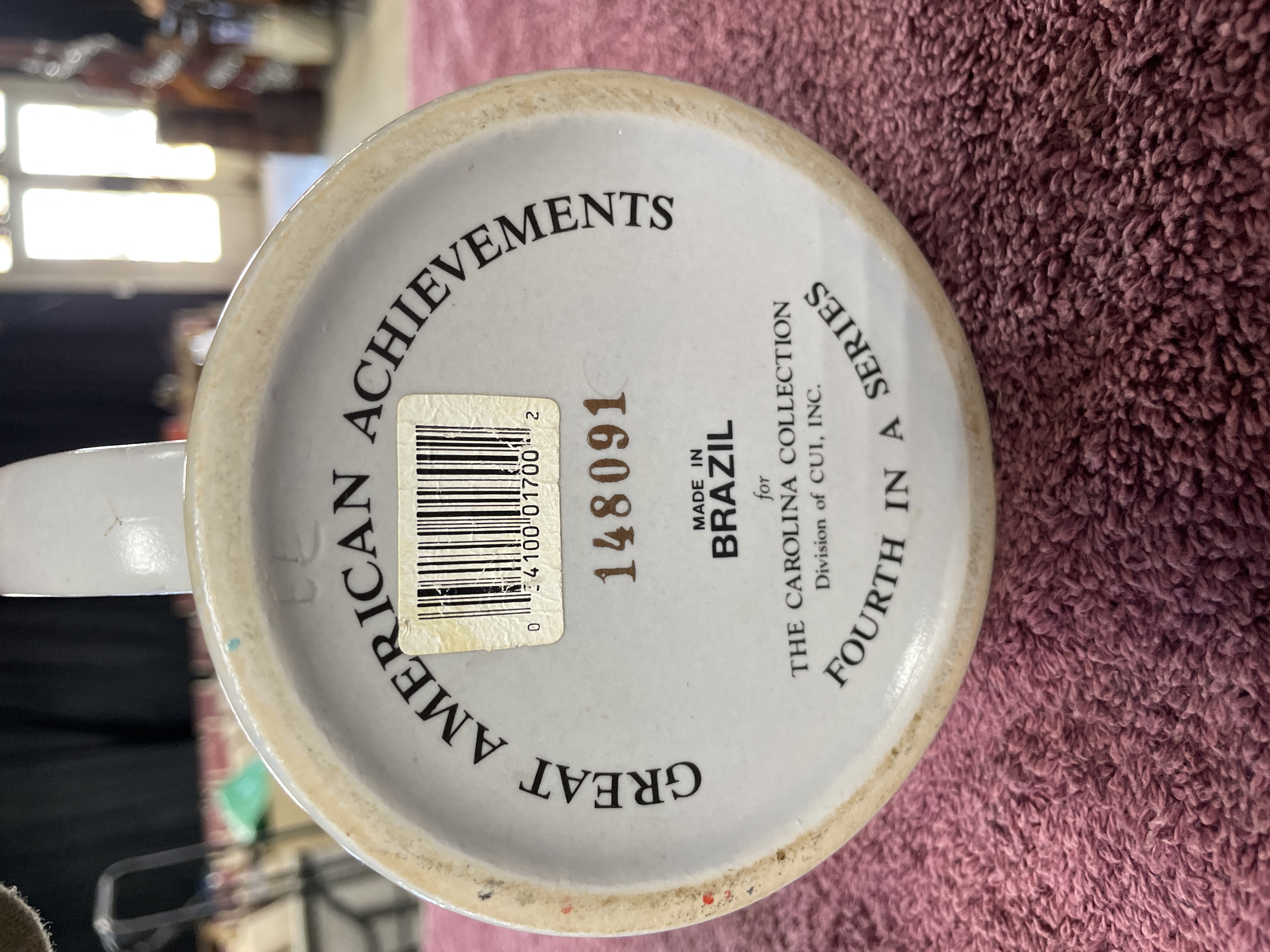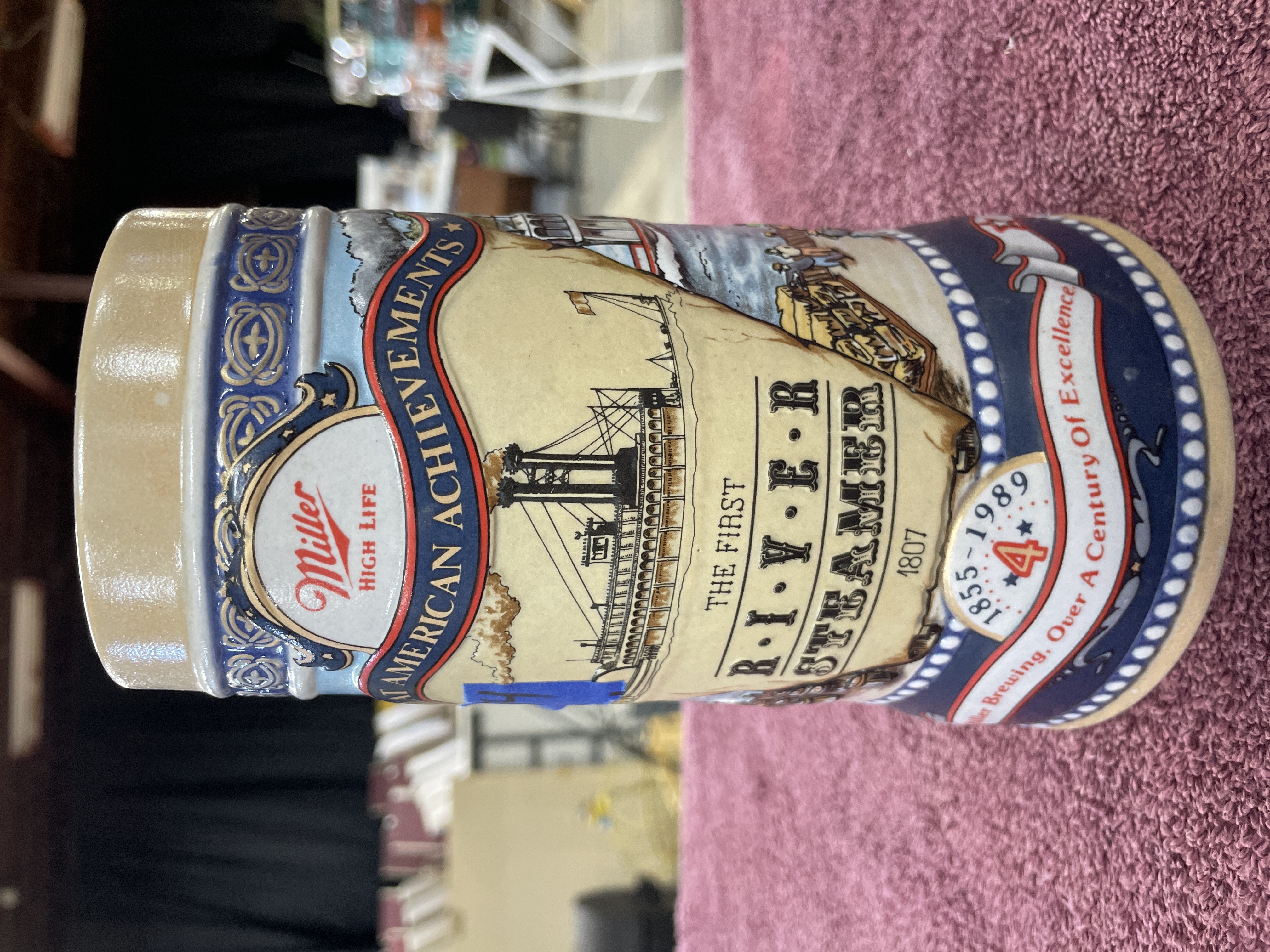 This is a commemorative stoneware beer stein identified as part of the Miller High Life Great American Achievements series. The stein is the fourth in the series, celebrating "The First River Steamer 1807" and the brewing dates "1855 – 1989: Over A Century Of Excellence." The high-relief body features transfer-printed color decorations depicting a large side-wheel paddle steamer loading cargo along a riverbank, surrounded by figures and barrels, symbolizing 19th-century American river travel. The handle and rim feature blue and gold patterned decoration. The base is marked "GREAT AMERICAN ACHIEVEMENTS, " "MADE IN BRAZIL, " "148091," and "for THE CAROLINA COLLECTION Division of CUI, INC." It is explicitly marked as "FOURTH IN A SERIES."