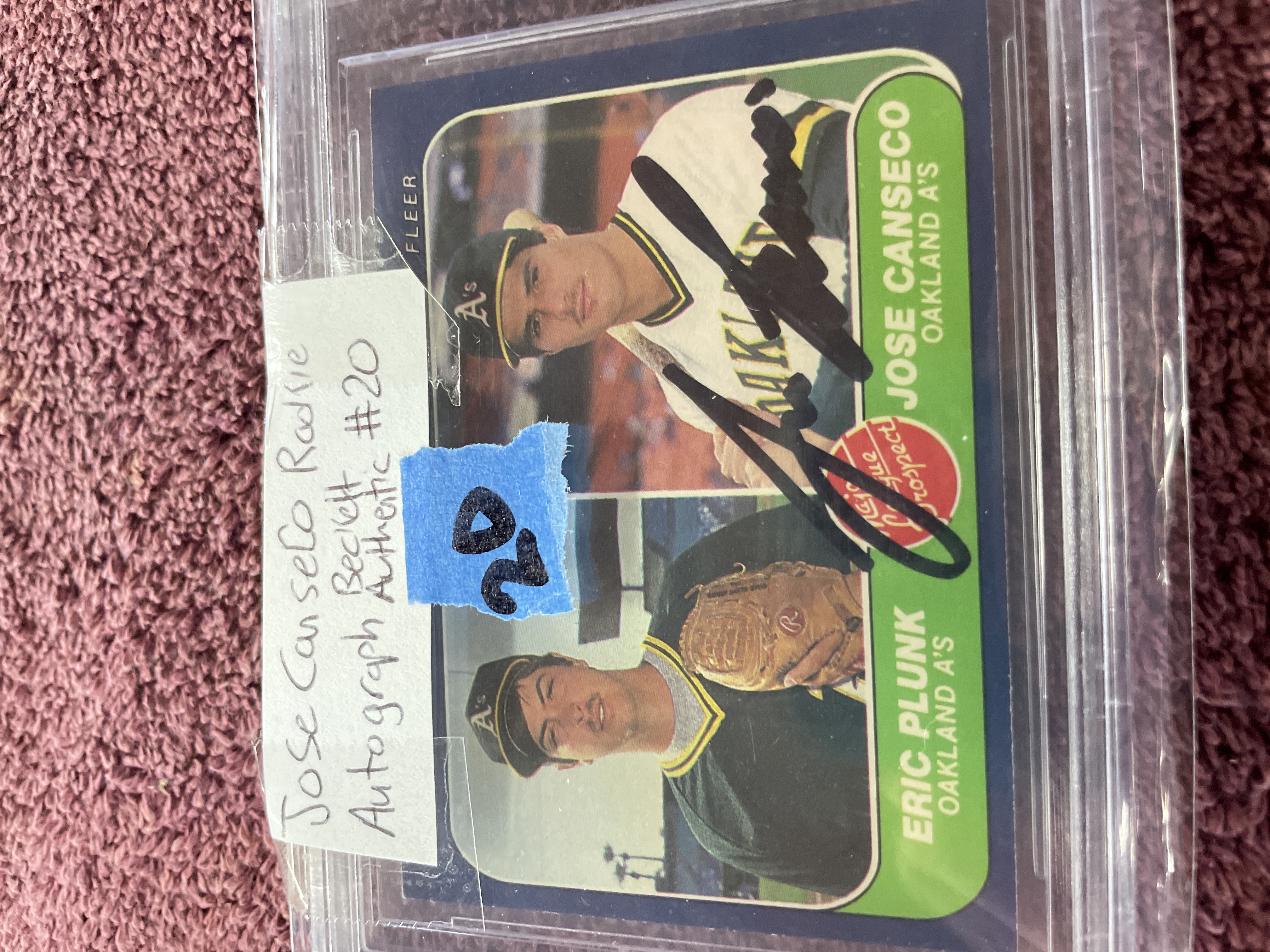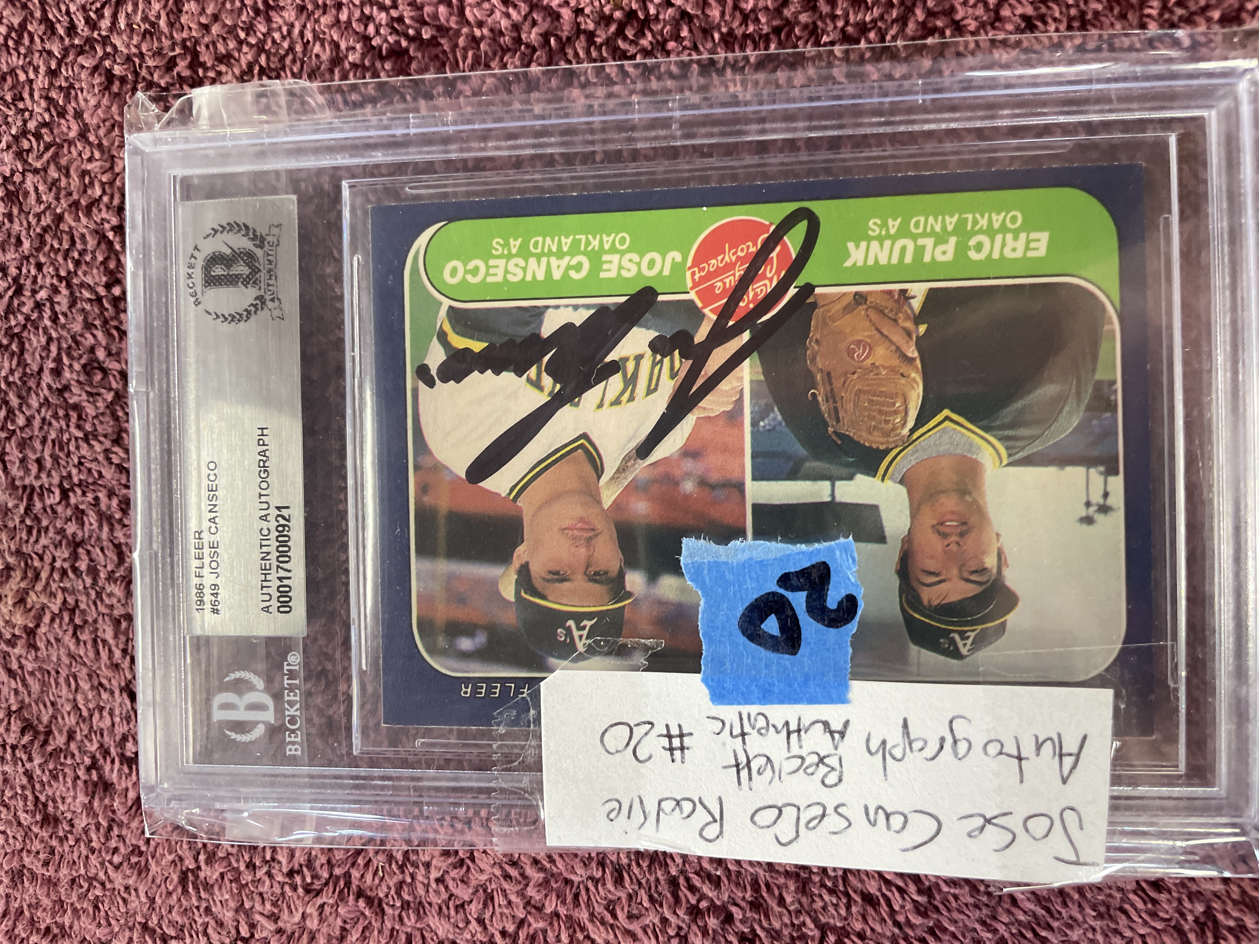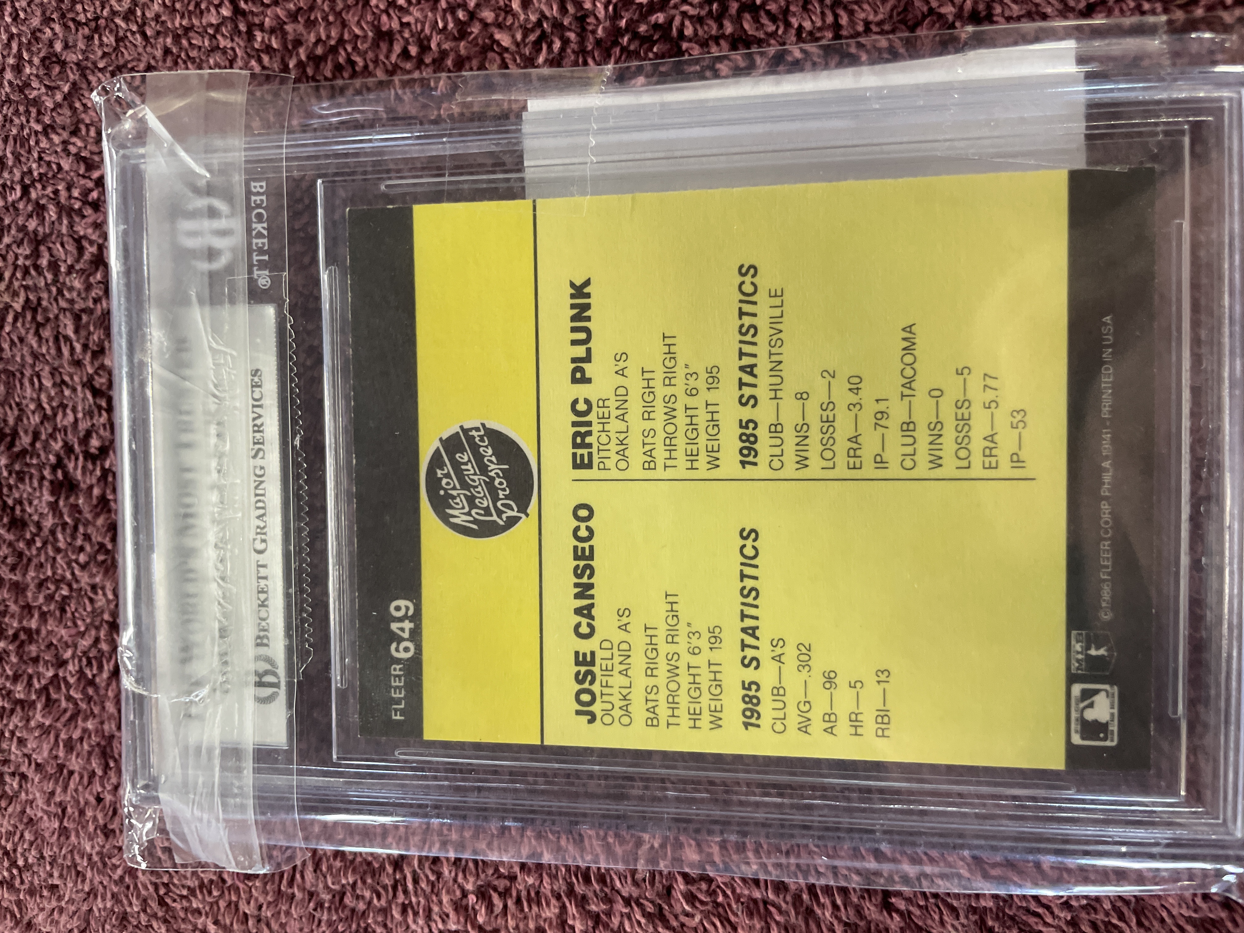 A single baseball trading card, 1986 Fleer, card number 649, featuring dual images of Major League Prospects Eric Plunk and Jose Canseco of the Oakland A’s. The card is autographed in black marker by Jose Canseco. The item is professionally encapsulated in a clear plastic grading slab by Beckett Grading Services (BGS). The BGS label certifies the item as an AUTHENTIC AUTOGRAPH, bearing certification number 0001700921. The reverse of the card is yellow and details 1985 statistics for both athletes.