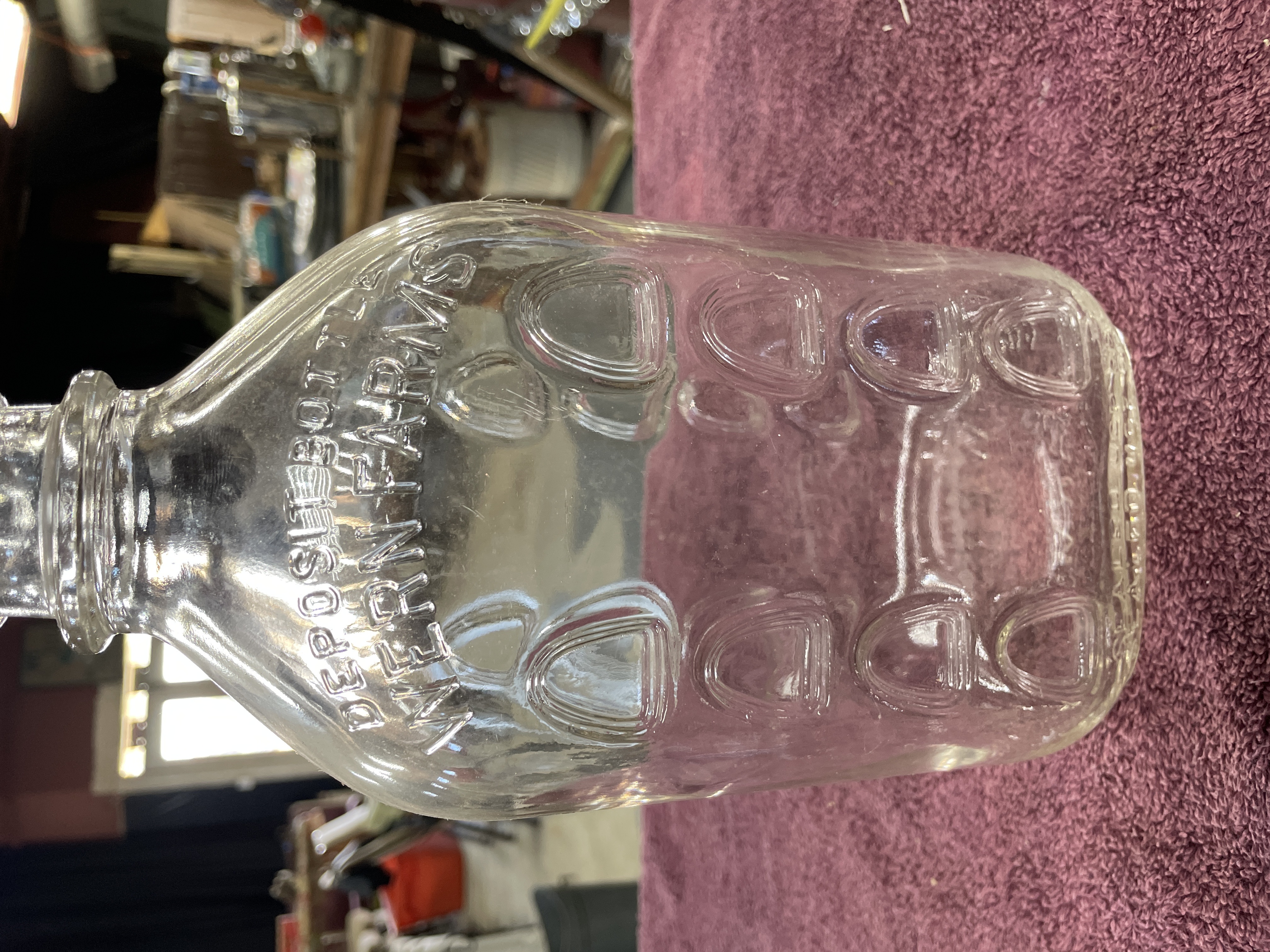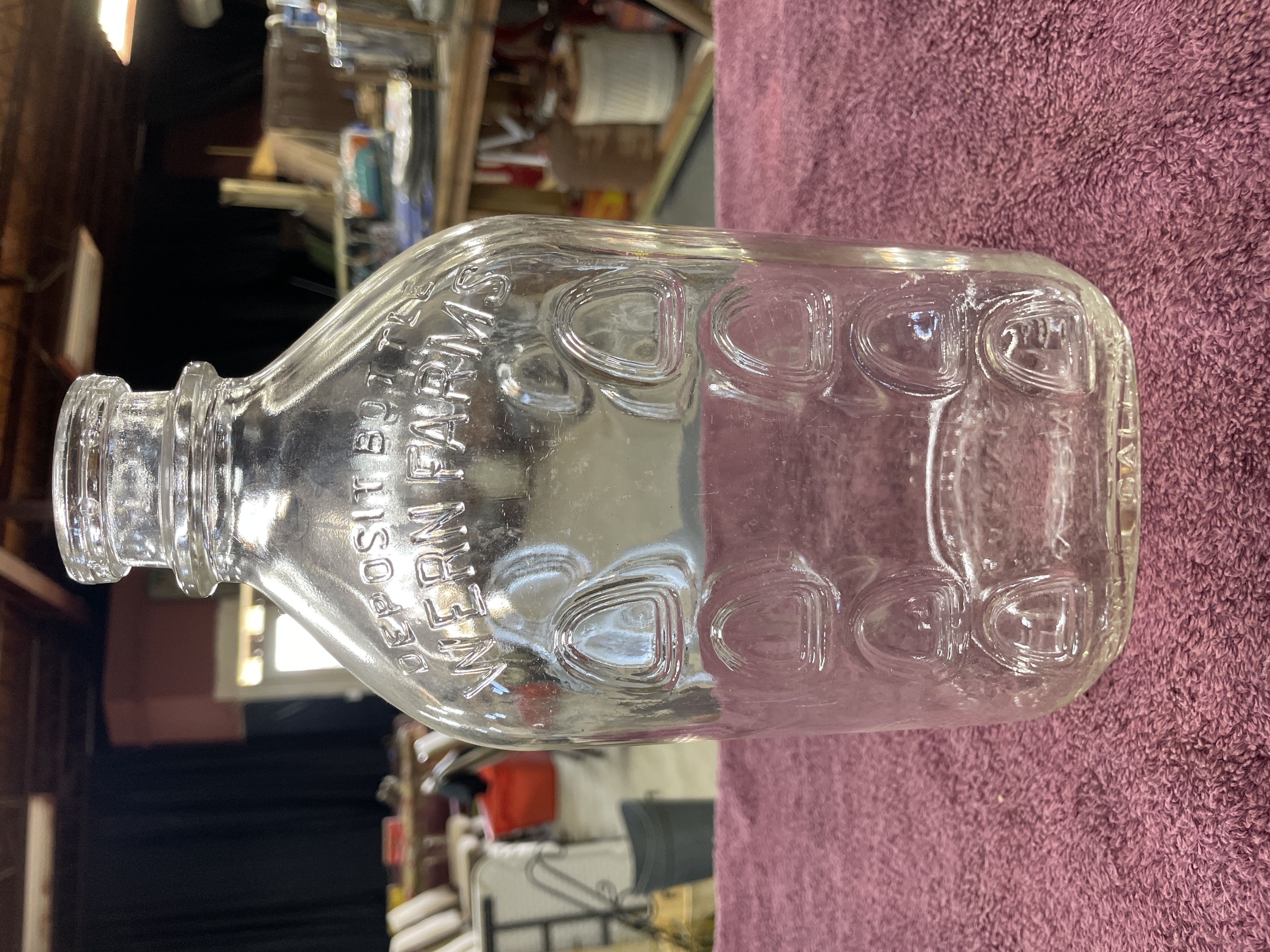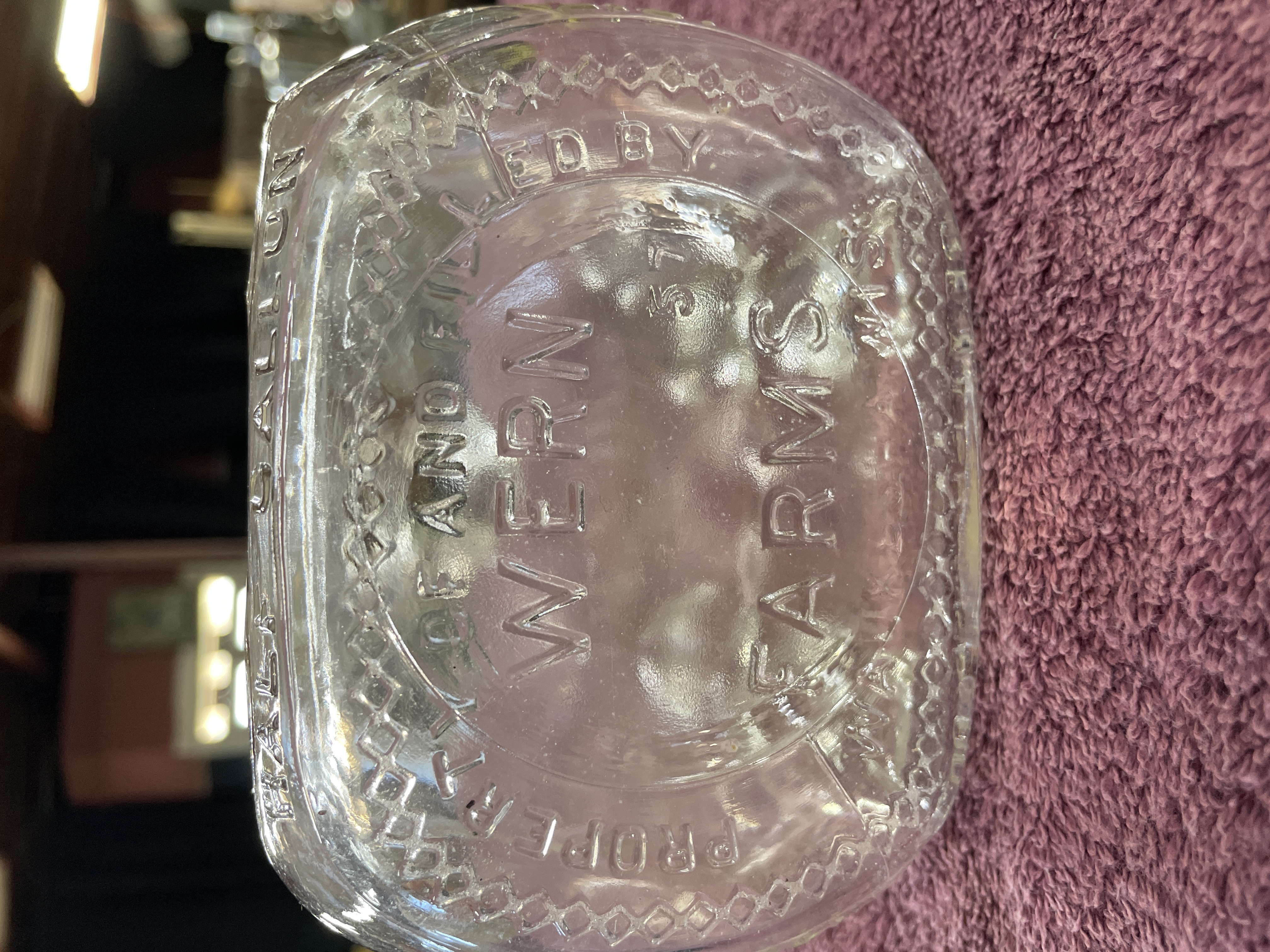 A single vintage clear molded glass milk bottle of half-gallon capacity. The bottle features a squared body, rounded shoulders, and a threaded lip designed for a cap closure. The body is molded with eight raised, arched panels, four per side, which function as finger grips. Extensive text is embossed directly into the glass. The base area is marked HALF GALLON. The shoulder area features the inscription DEPOSIT BOTTLE and WERN FARMS. Further embossed details around the shoulder include PROPERTY OF AND FILLED BY WERN FARMS WIS (Wisconsin). The manufacturing marking SEALED WSP 92 is visible near the base.