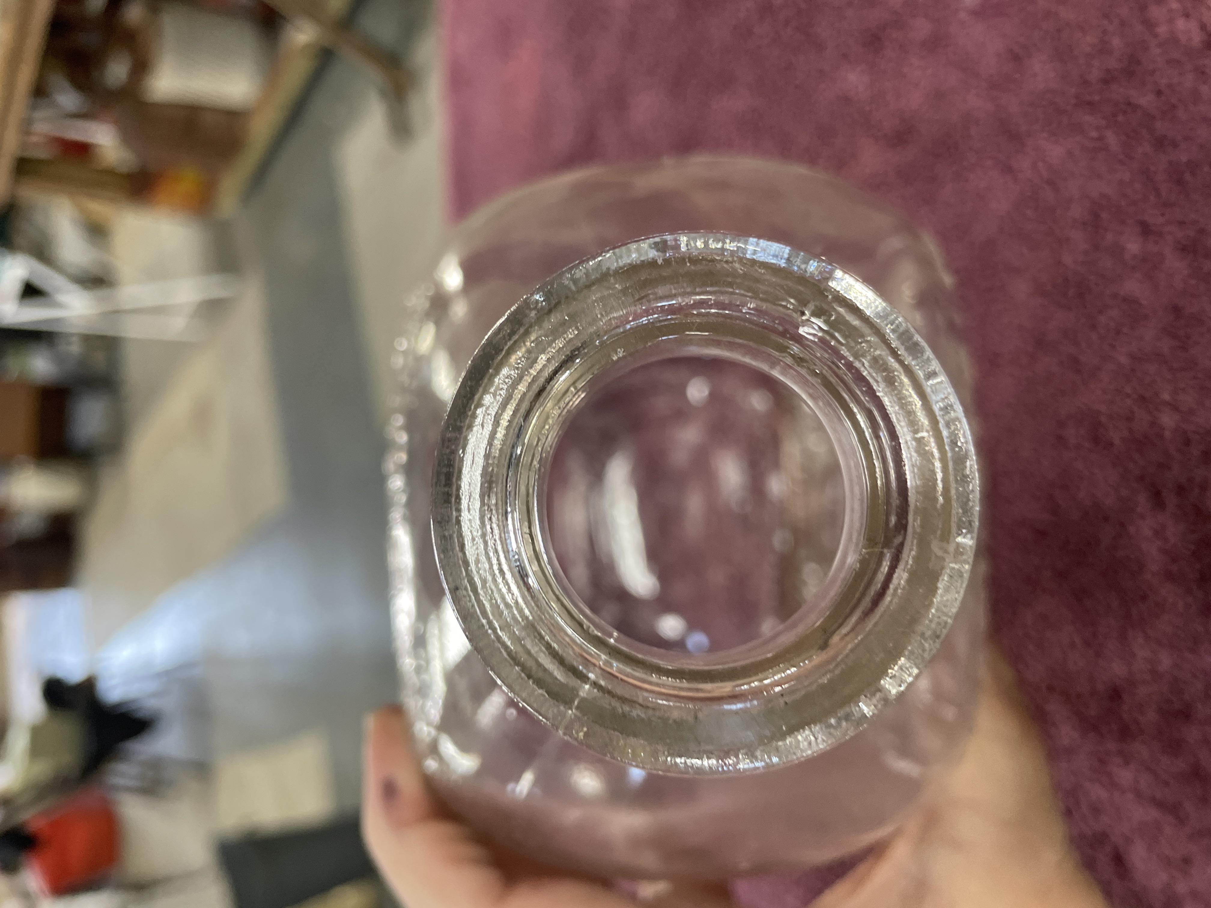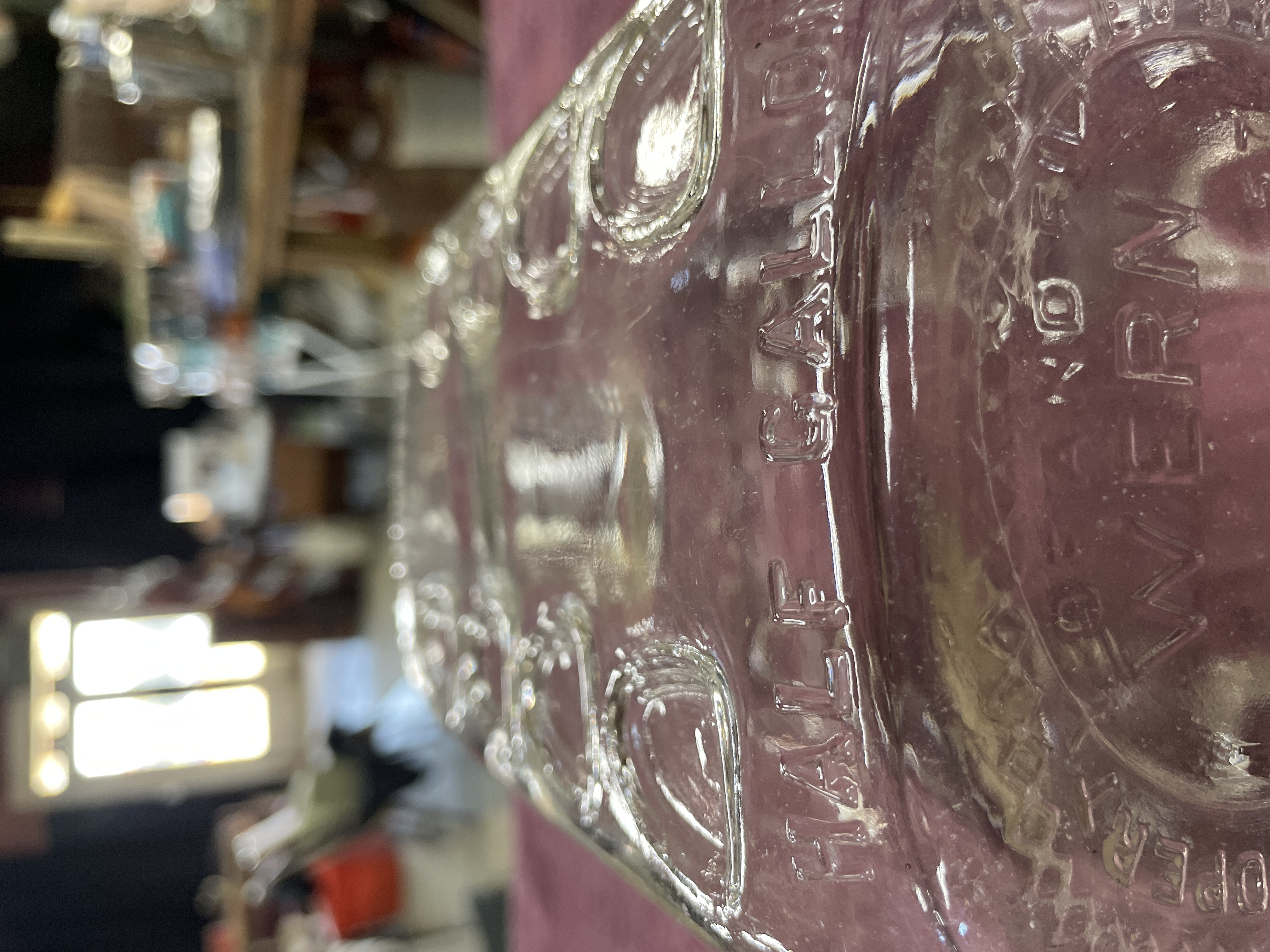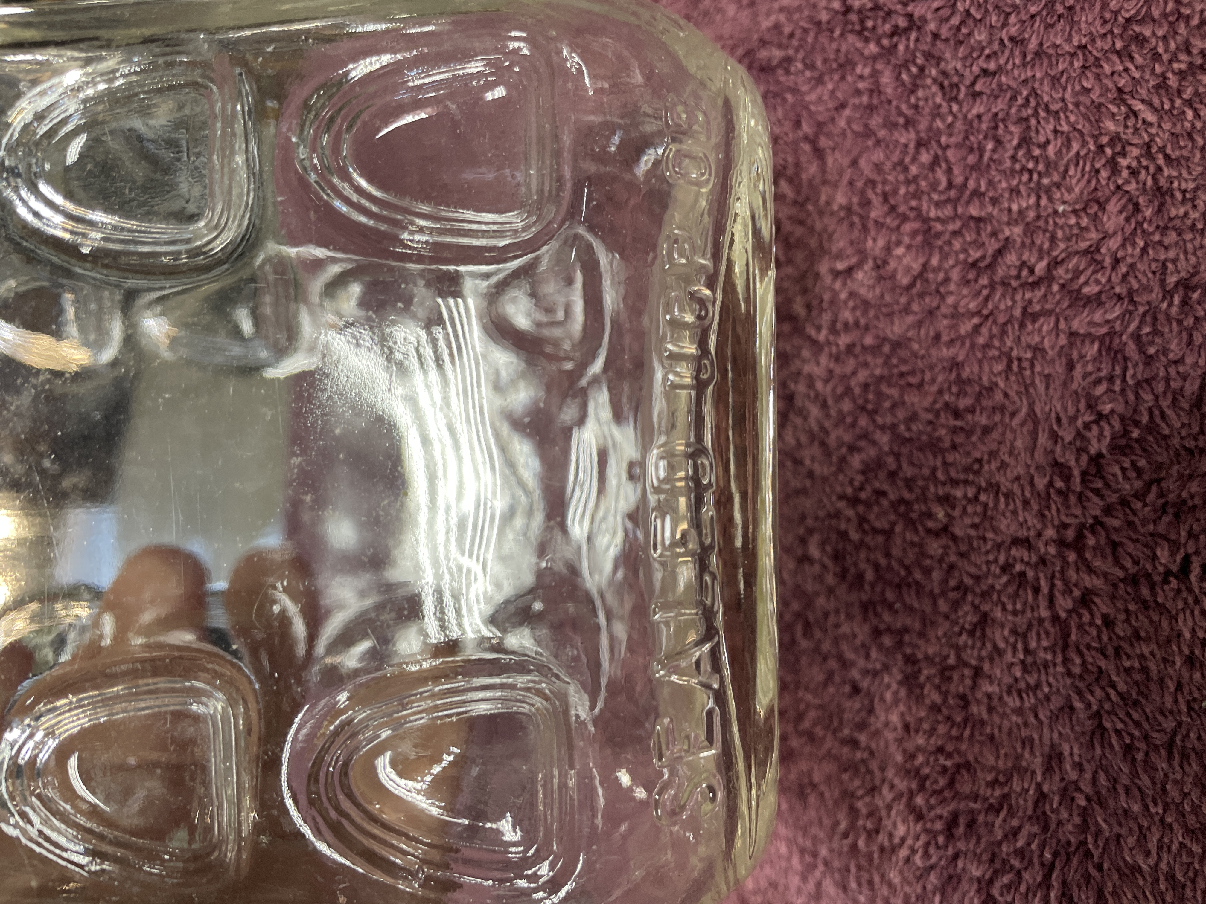 A single vintage clear molded glass milk bottle of half-gallon capacity. The bottle features a squared body, rounded shoulders, and a threaded lip designed for a cap closure. The body is molded with eight raised, arched panels, four per side, which function as finger grips. Extensive text is embossed directly into the glass. The base area is marked HALF GALLON. The shoulder area features the inscription DEPOSIT BOTTLE and WERN FARMS. Further embossed details around the shoulder include PROPERTY OF AND FILLED BY WERN FARMS WIS (Wisconsin). The manufacturing marking SEALED WSP 92 is visible near the base.