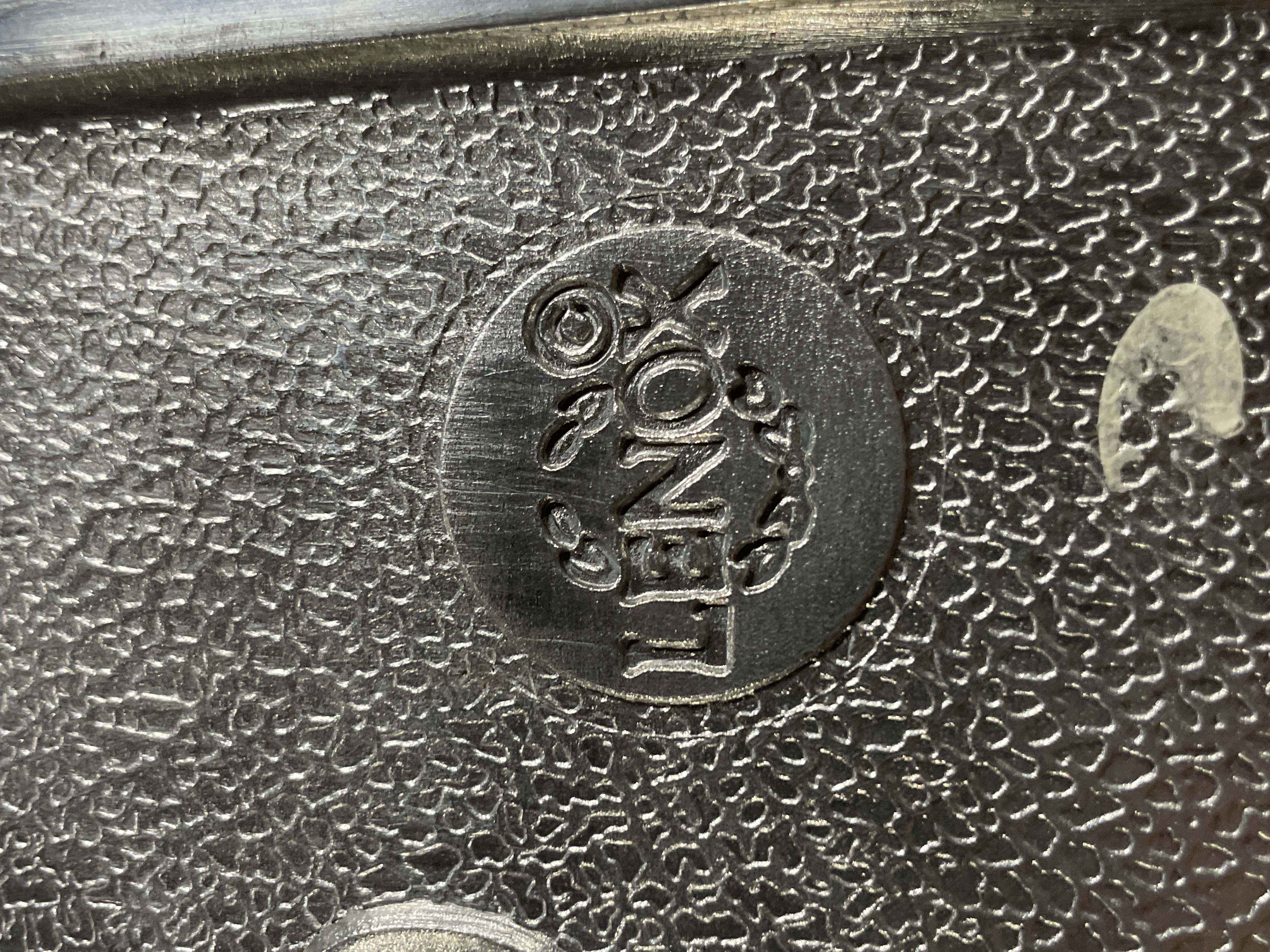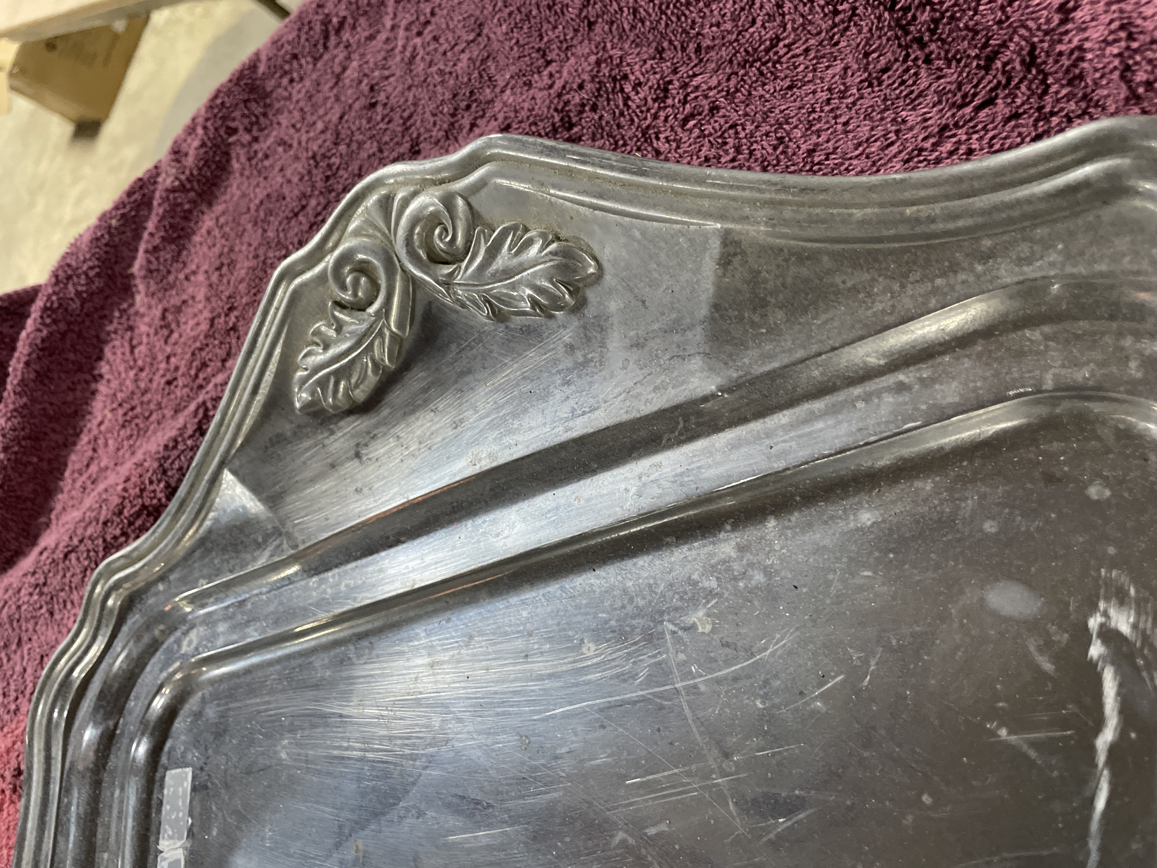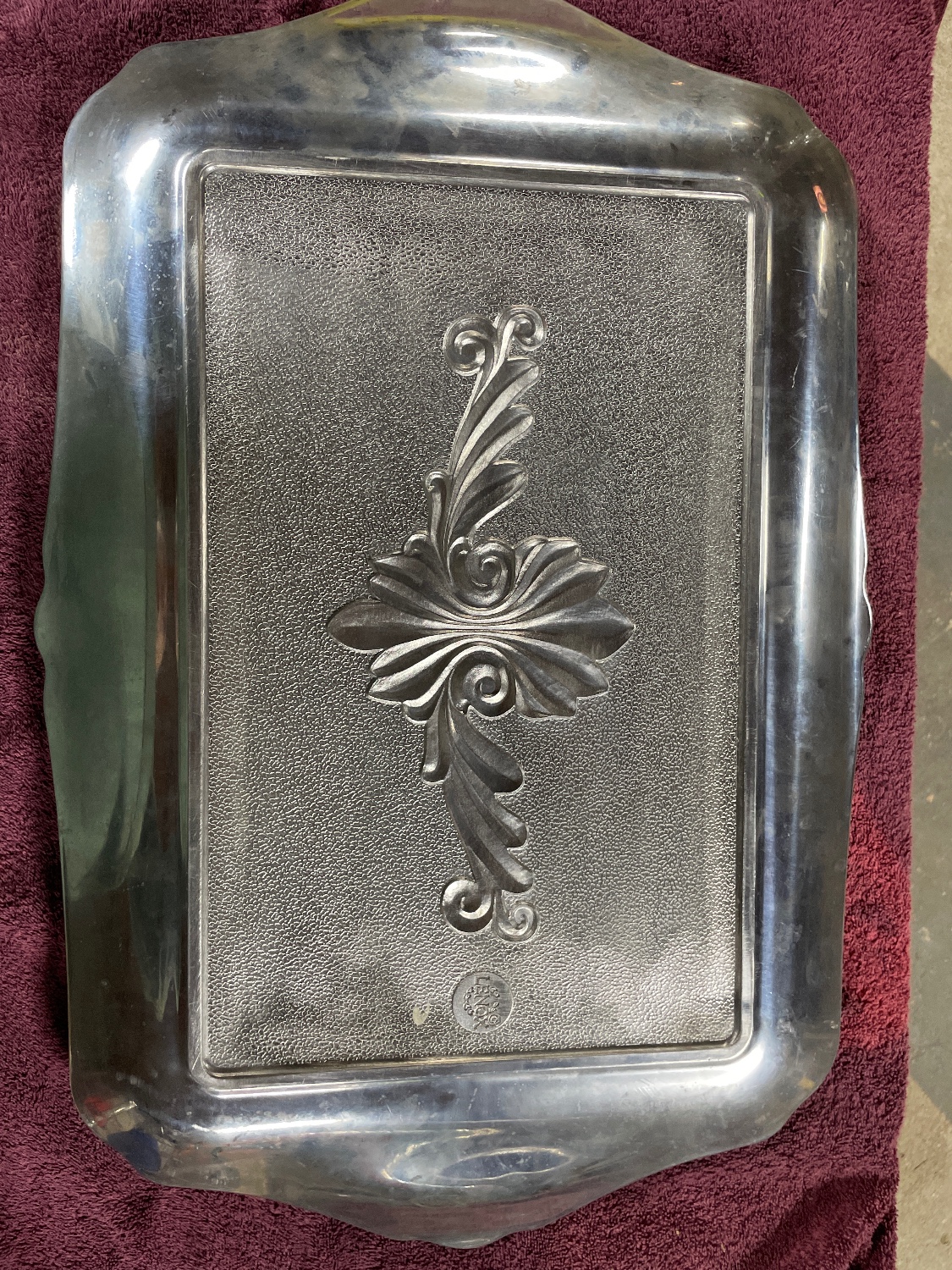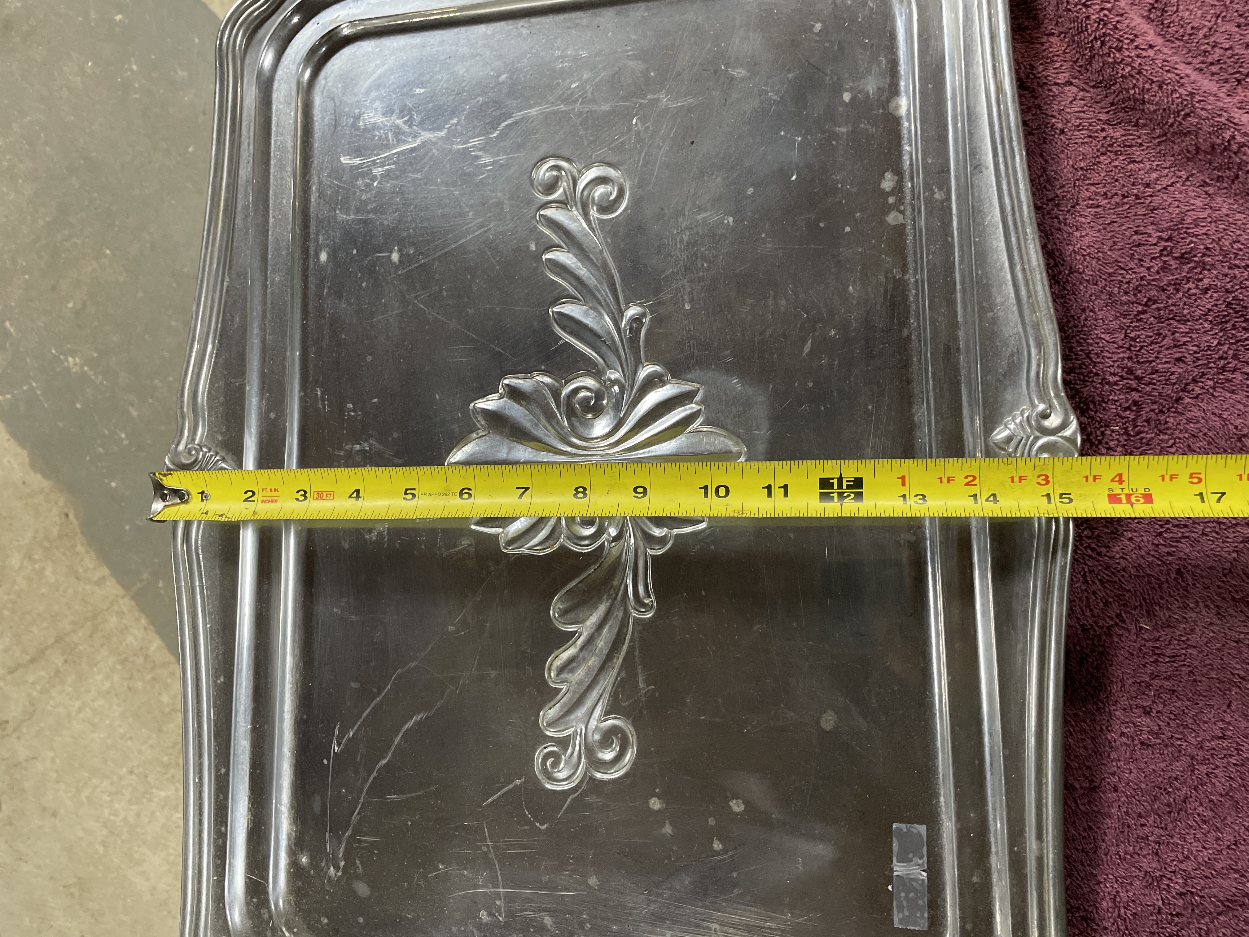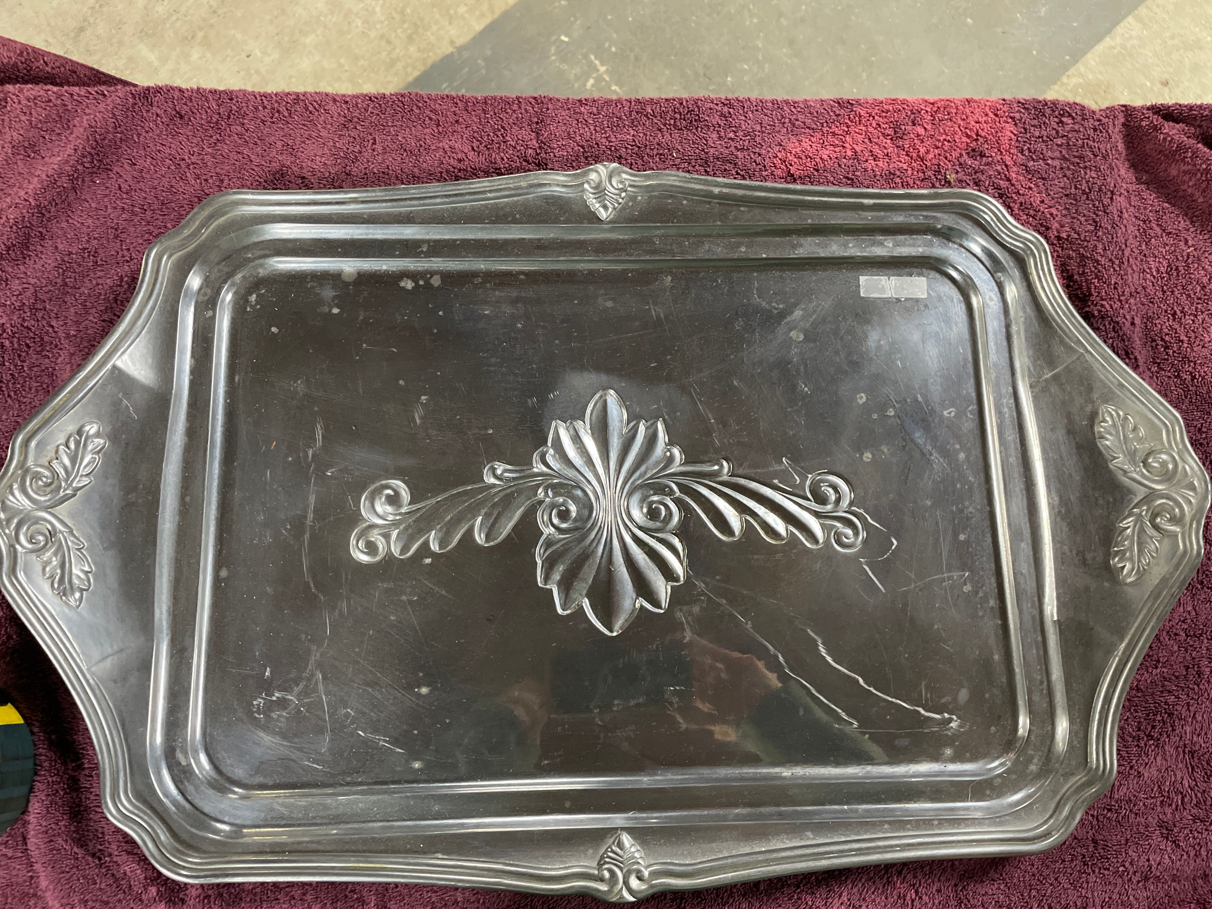 A single rectangular serving tray attributed to the Lenox Butler’s Pantry line. The tray is constructed of silver-toned metal, likely pewter or a plated alloy, and features a reversible design. One side presents a highly polished surface, while the reverse side features a stippled or textured finish. The traditional style tray has a molded, slightly scalloped rim with foliate scrollwork applied to the corners. A prominent, symmetrical raised floral and foliate relief element is centered on the tray field on both sides. A circular impressed mark reading LENOX is clearly visible on the textured surface, accompanied by foliate designs and a copyright symbol.