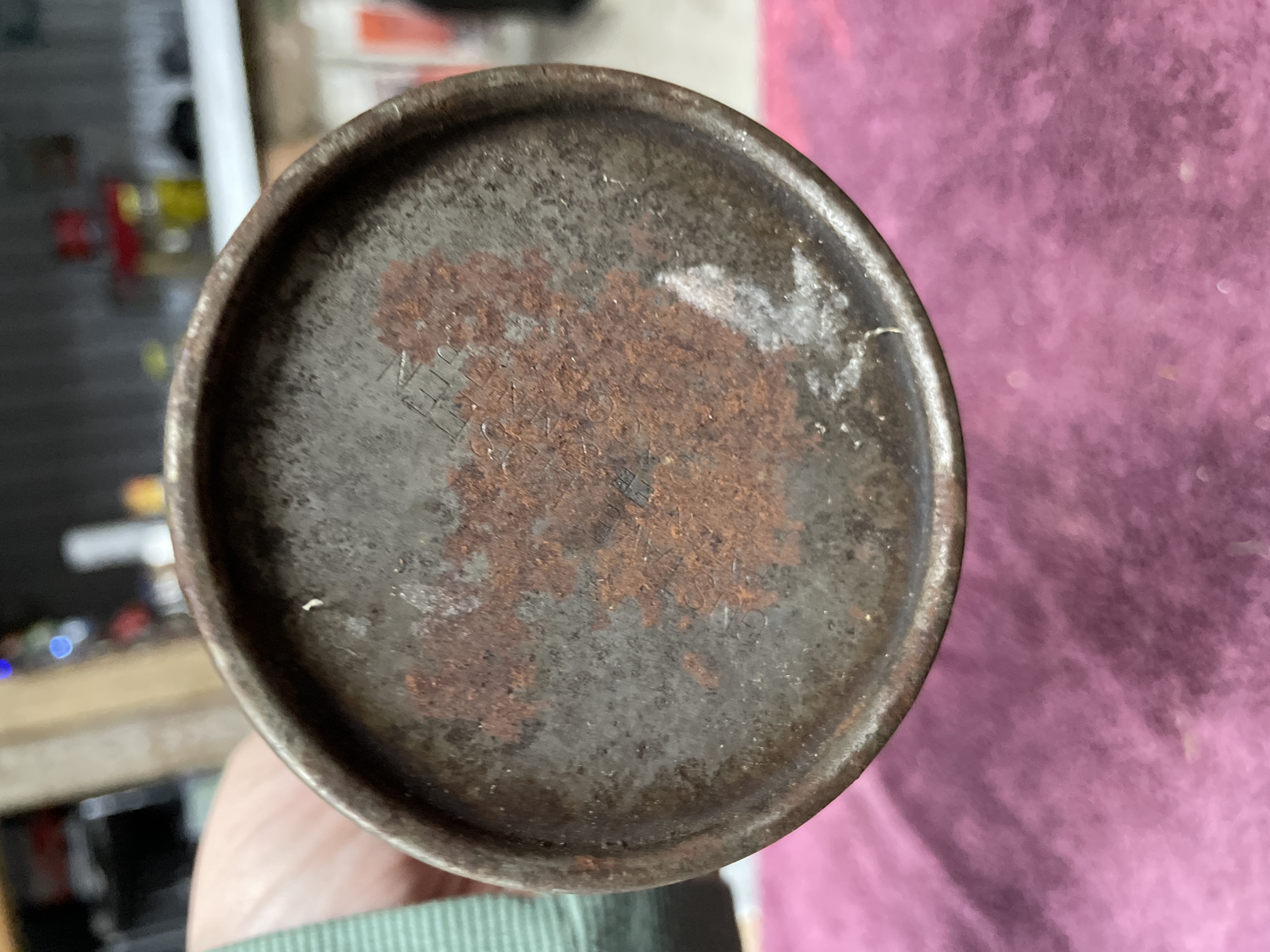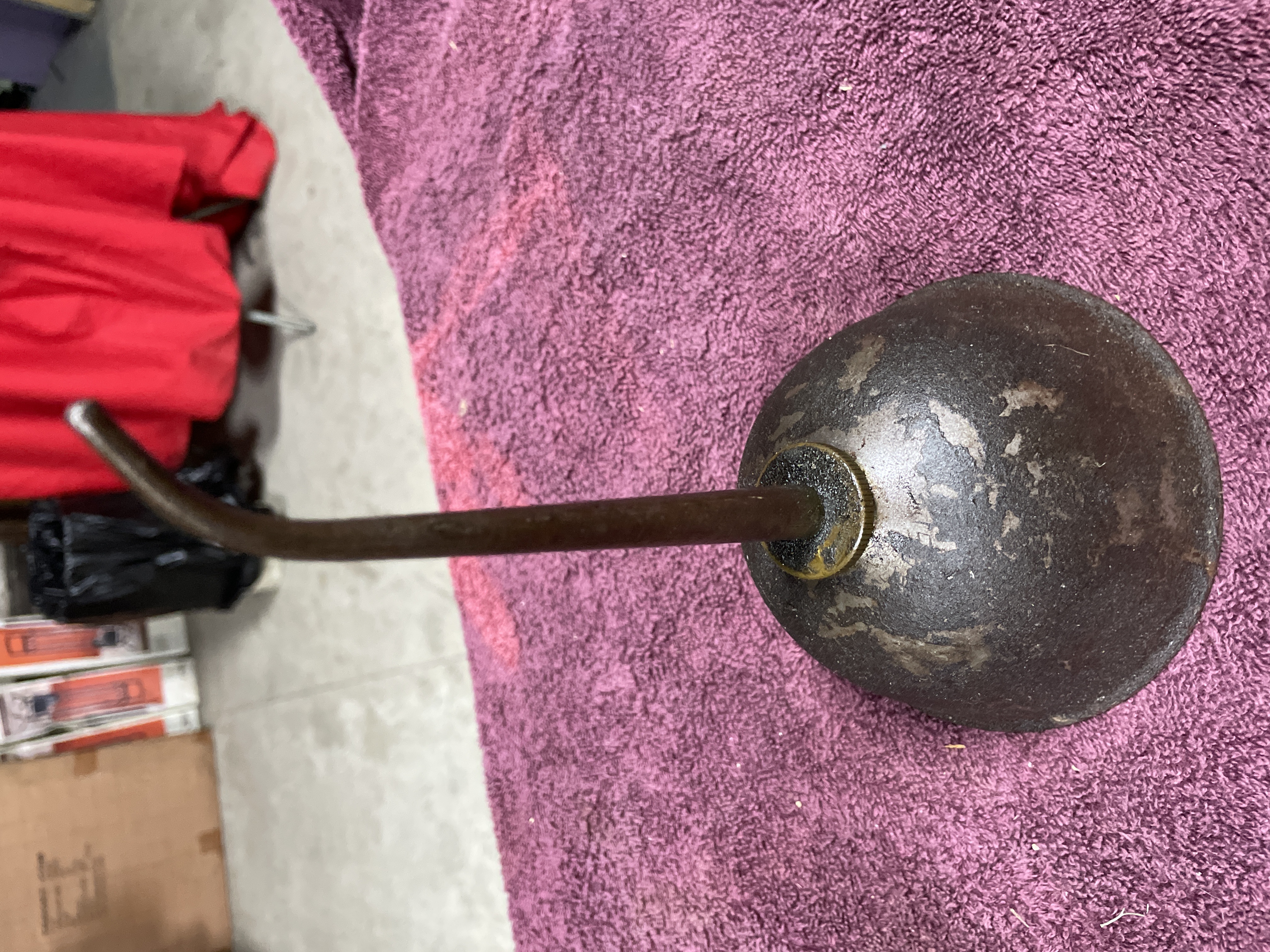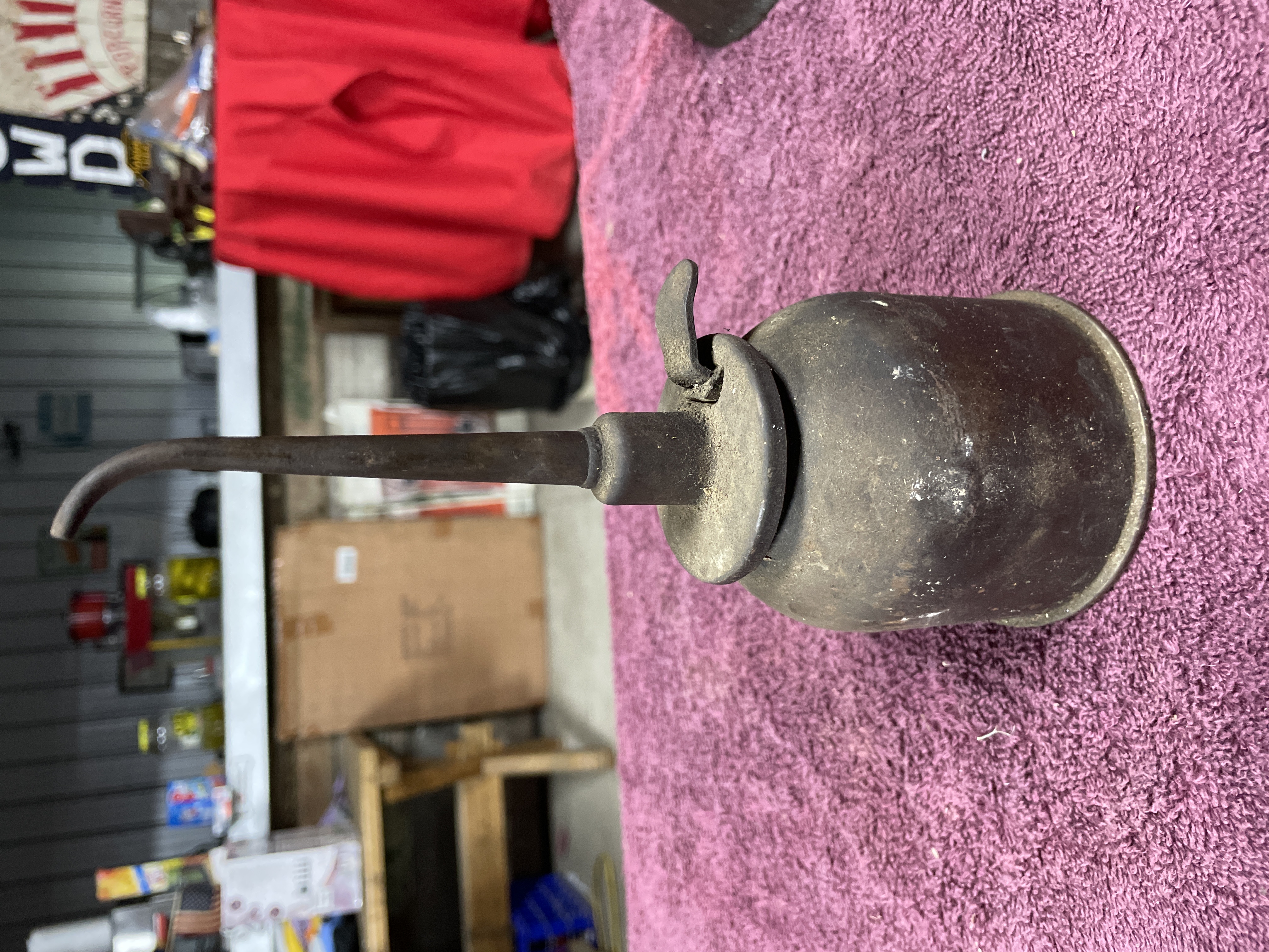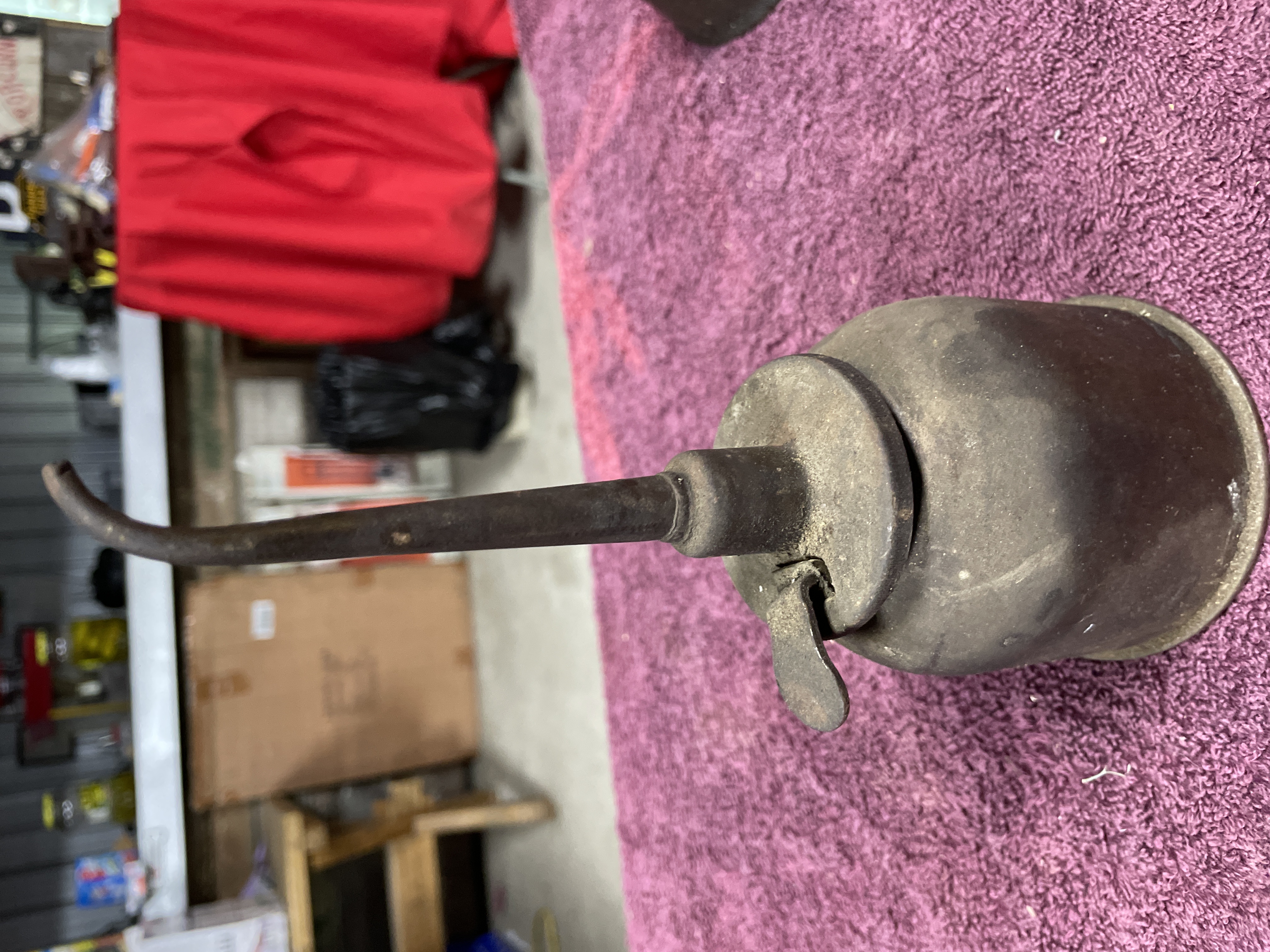 A pair of vintage oilers attributed to GEM Manufacturing Company, Pittsburgh, PA, commonly known as Thumb Press Oilers or Thumb Oil Cans. The lot includes two distinct forms: one dome-shaped oiler body and one cylindrical oiler body, both constructed from ferrous metal. The cylindrical oiler features an external lever-actuated pump mechanism on the top plate. Both pieces retain their original long, curved spouts. Heavy corrosion obscures any potential manufacturer’s marks or legible text on the bases.