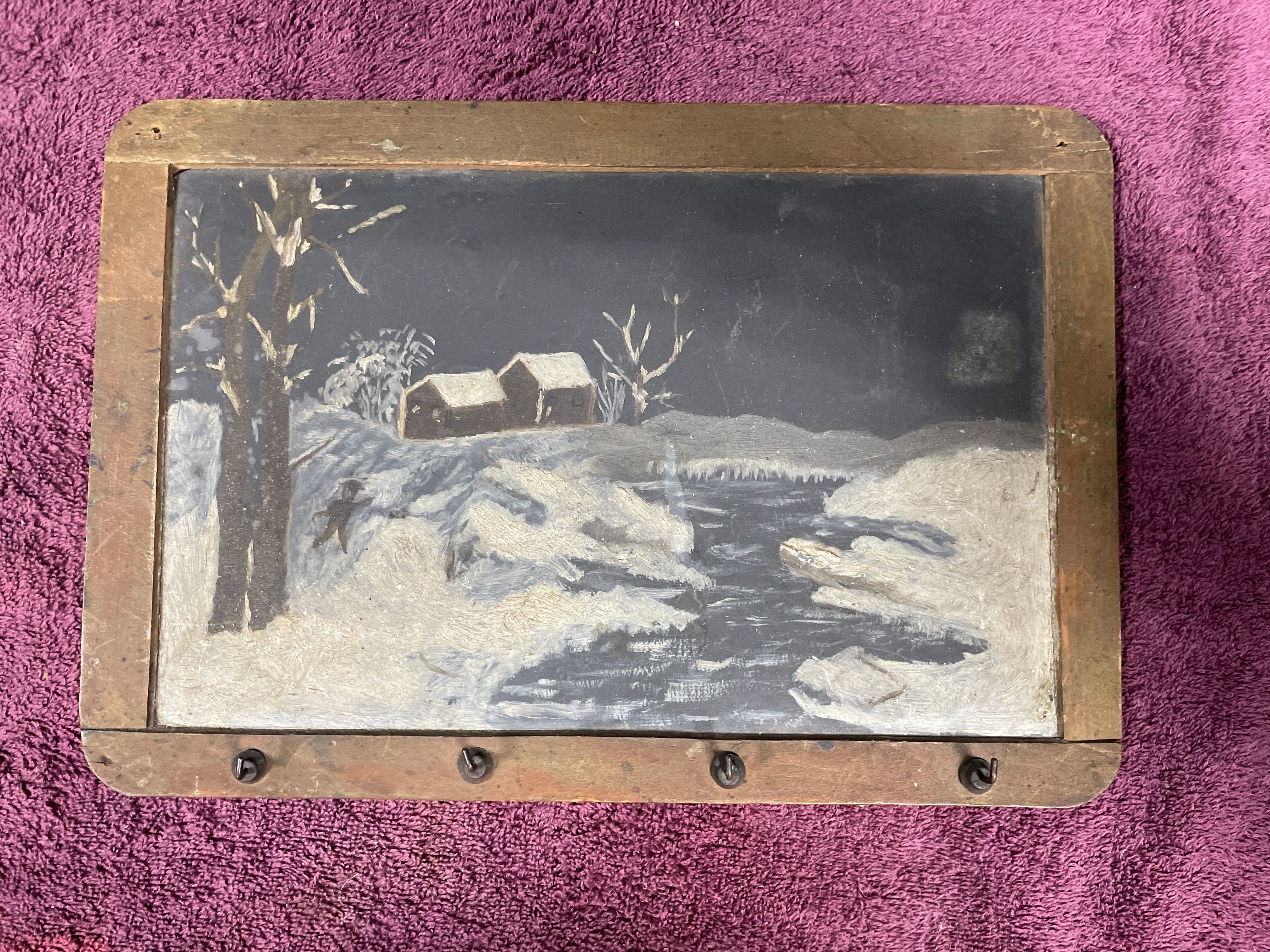 A single repurposed antique or vintage slate writing board. The object features a dark gray/black slate surface enclosed by a simple, rounded light brown wooden frame secured by visible metal fasteners. One side has been modified to feature a folk art style oil painting depicting a monochromatic winter landscape, including a stream or frozen river, executed directly onto the slate surface. This side has also been fitted with five small, black metal hooks affixed to the bottom wooden rail, suggesting use as a rack or organizer. The reverse side retains its original function as a slate writing surface. Visible markings on the slate include faint numerical remnants, such as "26."