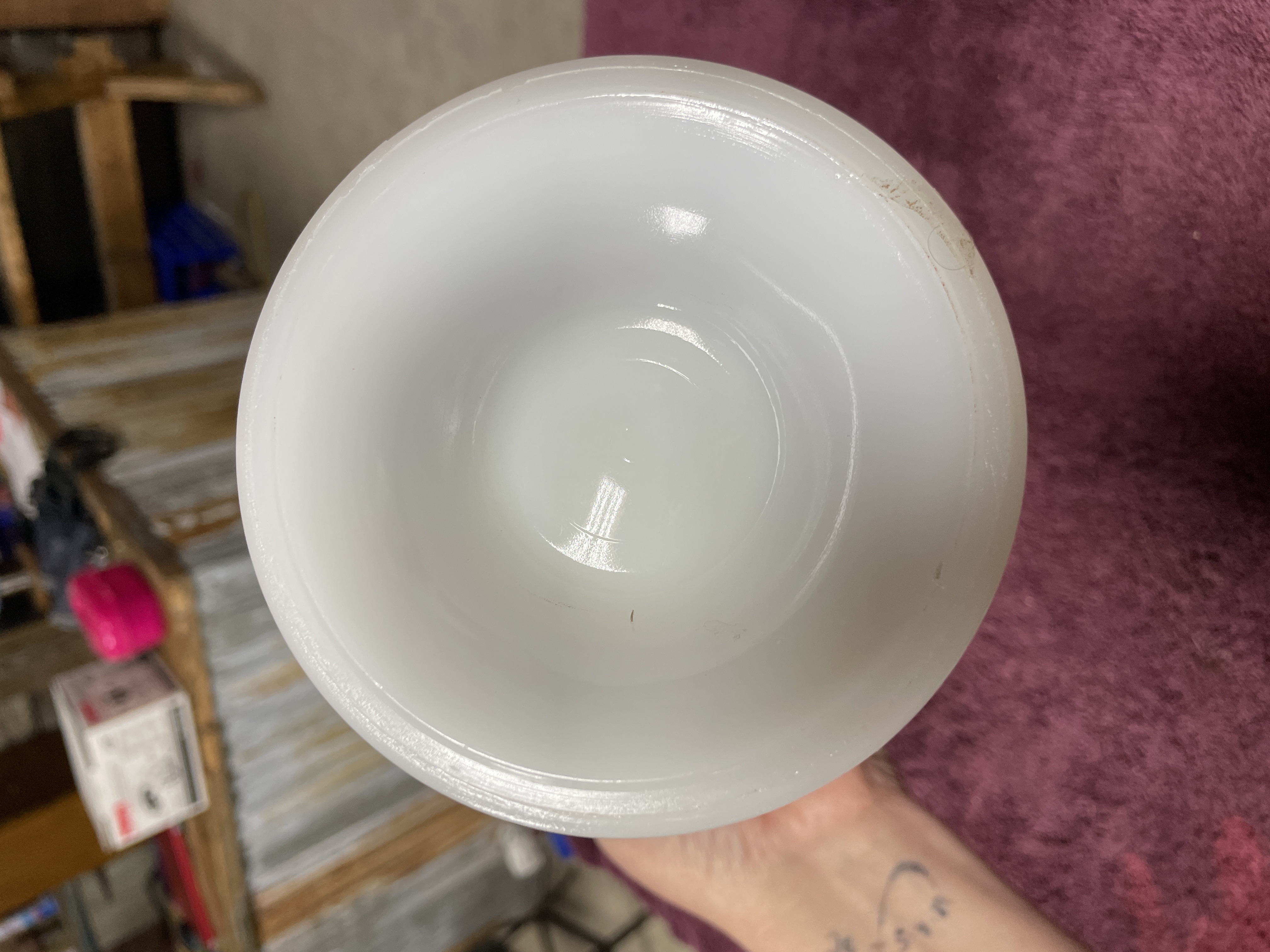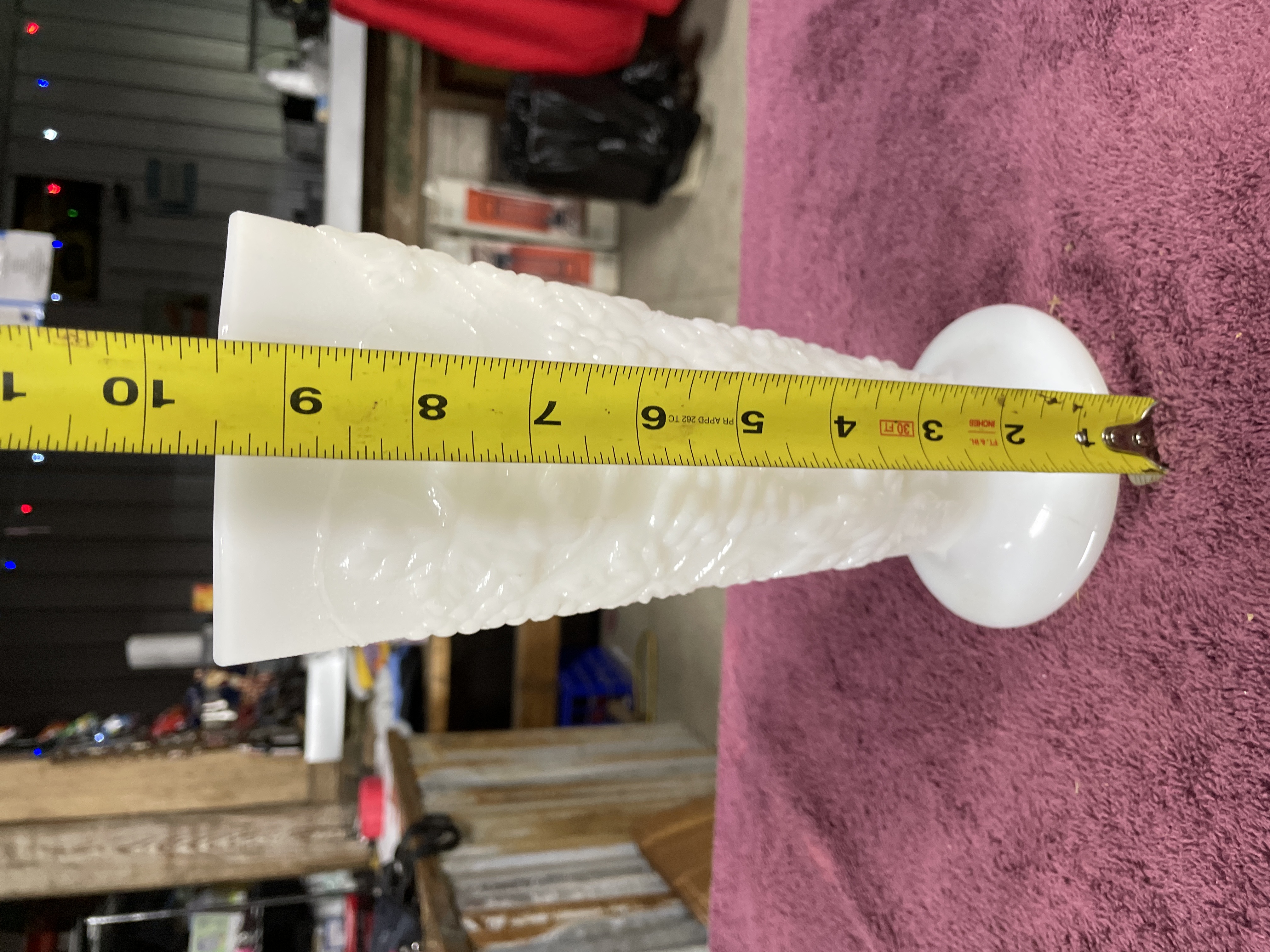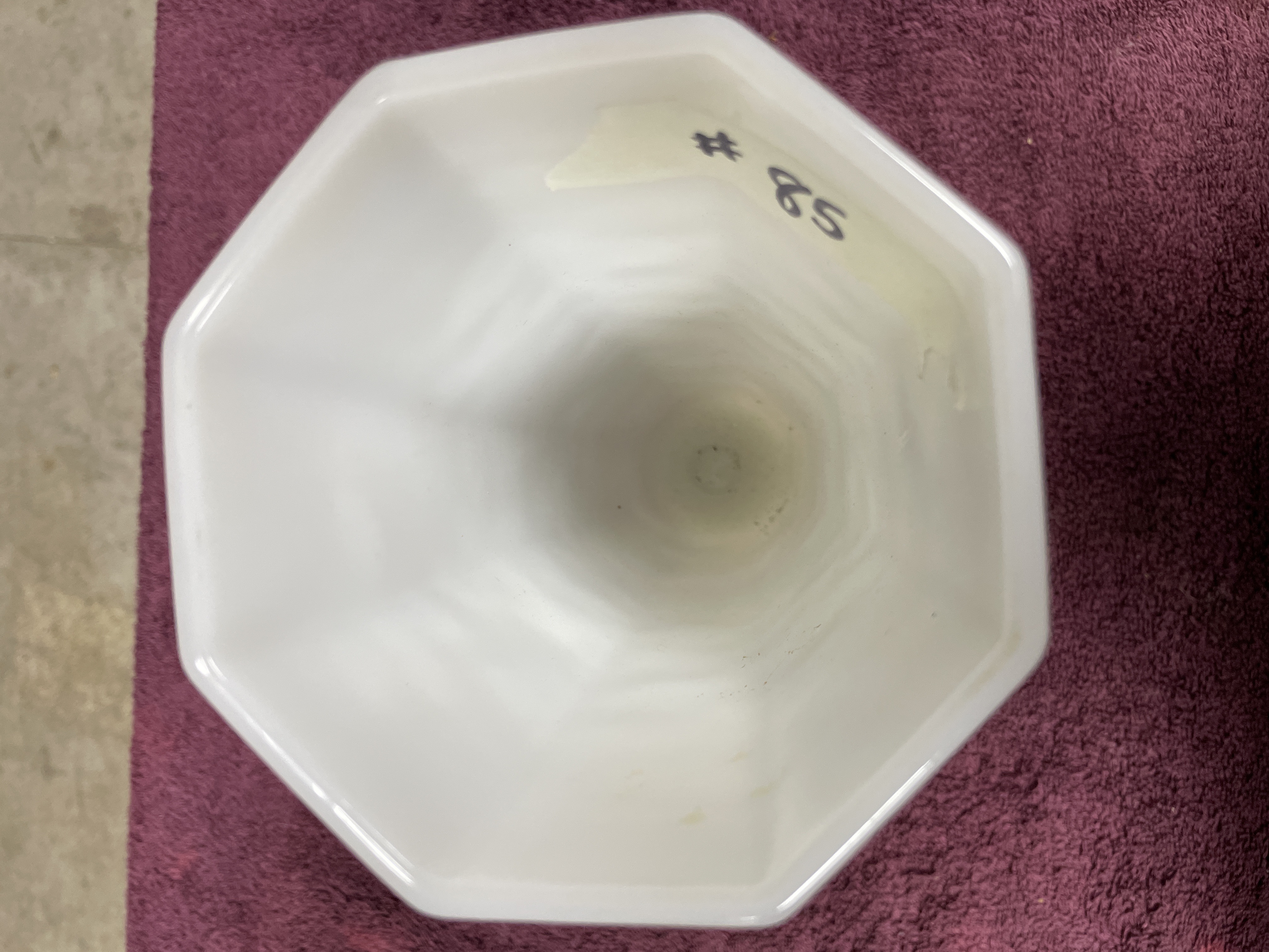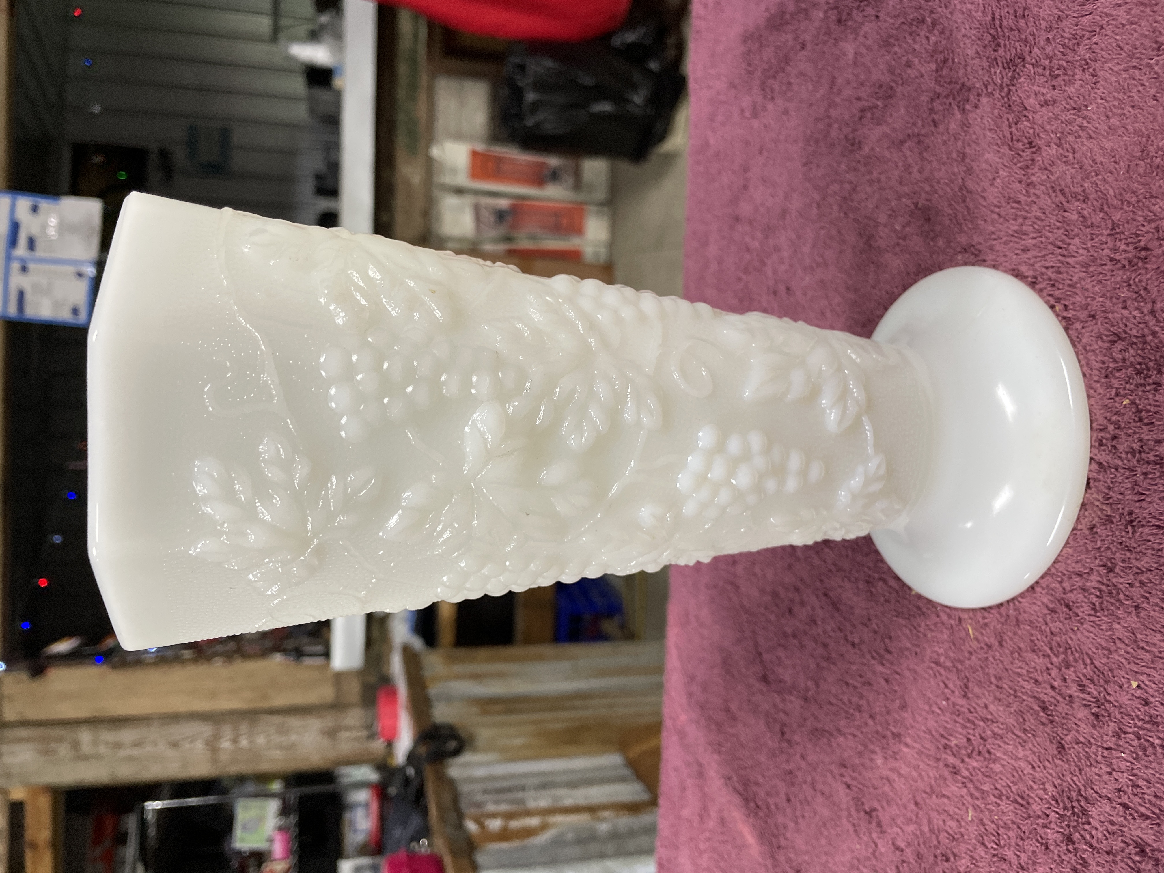 A single footed vase constructed of opaque white milk glass. The body is tall and slightly tapered, terminating in an octagonal rim and resting on a circular base. The exterior surface features a dense, high-relief molded pattern depicting grape clusters and foliage. The vase is unmarked by a manufacturer. The interior wall displays the remnant of an inventory tag marked S&S #85.
