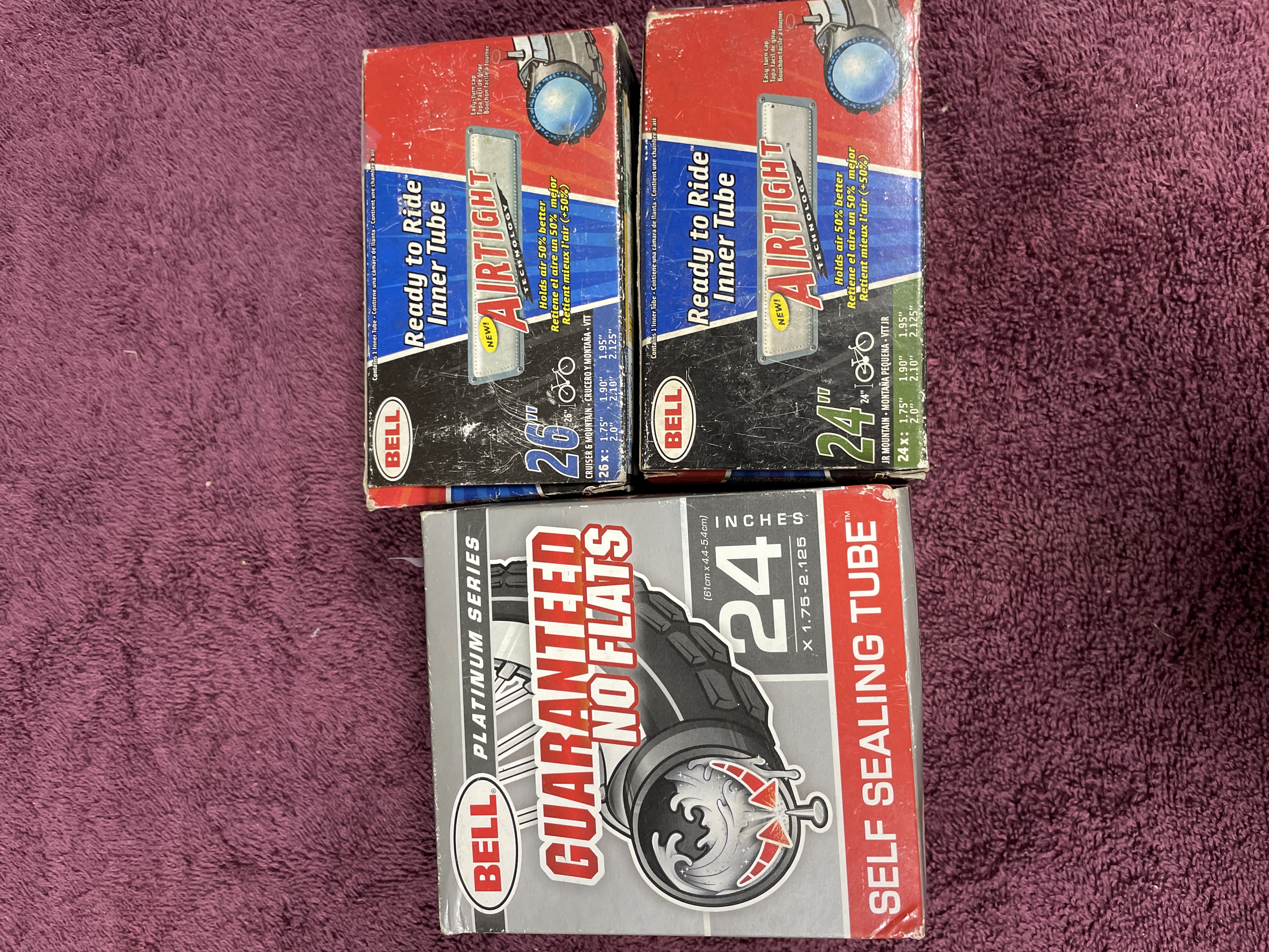 A collection of three new, sealed bicycle inner tubes manufactured by the BELL brand. The lot includes one large square box from the “Platinum Series” labeled “GUARANTEED NO FLATS SELF SEALING TUBE” for a 24-inch tire (1.75 – 2.125 wide). This tube utilizes Flat Tech Sealant designed to repair punctures up to 1/8 inch. The lot also contains two rectangular boxes from the “Ready to Ride AIRTIGHT Inner Tube” series. These two tubes are specified for a 26-inch Cruiser and Mountain application and a 24-inch JR Mountain application, respectively. The packaging features multilingual descriptive text, including English, Spanish, and French, advertising the sealant technology and claiming the tubes “Holds air 50% better.”