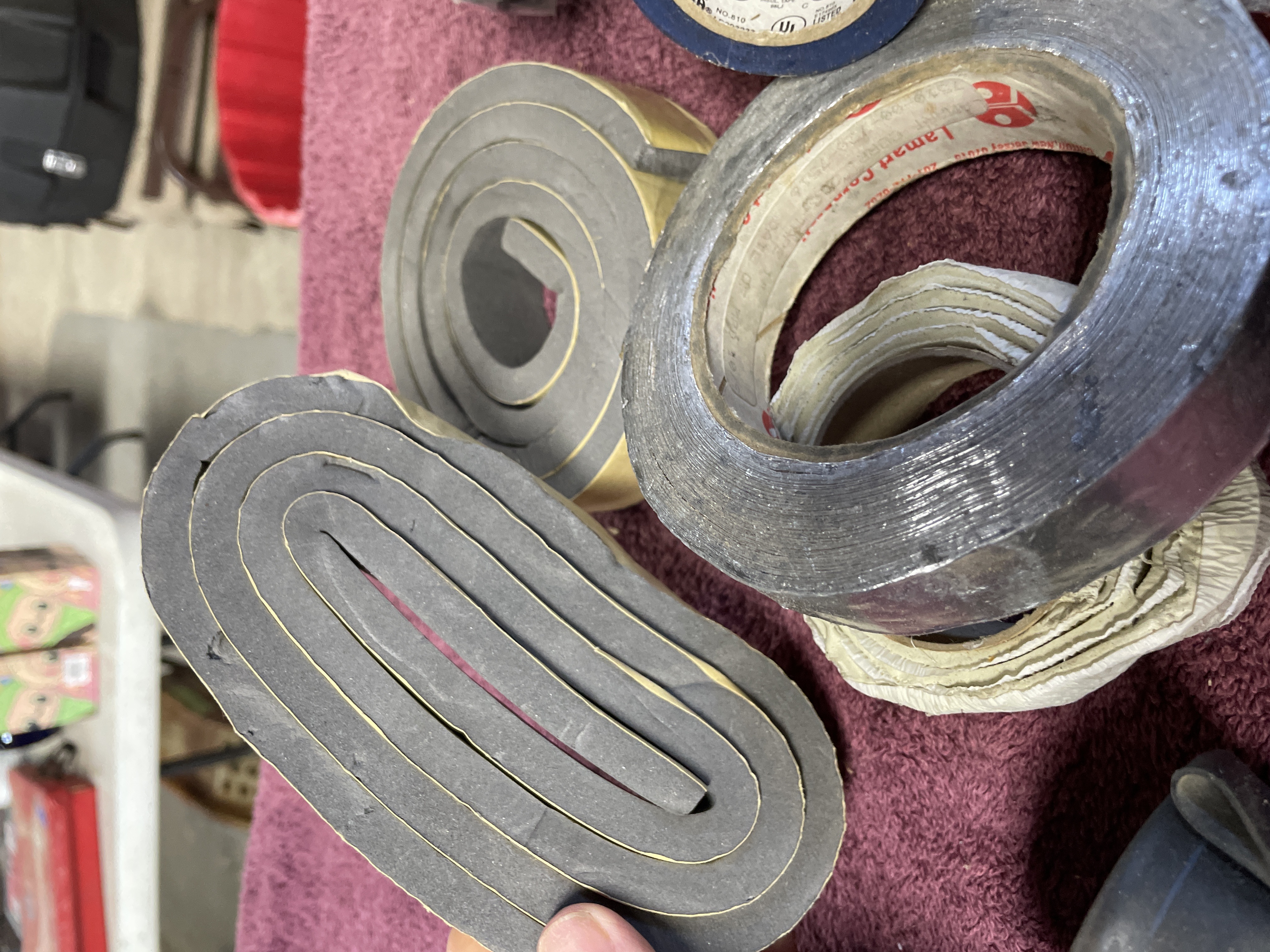 This collection comprises 12 items intended for sealing, weatherproofing, and fastening applications, featuring products from manufacturers including Scotch, 3M, and Lamart Corp. The lot includes multiple large rolls of thick gray foam weatherstripping tape with tan paper backing, consistent with polyether or sponge rubber weatherseal products. Also present are a large roll of silver aluminum foil tape (duct tape), a roll of blue vinyl electrical tape, a large roll of heavy black mastic or butyl tape wrapped in clear plastic, a roll of black double-sided foam tape with a red edge, and a loose strip of black rubber material. One item, a package of Scotch indoor hook-and-loop fasteners, is sealed in its original retail packaging, labeled in English, Spanish, and French. Visible branding includes 3M on the electrical tape core and the fastener package, and Lamart Corp on the core of the foil tape. The collection represents various widths and thicknesses typical of industrial tapes and seals, with several items matching market descriptions of 3/4 inch wide materials.