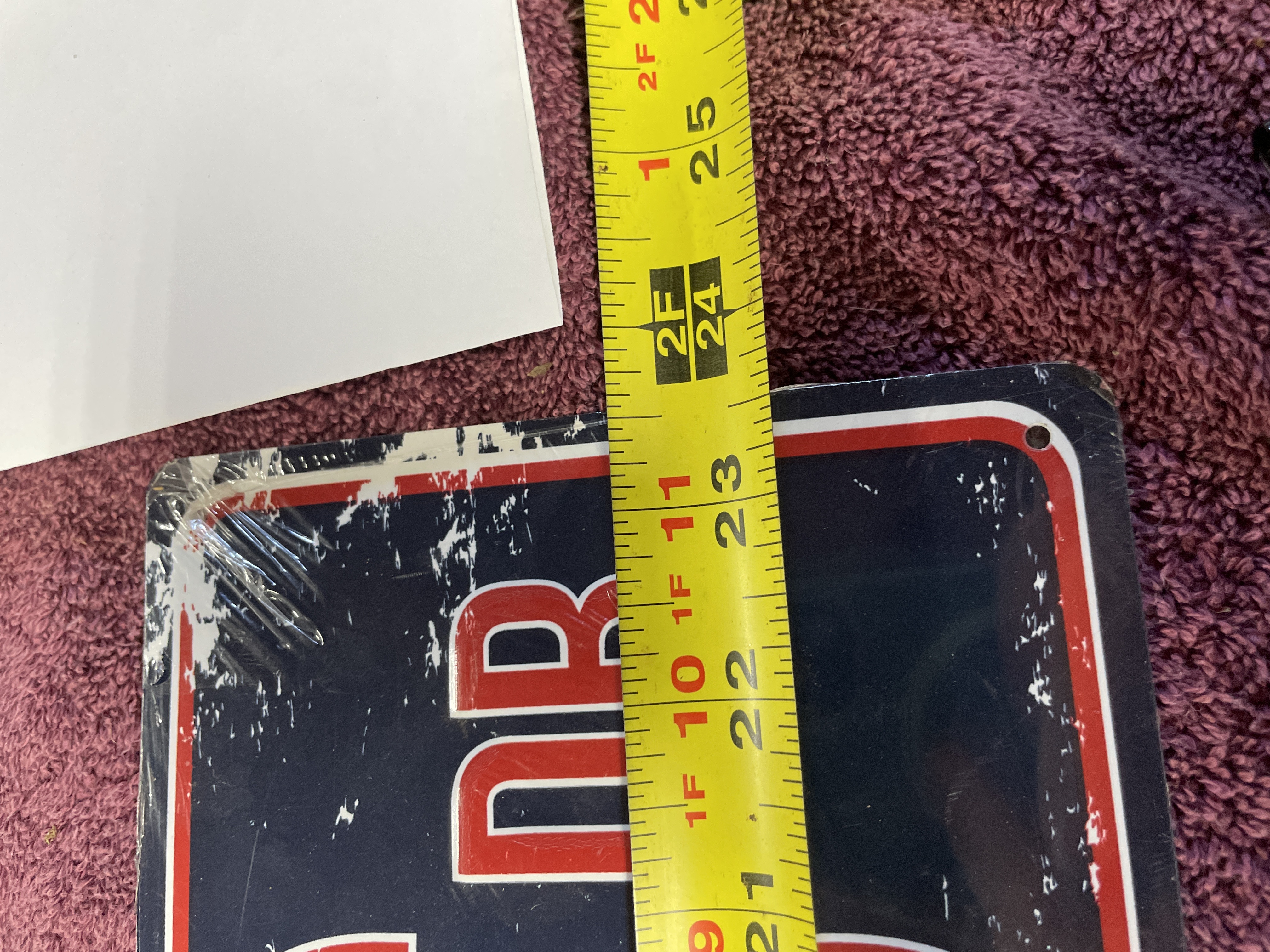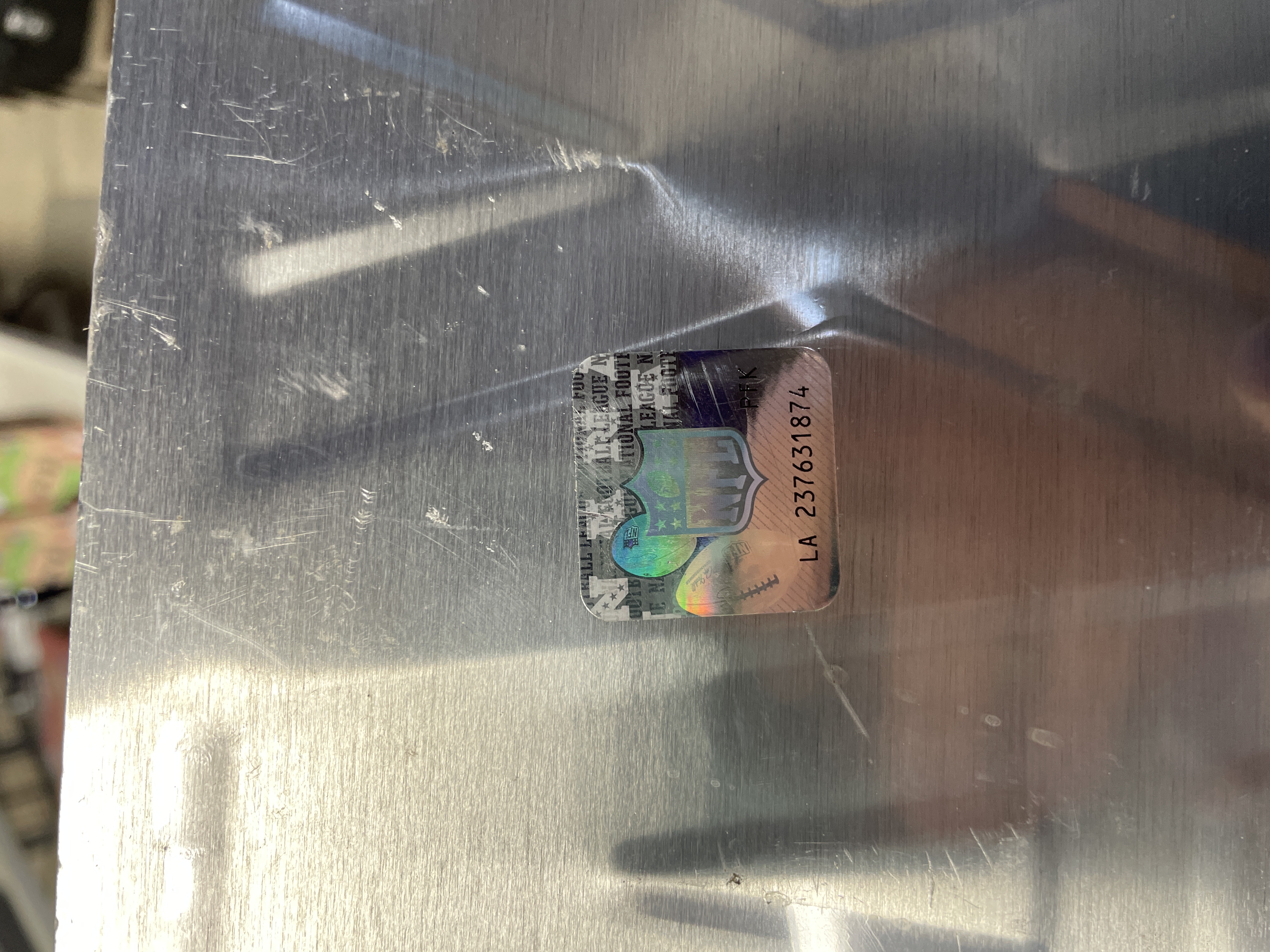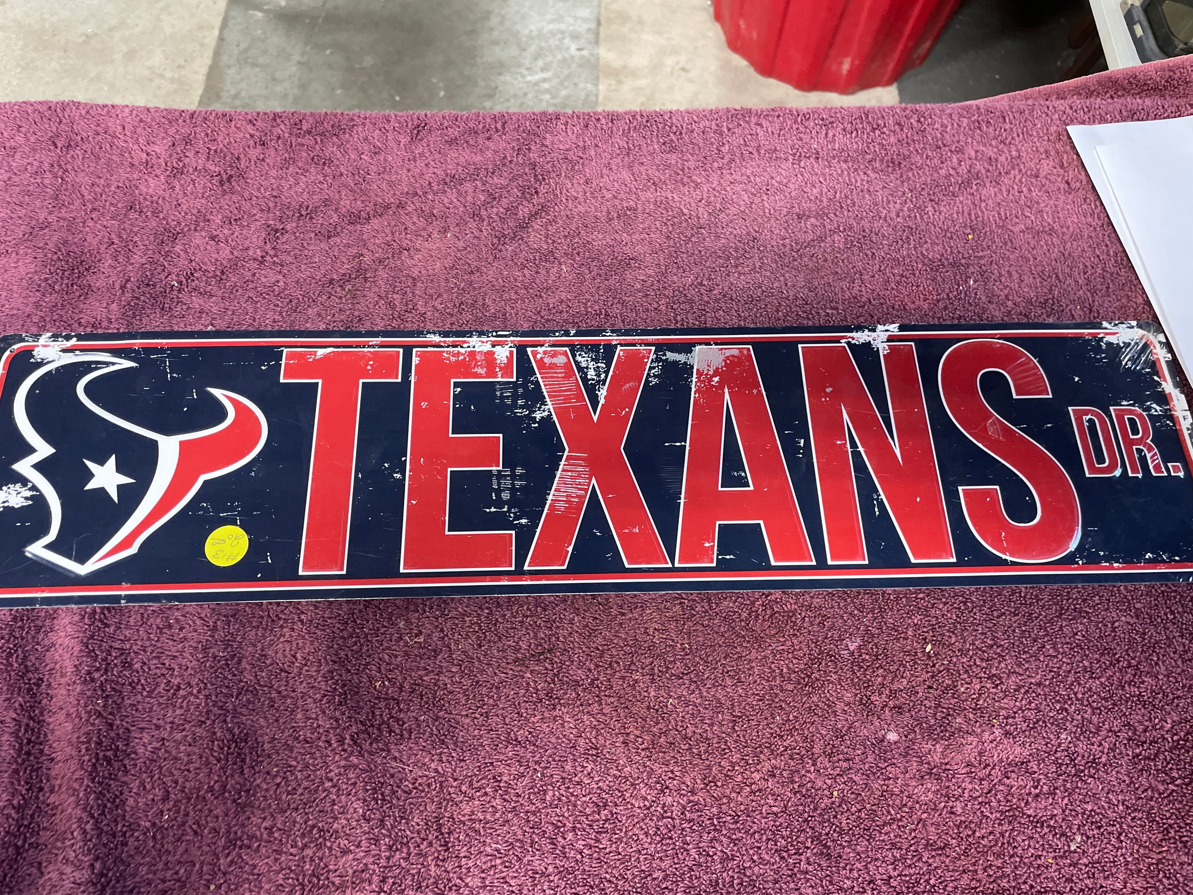 A single officially licensed National Football League (NFL) novelty sign dedicated to the Houston Texans team. The elongated sign is constructed of painted metal, likely aluminum, and is designed to mimic a street sign. The design features the Houston Texans logo at the top above large, vertically oriented red text reading TEXANS, with smaller white text reading DR. below, all set against a dark blue background. The reverse side features the embossed relief of the lettering and carries a holographic NFL authentication sticker with the serial number LA 237631874. The sign includes pre-drilled mounting holes at the corners.