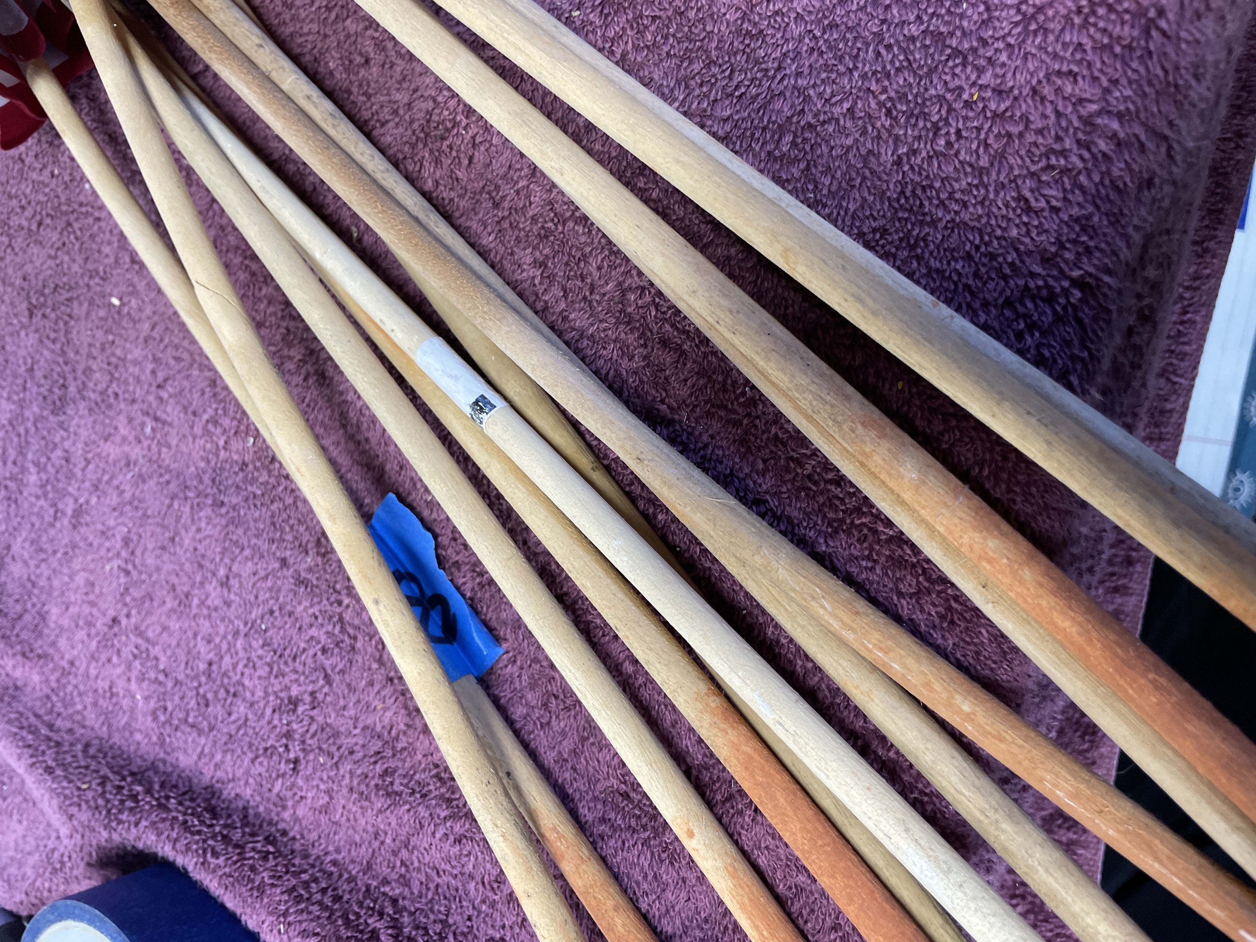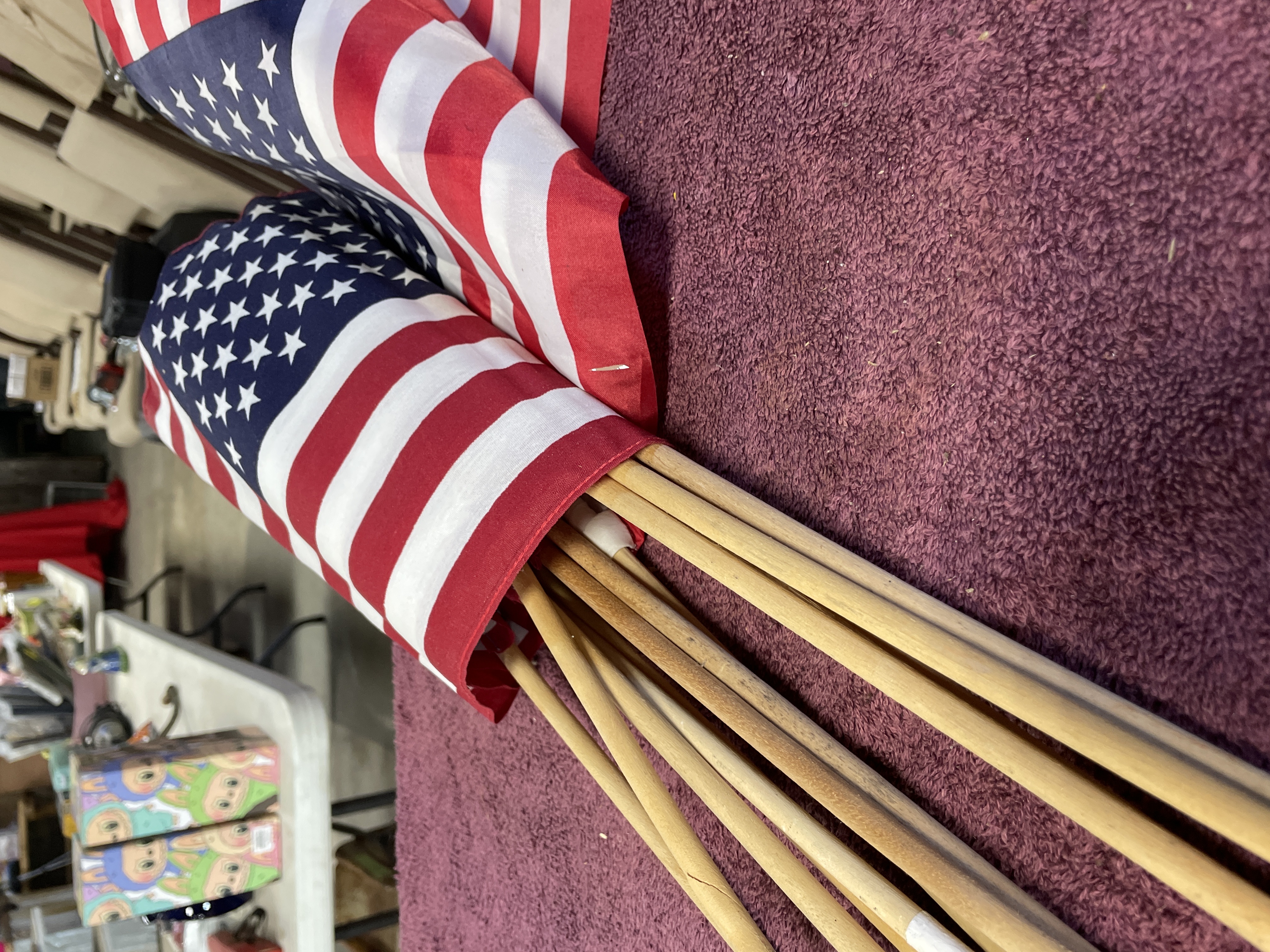 A collection of thirteen handheld American stick flags featuring the standard 50-star design. Each flag is constructed from a synthetic textile fabric attached to a finished natural wood dowel pole. Based on common commercial listings for similar items, the flags are likely sized approximately 4 x 6 inches. The flags are secured to the dowels, which are visible in a bundle.