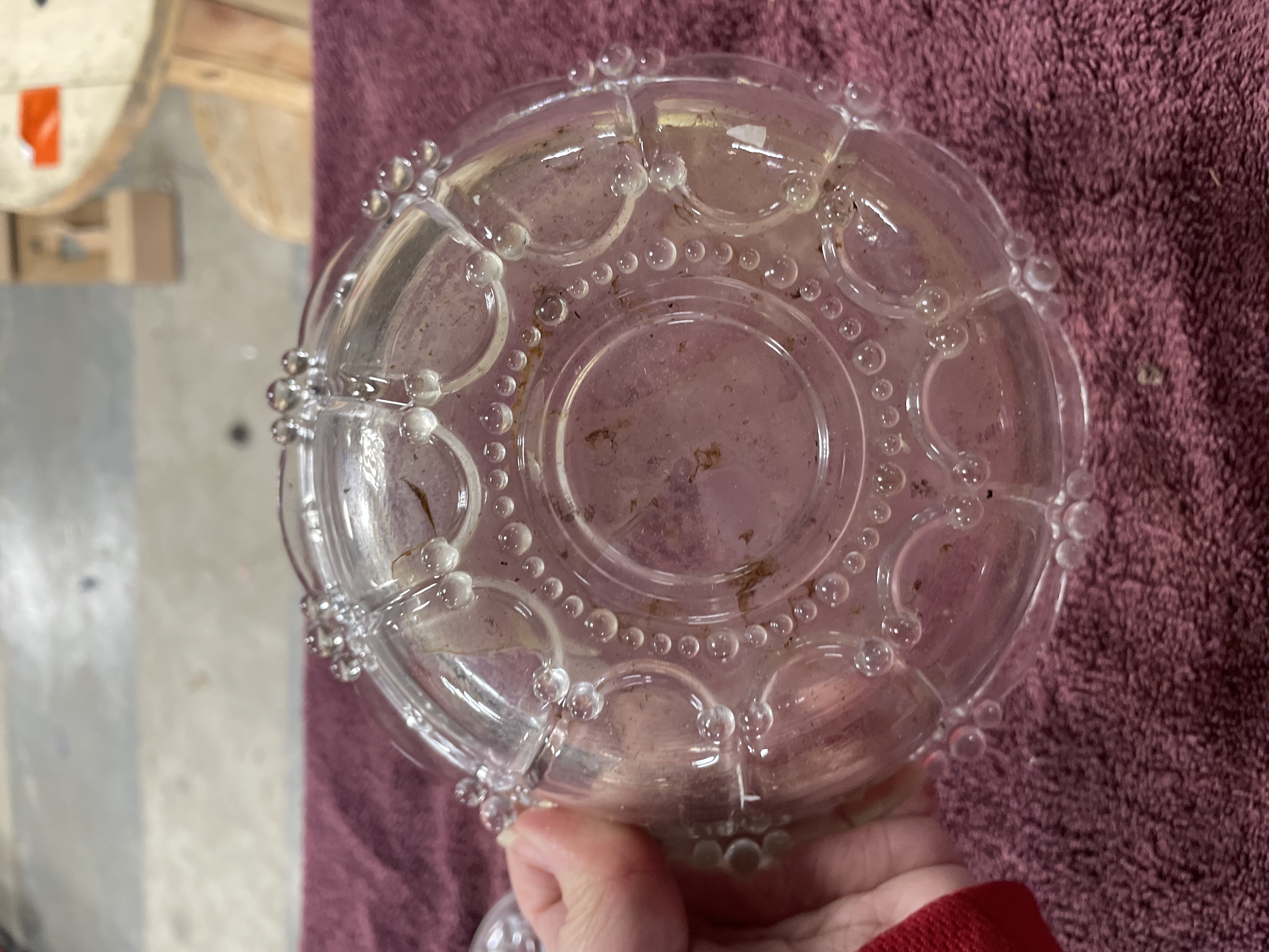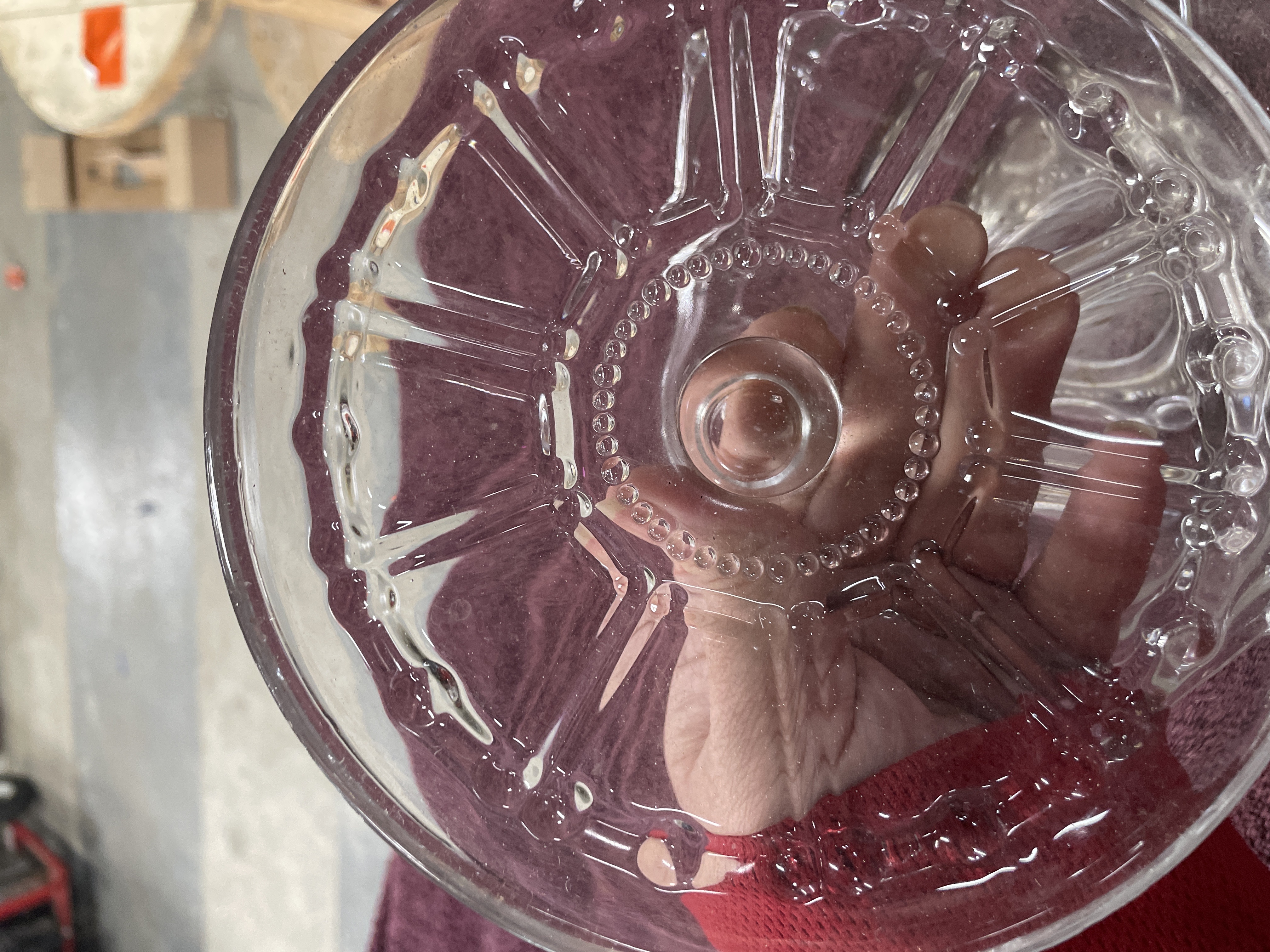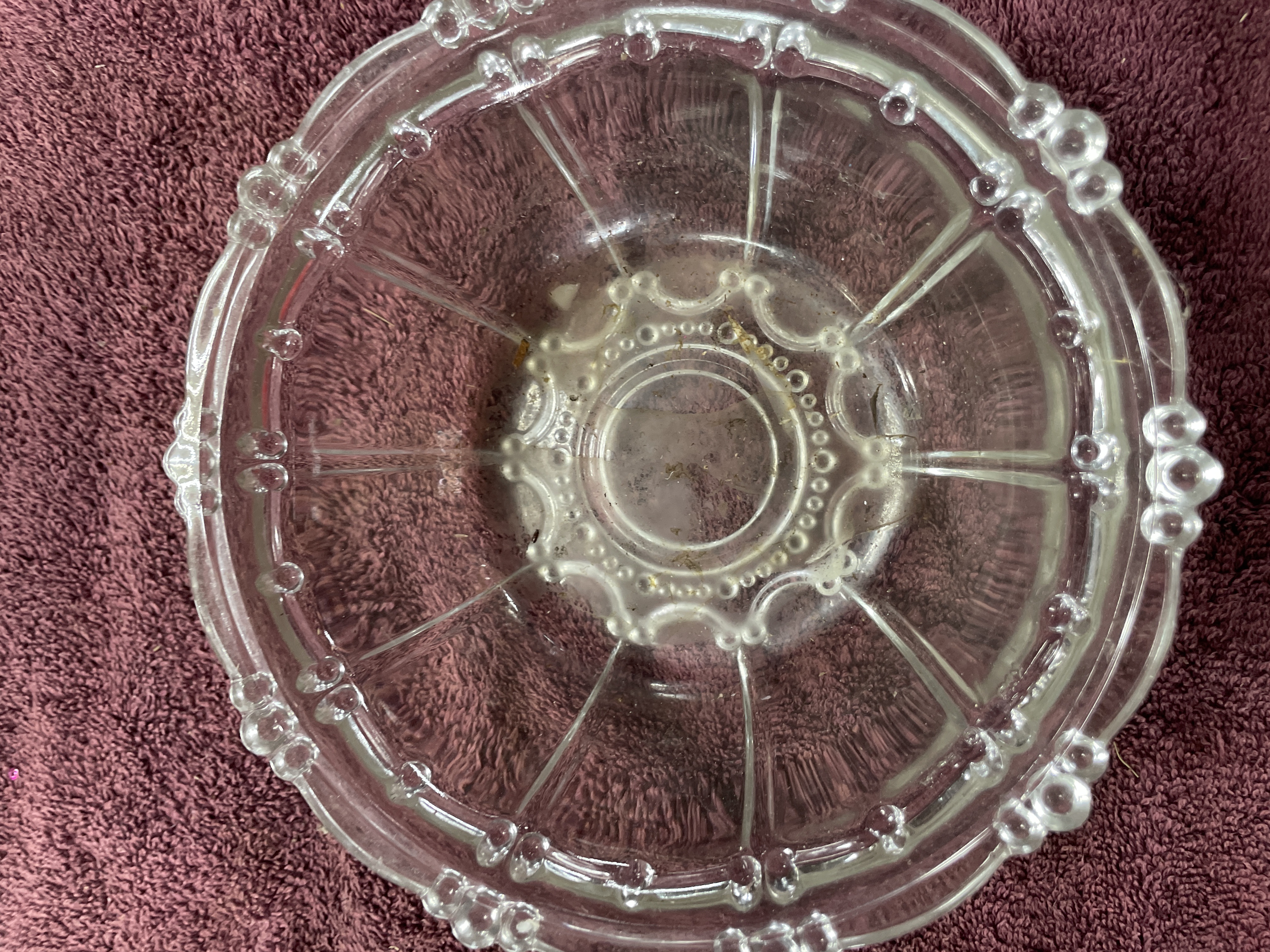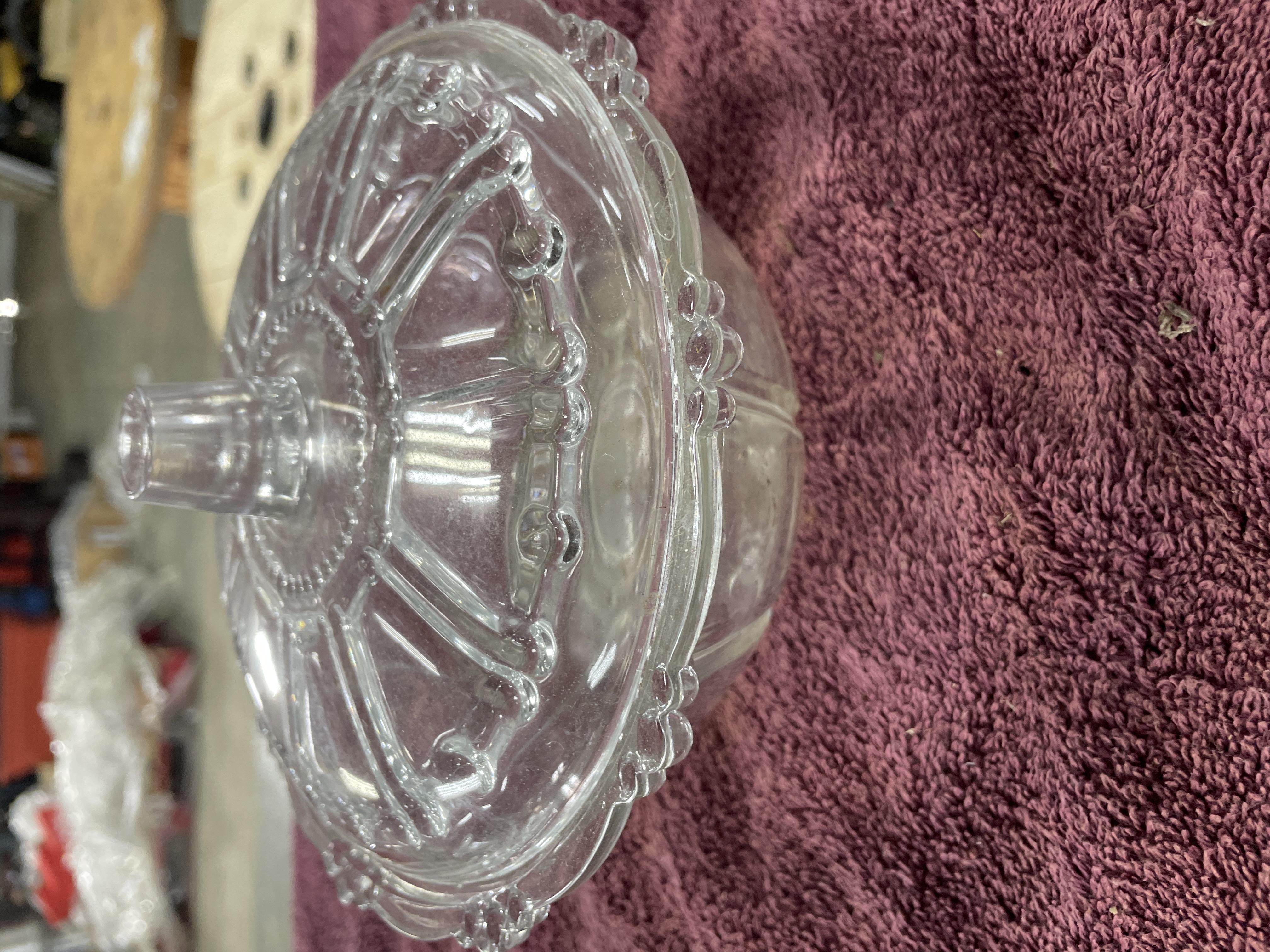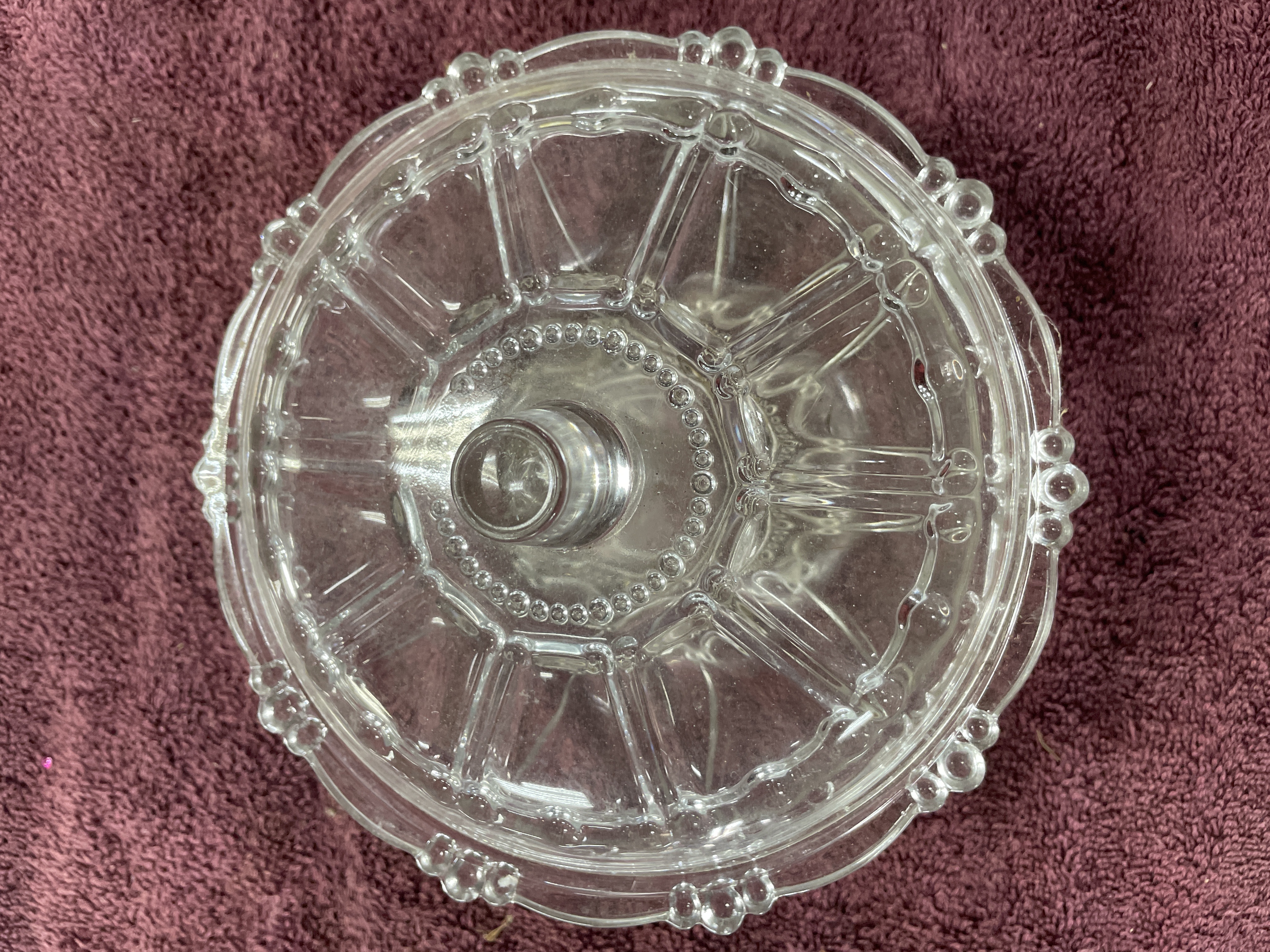 A clear pressed glass lidded bowl featuring a radiating paneled design with decorative beaded accents on both the lid and base.