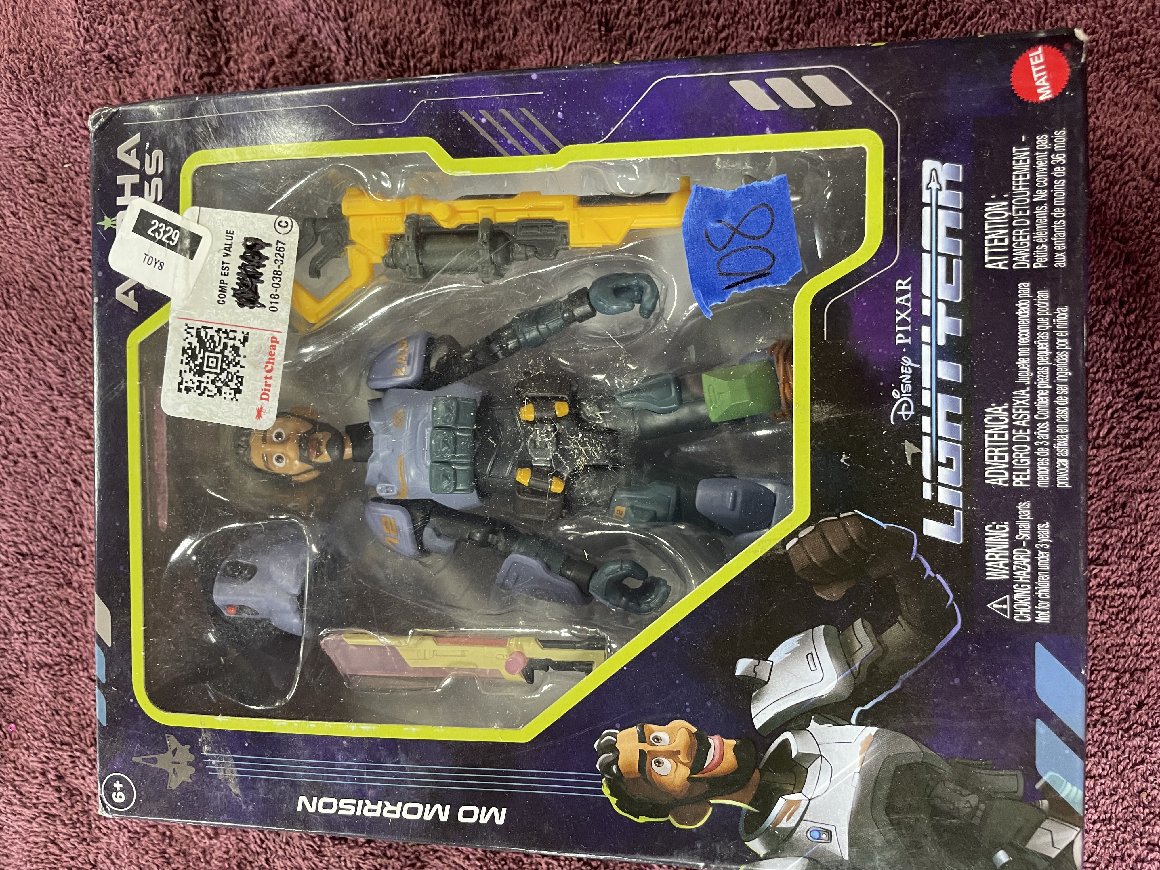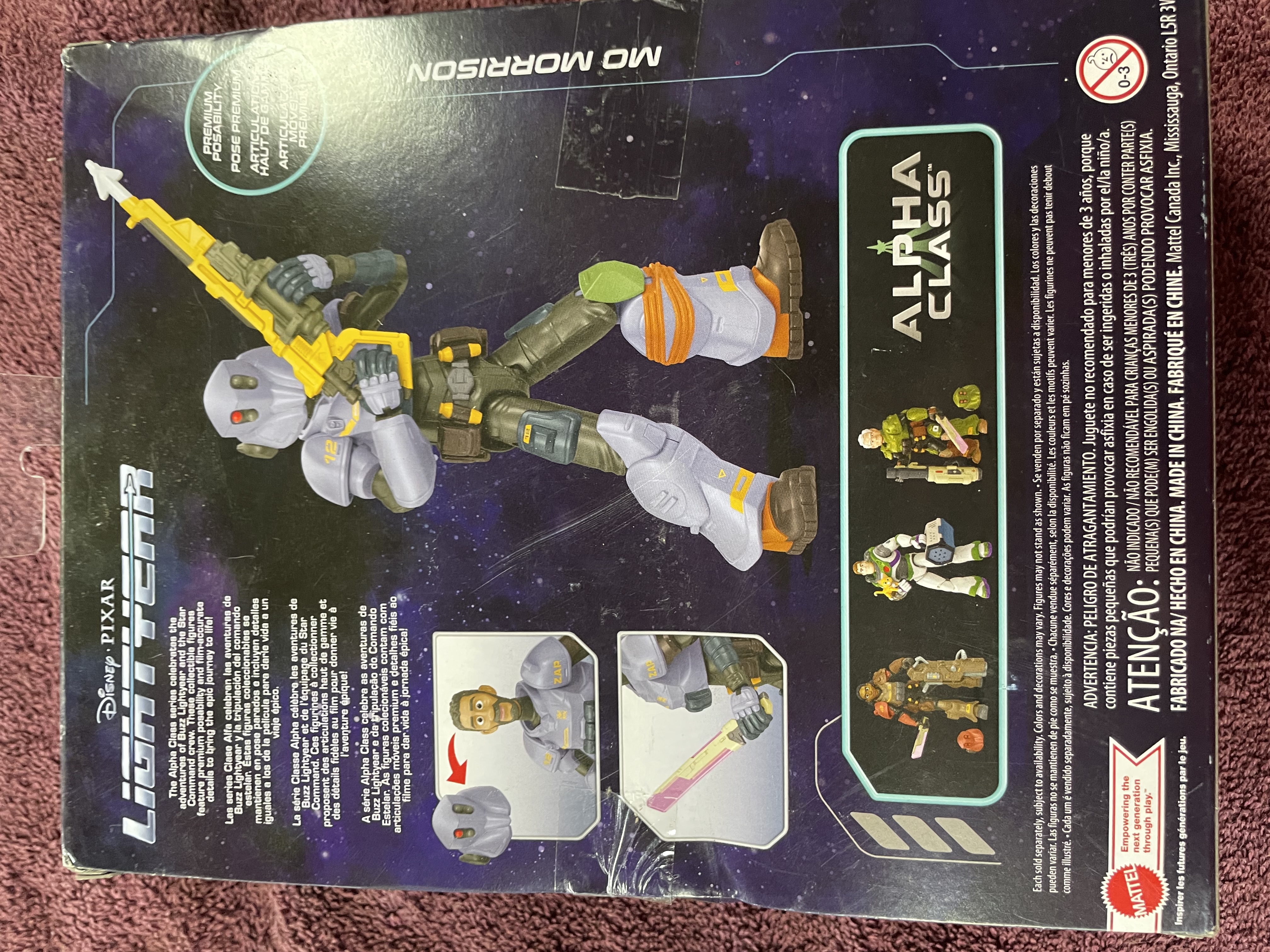 A Mattel Disney Pixar Lightyear Alpha Class Mo Morrison action figure in original packaging with yellow and pink accessories.