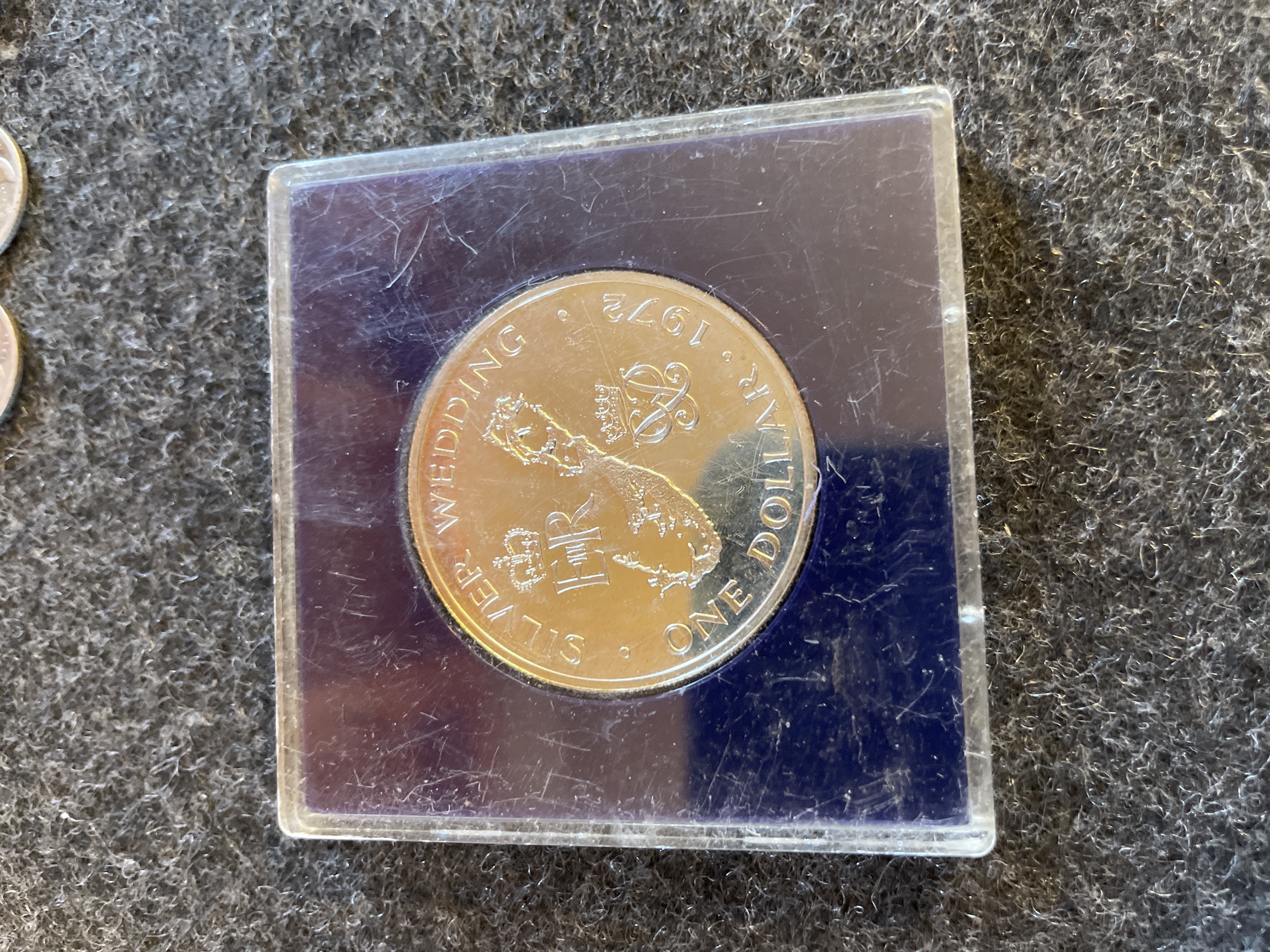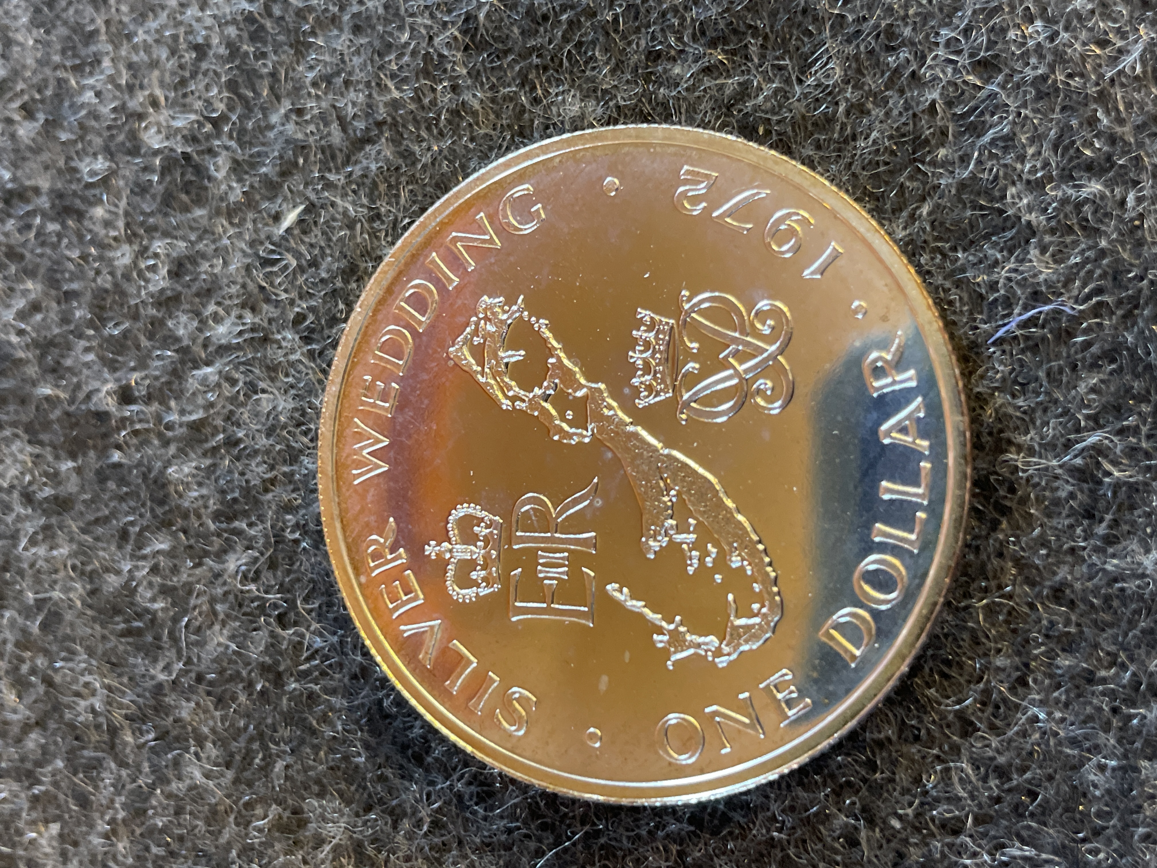 A 925 1972 Bermuda commemorative one dollar coin marking the royal silver wedding anniversary of Elizabeth II, housed in a blue display case.