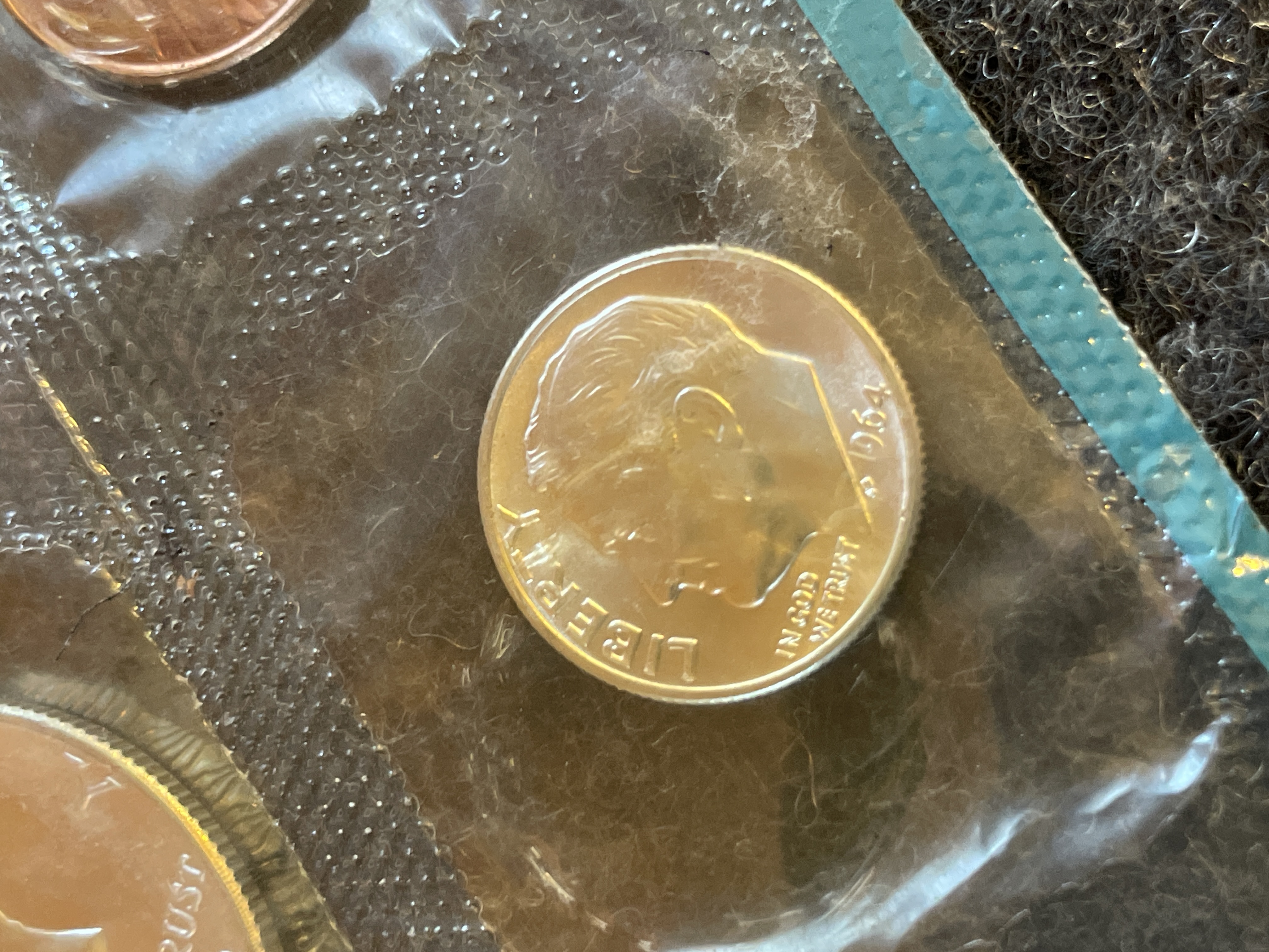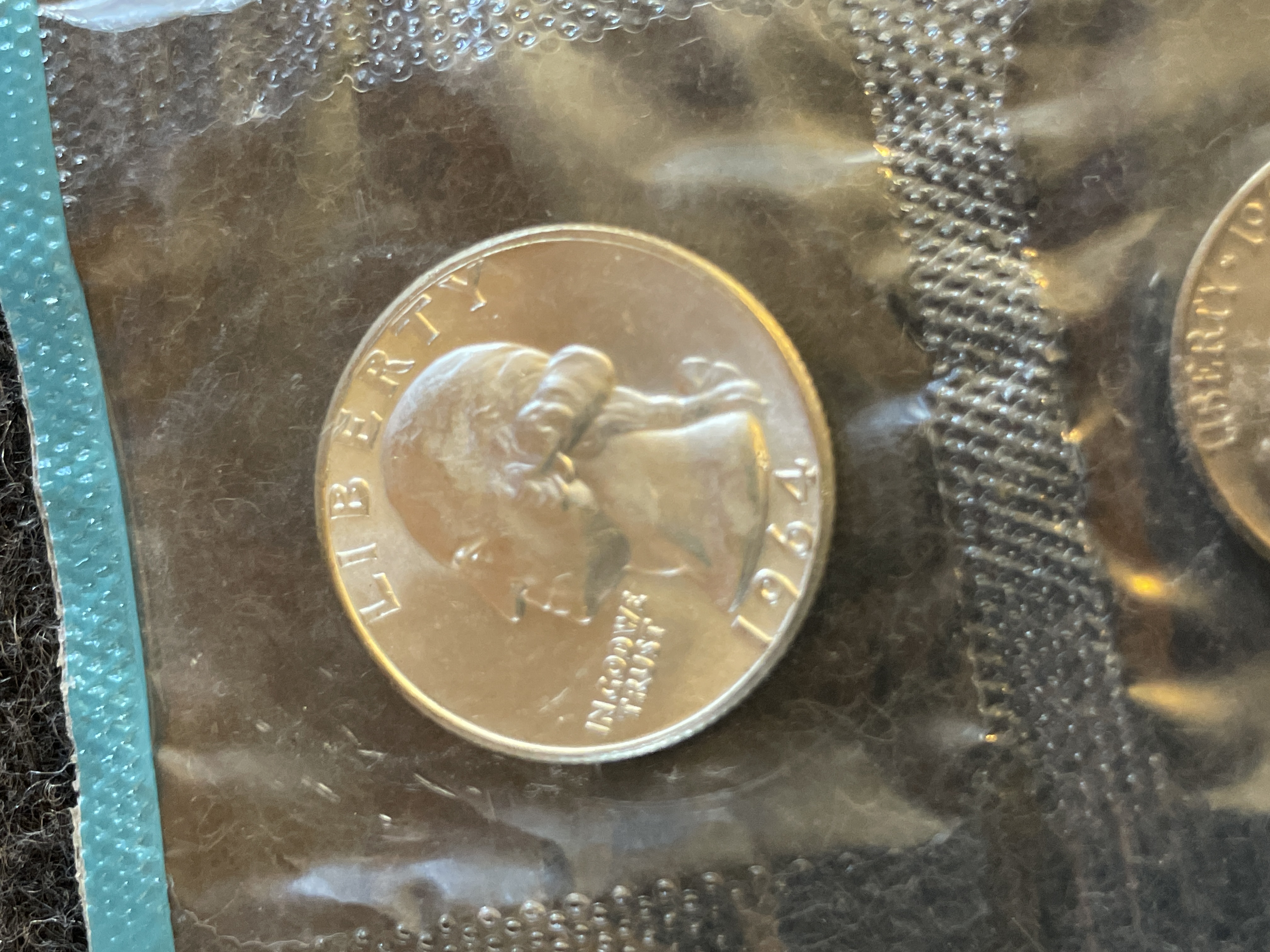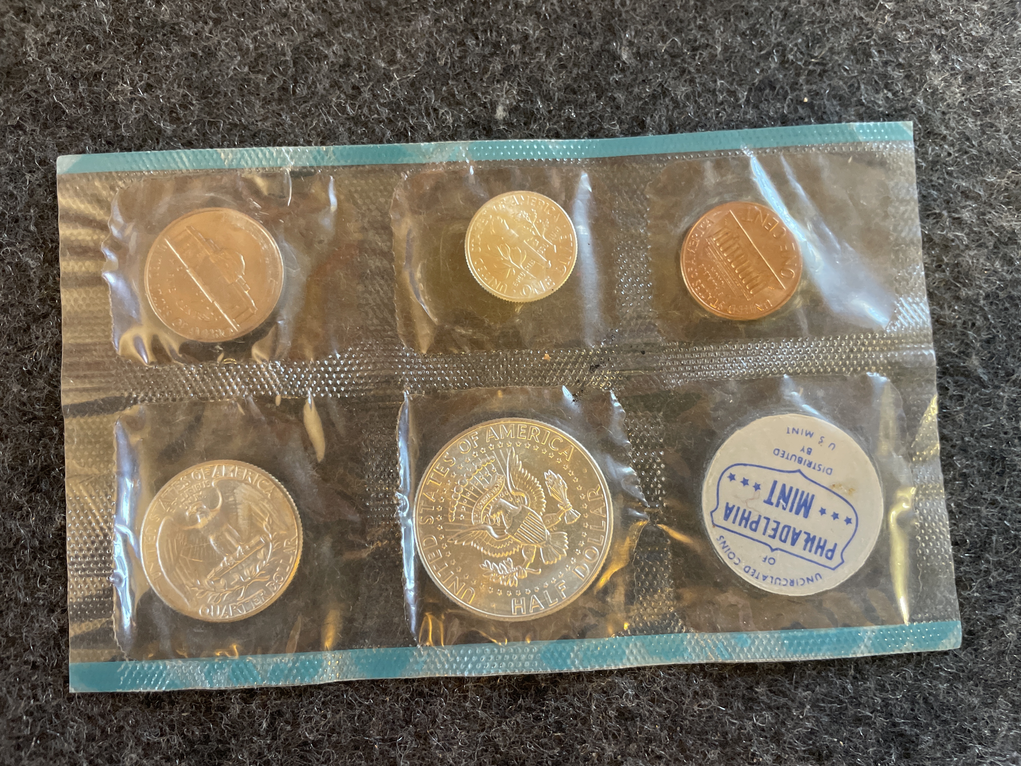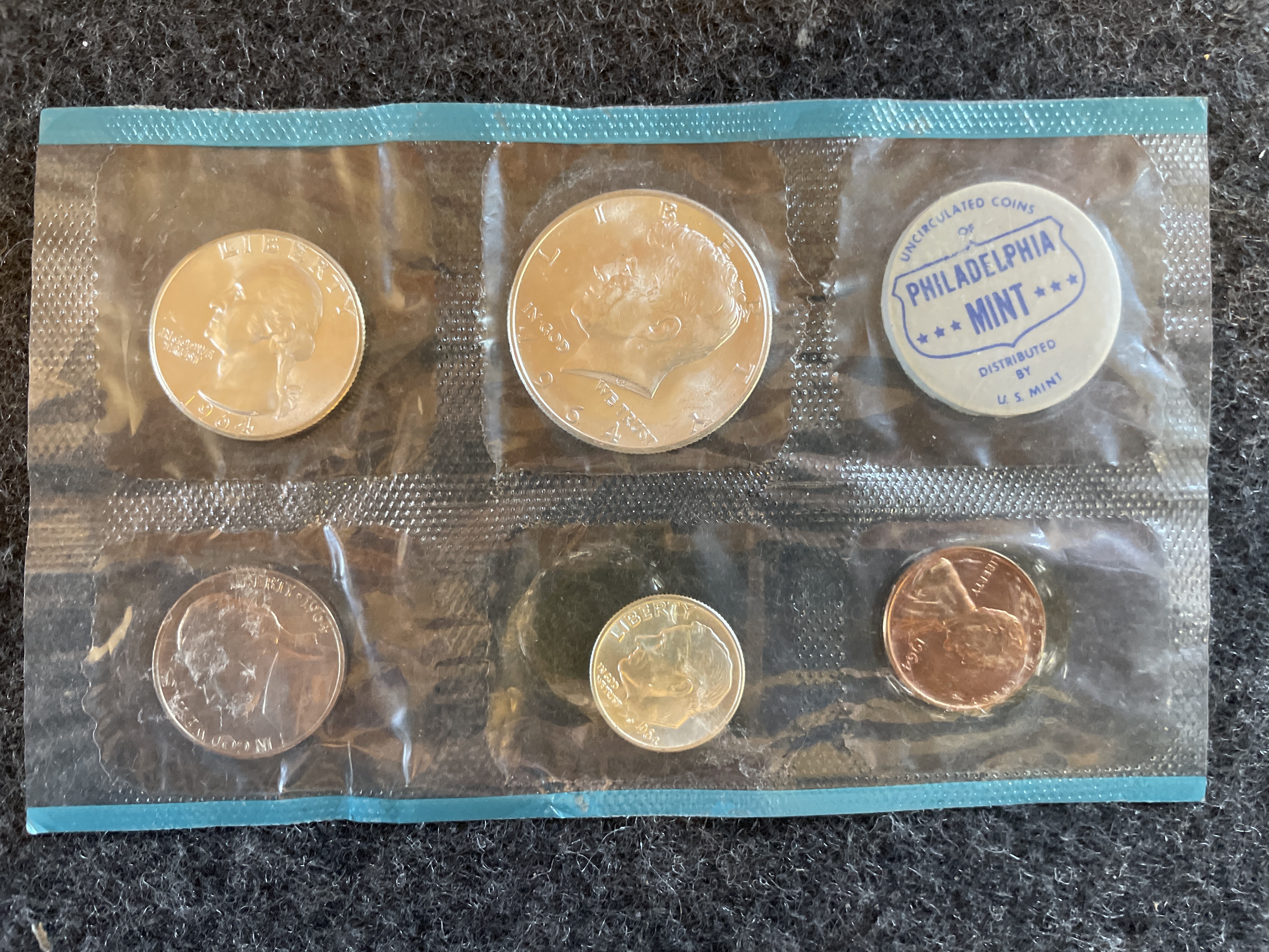 A collection of uncirculated 1964 silver-colored and copper-colored United States coins sealed in a plastic packet with a white Philadelphia Mint token.