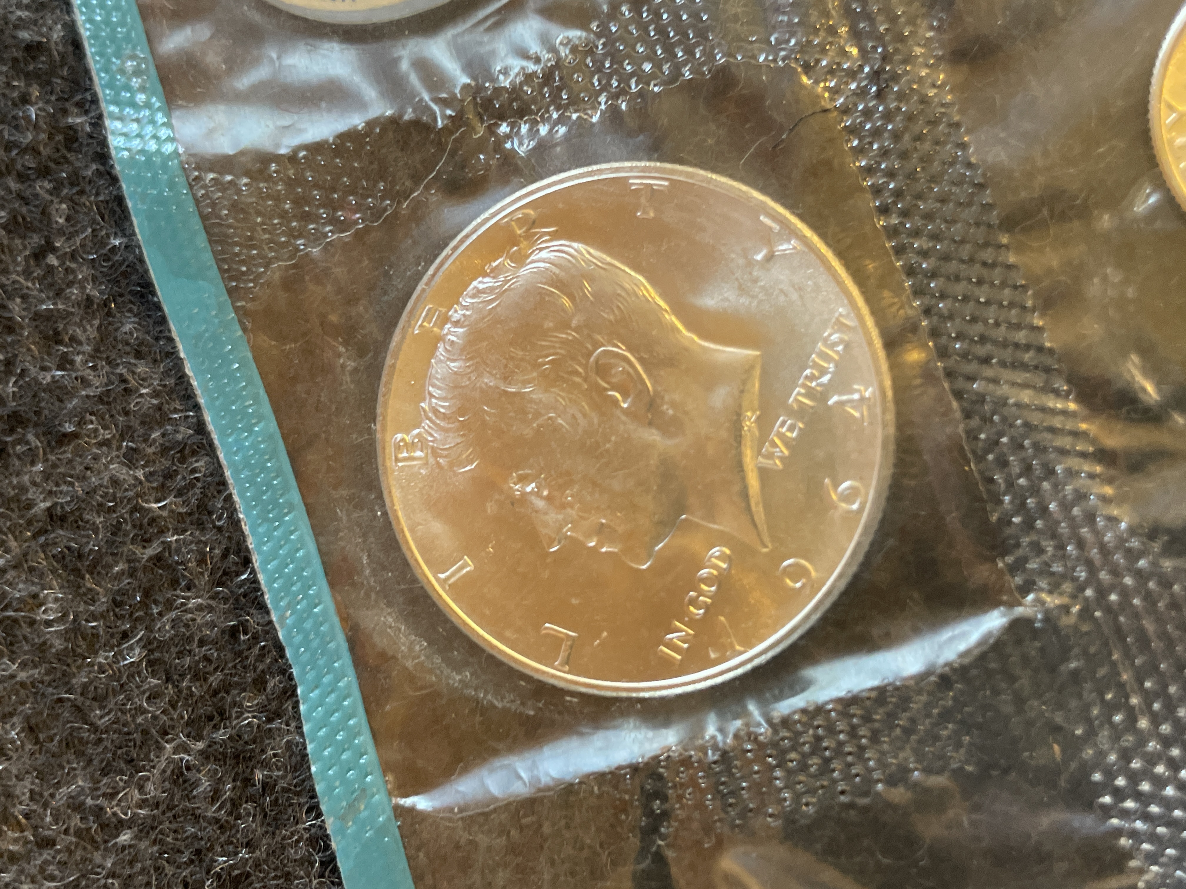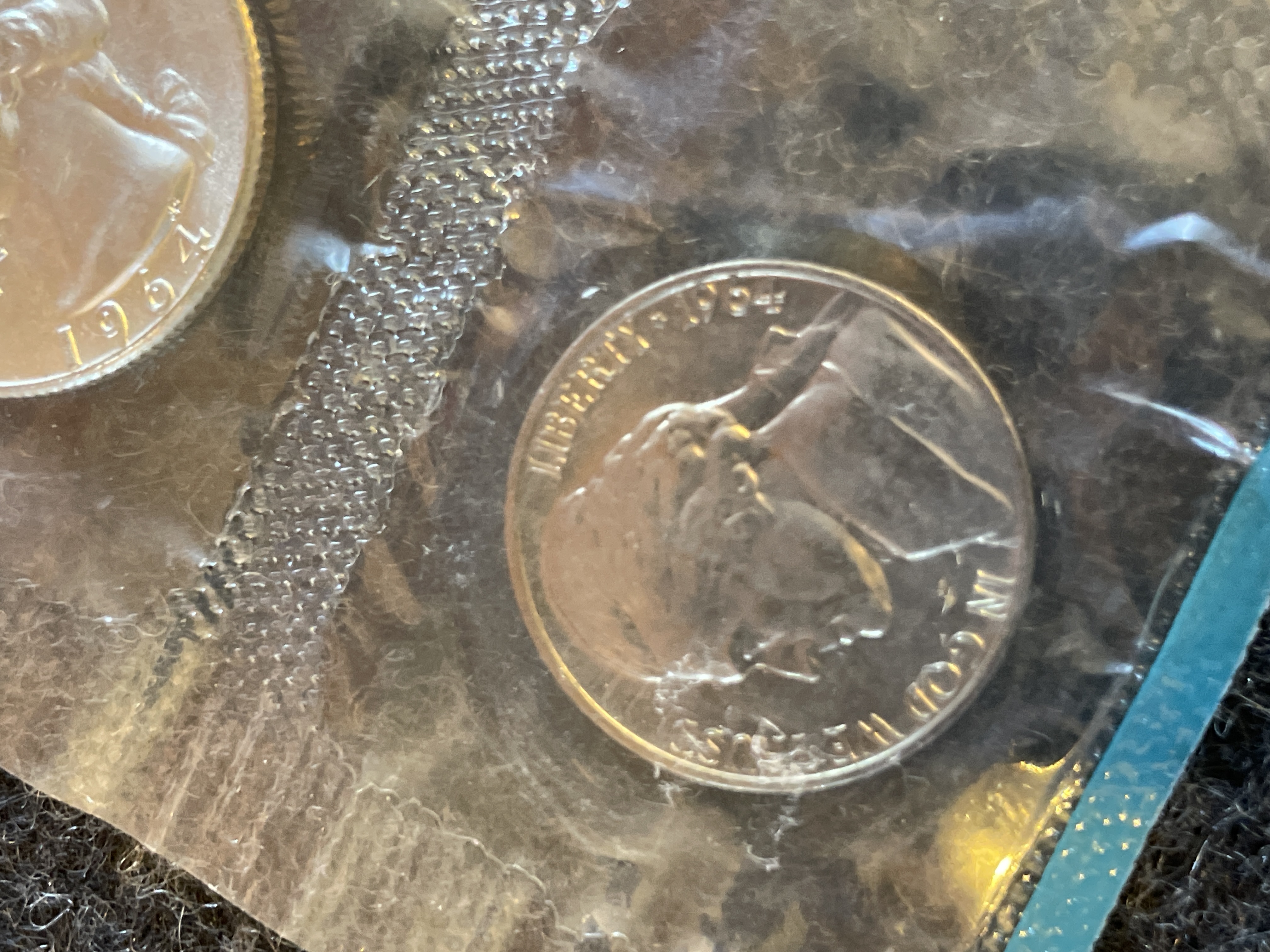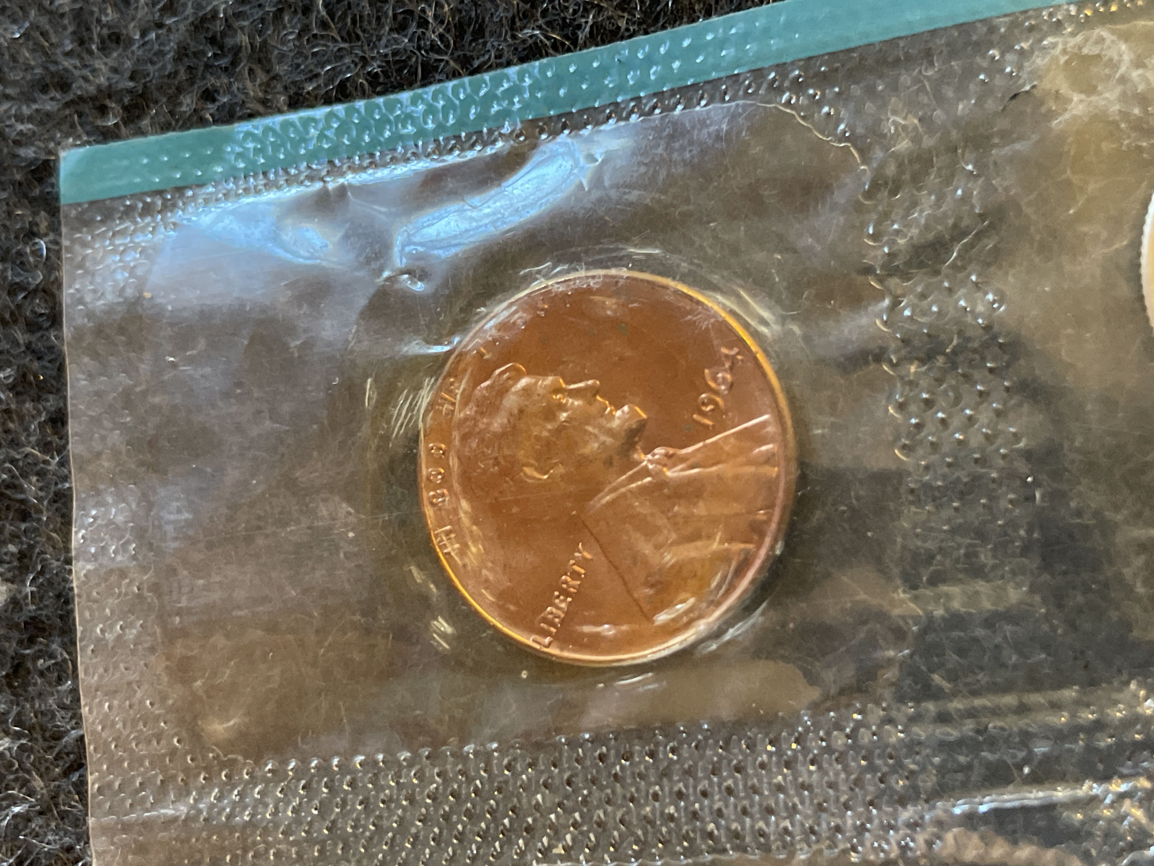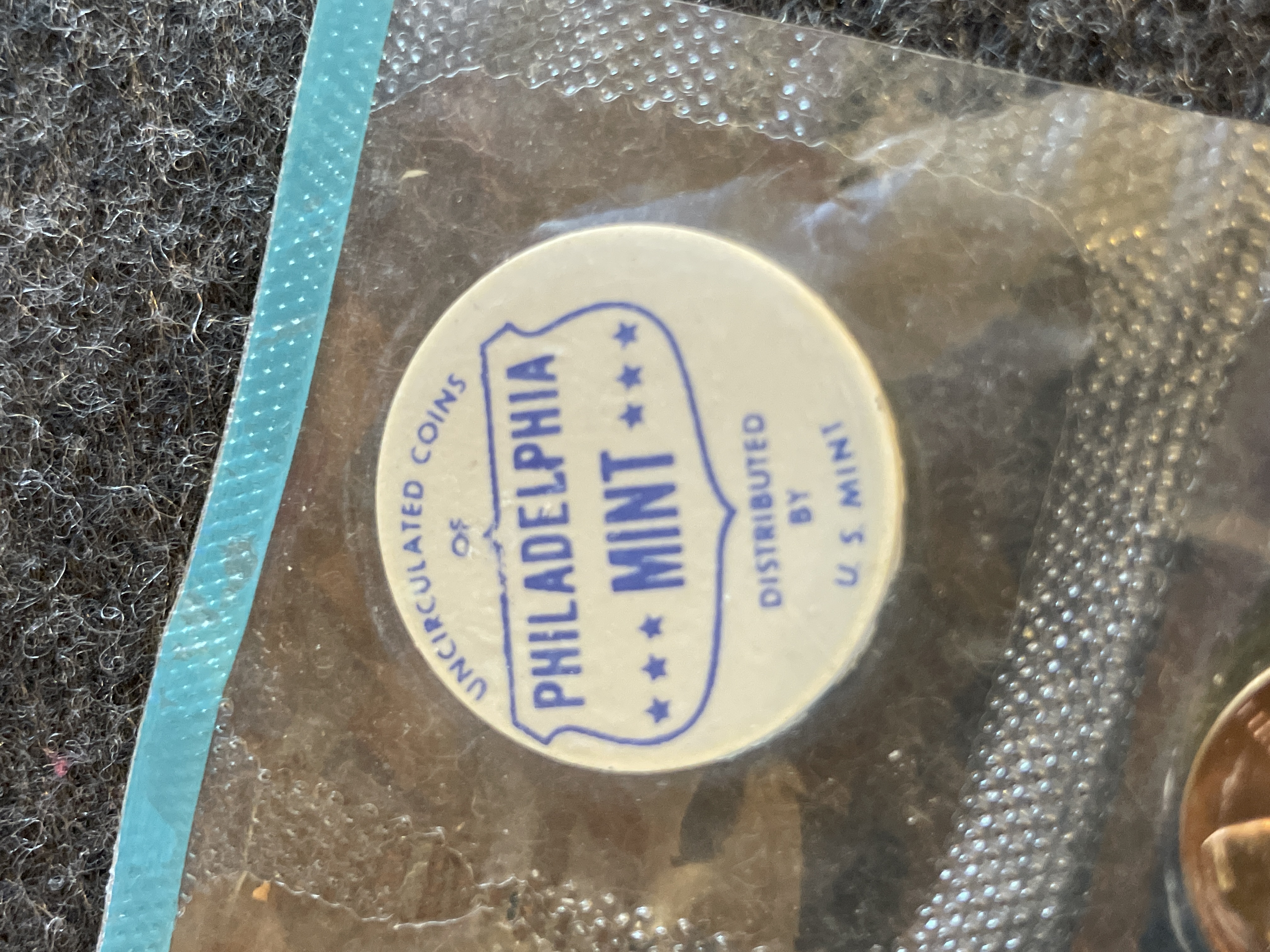 A collection of uncirculated 1964 silver-colored and copper-colored United States coins sealed in a plastic packet with a white Philadelphia Mint token.