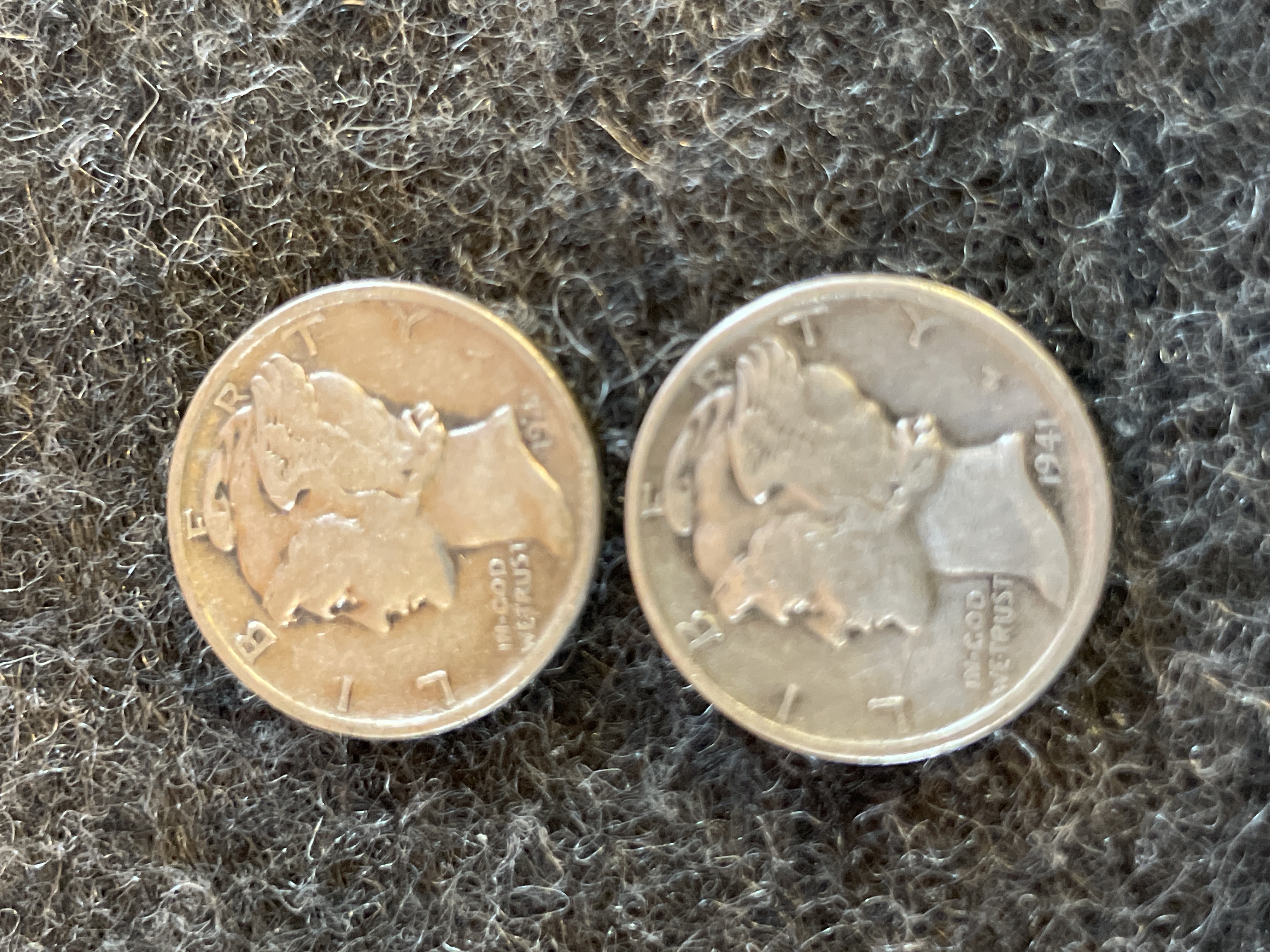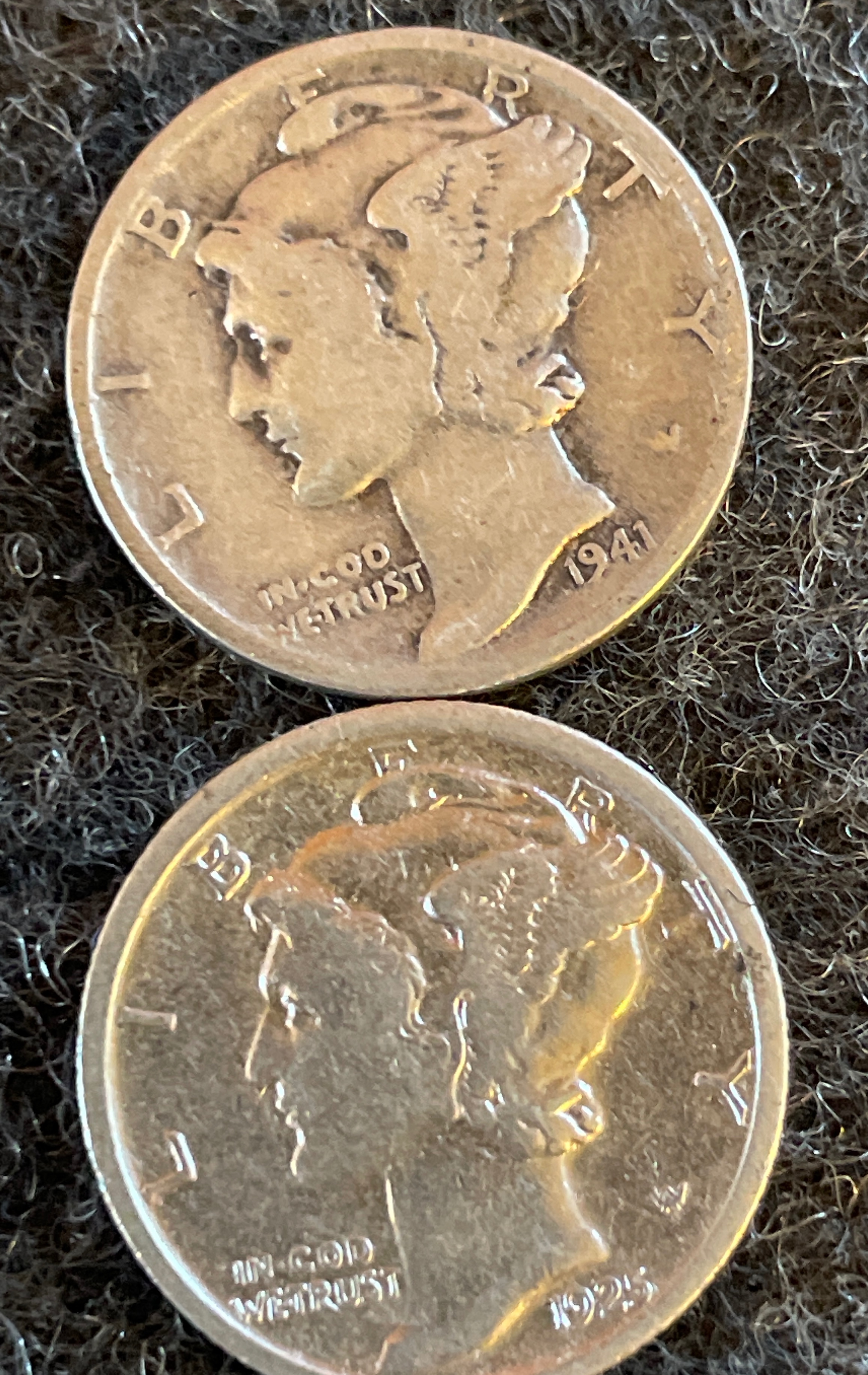 A collection of silver-colored United States Mercury dimes featuring various dates including 1925, 1926, 1929, 1941, 1944, and 1945.