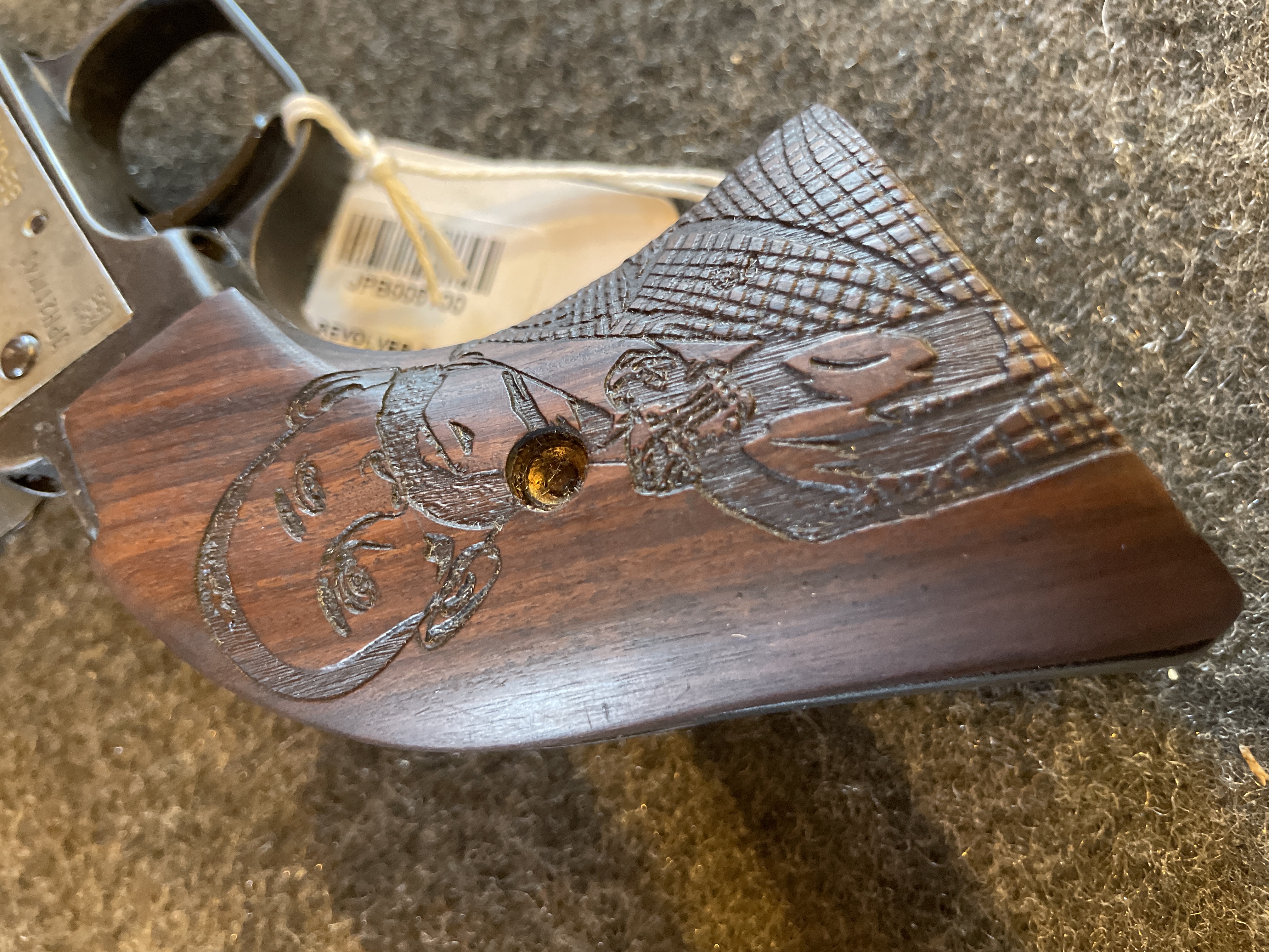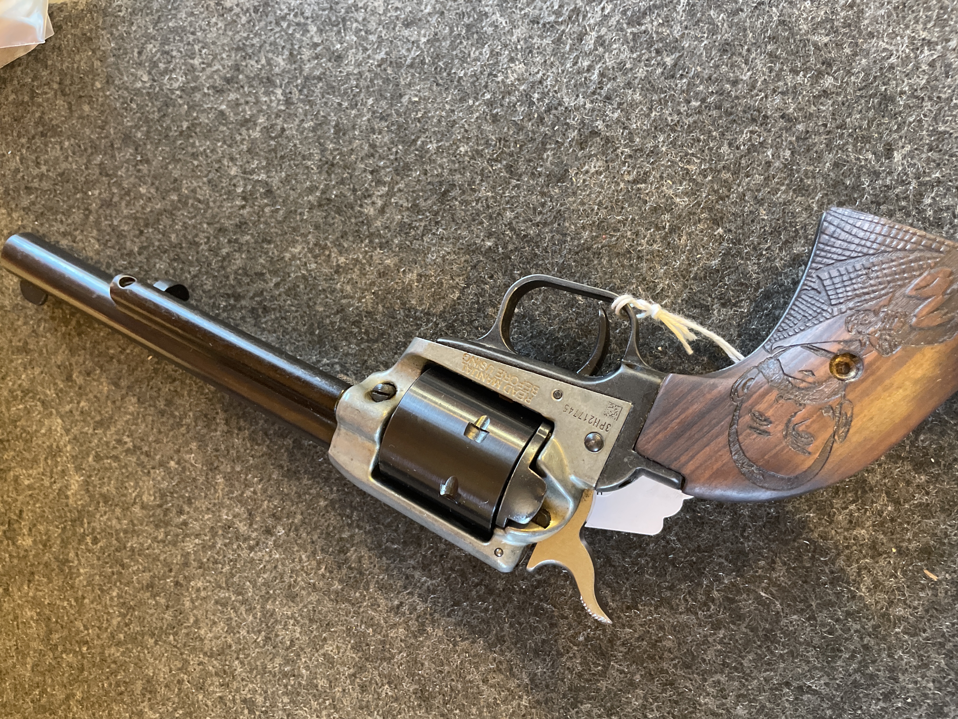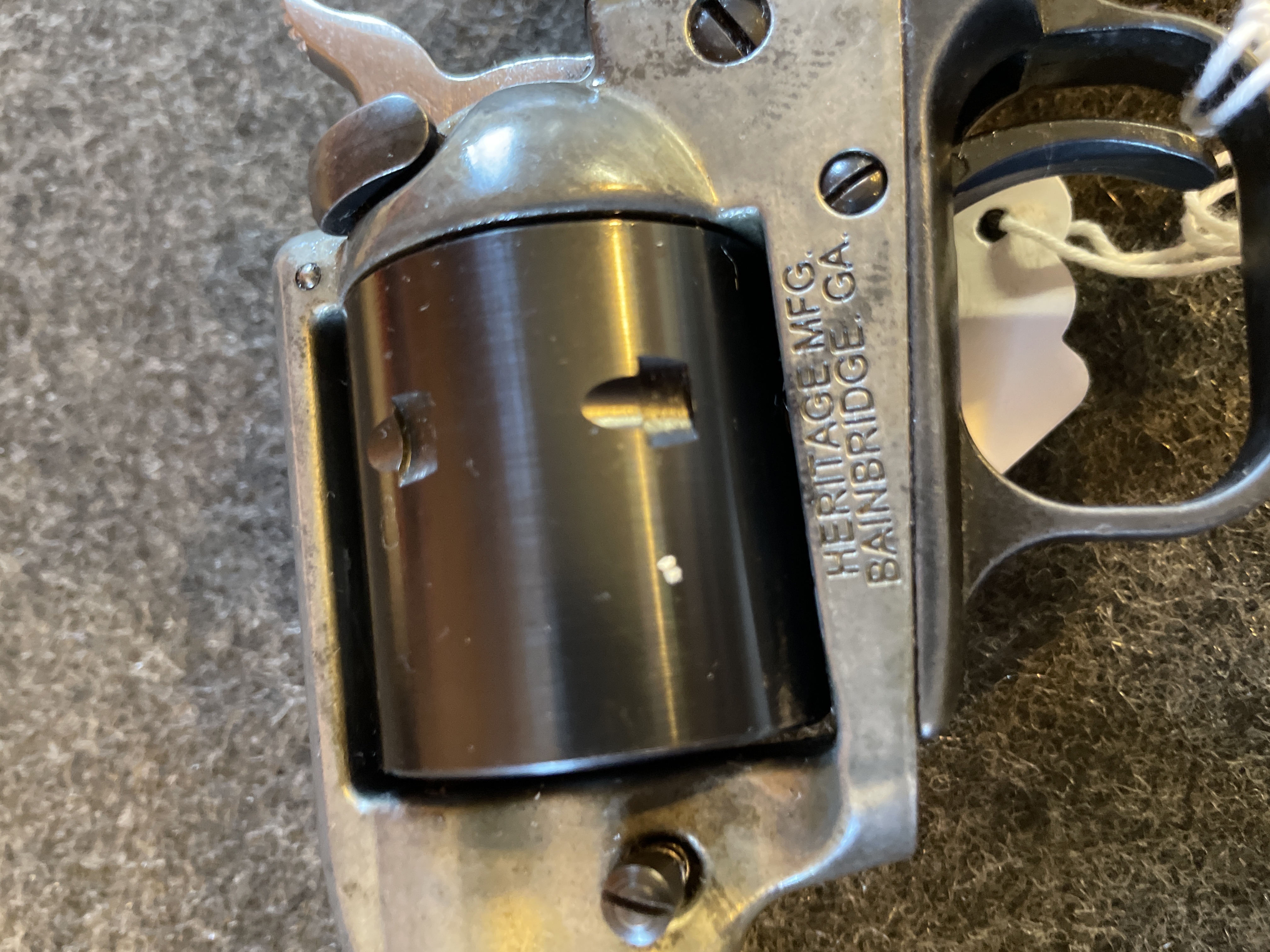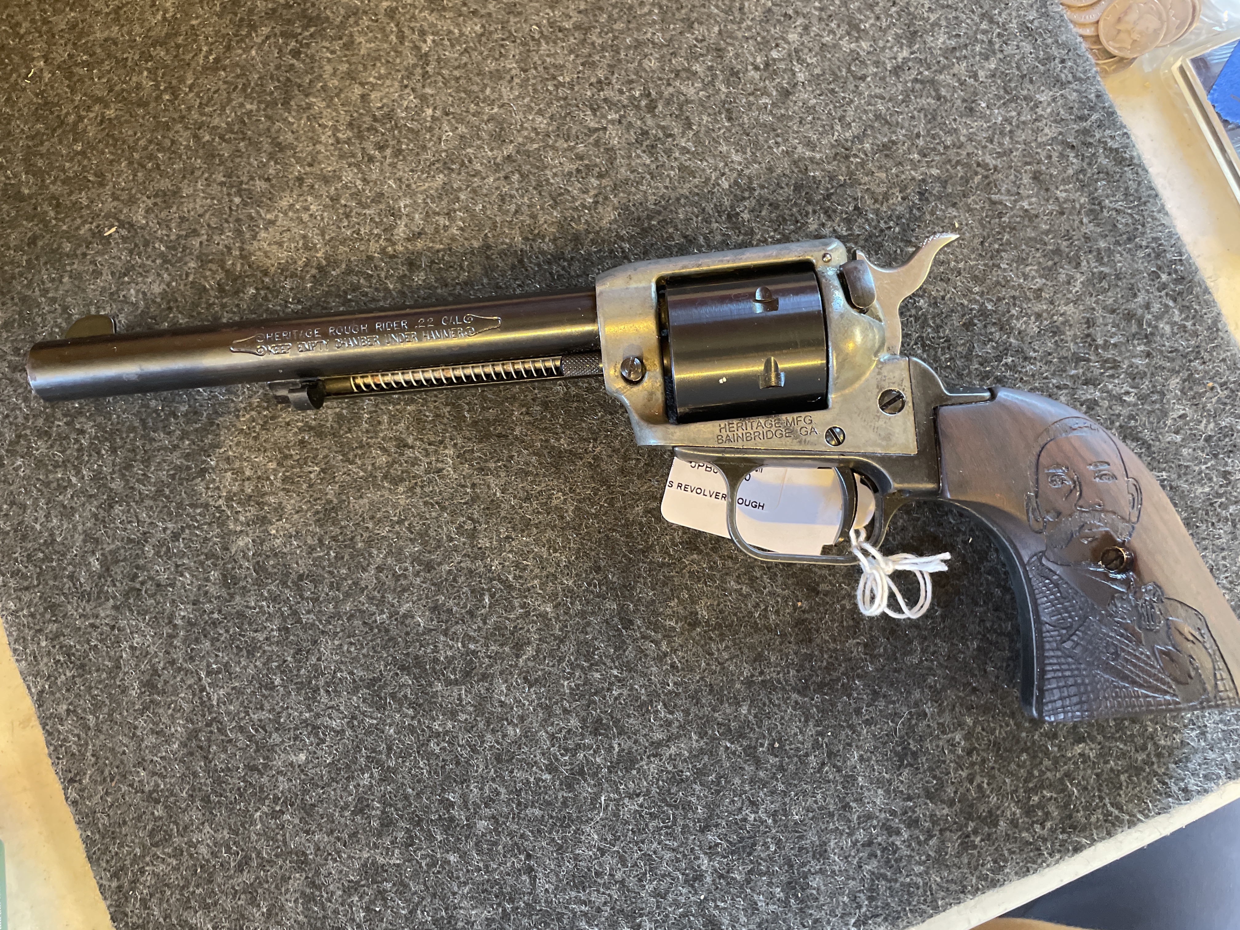 A Heritage Rough Rider .22 caliber single-action revolver featuring a blued barrel and cylinder, a silver-toned frame marked Heritage Mfg. Bainbridge, GA., and dark wood grips with a carved portrait. Must be Alabama resident to pickup locally or we will ship to FFL of your choice.