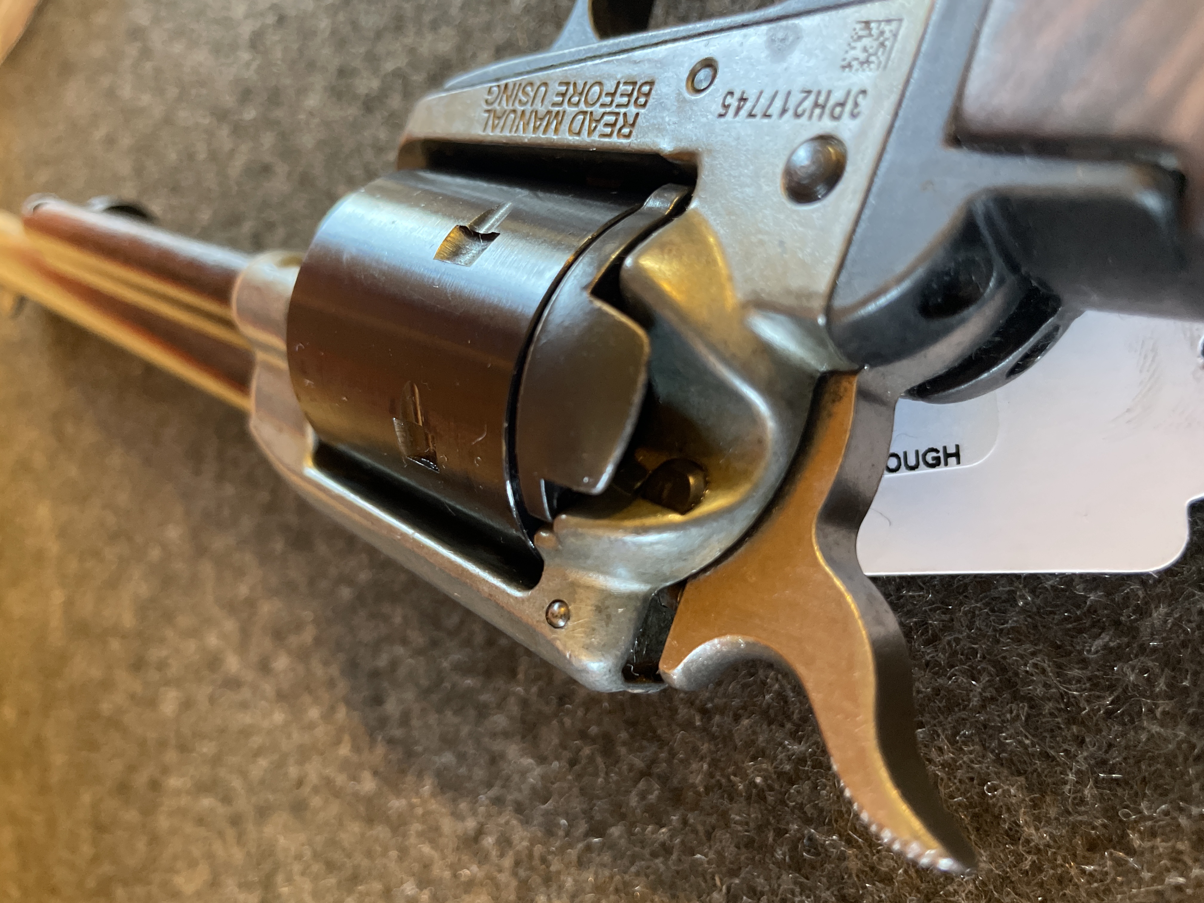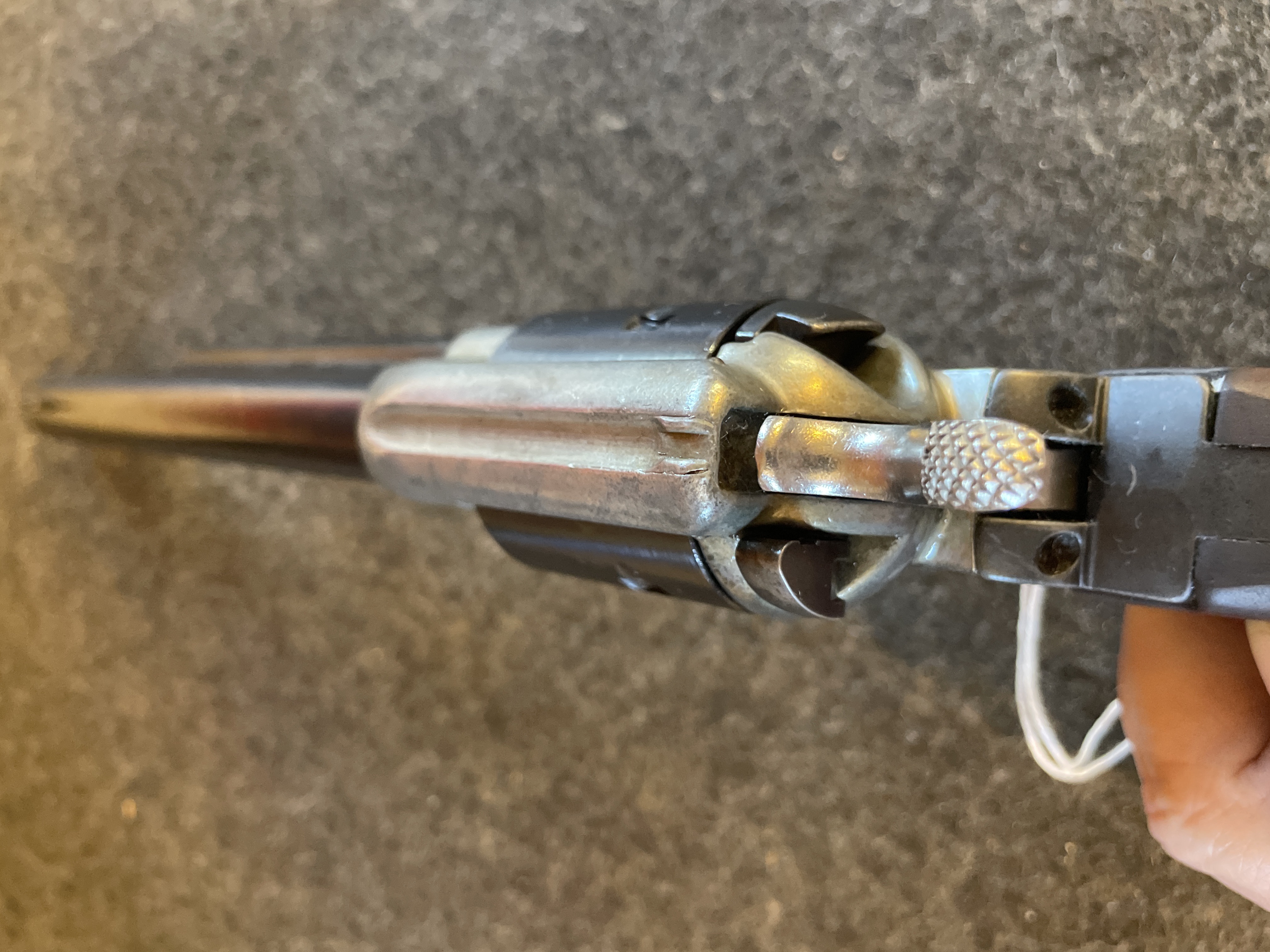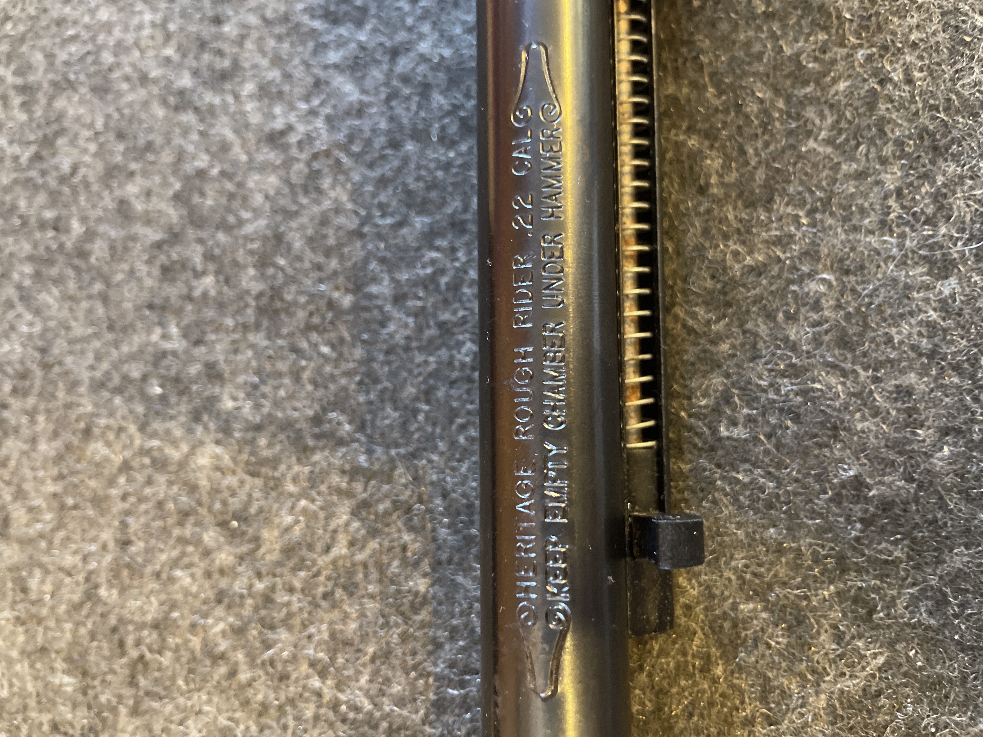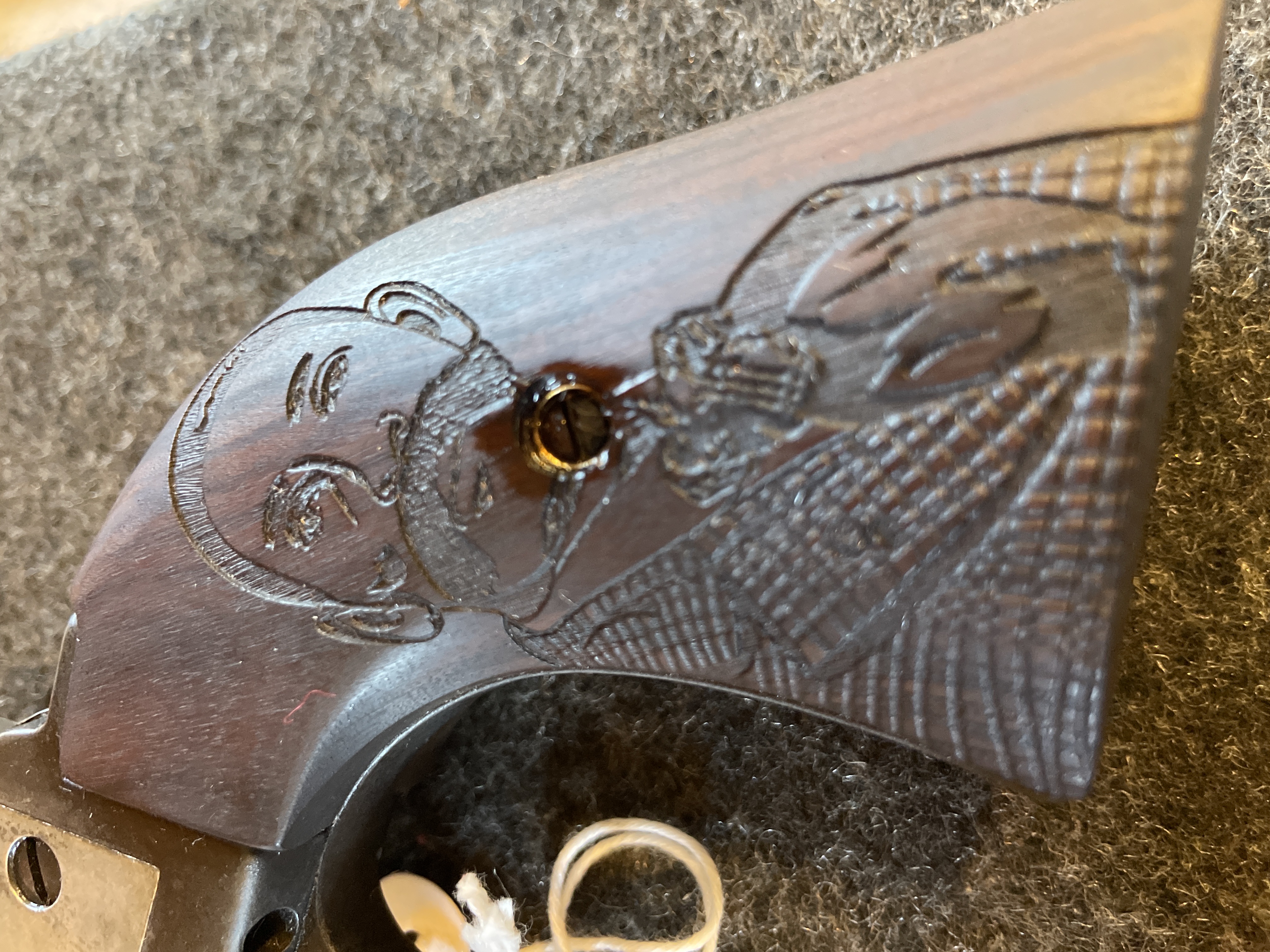 A Heritage Rough Rider .22 caliber single-action revolver featuring a blued barrel and cylinder, a silver-toned frame marked Heritage Mfg. Bainbridge, GA., and dark wood grips with a carved portrait. Must be Alabama resident to pickup locally or we will ship to FFL of your choice.