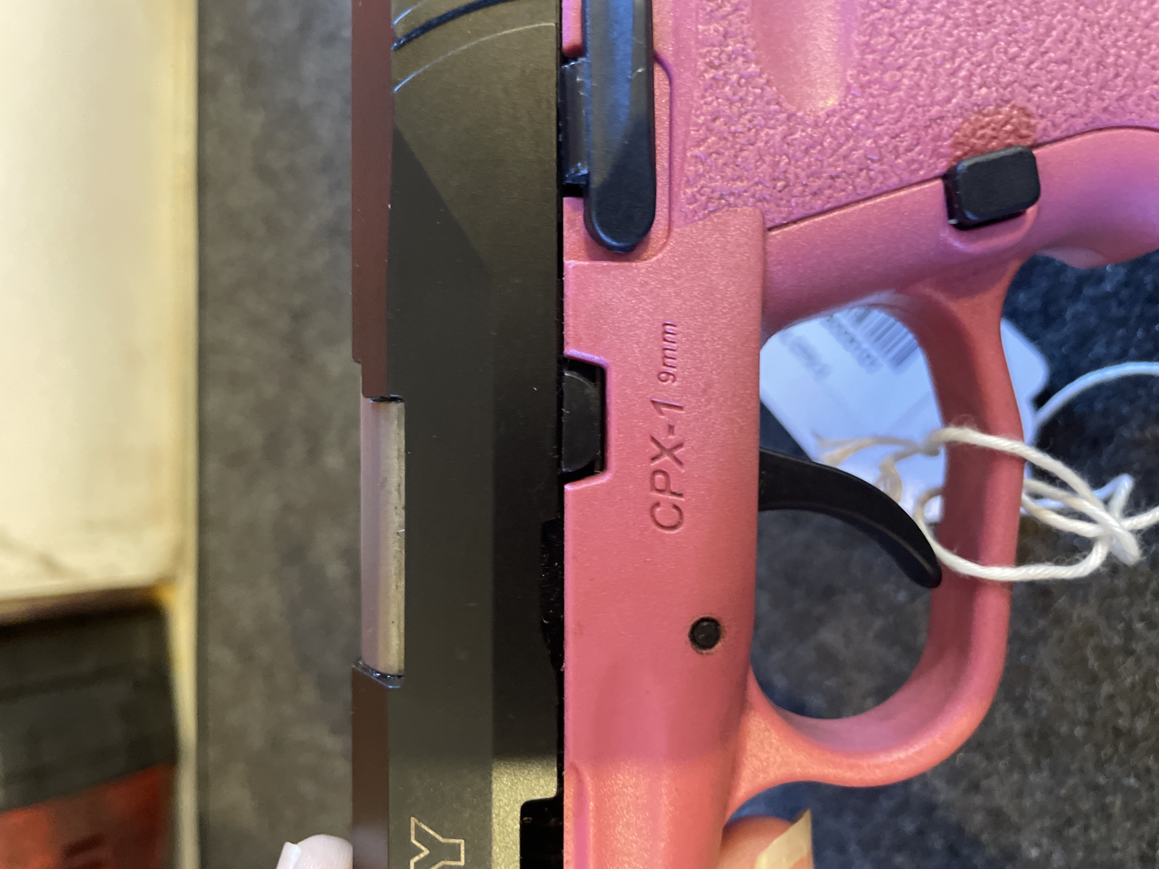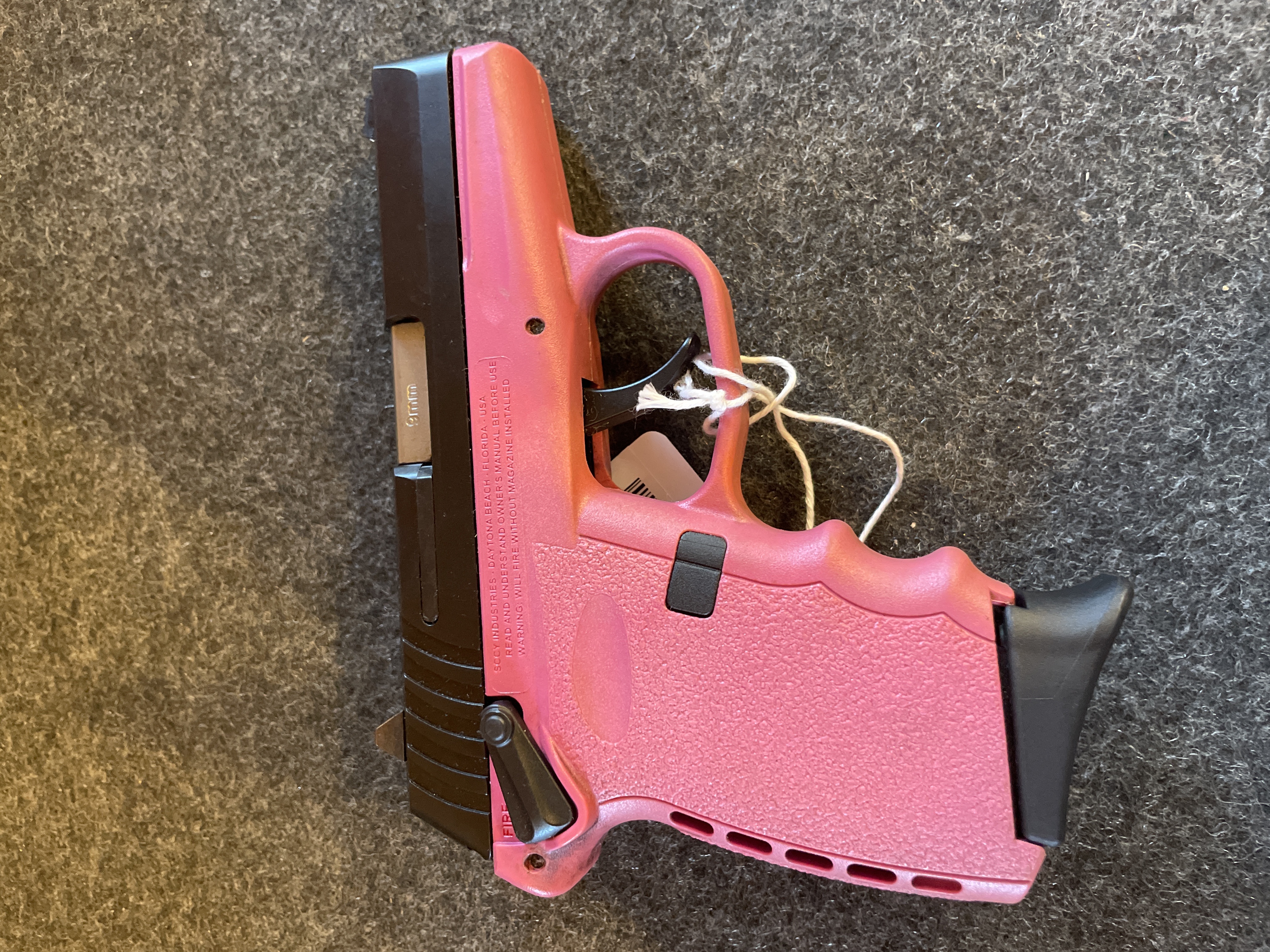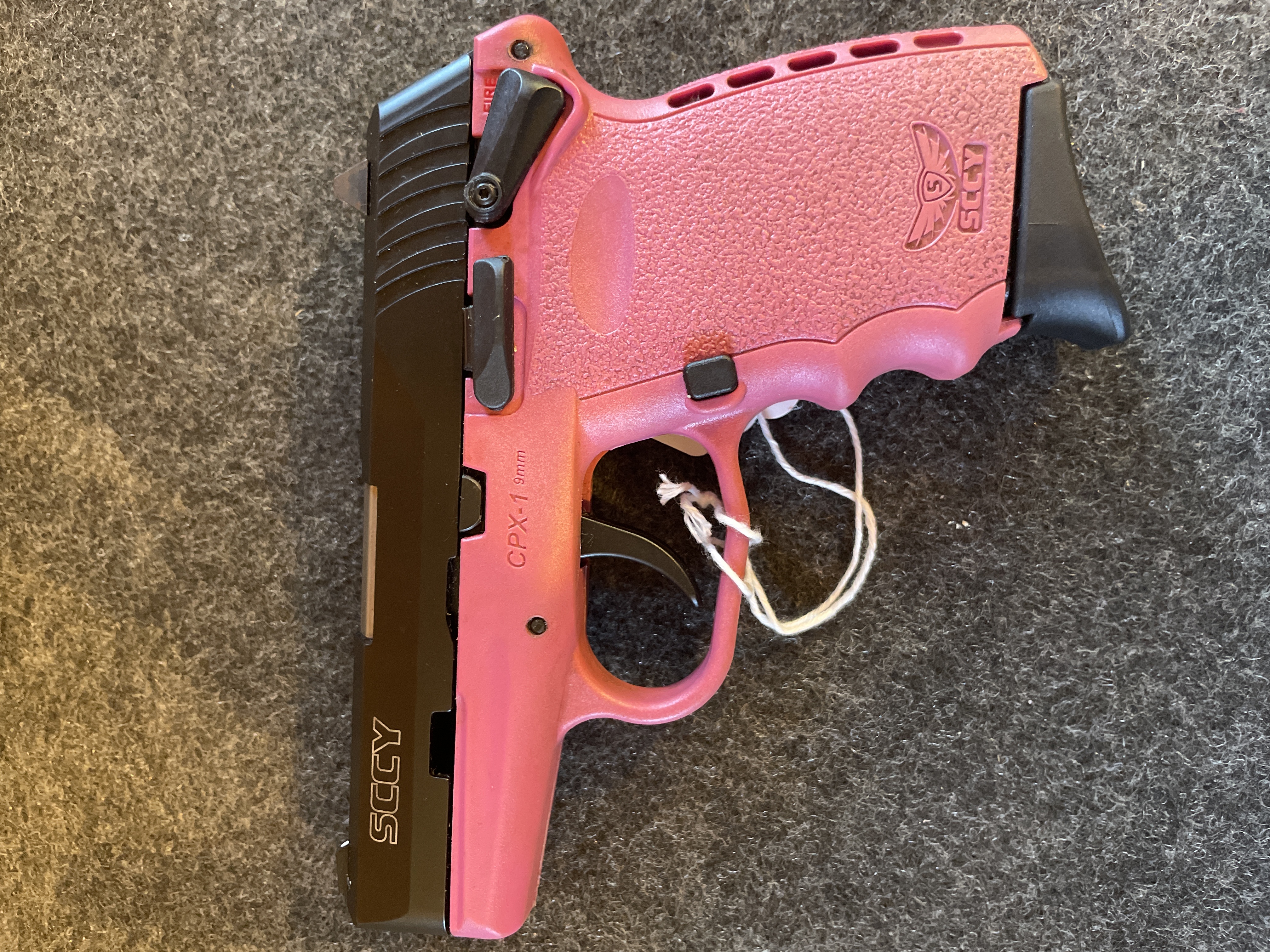 A SCCY CPX-1 9mm semi-automatic pistol featuring a pink polymer frame, black slide, and manual safety.