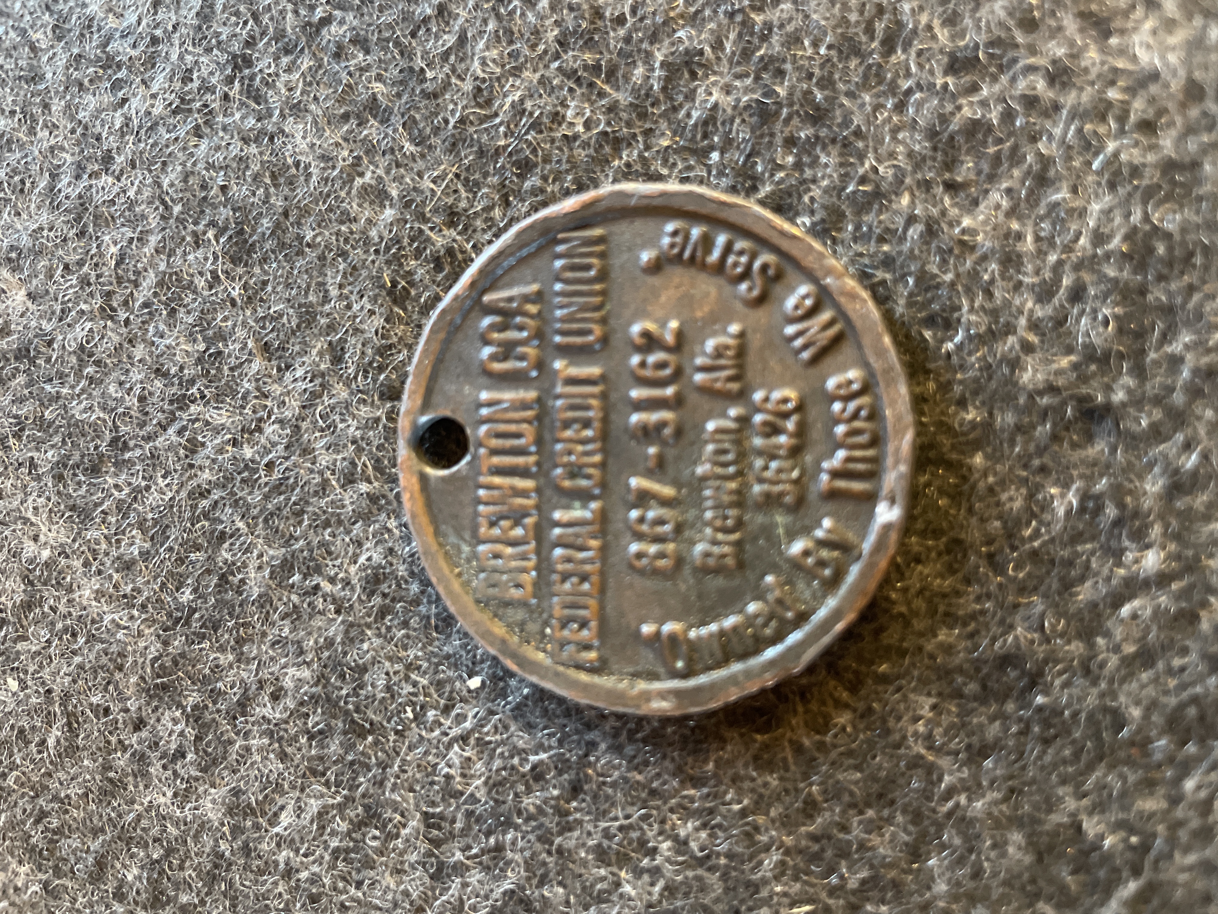 A large bronze-toned metal promotional token for the Brewton CCA Federal Credit Union of Alabama, designed to resemble an oversized 1943 Lincoln penny and featuring the reverse inscription Owned By Those We Serve.