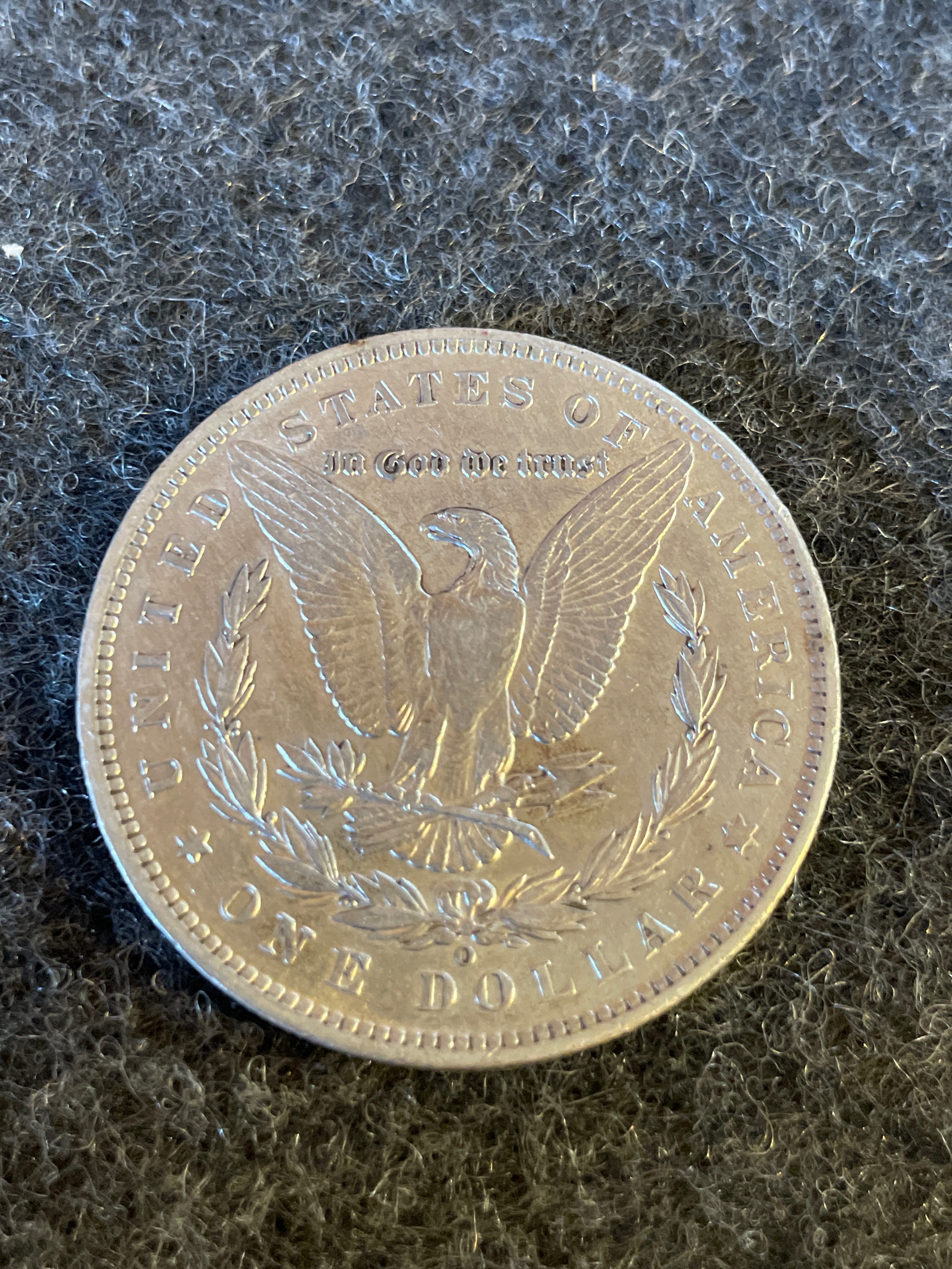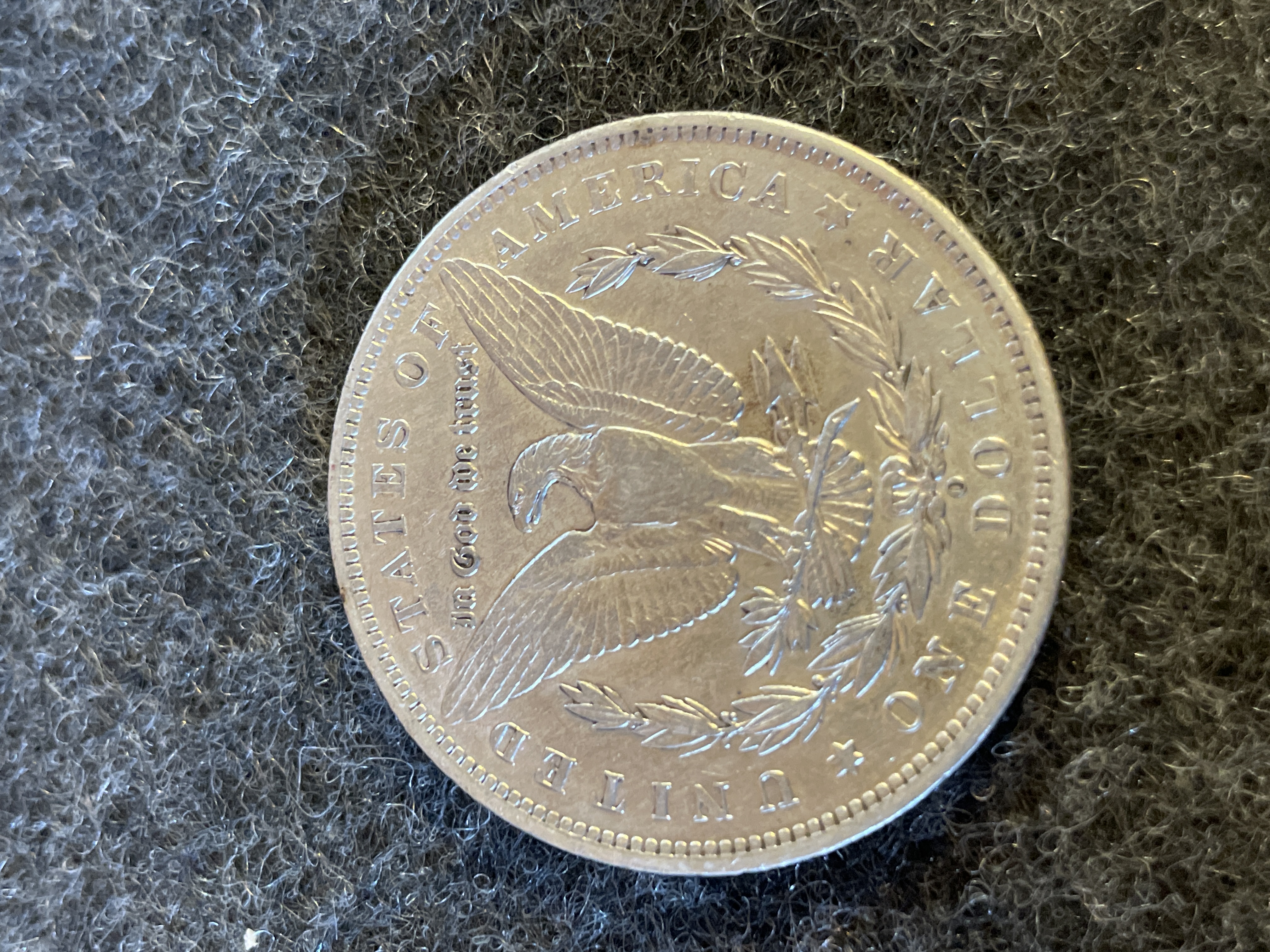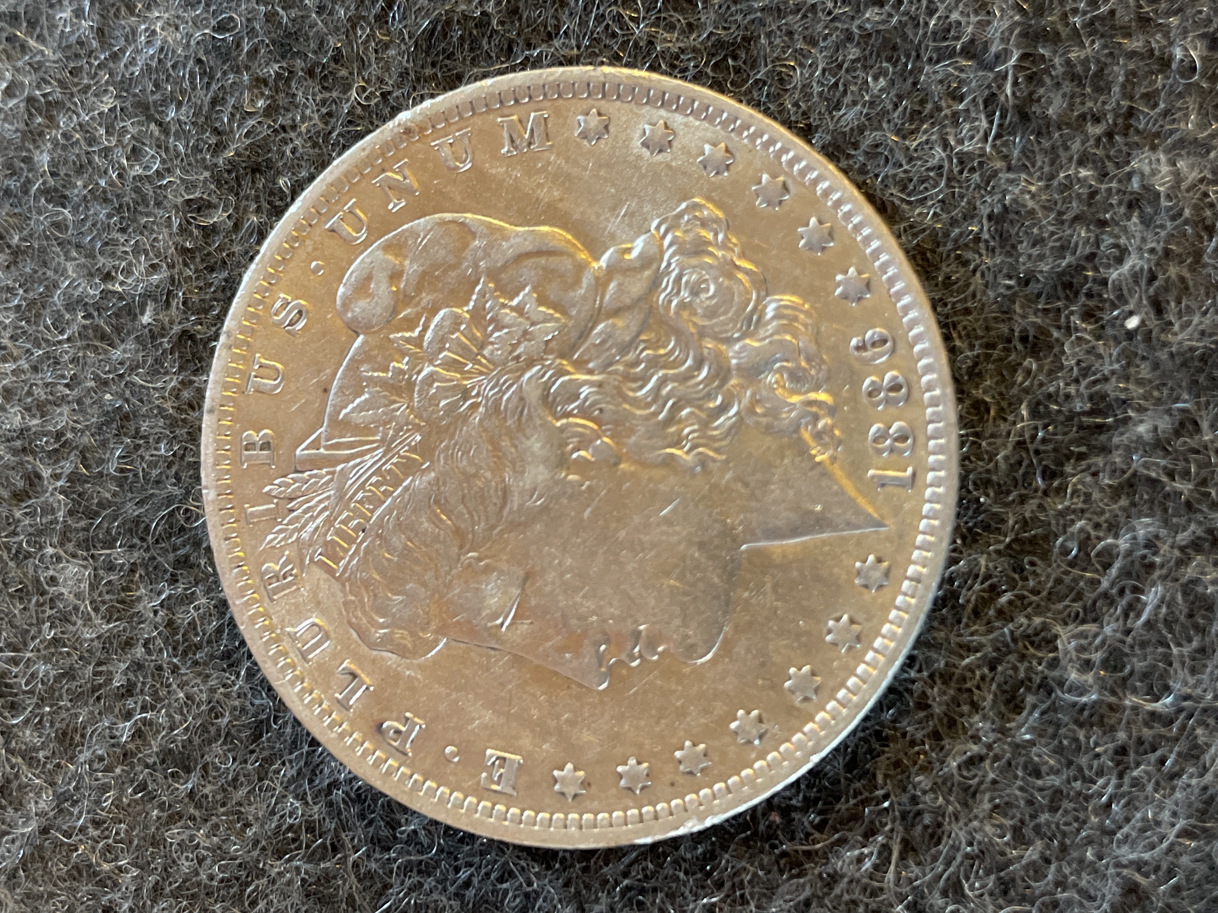 An 1886 United States Morgan silver dollar coin featuring Lady Liberty on the obverse and an eagle with a wreath on the reverse.