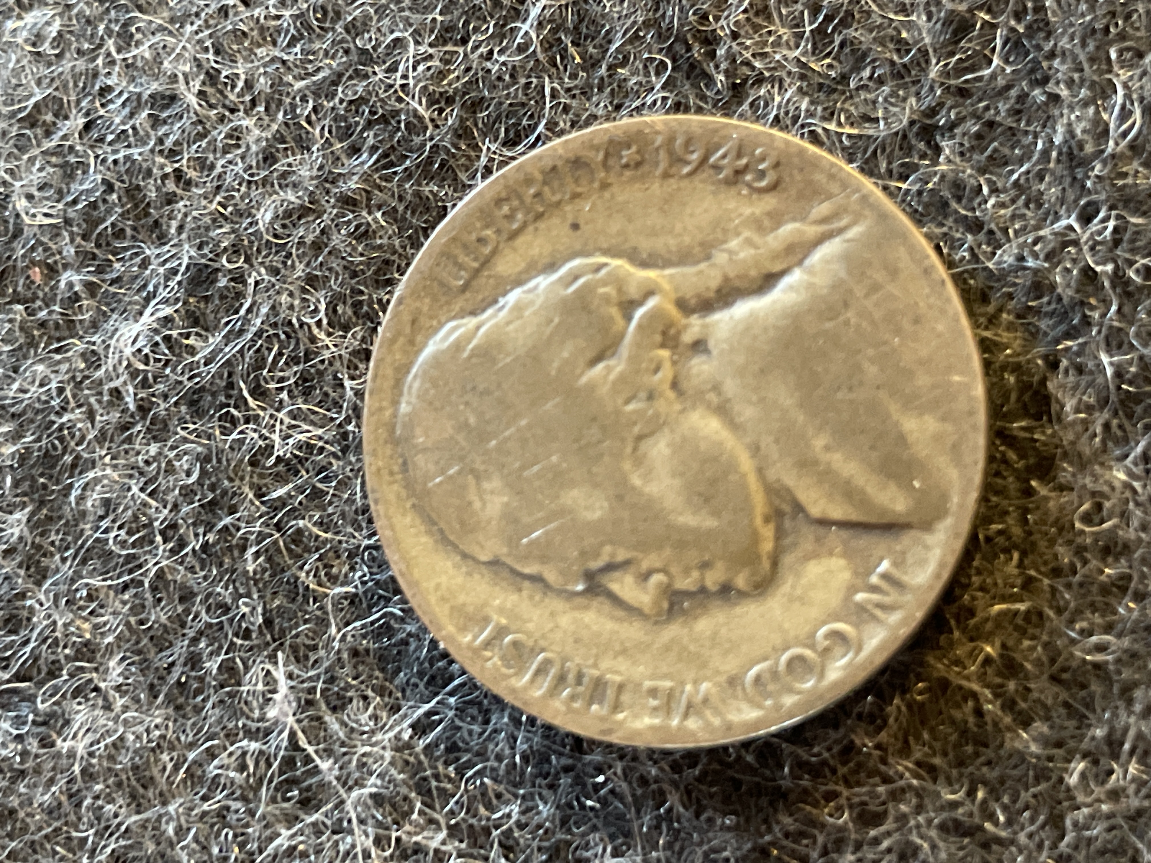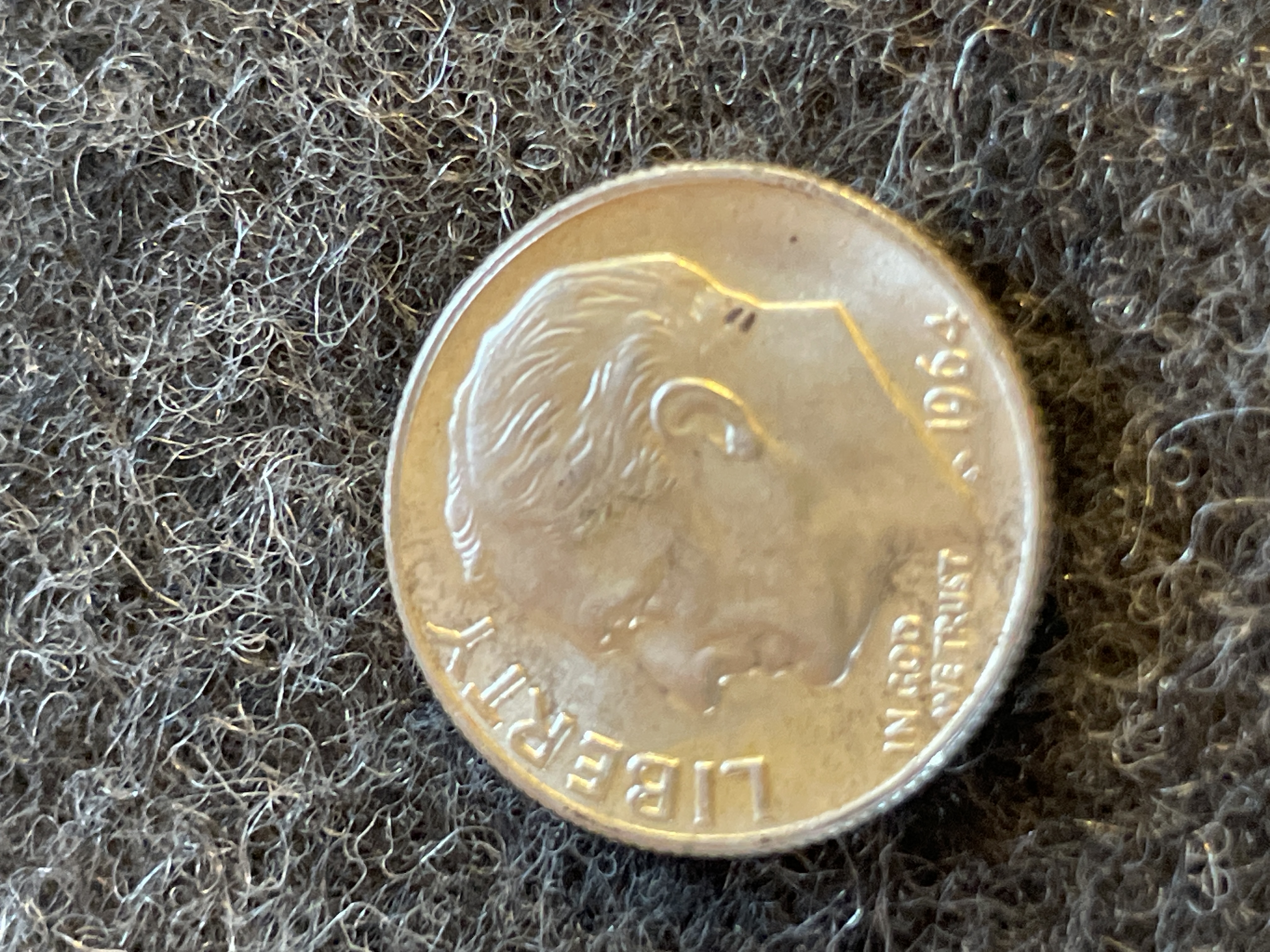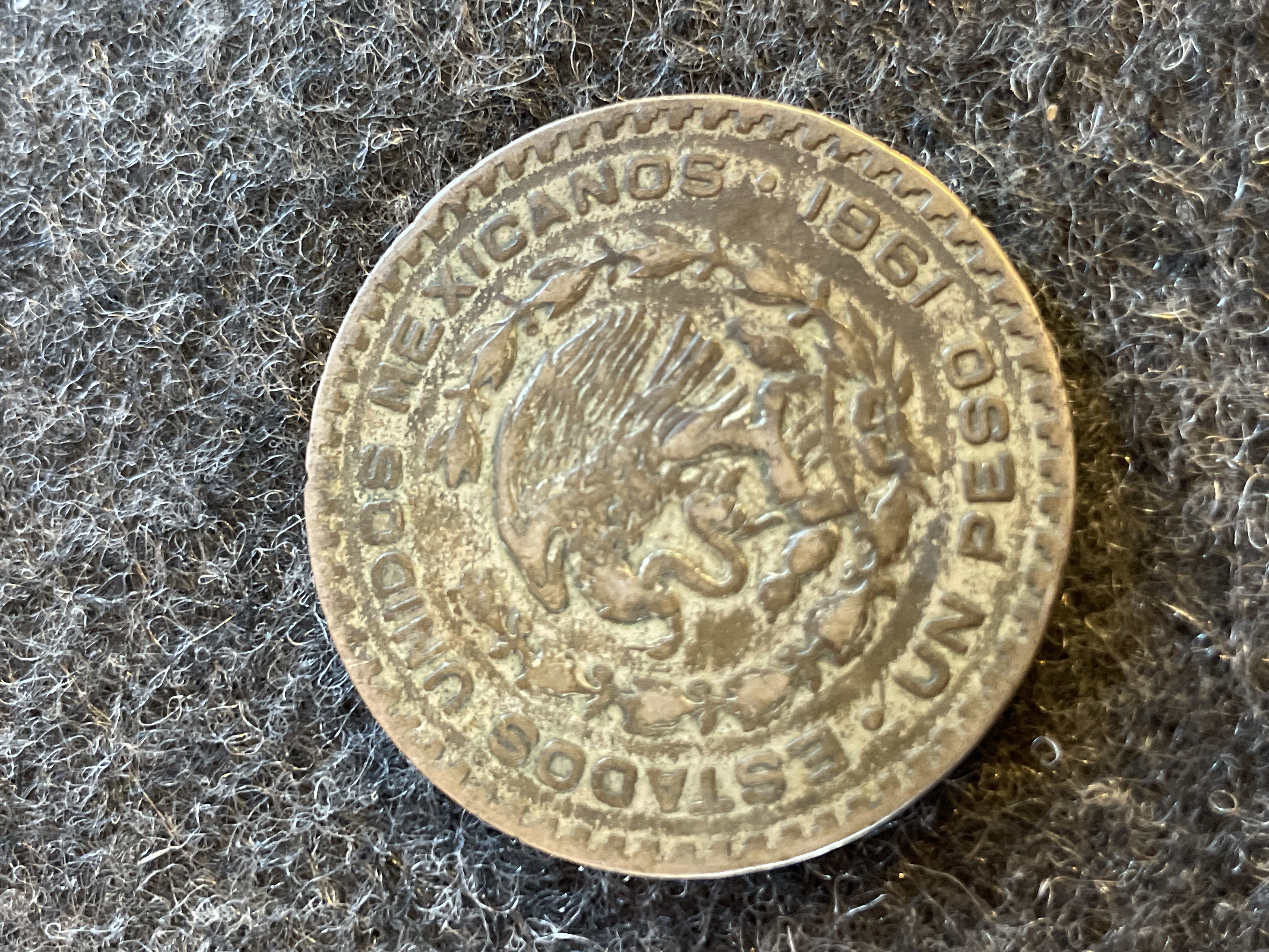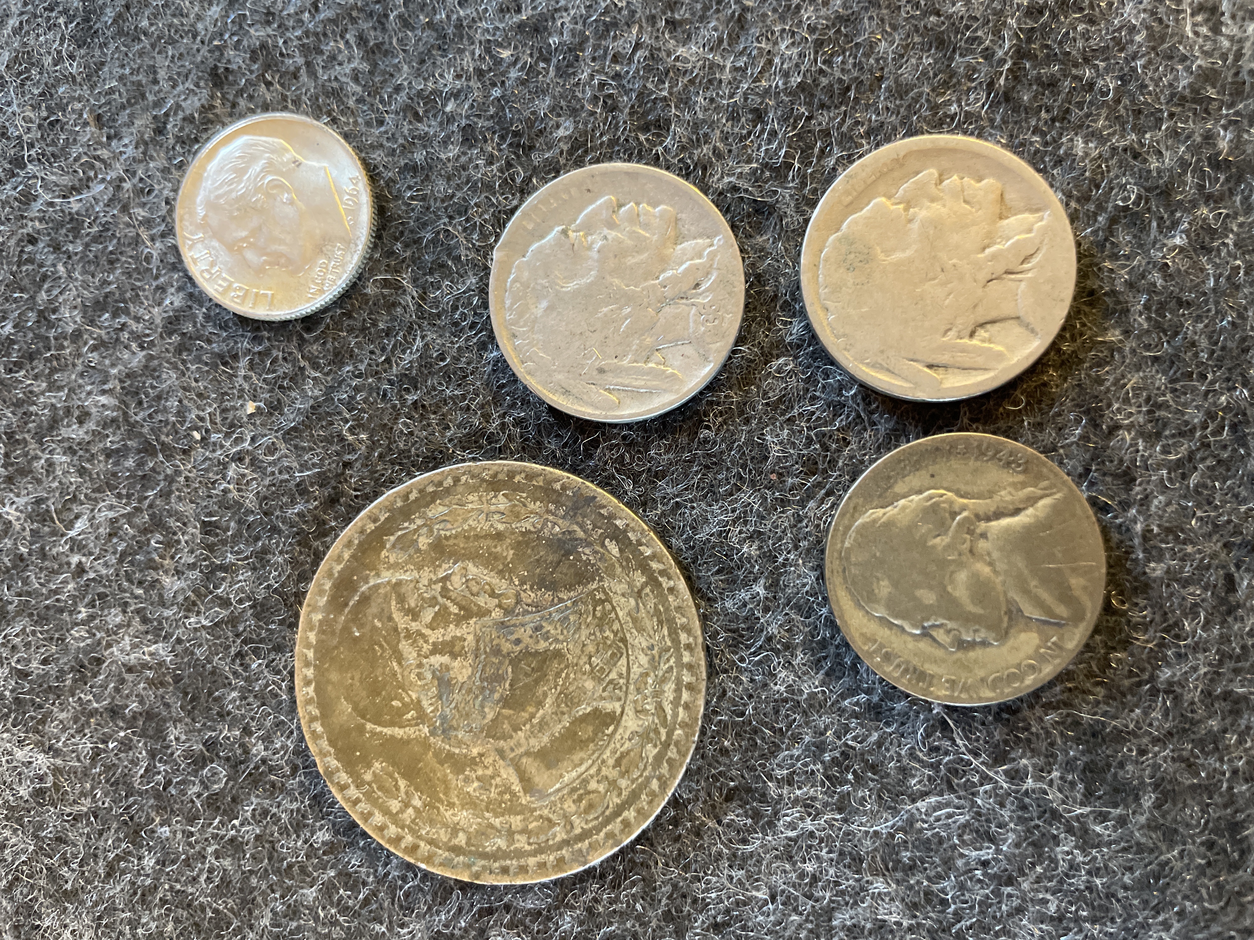 A collection of coins including a 1961 Mexican Un Peso, a 1943-P Jefferson silver war nickel, two Buffalo nickels, and a 1964 Roosevelt dime.