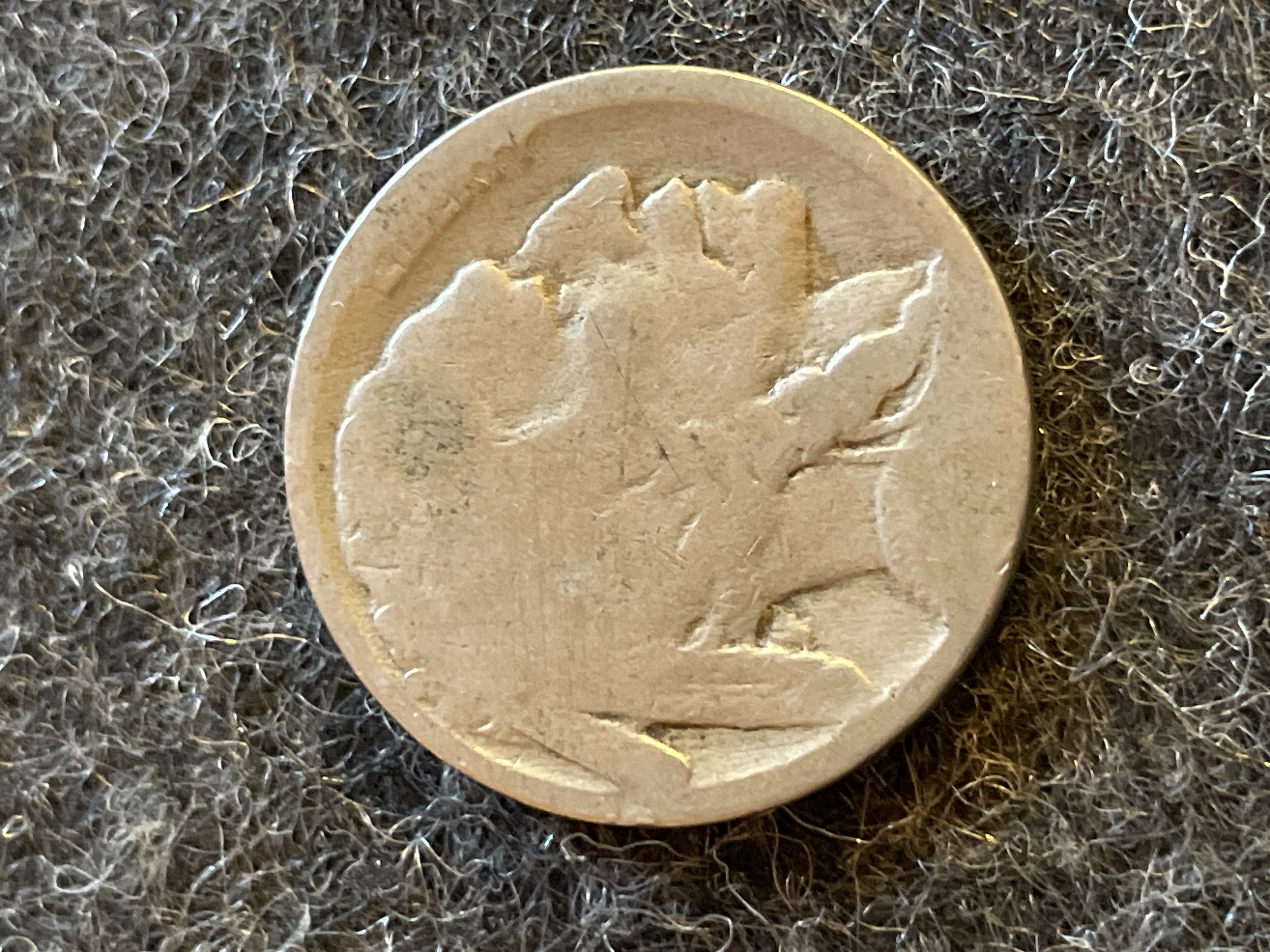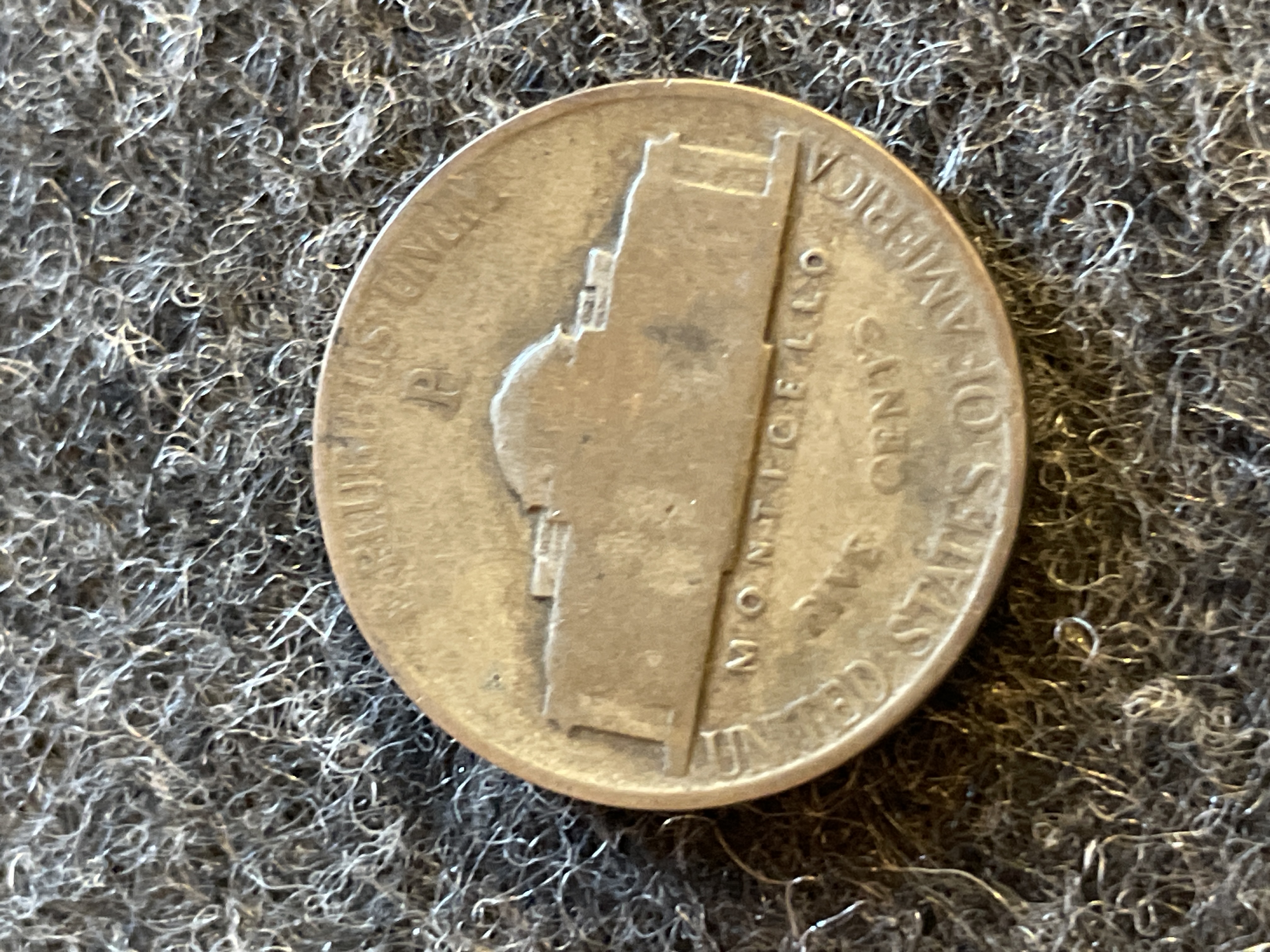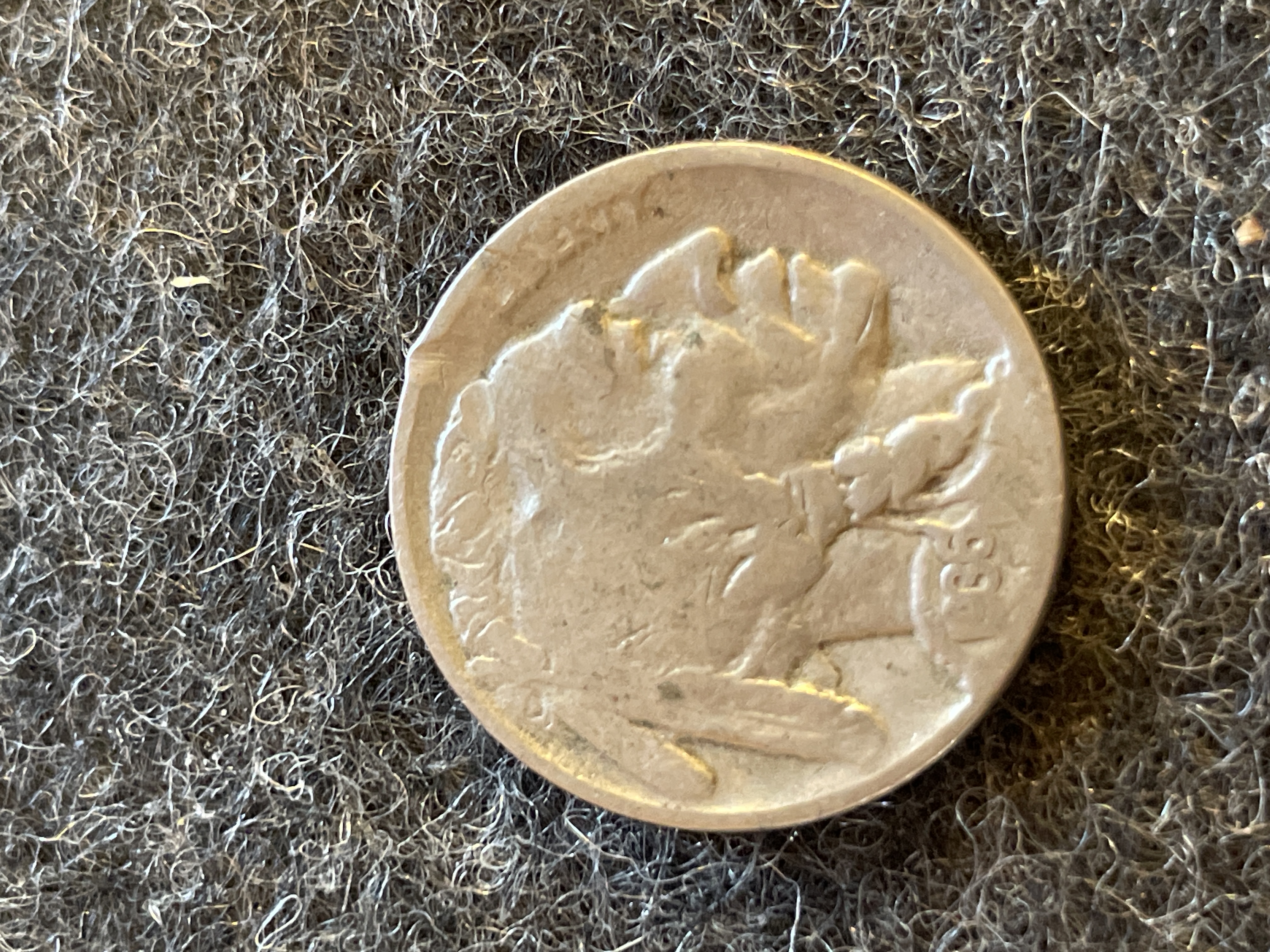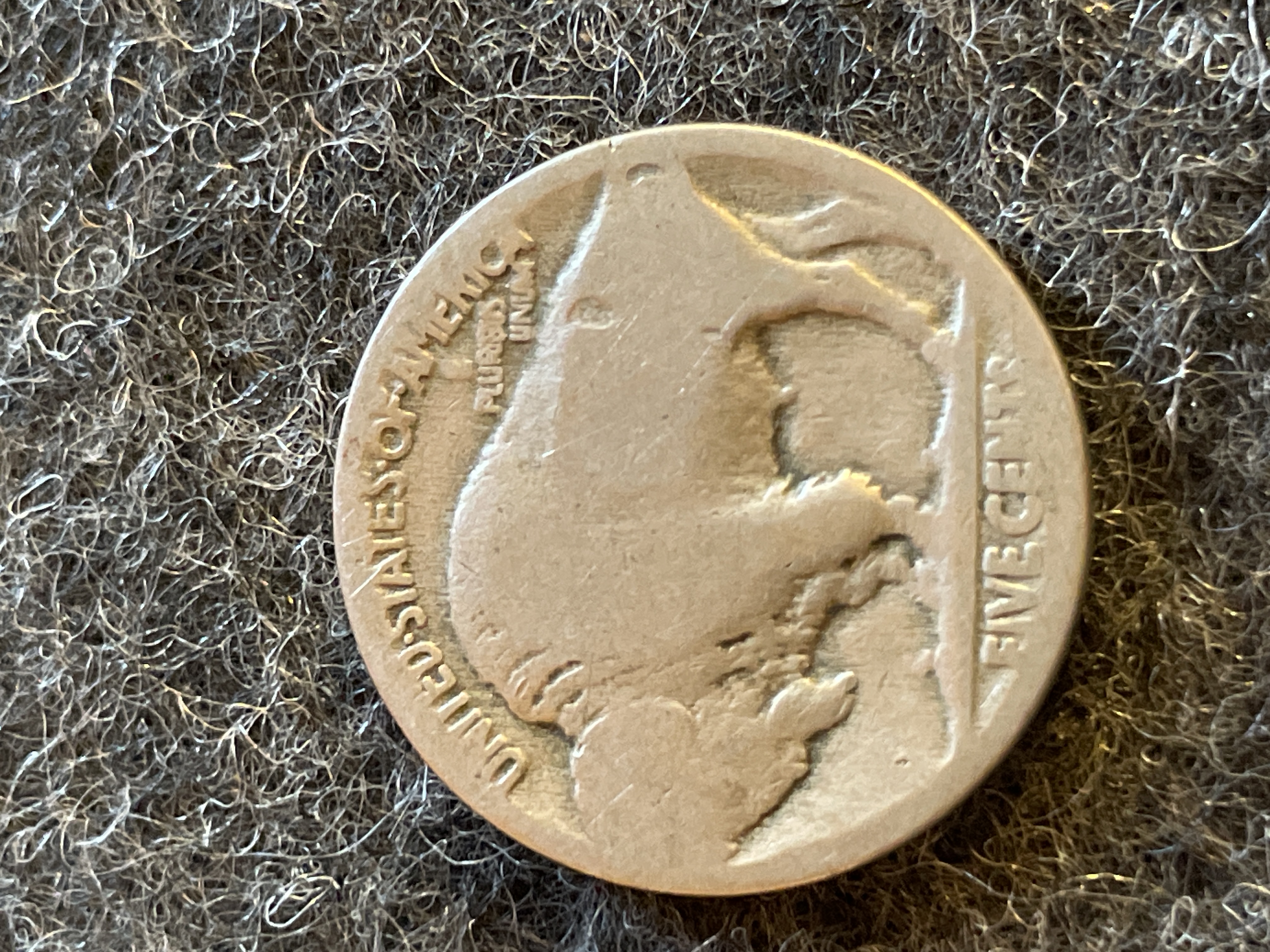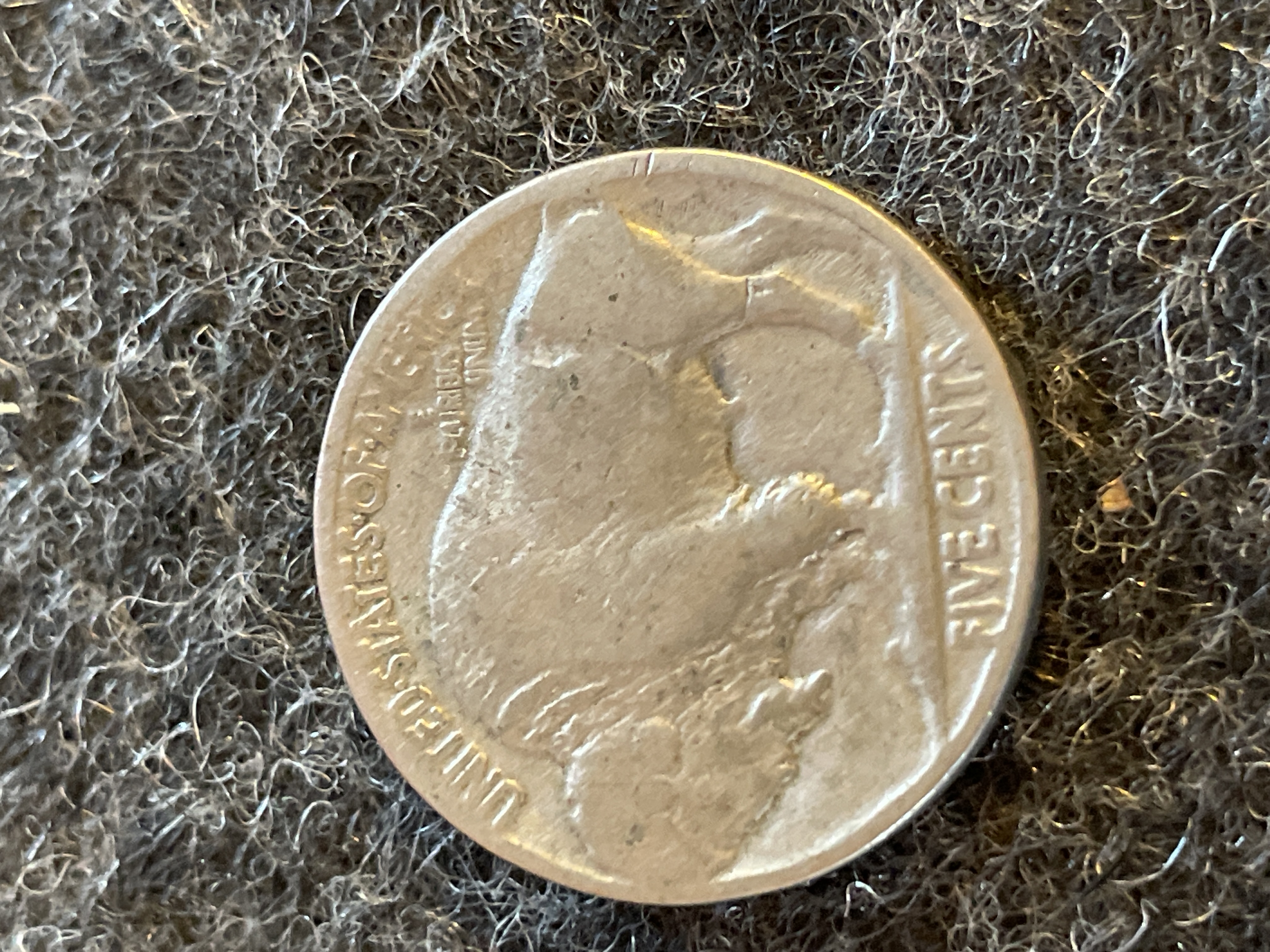 A collection of coins including a 1961 Mexican Un Peso, a 1943-P Jefferson silver war nickel, two Buffalo nickels, and a 1964 Roosevelt dime.