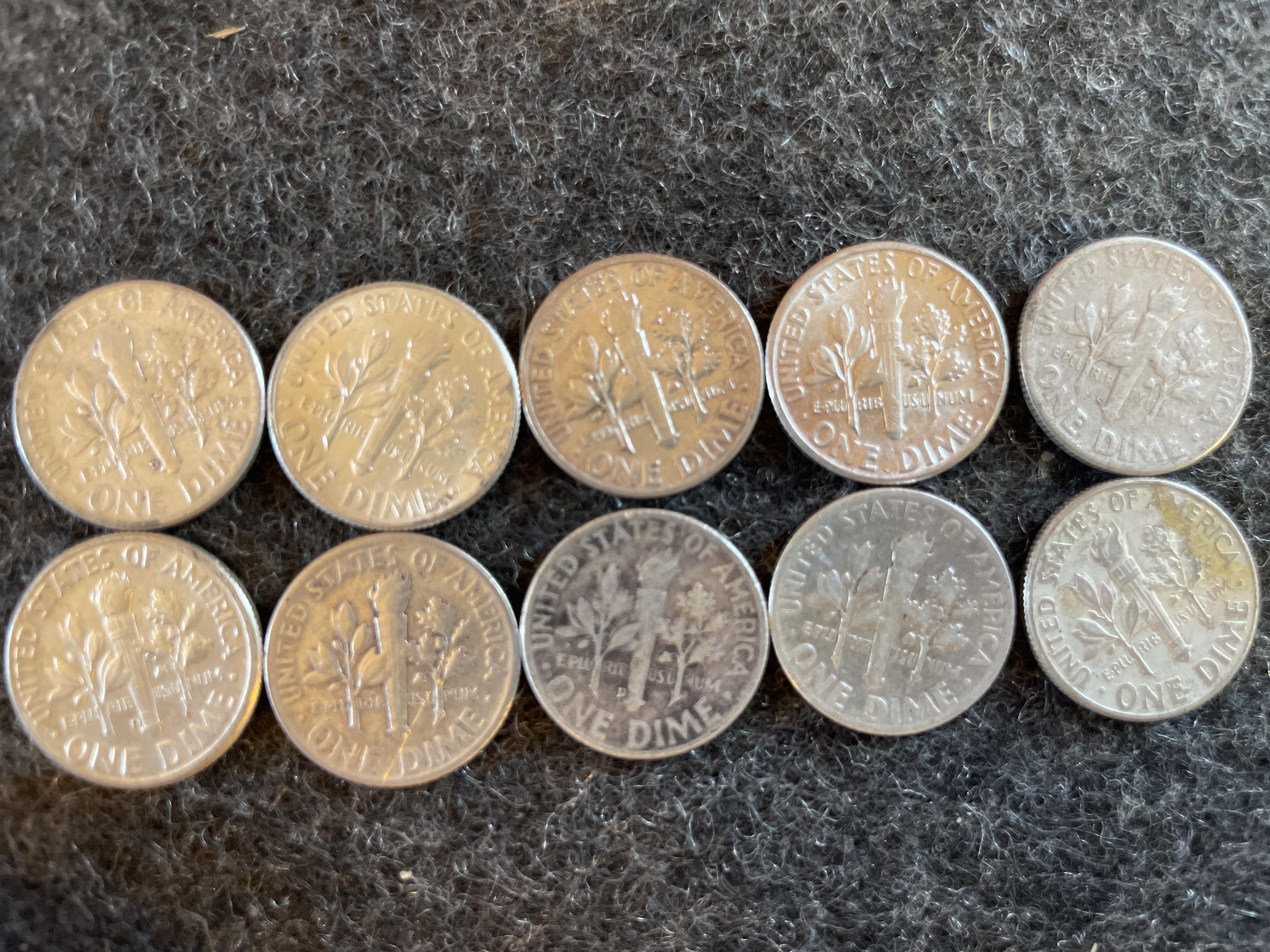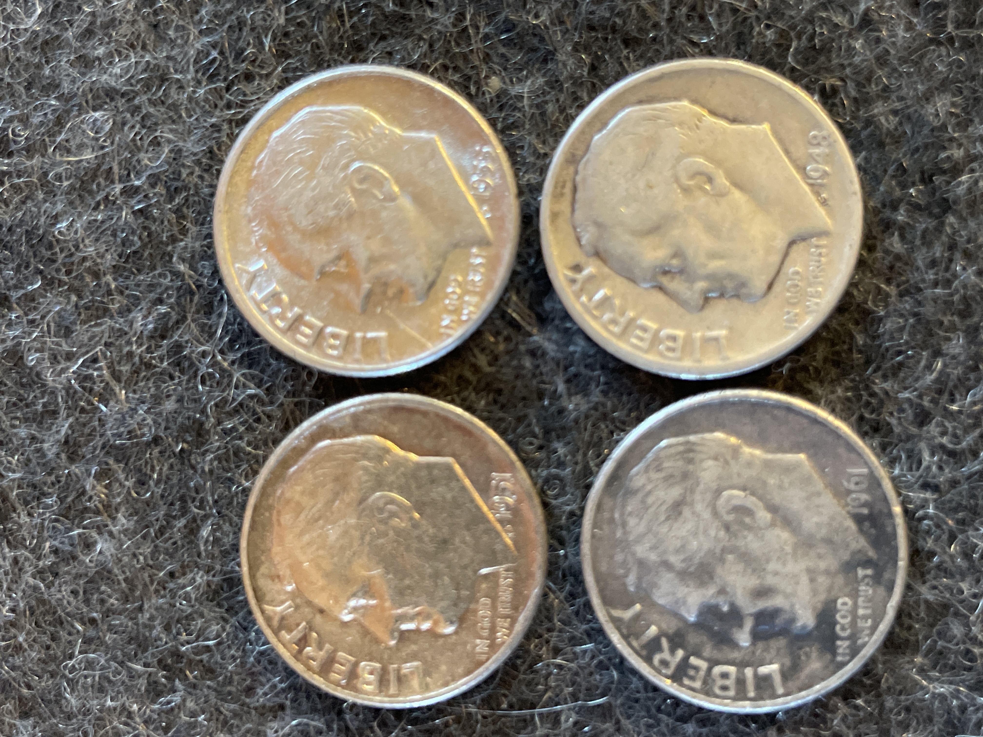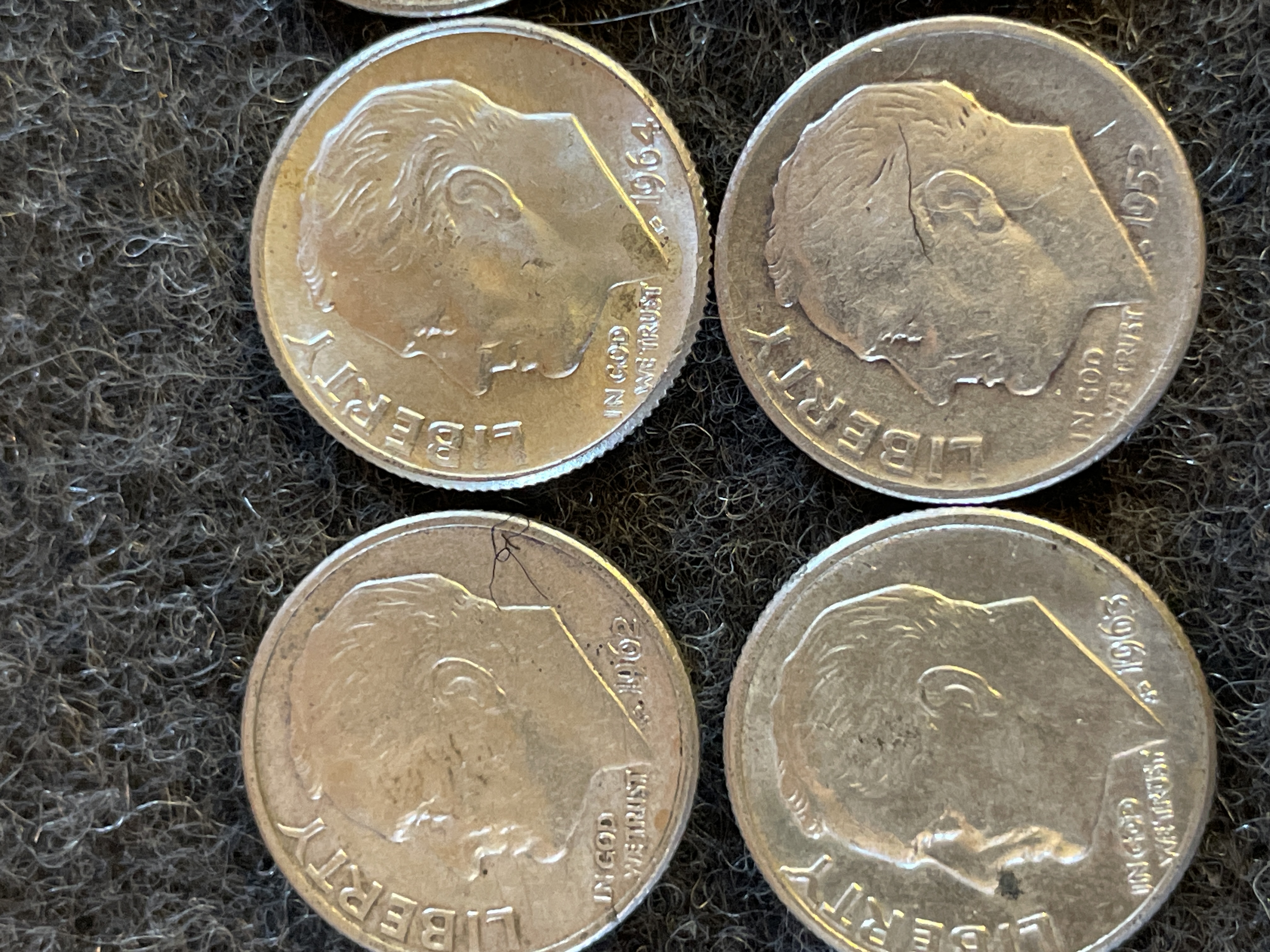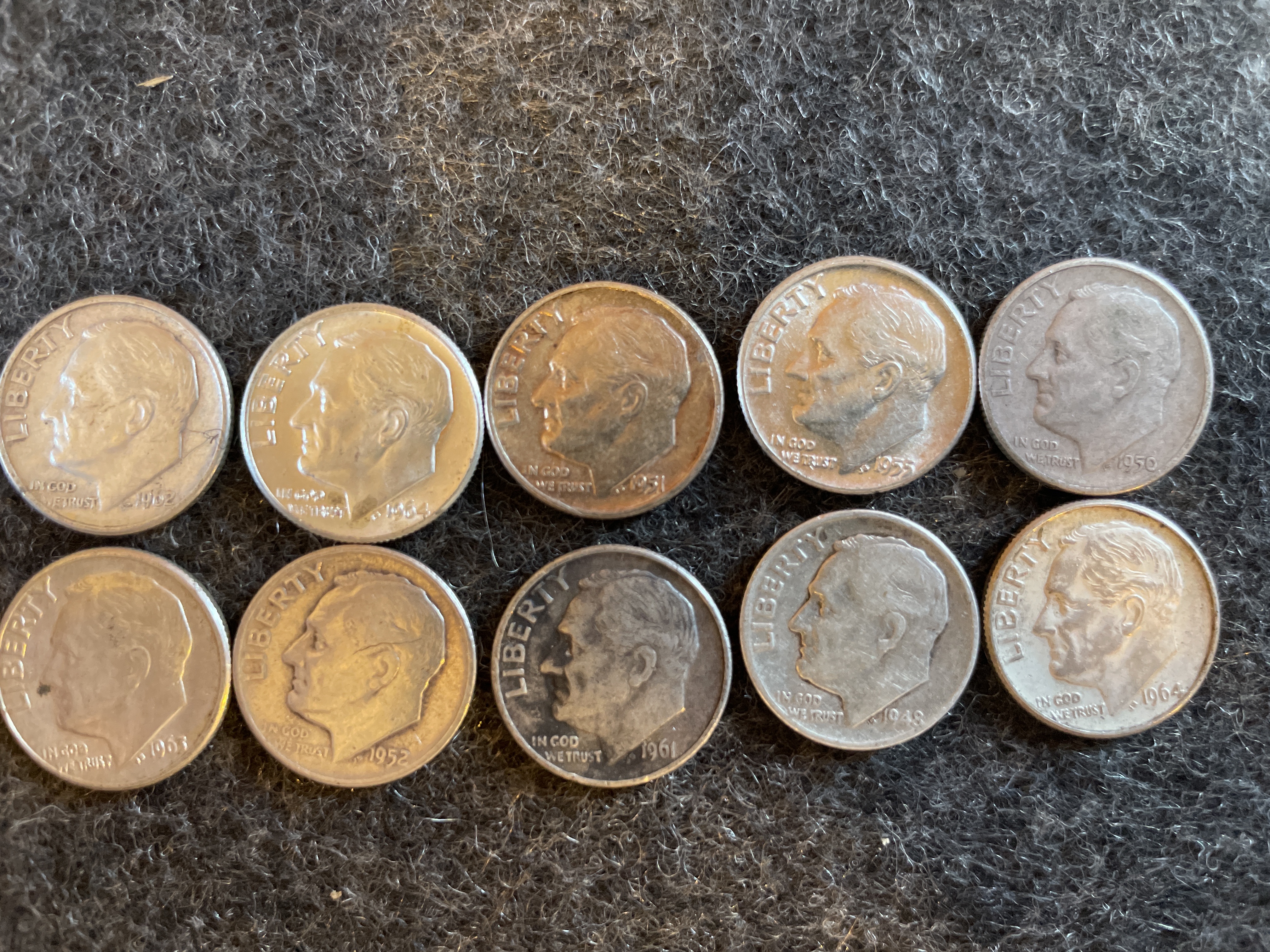 A collection of United States Roosevelt dimes struck in 90% silver. The group includes various dates ranging from 1948 to 1964. The obverse of each coin features the profile of President Franklin D. Roosevelt facing left, accompanied by the inscriptions LIBERTY and IN GOD WE TRUST along with the respective mint year. The reverse depicts a central torch flanked by an olive branch to the left and an oak branch to the right. Reverse inscriptions include UNITED STATES OF AMERICA, E PLURIBUS UNUM, and the denomination ONE DIME.