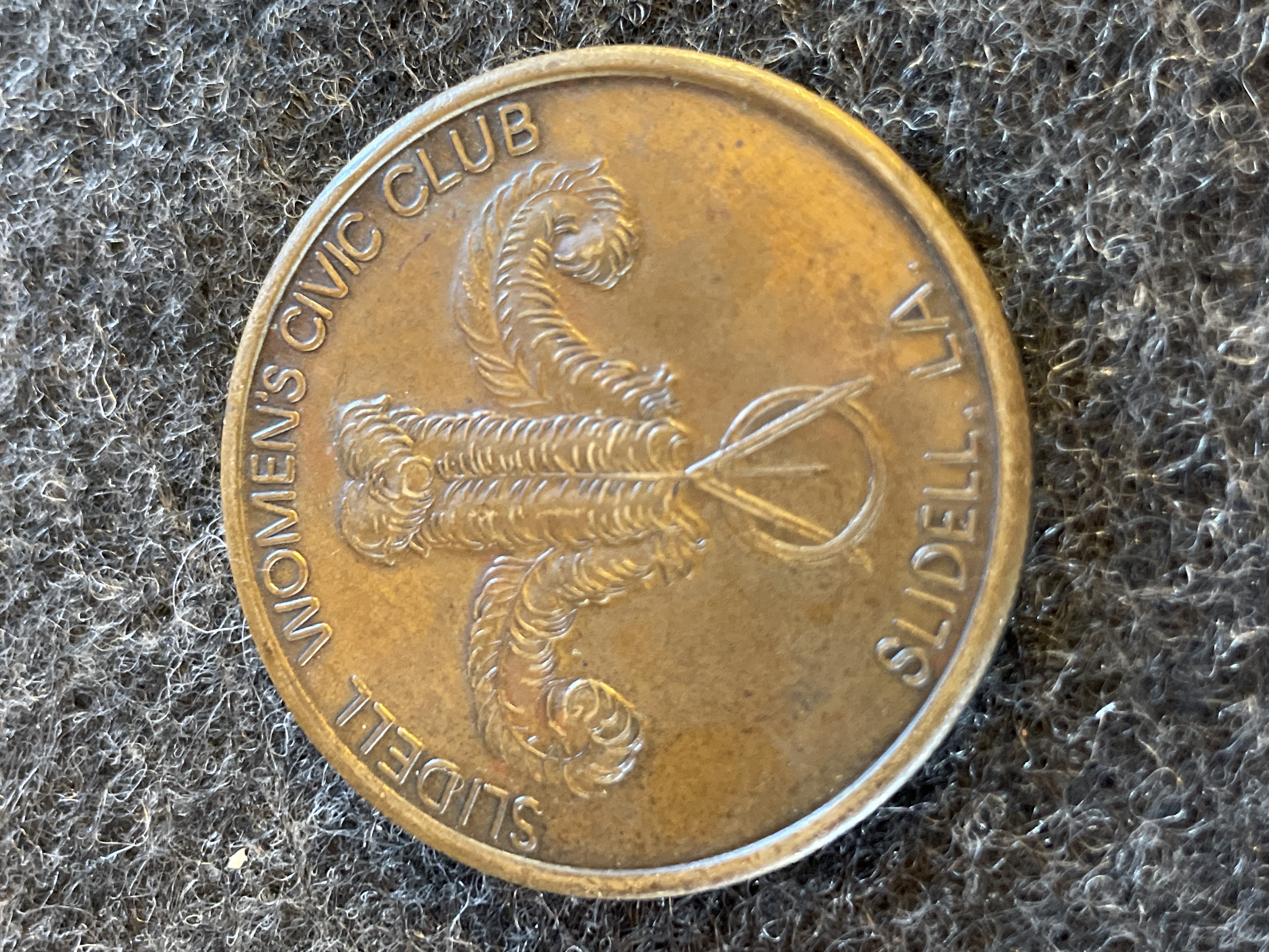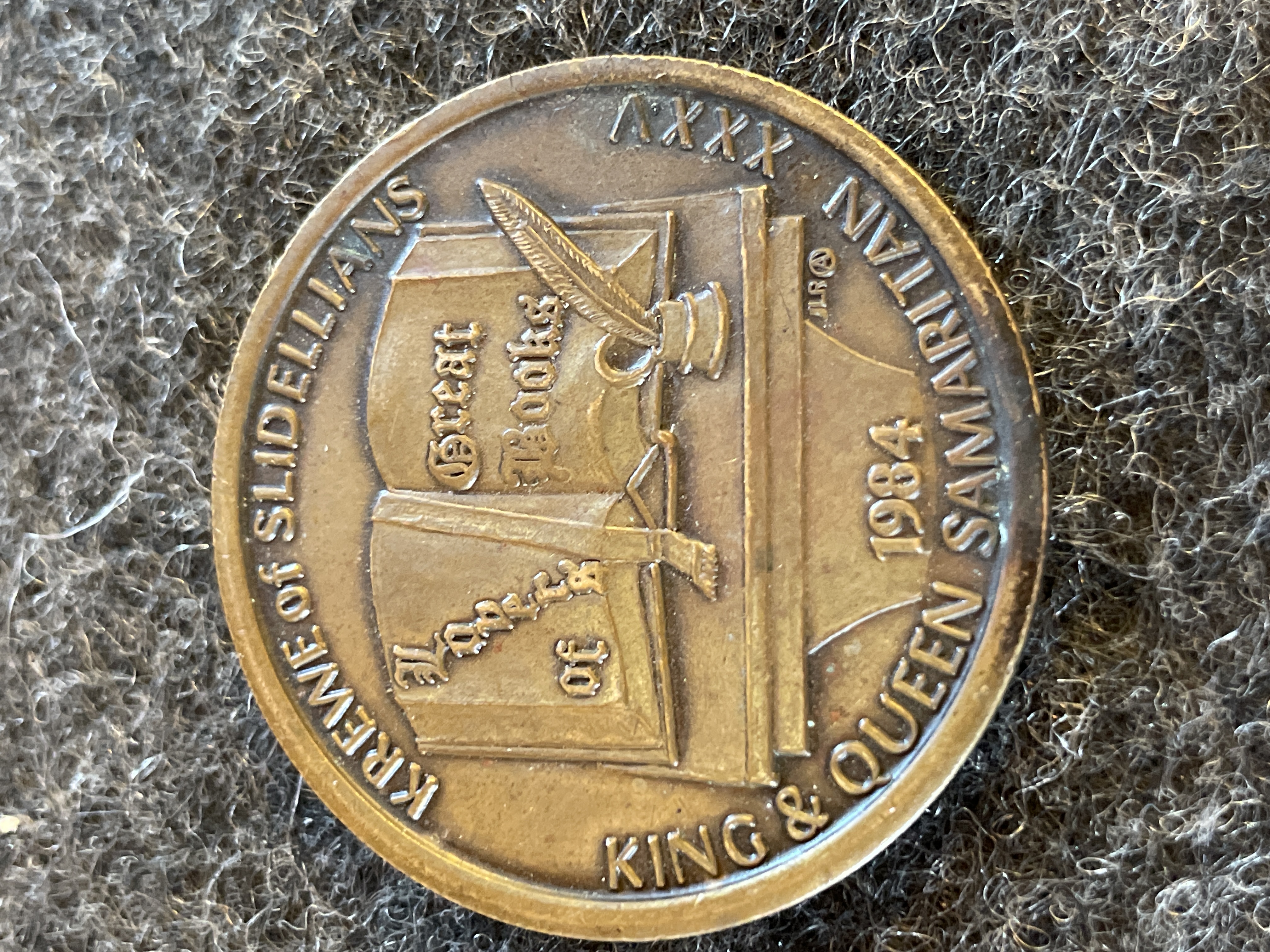 A bronze-toned commemorative medallion featuring the Krewe of Slidellians King and Queen Samaritan 1984 on the obverse and Slidell Women’s Civic Club on the reverse.
