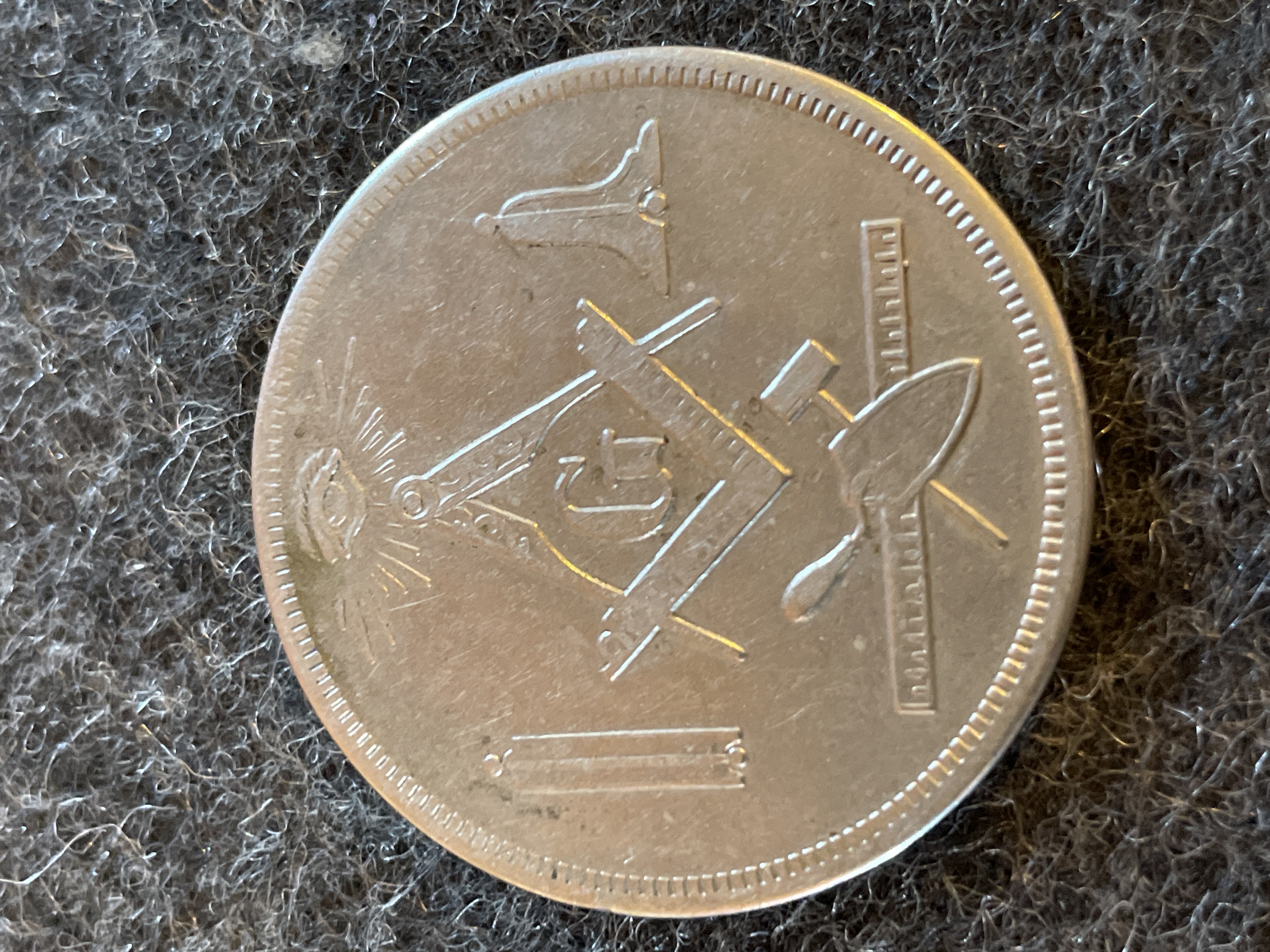 A silver-toned Masonic commemorative token inscribed for Roy Woosley of Vienna Lodge No. 423 detailing his degree progress from 1943 to 1944 and featuring various Masonic symbols on the reverse.
