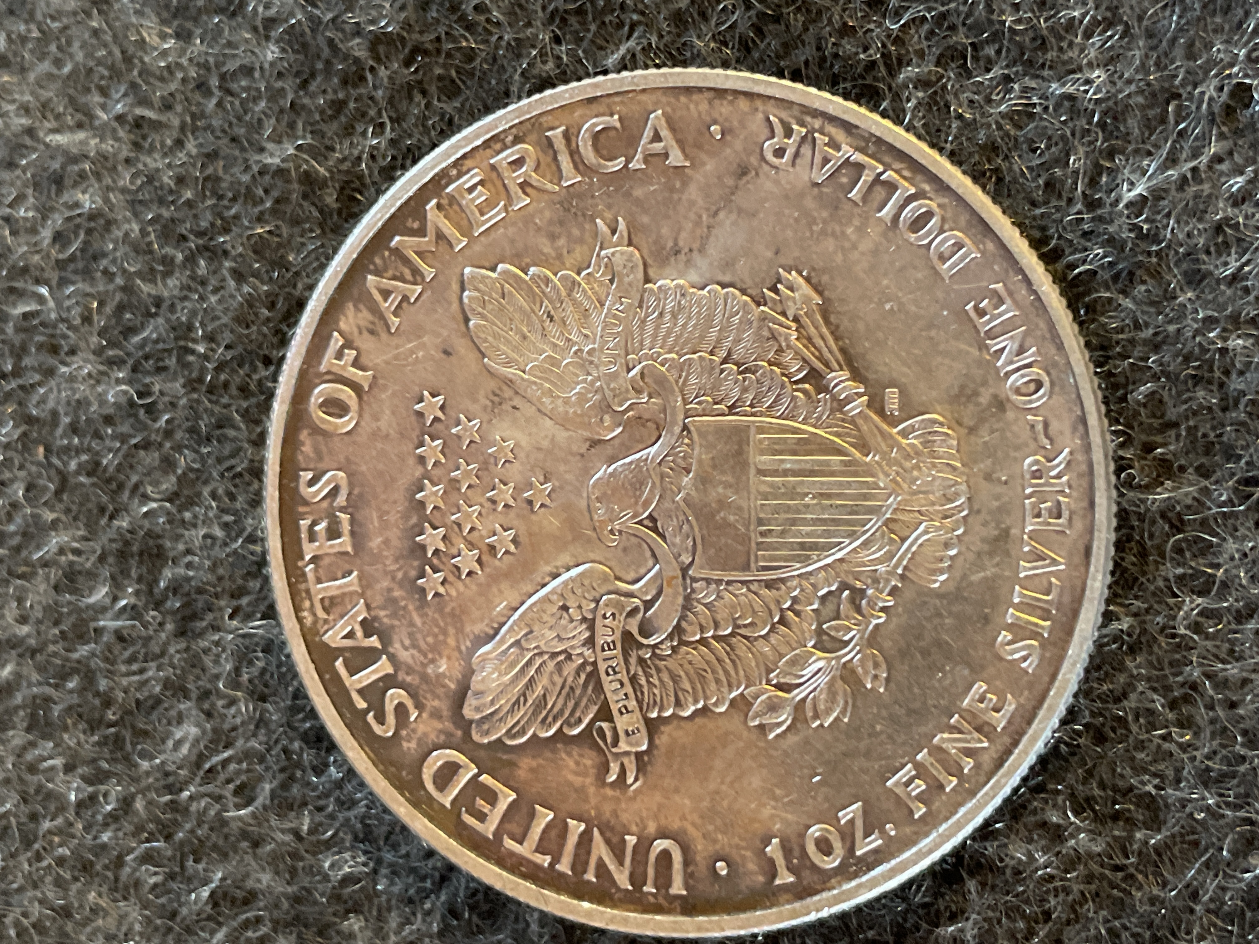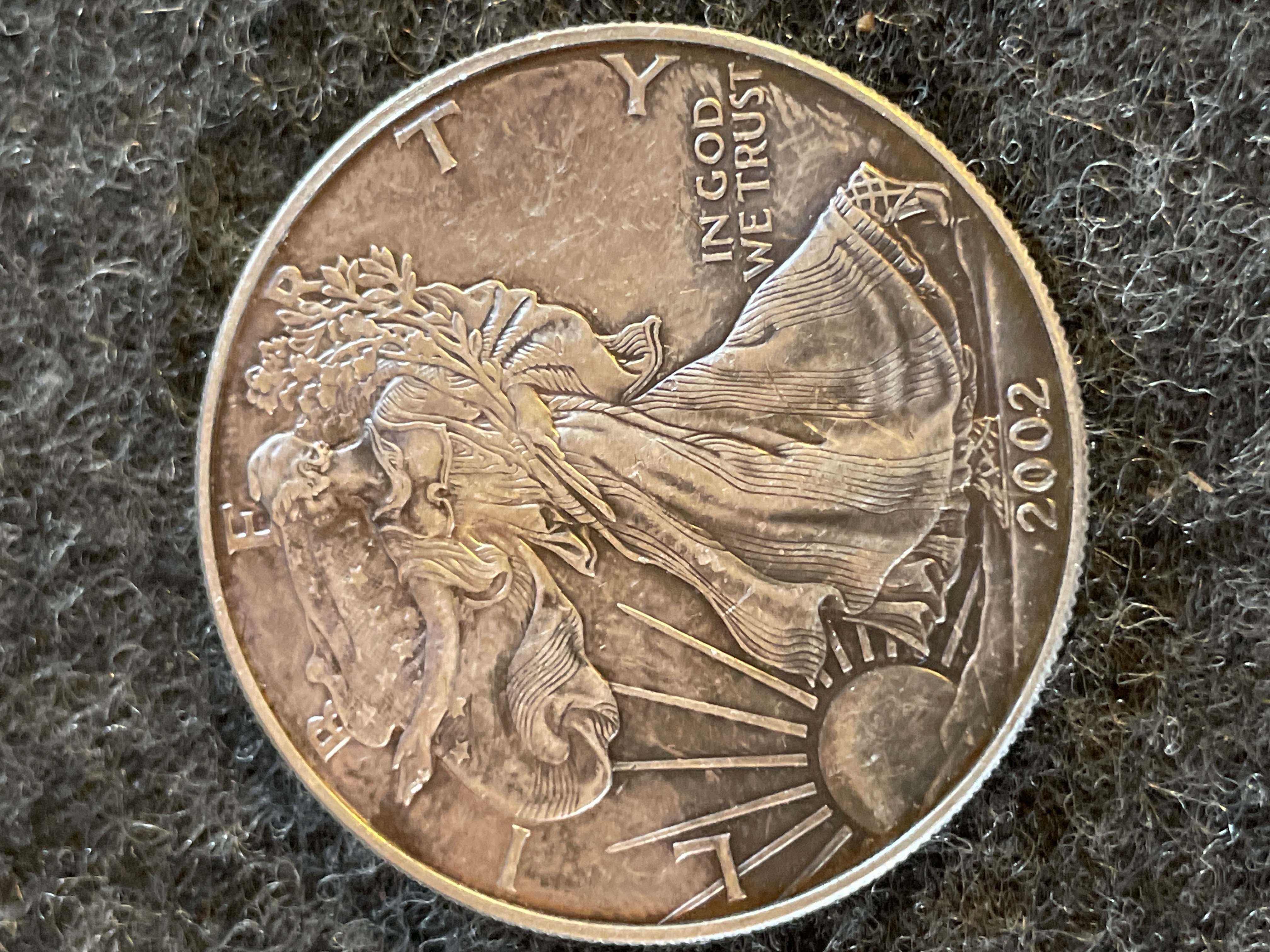A 2002 United States American Silver Eagle one dollar coin composed of one ounce of fine silver featuring the Walking Liberty design.