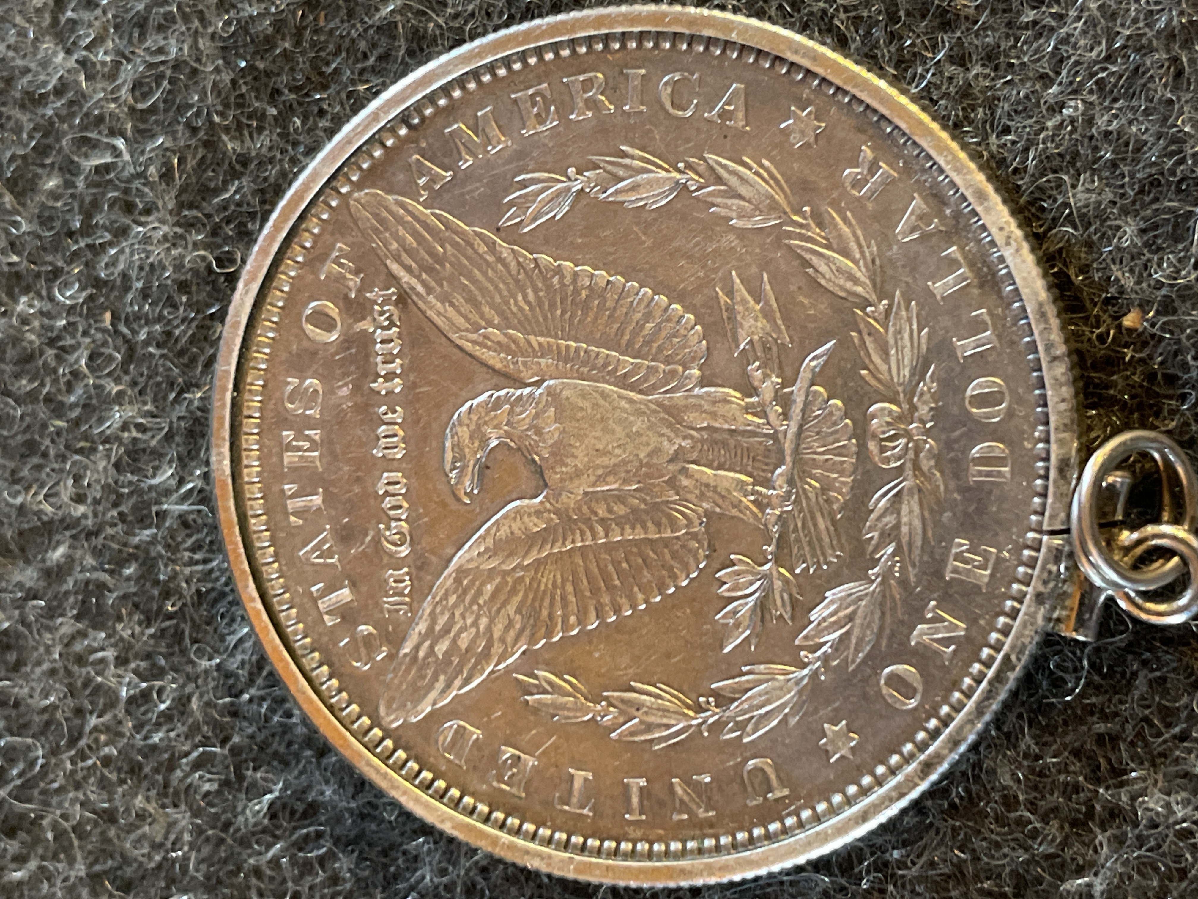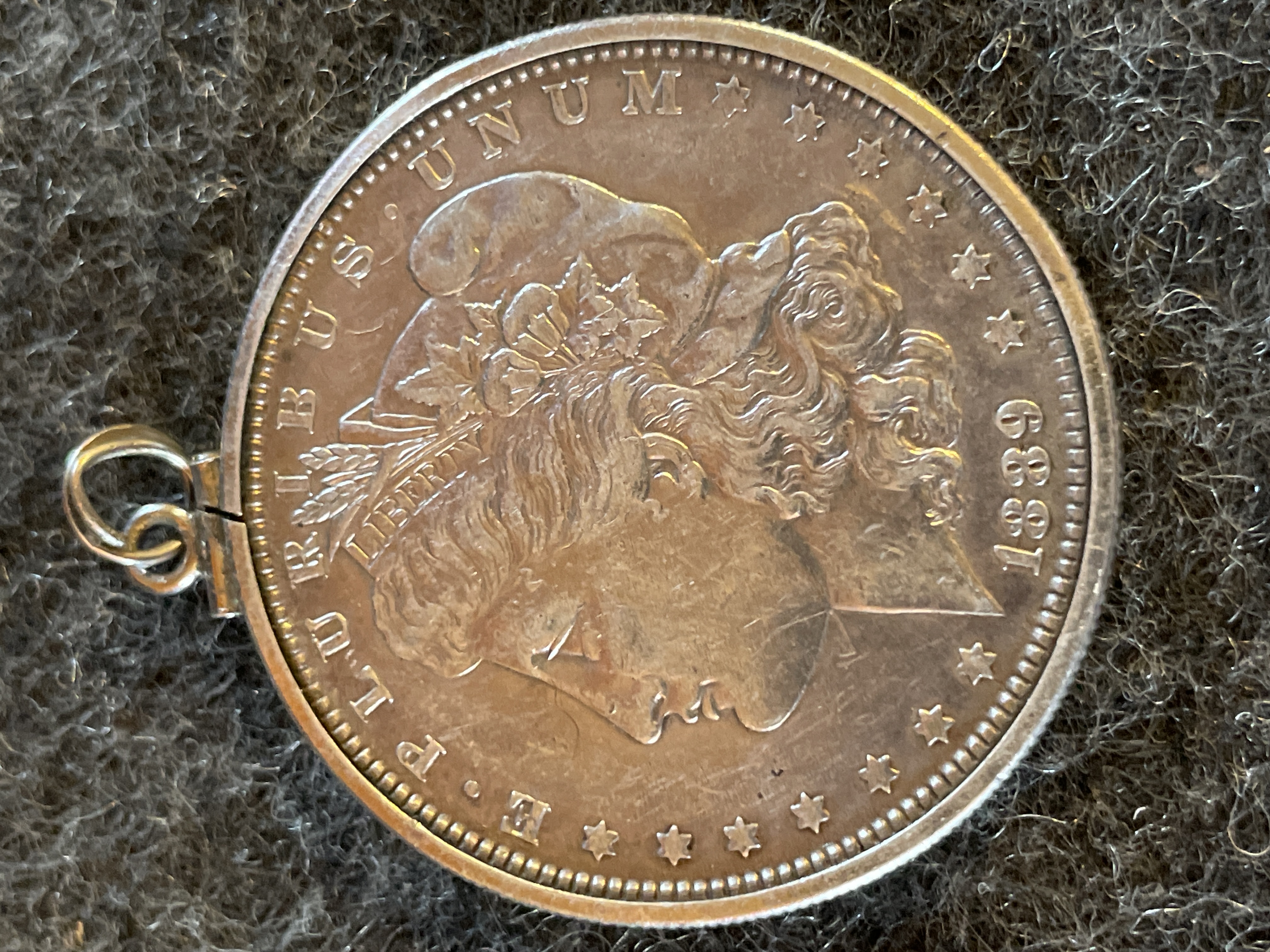 A silver-toned 1889 Morgan Silver Dollar coin featuring Liberty and an eagle, set within a simple pendant mount.